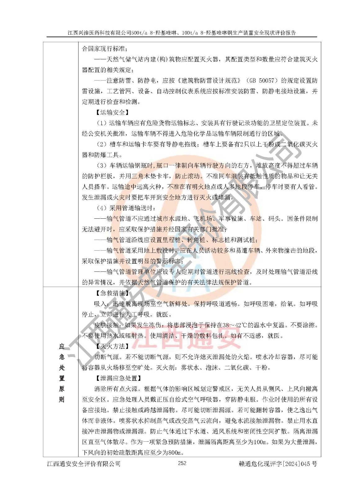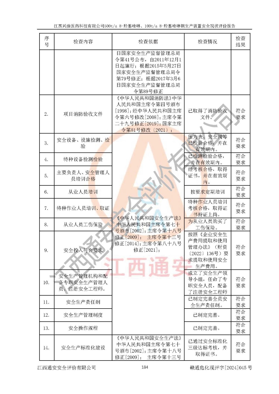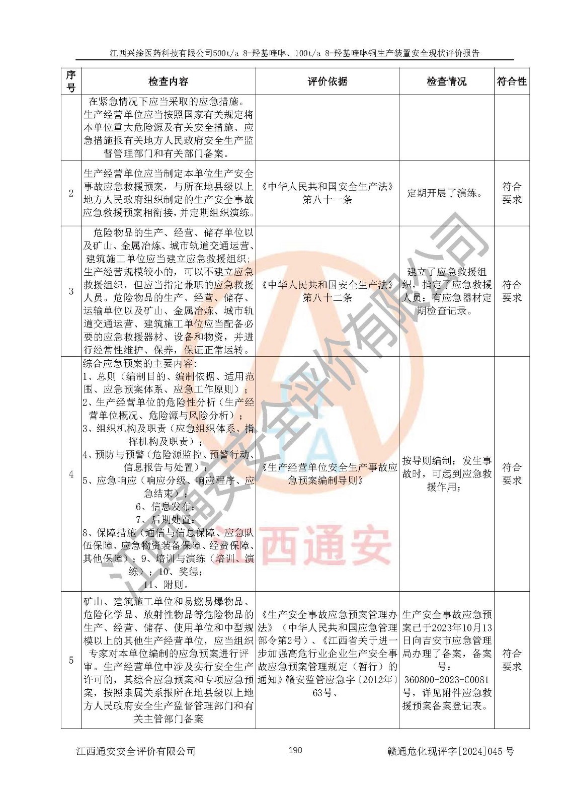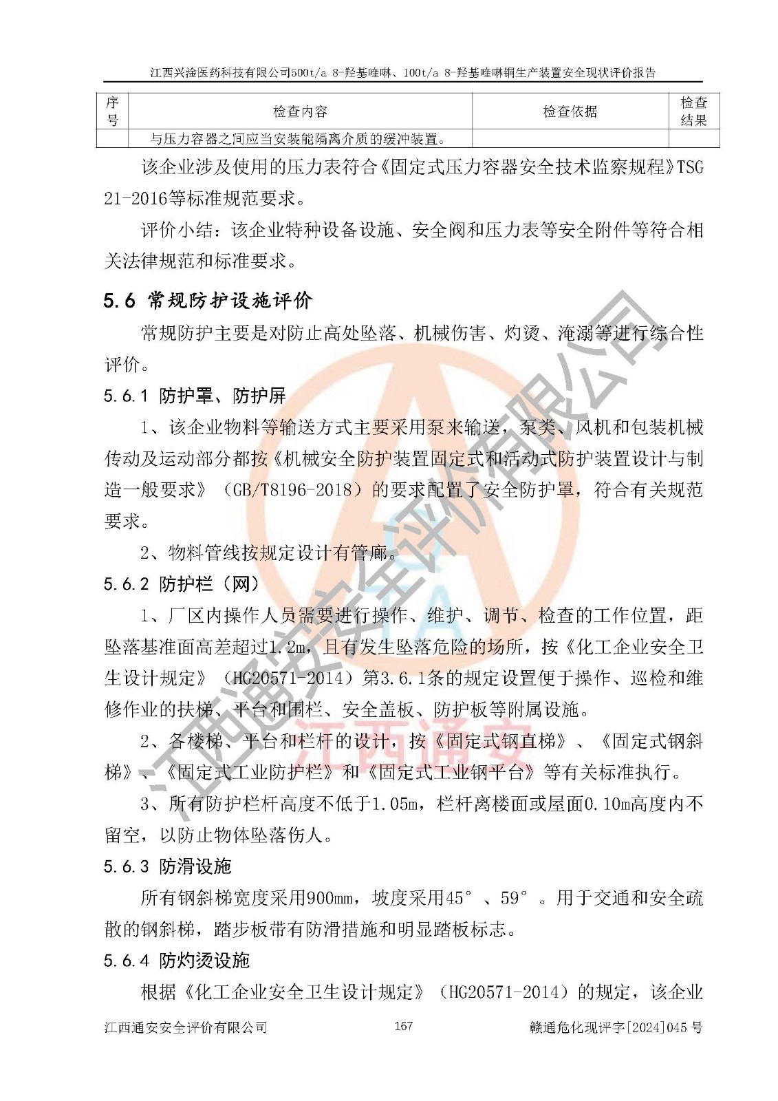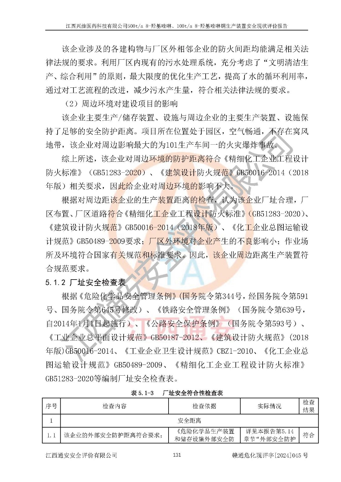 評價結(jié)論 | 評價結(jié)論:本報告認(rèn)為,江西興淦醫(yī)藥科技有限公司500t/a 8-羥基喹啉、100t/a 8-羥基喹啉銅生產(chǎn)裝置現(xiàn)場情況與設(shè)計圖紙一致,自動控制系統(tǒng)設(shè)計符合要求且運行正常,有關(guān)從業(yè)人員資質(zhì)符合《江西省危險化學(xué)品安全專項整治三年行動實施方案》要求,安全設(shè)施及安全管理符合**及有關(guān)部門關(guān)于安全生產(chǎn)法律、法規(guī)、標(biāo)準(zhǔn)的要求,安全設(shè)施正常投用且運行**,安全風(fēng)險是可以控制的,其風(fēng)險程度是可以接受的,安全現(xiàn)狀符合安全生產(chǎn)條件,能夠滿足安全生產(chǎn)的要求。 | |||