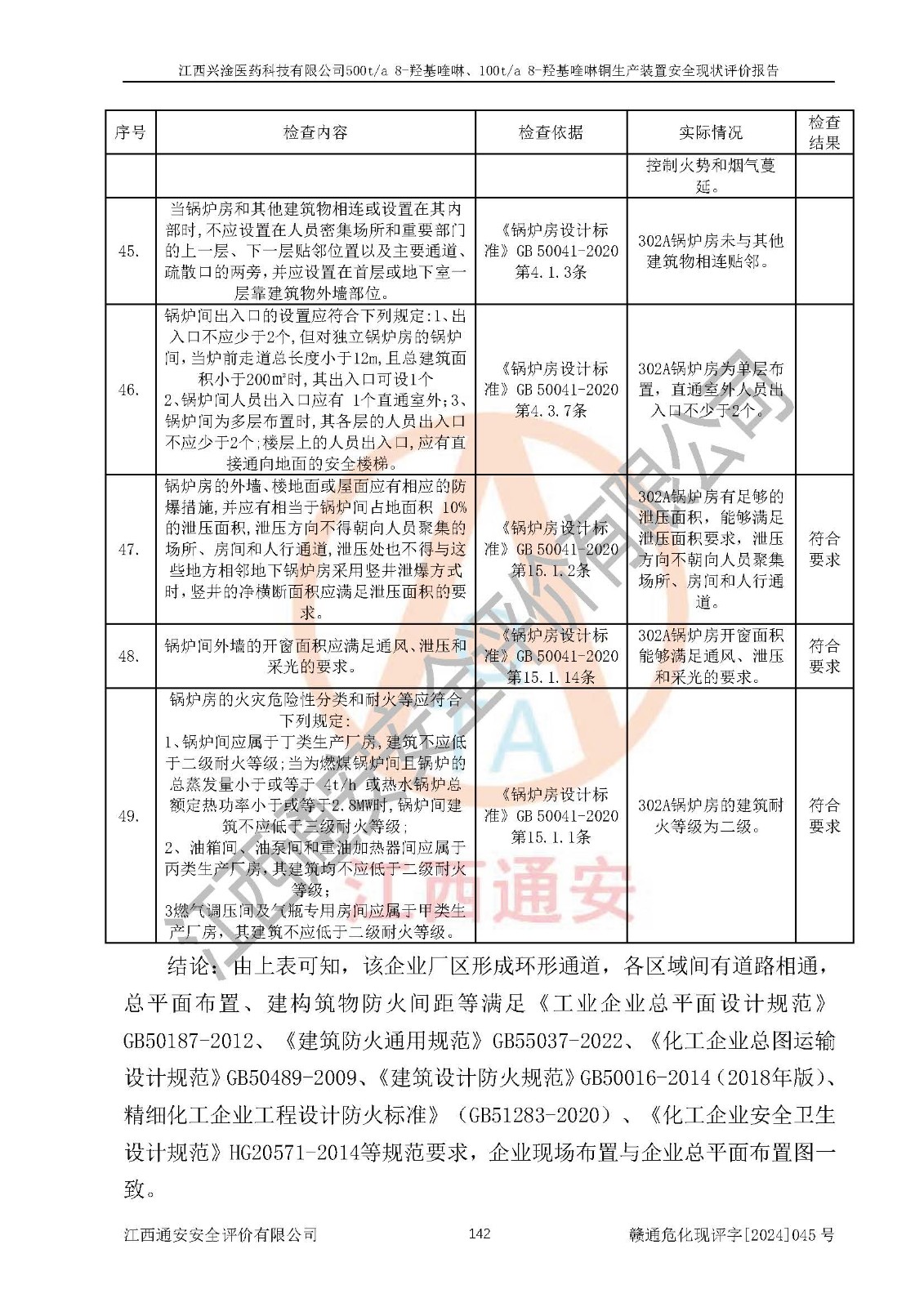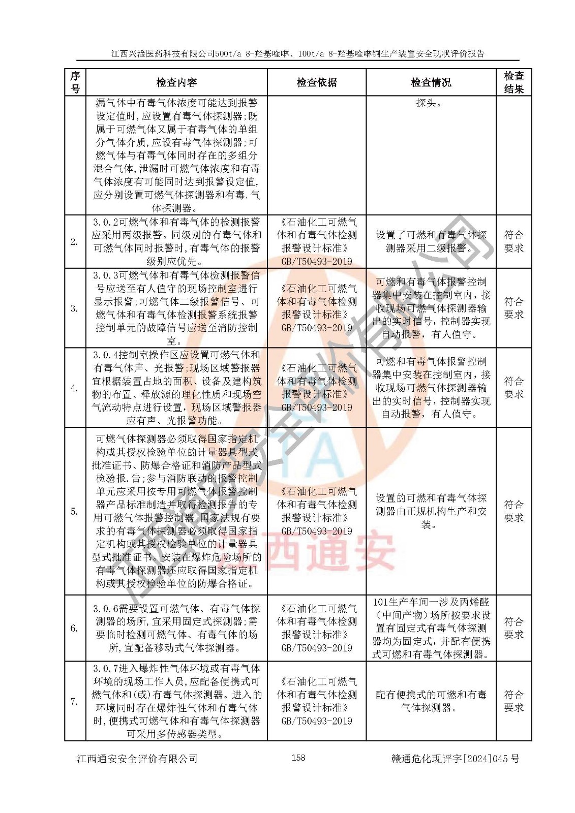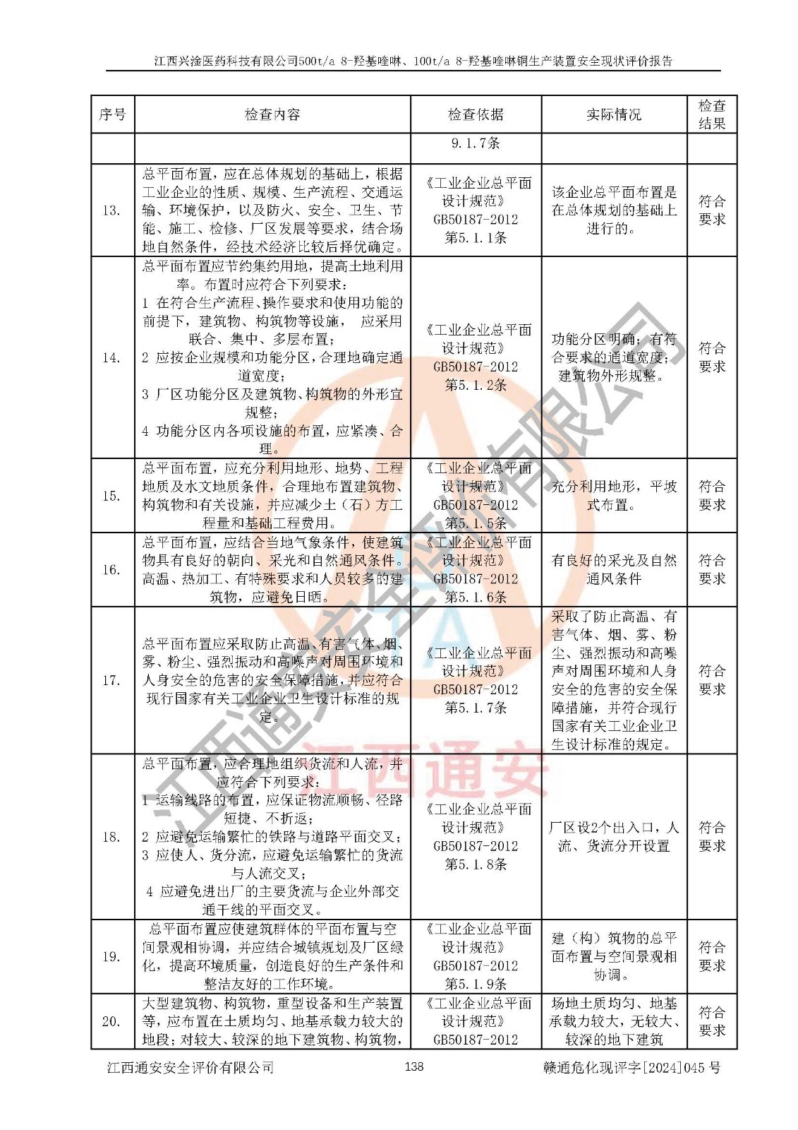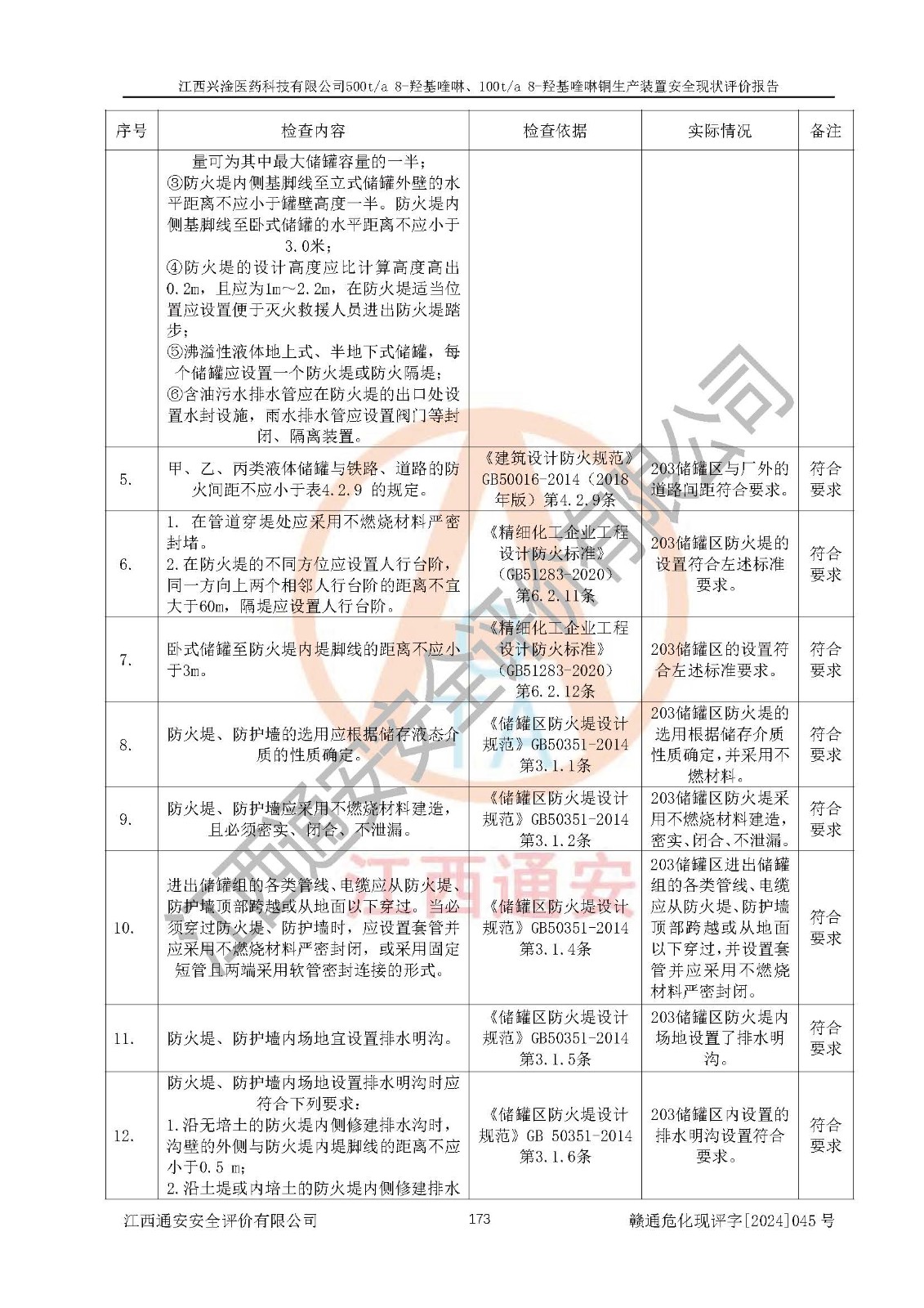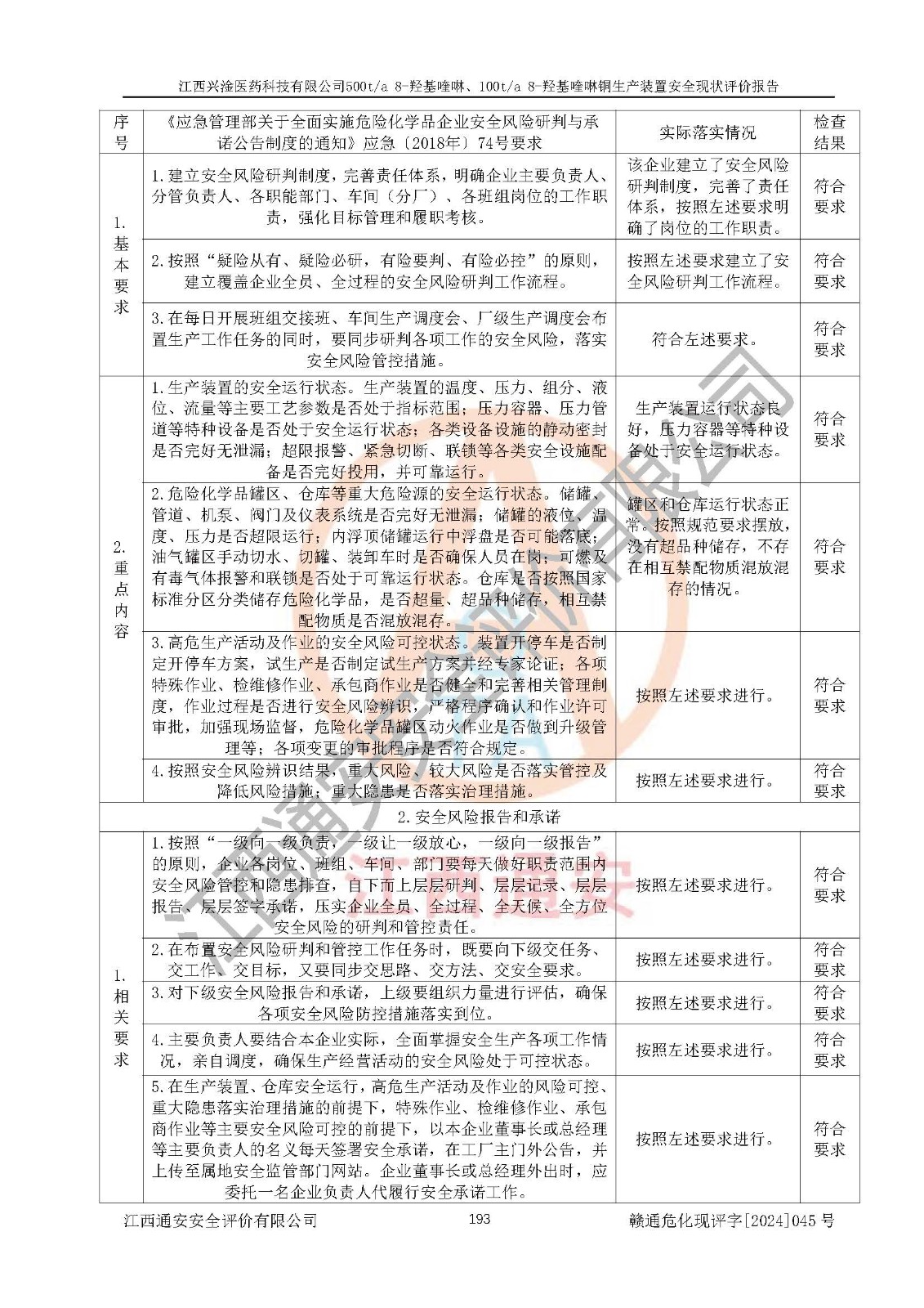 評價結(jié)論 | 評價結(jié)論:本報告認(rèn)為,江西興淦醫(yī)藥科技有限公司500t/a 8-羥基喹啉、100t/a 8-羥基喹啉銅生產(chǎn)裝置現(xiàn)場情況與設(shè)計圖紙一致,自動控制系統(tǒng)設(shè)計符合要求且運行正常,有關(guān)從業(yè)人員資質(zhì)符合《江西省危險化學(xué)品安全專項整治三年行動實施方案》要求,安全設(shè)施及安全管理符合**及有關(guān)部門關(guān)于安全生產(chǎn)法律、法規(guī)、標(biāo)準(zhǔn)的要求,安全設(shè)施正常投用且運行**,安全風(fēng)險是可以控制的,其風(fēng)險程度是可以接受的,安全現(xiàn)狀符合安全生產(chǎn)條件,能夠滿足安全生產(chǎn)的要求。 | |||