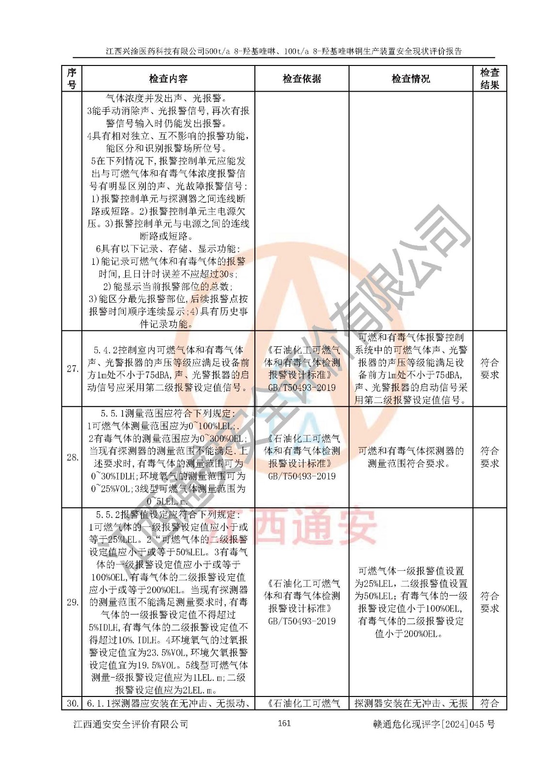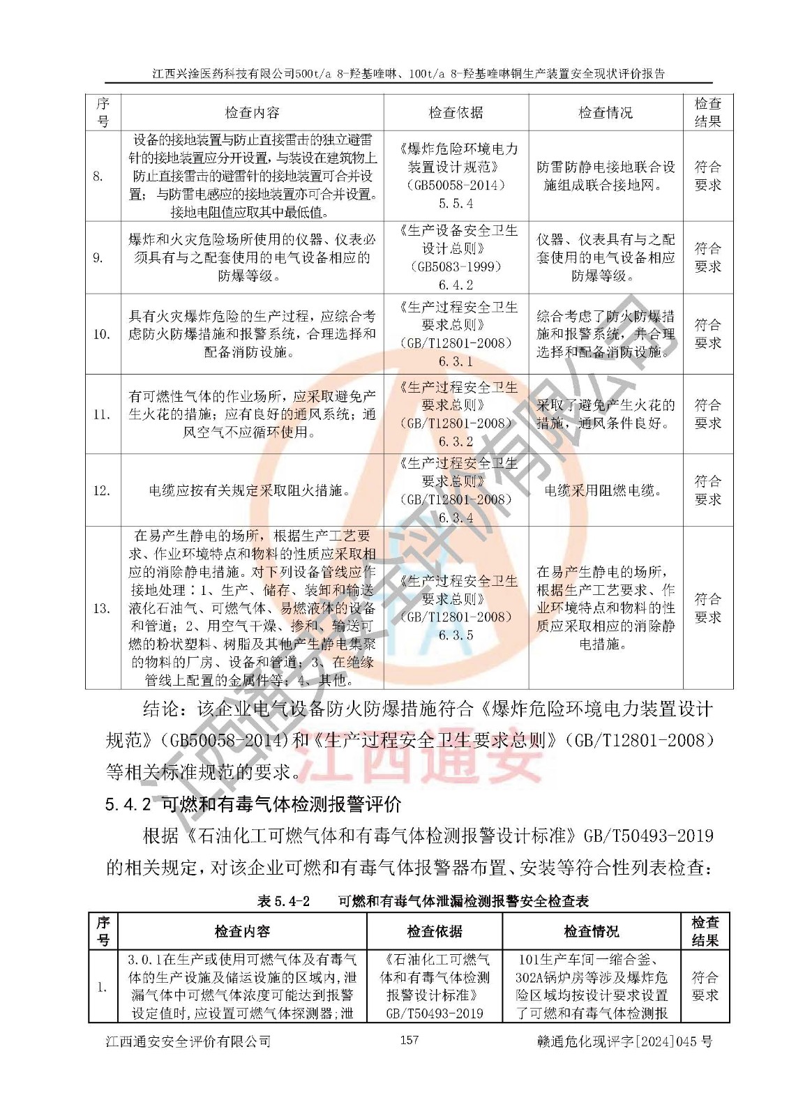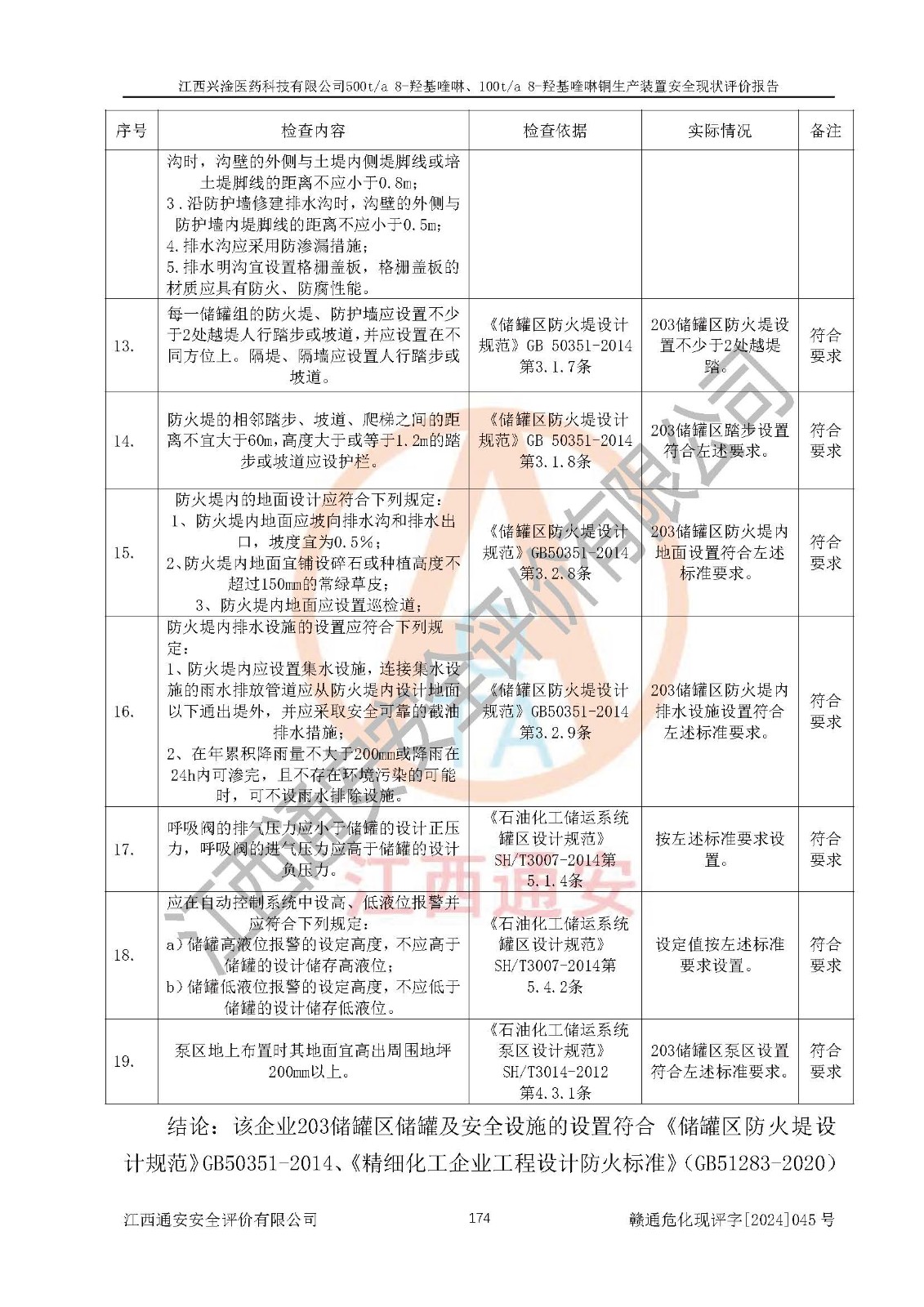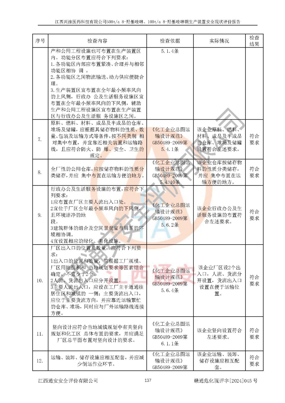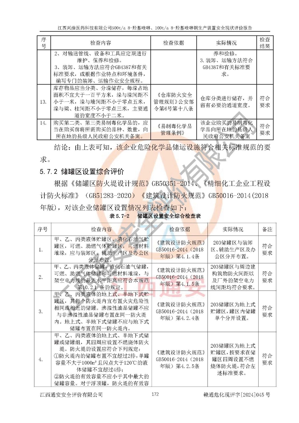 評價結(jié)論 | 評價結(jié)論:本報告認(rèn)為,江西興淦醫(yī)藥科技有限公司500t/a 8-羥基喹啉、100t/a 8-羥基喹啉銅生產(chǎn)裝置現(xiàn)場情況與設(shè)計圖紙一致,自動控制系統(tǒng)設(shè)計符合要求且運行正常,有關(guān)從業(yè)人員資質(zhì)符合《江西省危險化學(xué)品安全專項整治三年行動實施方案》要求,安全設(shè)施及安全管理符合**及有關(guān)部門關(guān)于安全生產(chǎn)法律、法規(guī)、標(biāo)準(zhǔn)的要求,安全設(shè)施正常投用且運行**,安全風(fēng)險是可以控制的,其風(fēng)險程度是可以接受的,安全現(xiàn)狀符合安全生產(chǎn)條件,能夠滿足安全生產(chǎn)的要求。 | |||