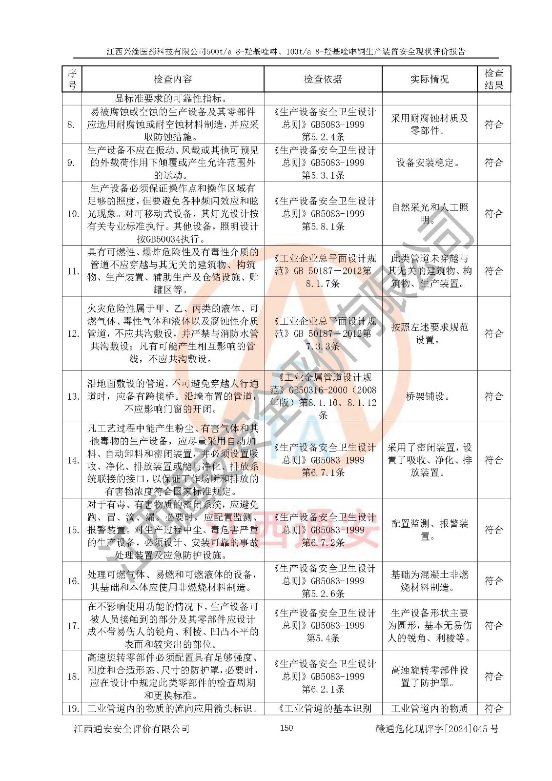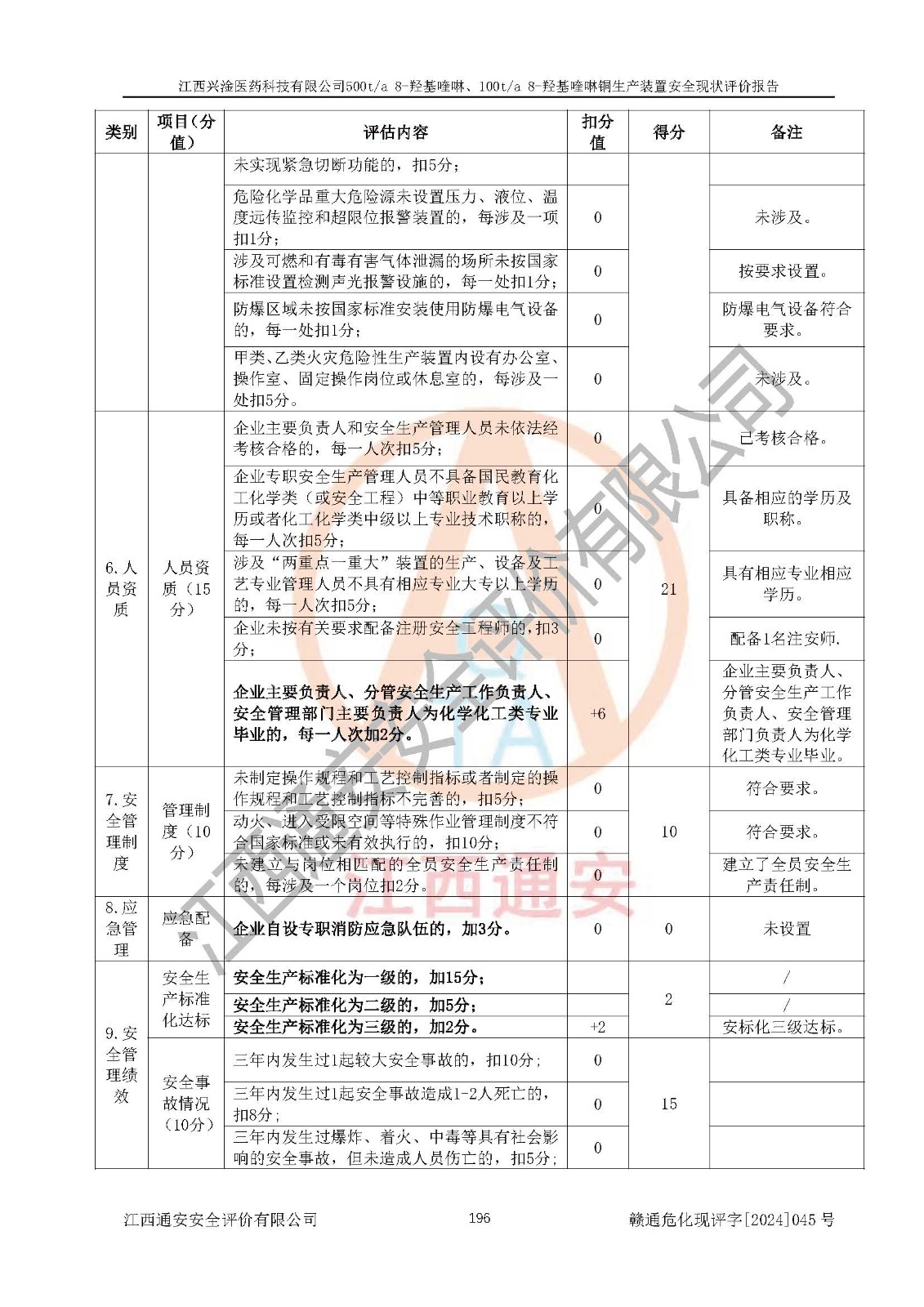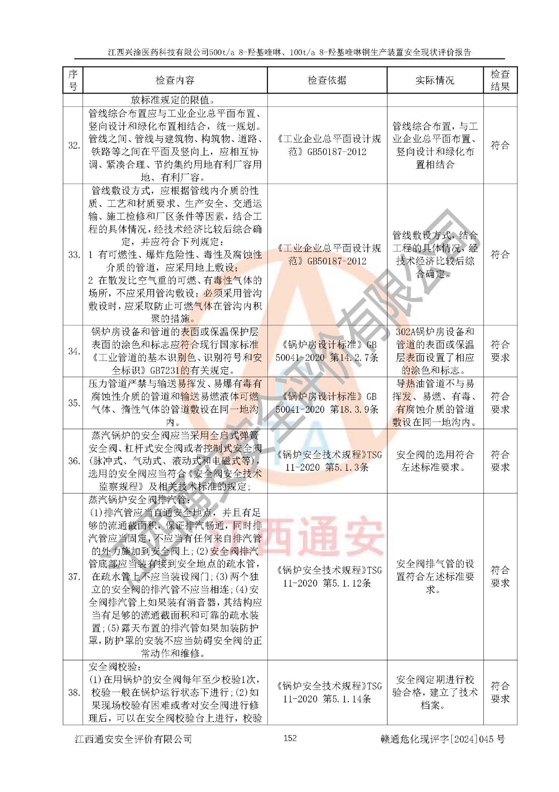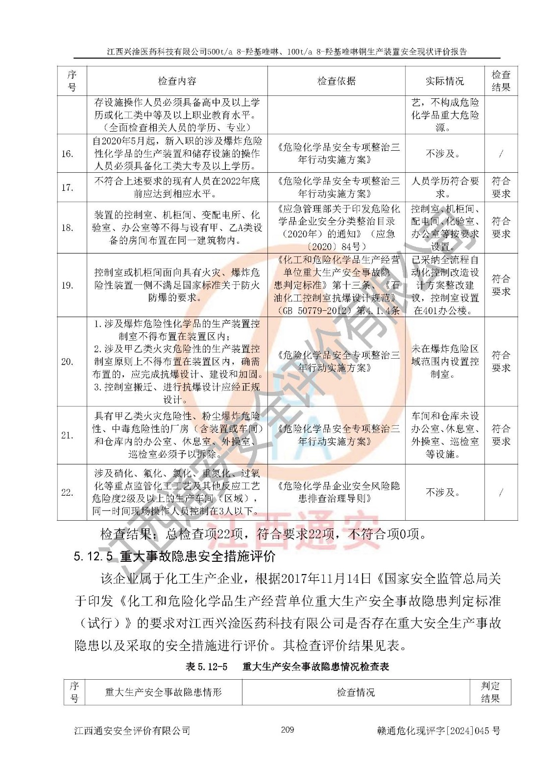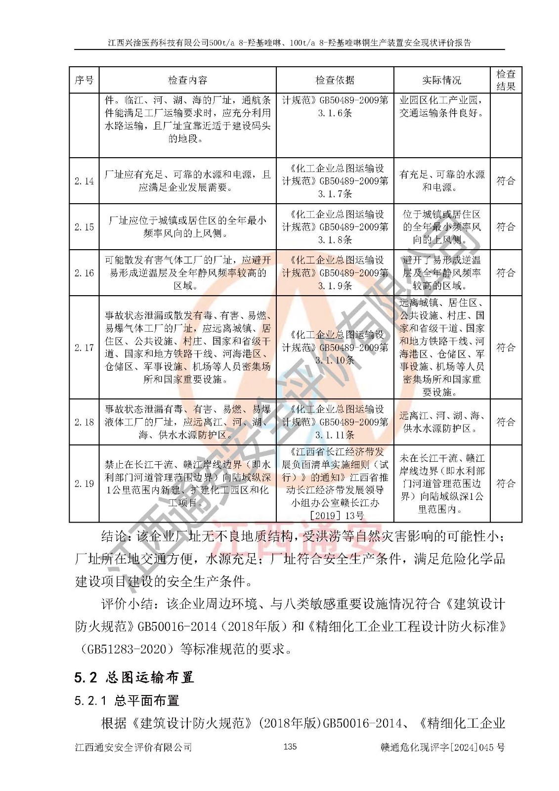 評價結(jié)論 | 評價結(jié)論:本報告認(rèn)為,江西興淦醫(yī)藥科技有限公司500t/a 8-羥基喹啉、100t/a 8-羥基喹啉銅生產(chǎn)裝置現(xiàn)場情況與設(shè)計圖紙一致,自動控制系統(tǒng)設(shè)計符合要求且運行正常,有關(guān)從業(yè)人員資質(zhì)符合《江西省危險化學(xué)品安全專項整治三年行動實施方案》要求,安全設(shè)施及安全管理符合**及有關(guān)部門關(guān)于安全生產(chǎn)法律、法規(guī)、標(biāo)準(zhǔn)的要求,安全設(shè)施正常投用且運行**,安全風(fēng)險是可以控制的,其風(fēng)險程度是可以接受的,安全現(xiàn)狀符合安全生產(chǎn)條件,能夠滿足安全生產(chǎn)的要求。 | |||