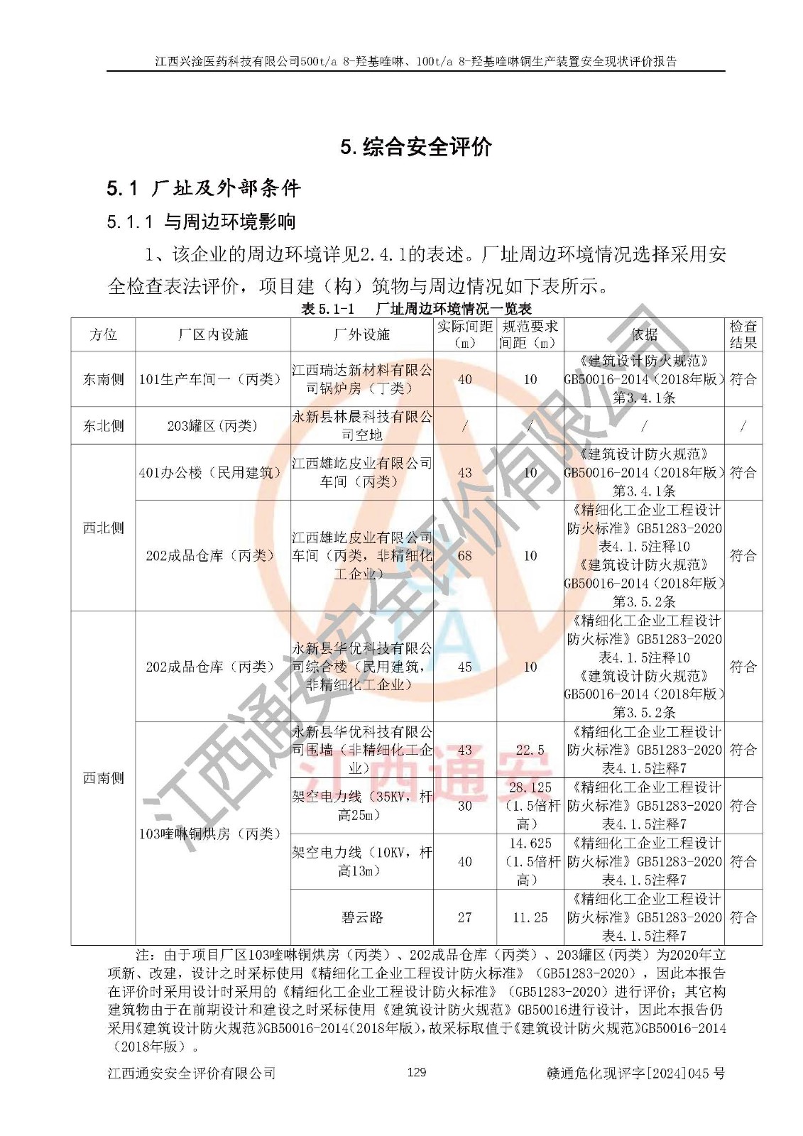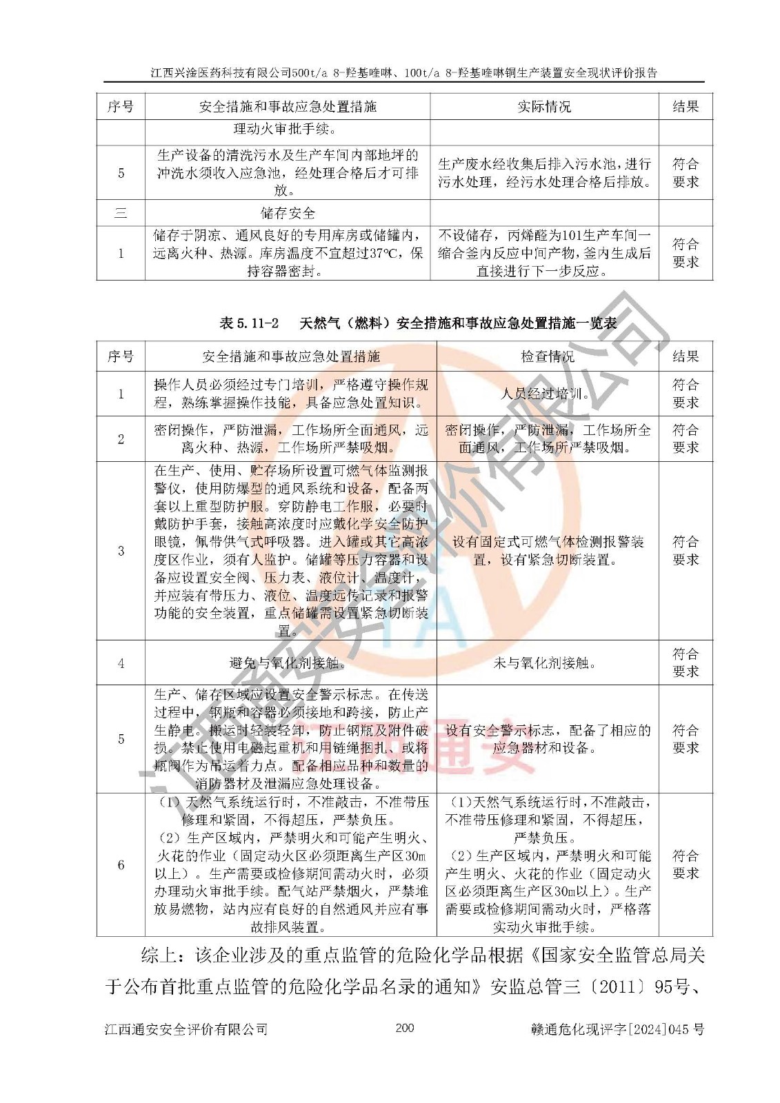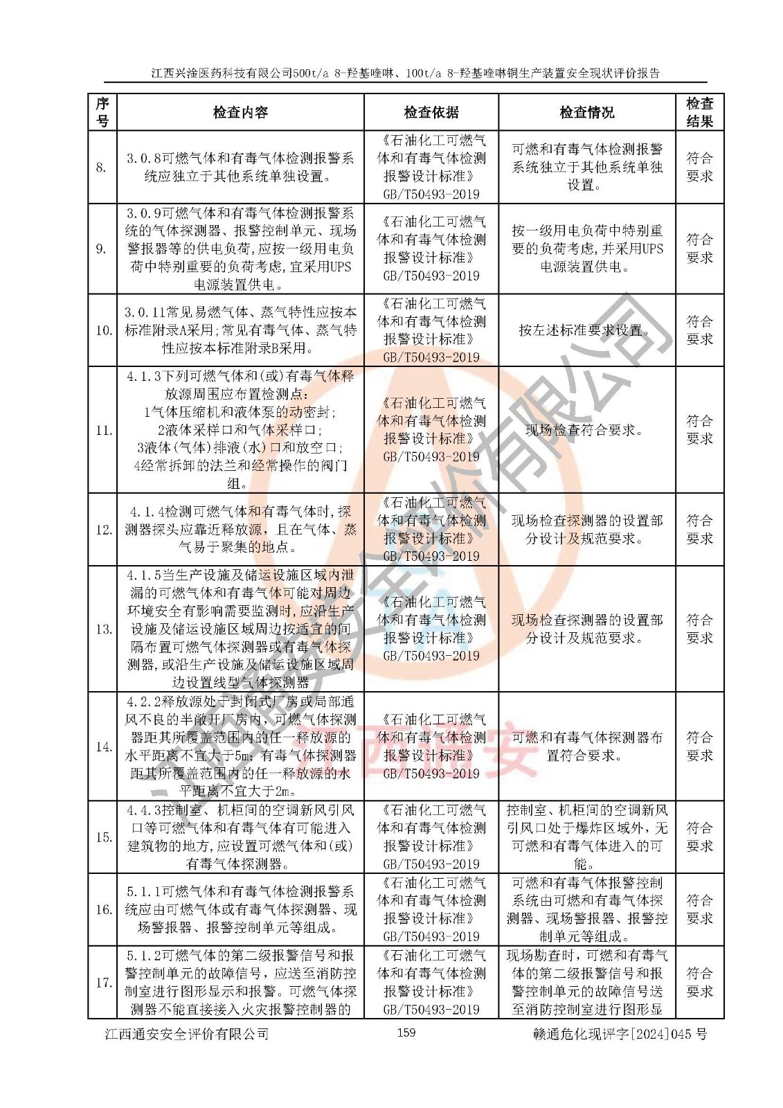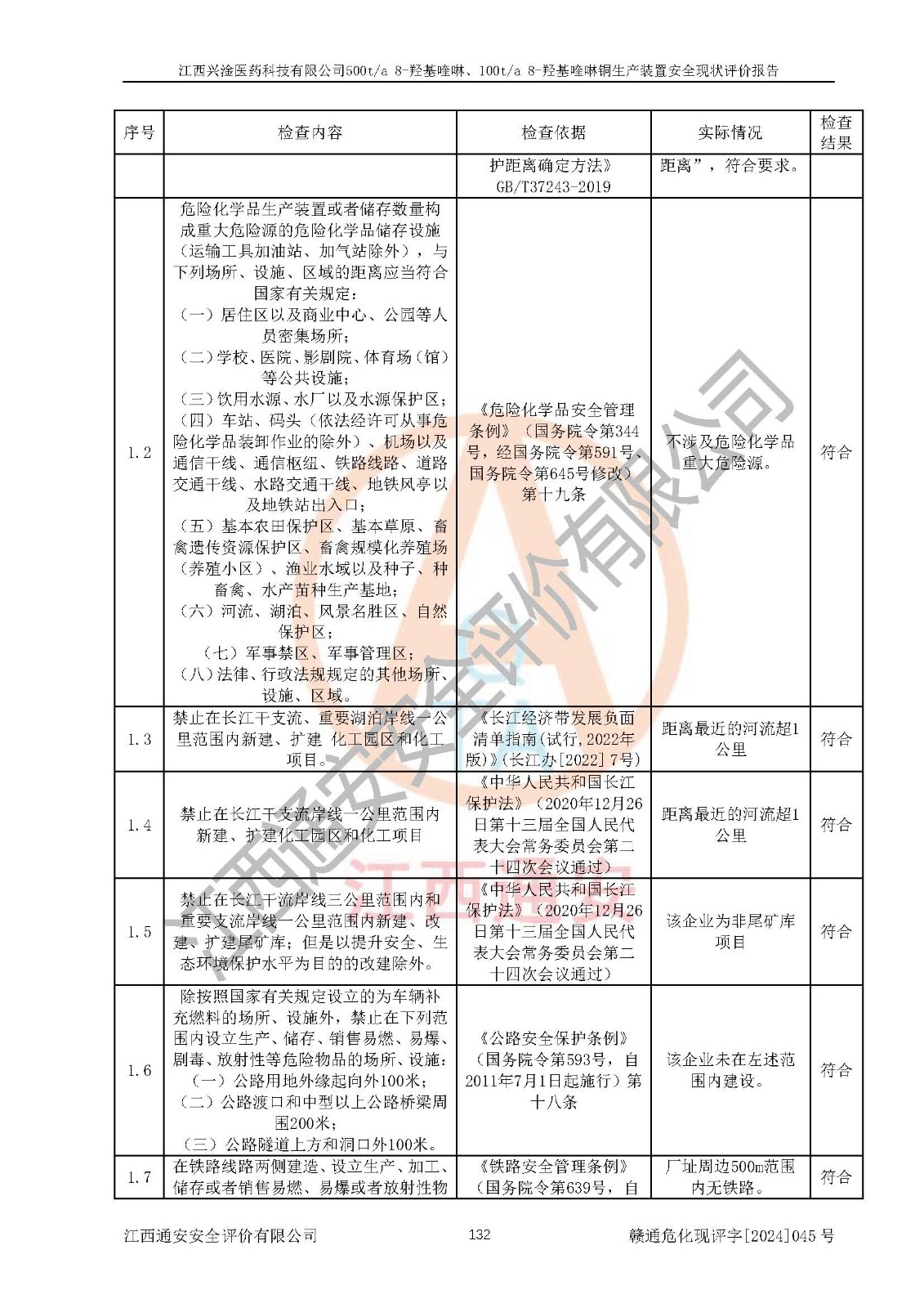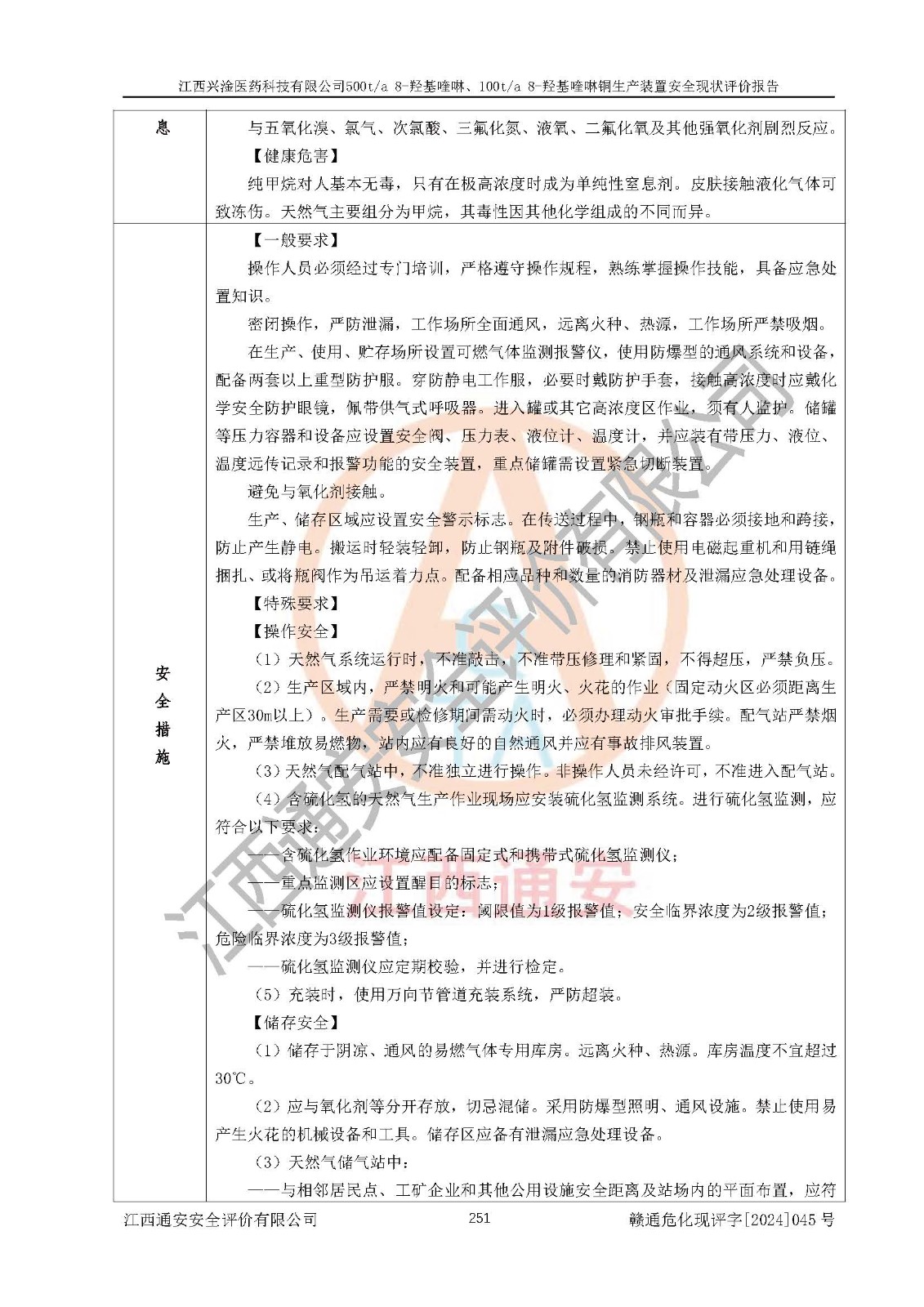 評價結(jié)論 | 評價結(jié)論:本報告認(rèn)為,江西興淦醫(yī)藥科技有限公司500t/a 8-羥基喹啉、100t/a 8-羥基喹啉銅生產(chǎn)裝置現(xiàn)場情況與設(shè)計圖紙一致,自動控制系統(tǒng)設(shè)計符合要求且運行正常,有關(guān)從業(yè)人員資質(zhì)符合《江西省危險化學(xué)品安全專項整治三年行動實施方案》要求,安全設(shè)施及安全管理符合**及有關(guān)部門關(guān)于安全生產(chǎn)法律、法規(guī)、標(biāo)準(zhǔn)的要求,安全設(shè)施正常投用且運行**,安全風(fēng)險是可以控制的,其風(fēng)險程度是可以接受的,安全現(xiàn)狀符合安全生產(chǎn)條件,能夠滿足安全生產(chǎn)的要求。 | |||