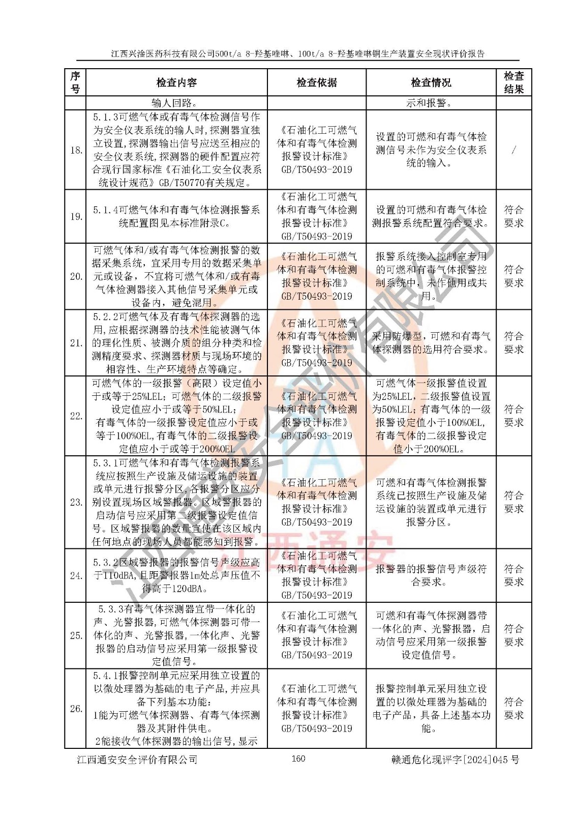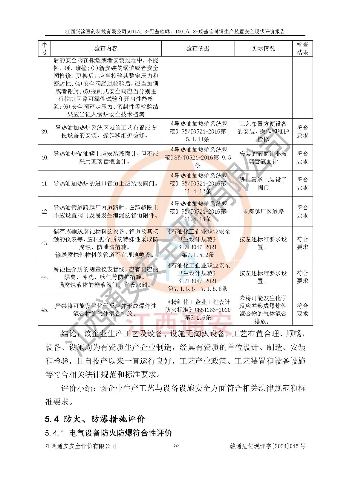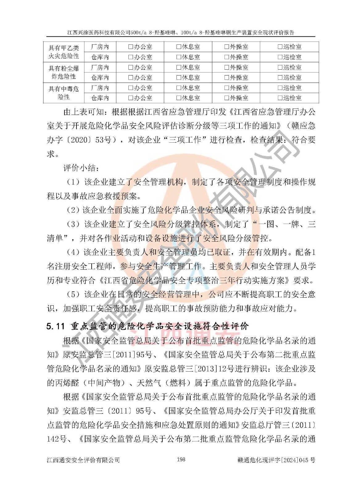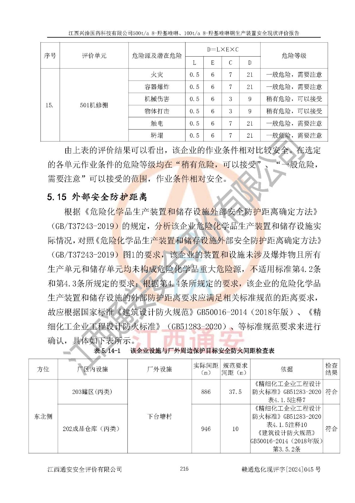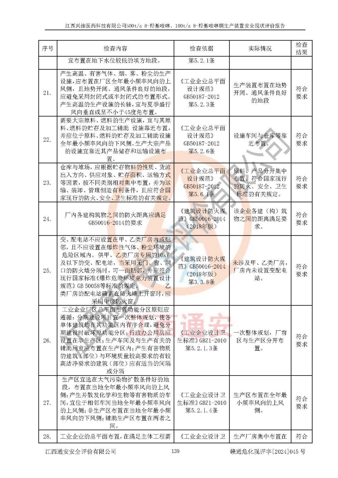 評價結(jié)論 | 評價結(jié)論:本報告認(rèn)為,江西興淦醫(yī)藥科技有限公司500t/a 8-羥基喹啉、100t/a 8-羥基喹啉銅生產(chǎn)裝置現(xiàn)場情況與設(shè)計圖紙一致,自動控制系統(tǒng)設(shè)計符合要求且運行正常,有關(guān)從業(yè)人員資質(zhì)符合《江西省危險化學(xué)品安全專項整治三年行動實施方案》要求,安全設(shè)施及安全管理符合**及有關(guān)部門關(guān)于安全生產(chǎn)法律、法規(guī)、標(biāo)準(zhǔn)的要求,安全設(shè)施正常投用且運行**,安全風(fēng)險是可以控制的,其風(fēng)險程度是可以接受的,安全現(xiàn)狀符合安全生產(chǎn)條件,能夠滿足安全生產(chǎn)的要求。 | |||