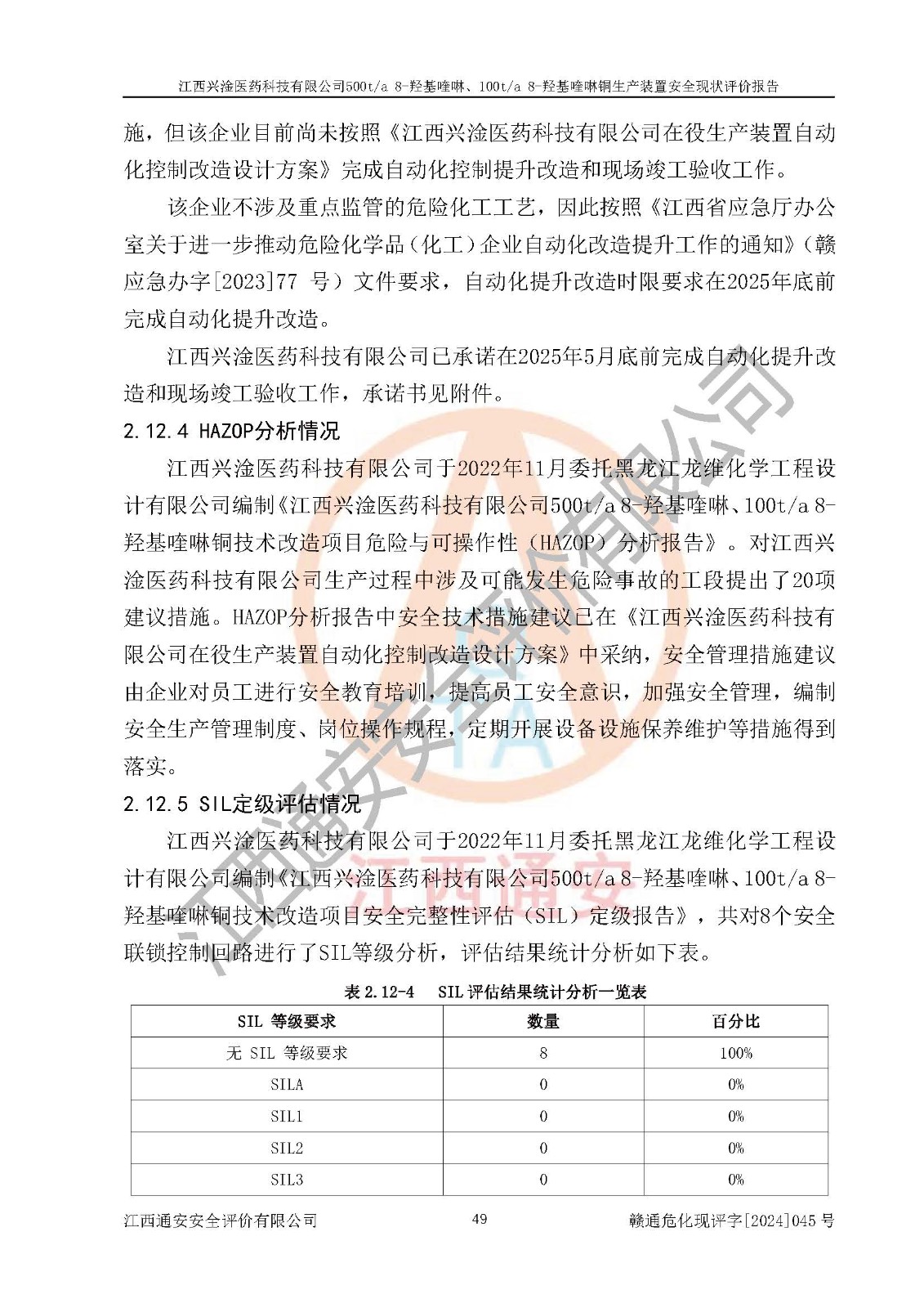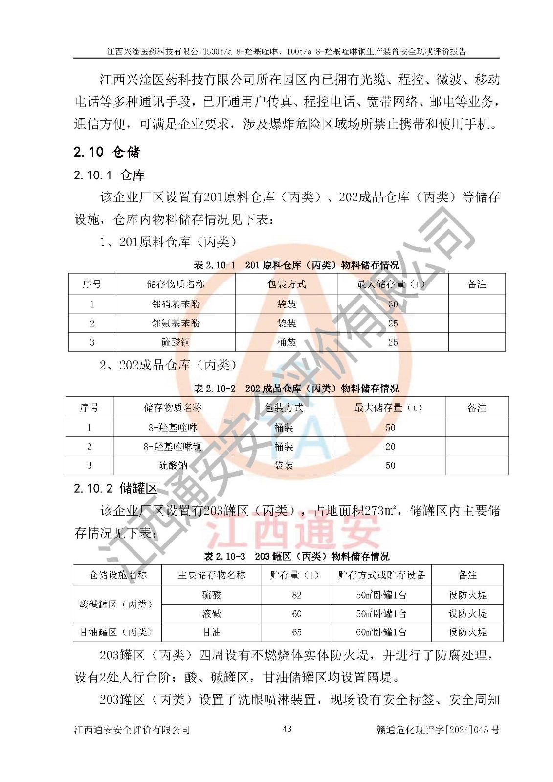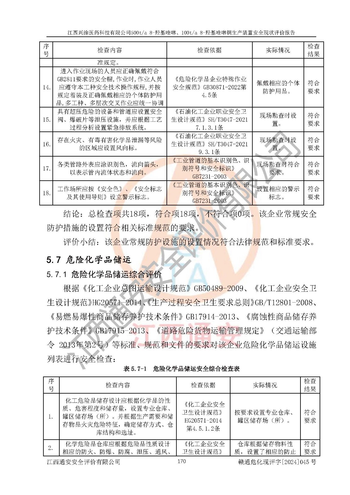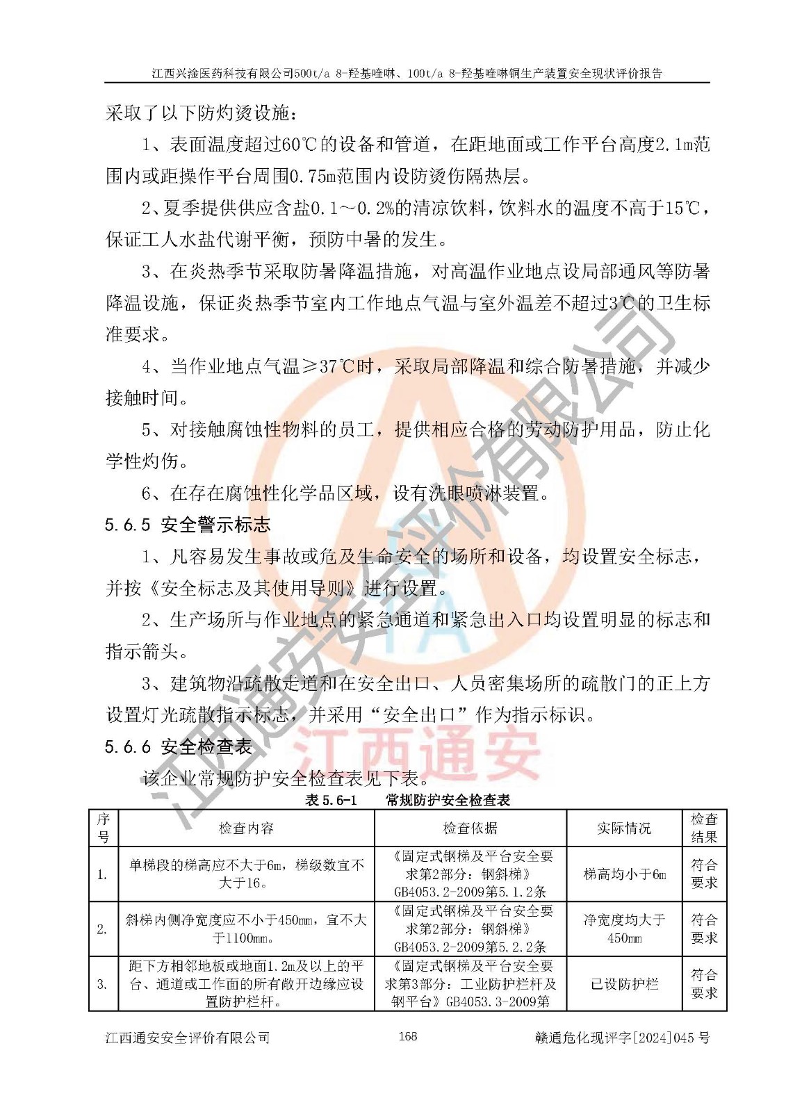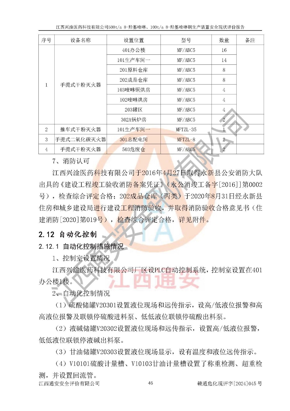 評價結(jié)論 | 評價結(jié)論:本報告認(rèn)為,江西興淦醫(yī)藥科技有限公司500t/a 8-羥基喹啉、100t/a 8-羥基喹啉銅生產(chǎn)裝置現(xiàn)場情況與設(shè)計圖紙一致,自動控制系統(tǒng)設(shè)計符合要求且運行正常,有關(guān)從業(yè)人員資質(zhì)符合《江西省危險化學(xué)品安全專項整治三年行動實施方案》要求,安全設(shè)施及安全管理符合**及有關(guān)部門關(guān)于安全生產(chǎn)法律、法規(guī)、標(biāo)準(zhǔn)的要求,安全設(shè)施正常投用且運行**,安全風(fēng)險是可以控制的,其風(fēng)險程度是可以接受的,安全現(xiàn)狀符合安全生產(chǎn)條件,能夠滿足安全生產(chǎn)的要求。 | |||