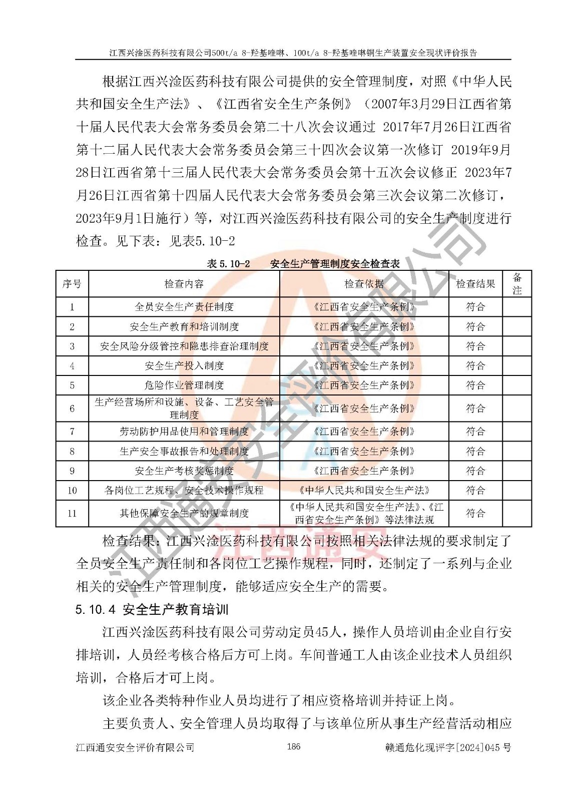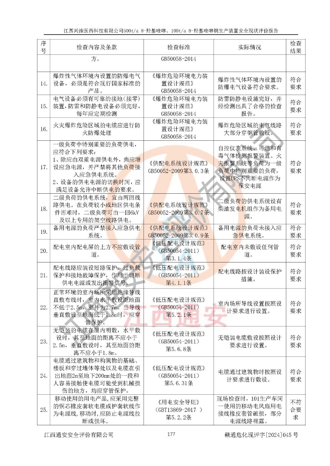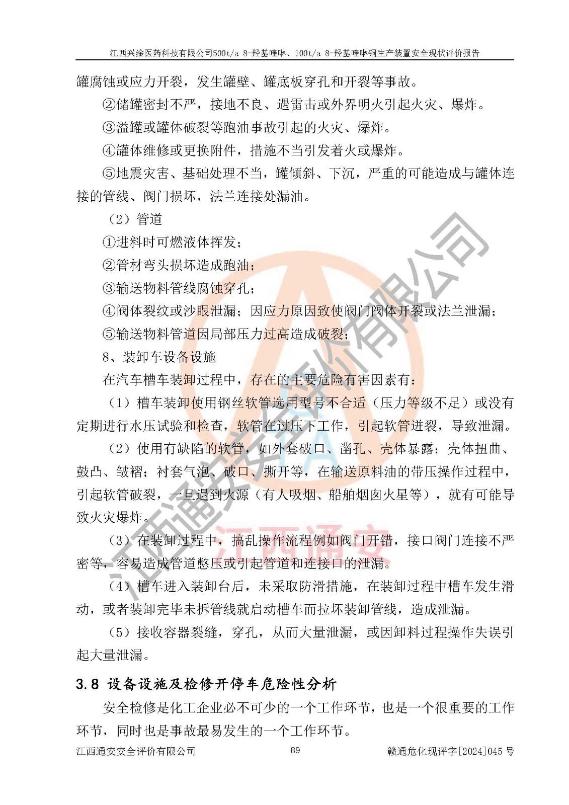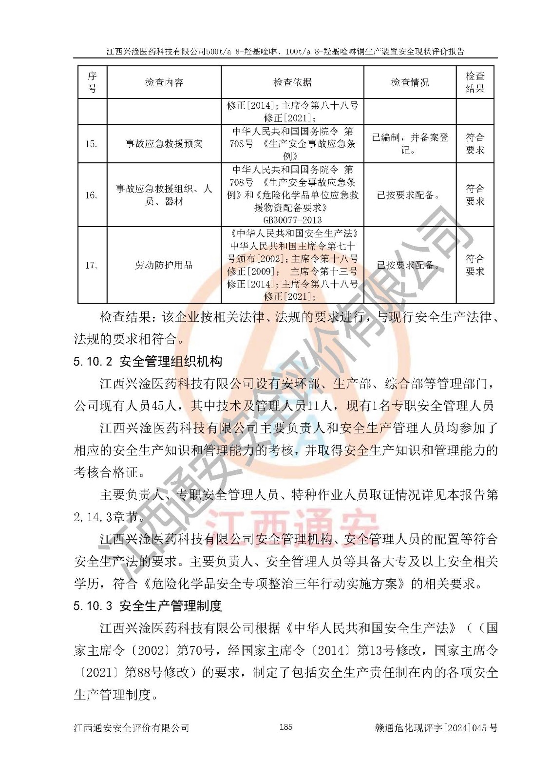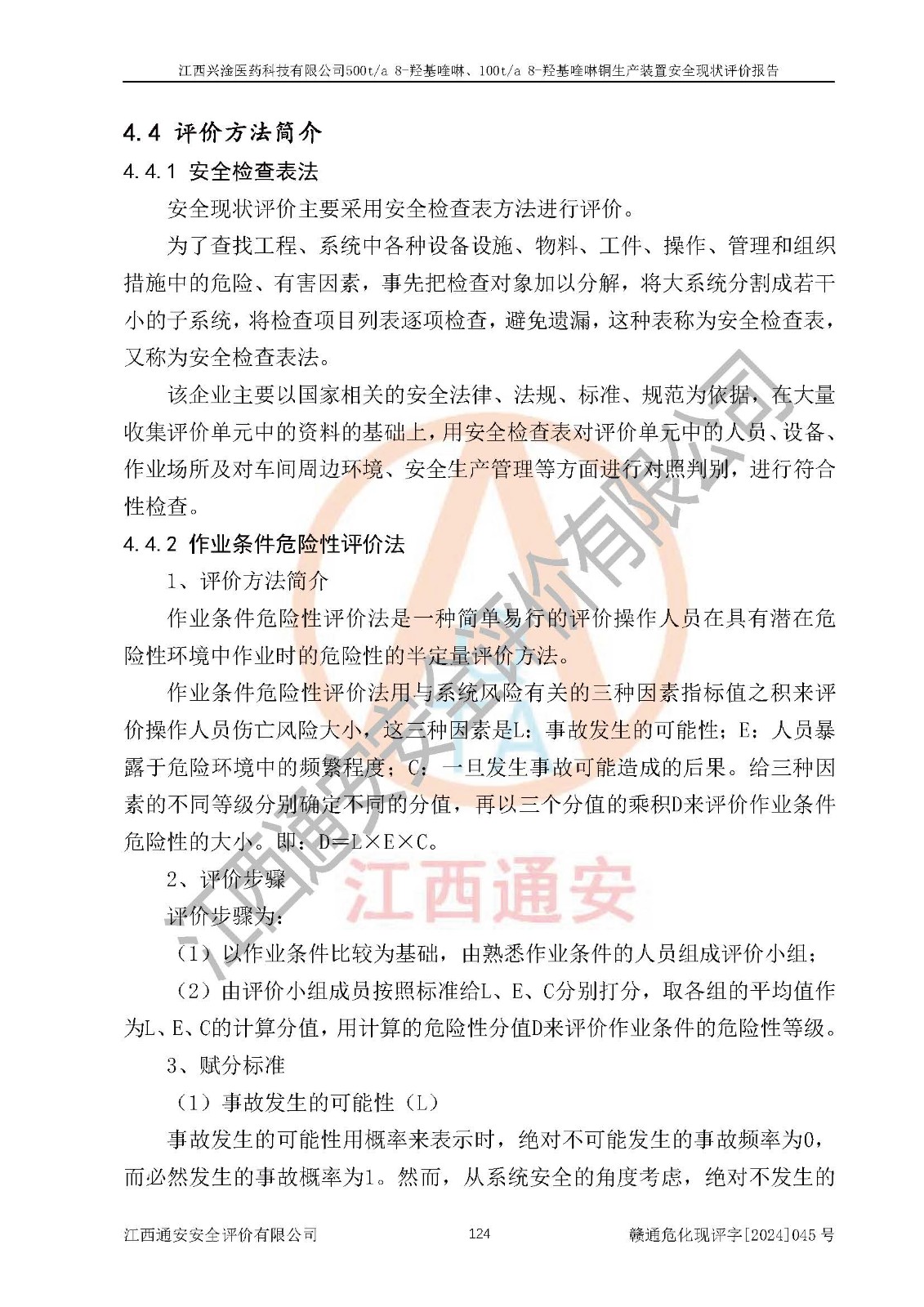 評價結(jié)論 | 評價結(jié)論:本報告認(rèn)為,江西興淦醫(yī)藥科技有限公司500t/a 8-羥基喹啉、100t/a 8-羥基喹啉銅生產(chǎn)裝置現(xiàn)場情況與設(shè)計圖紙一致,自動控制系統(tǒng)設(shè)計符合要求且運行正常,有關(guān)從業(yè)人員資質(zhì)符合《江西省危險化學(xué)品安全專項整治三年行動實施方案》要求,安全設(shè)施及安全管理符合**及有關(guān)部門關(guān)于安全生產(chǎn)法律、法規(guī)、標(biāo)準(zhǔn)的要求,安全設(shè)施正常投用且運行**,安全風(fēng)險是可以控制的,其風(fēng)險程度是可以接受的,安全現(xiàn)狀符合安全生產(chǎn)條件,能夠滿足安全生產(chǎn)的要求。 | |||