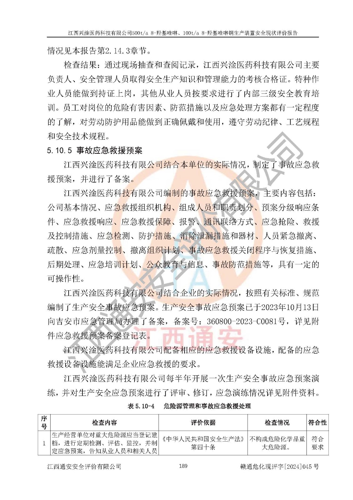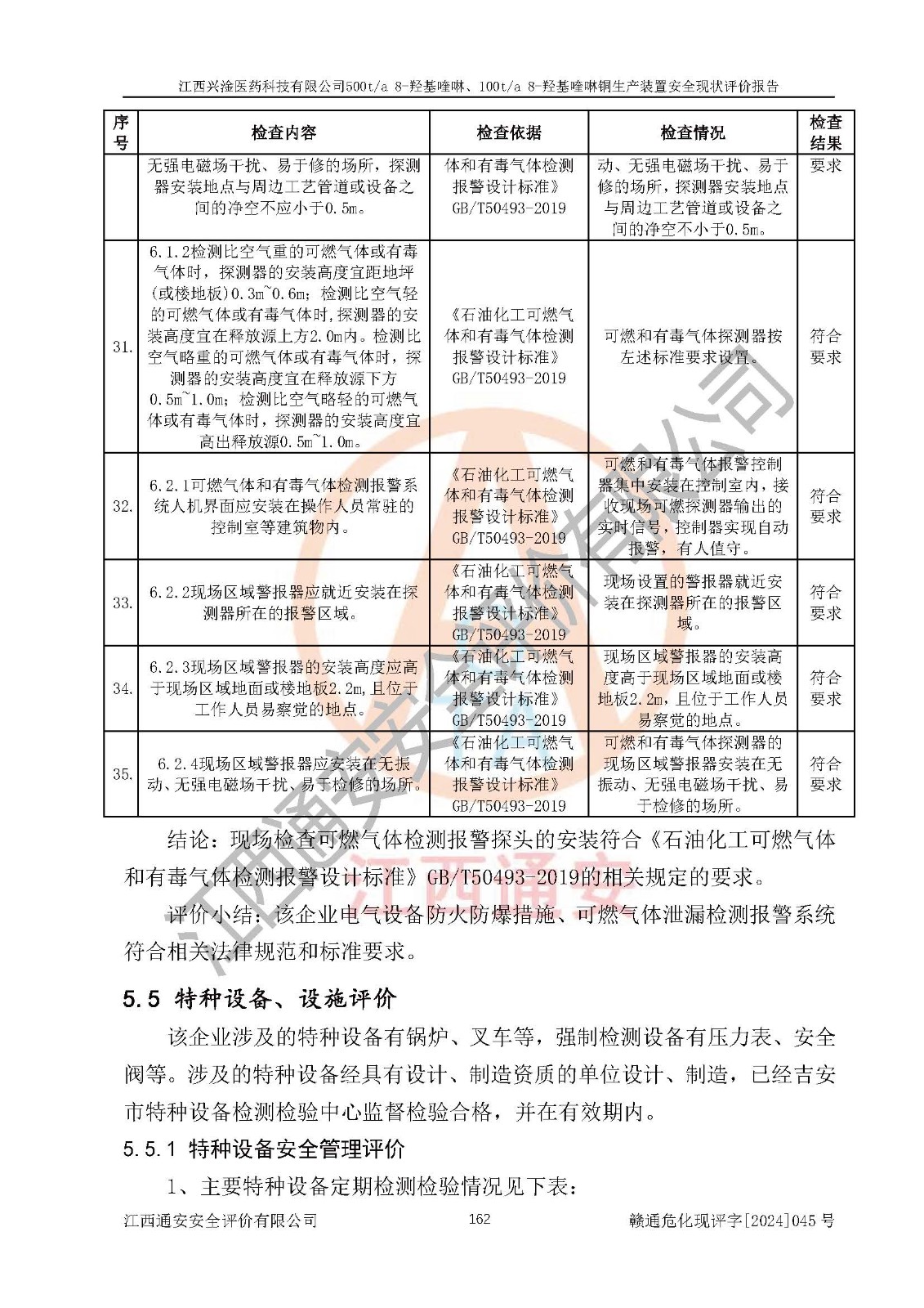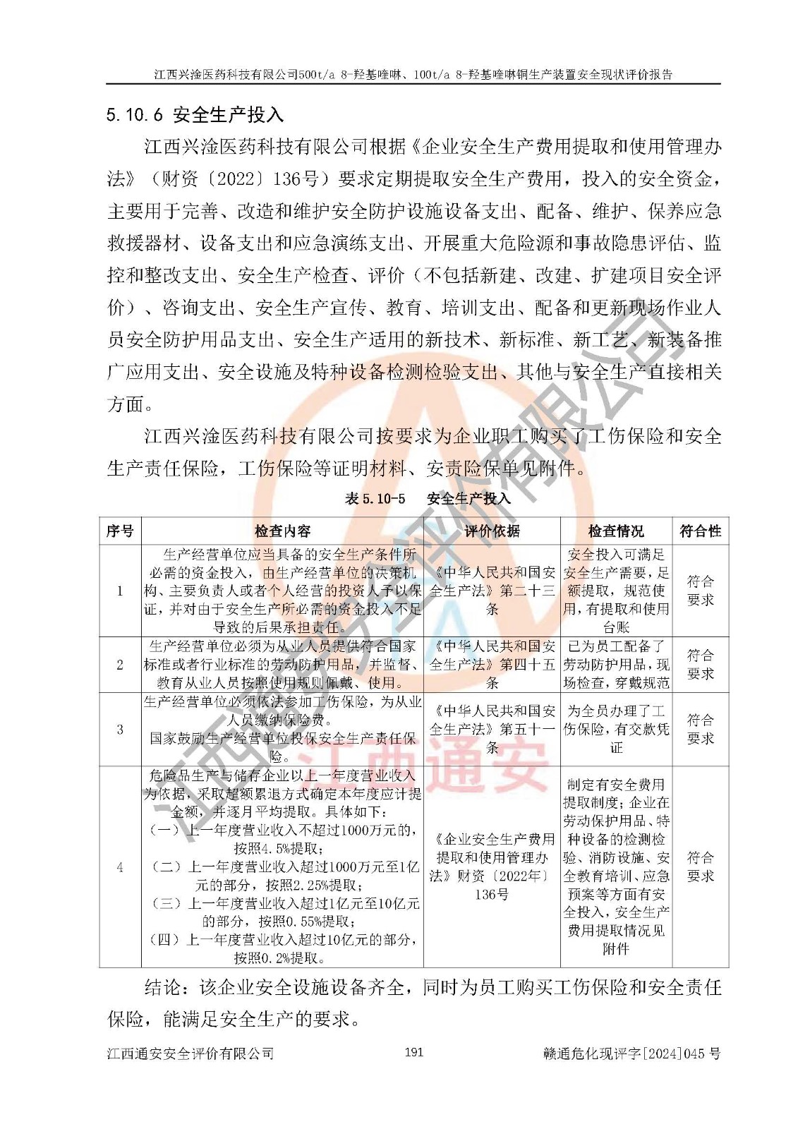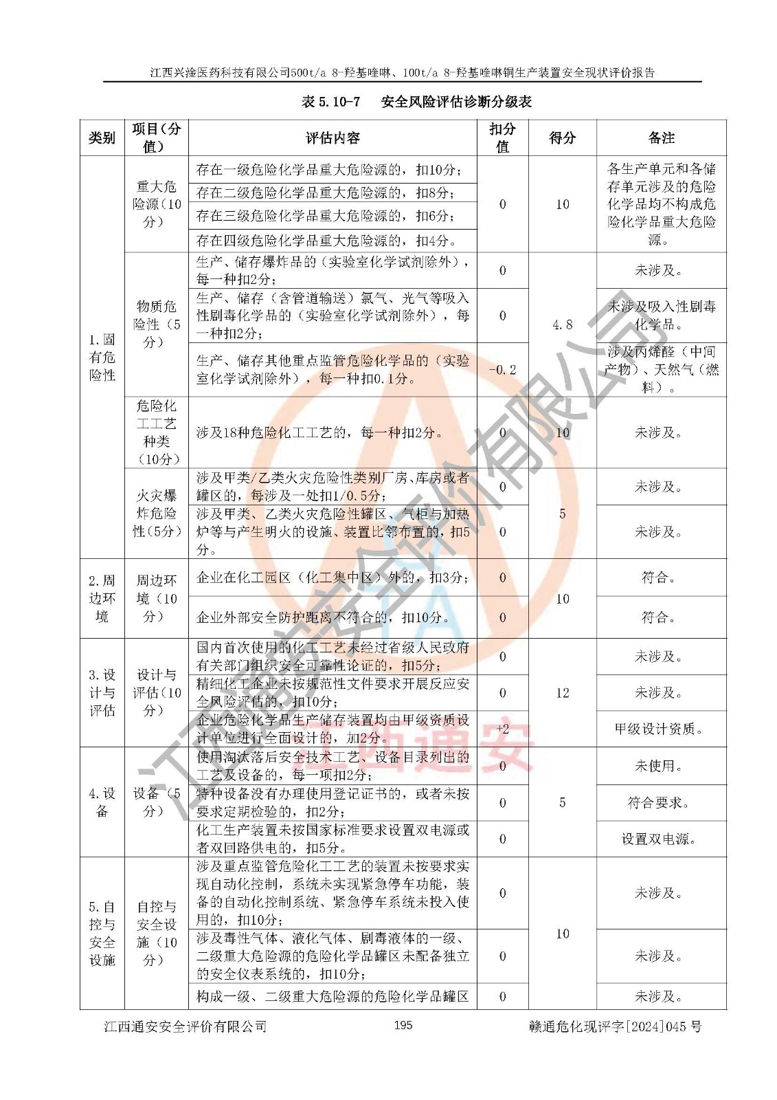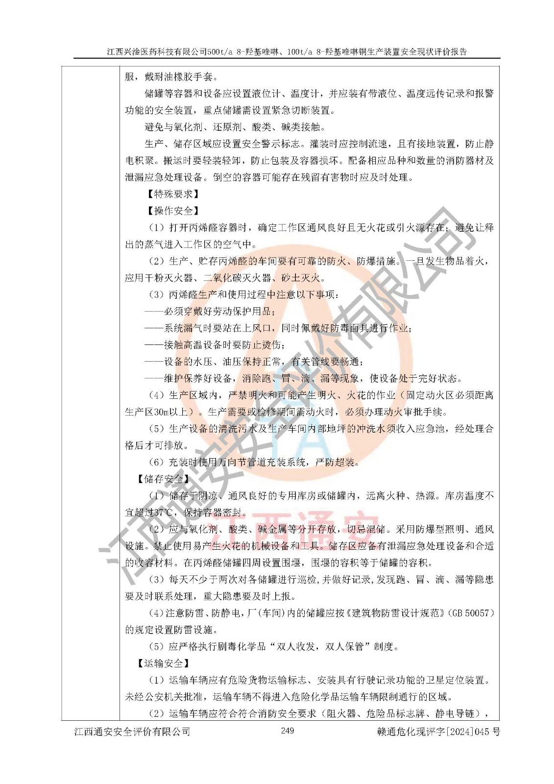 評價結(jié)論 | 評價結(jié)論:本報告認(rèn)為,江西興淦醫(yī)藥科技有限公司500t/a 8-羥基喹啉、100t/a 8-羥基喹啉銅生產(chǎn)裝置現(xiàn)場情況與設(shè)計圖紙一致,自動控制系統(tǒng)設(shè)計符合要求且運行正常,有關(guān)從業(yè)人員資質(zhì)符合《江西省危險化學(xué)品安全專項整治三年行動實施方案》要求,安全設(shè)施及安全管理符合**及有關(guān)部門關(guān)于安全生產(chǎn)法律、法規(guī)、標(biāo)準(zhǔn)的要求,安全設(shè)施正常投用且運行**,安全風(fēng)險是可以控制的,其風(fēng)險程度是可以接受的,安全現(xiàn)狀符合安全生產(chǎn)條件,能夠滿足安全生產(chǎn)的要求。 | |||