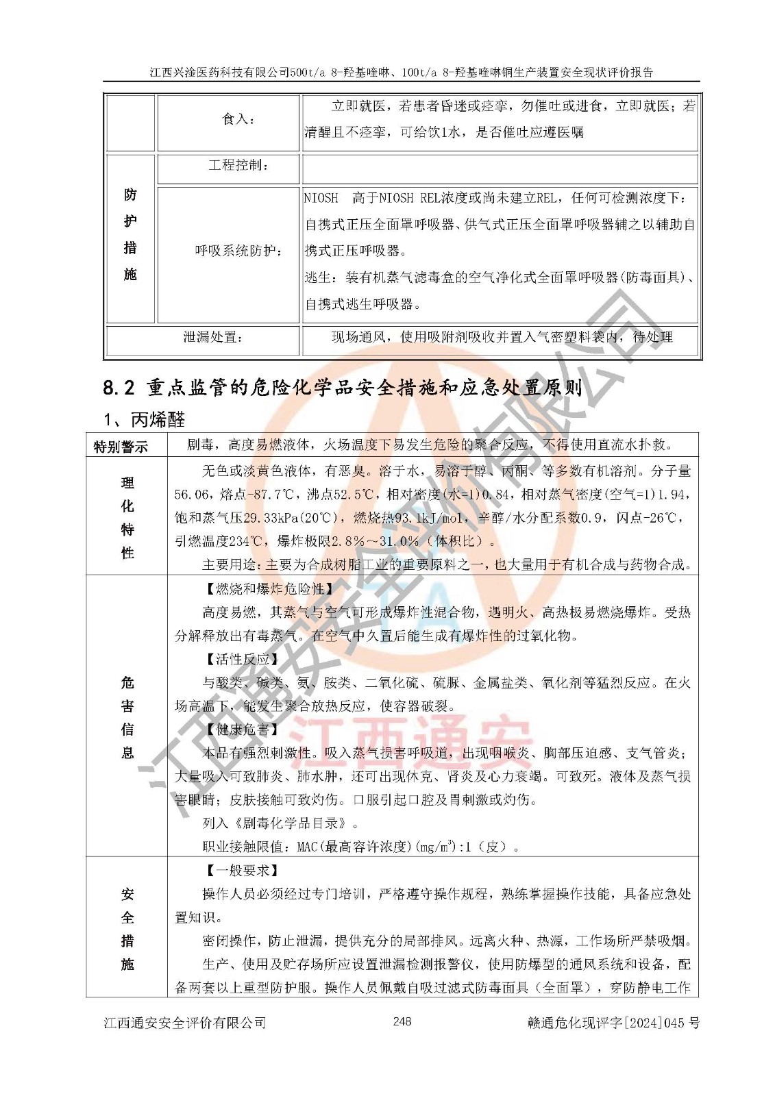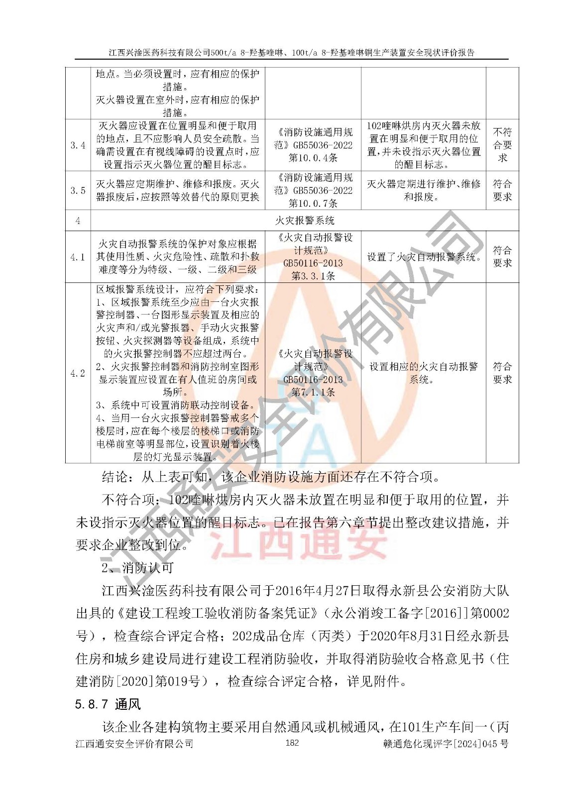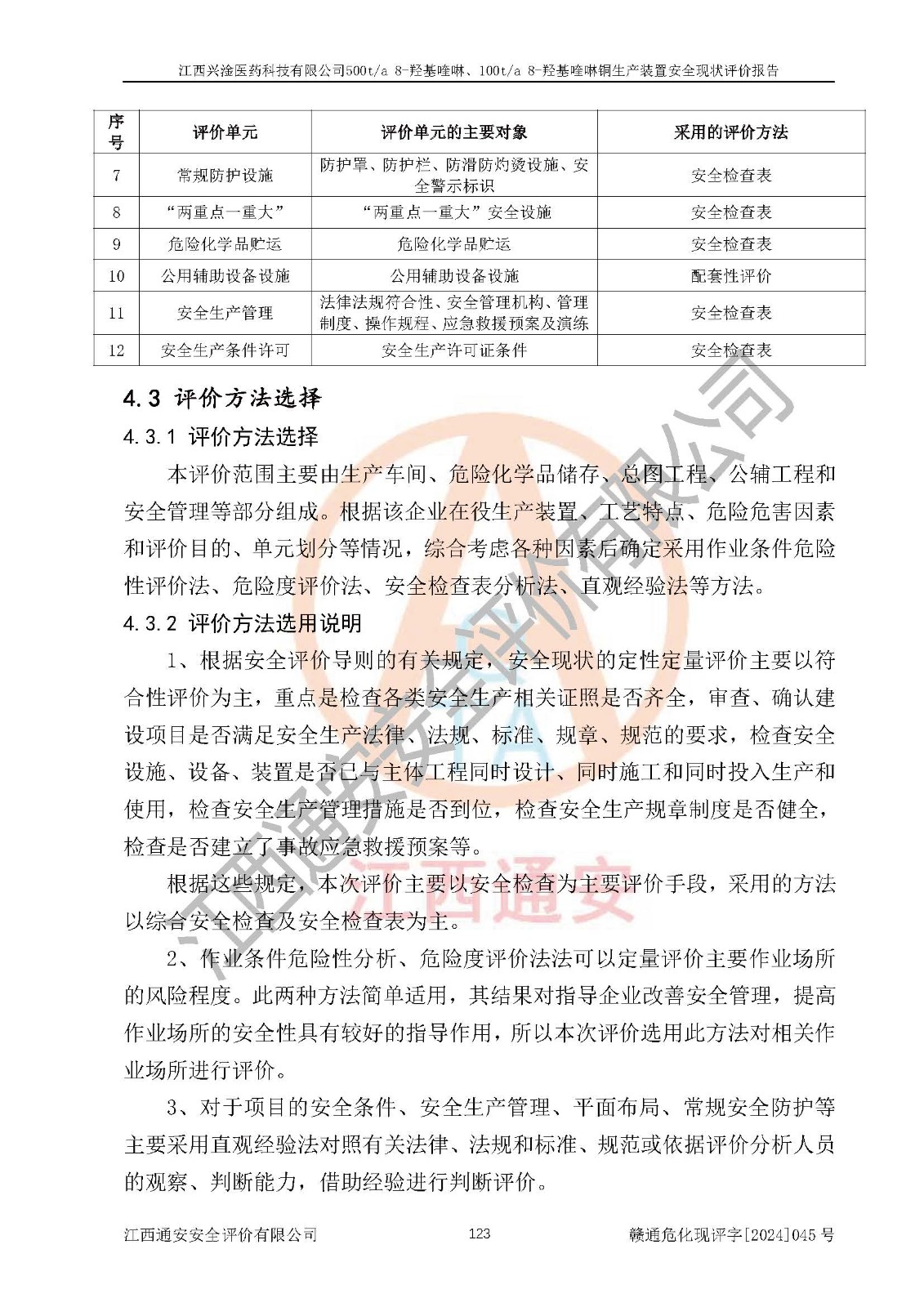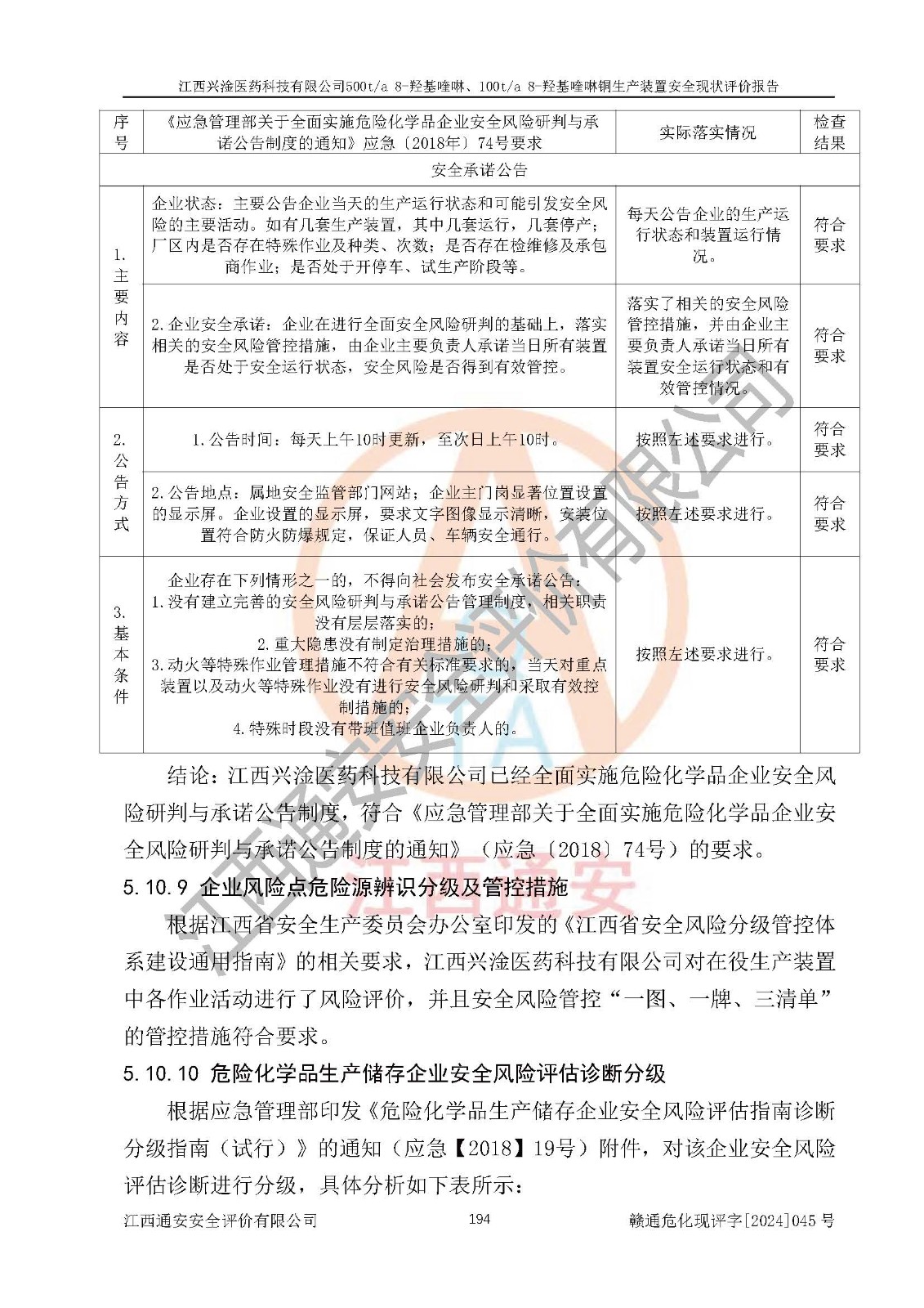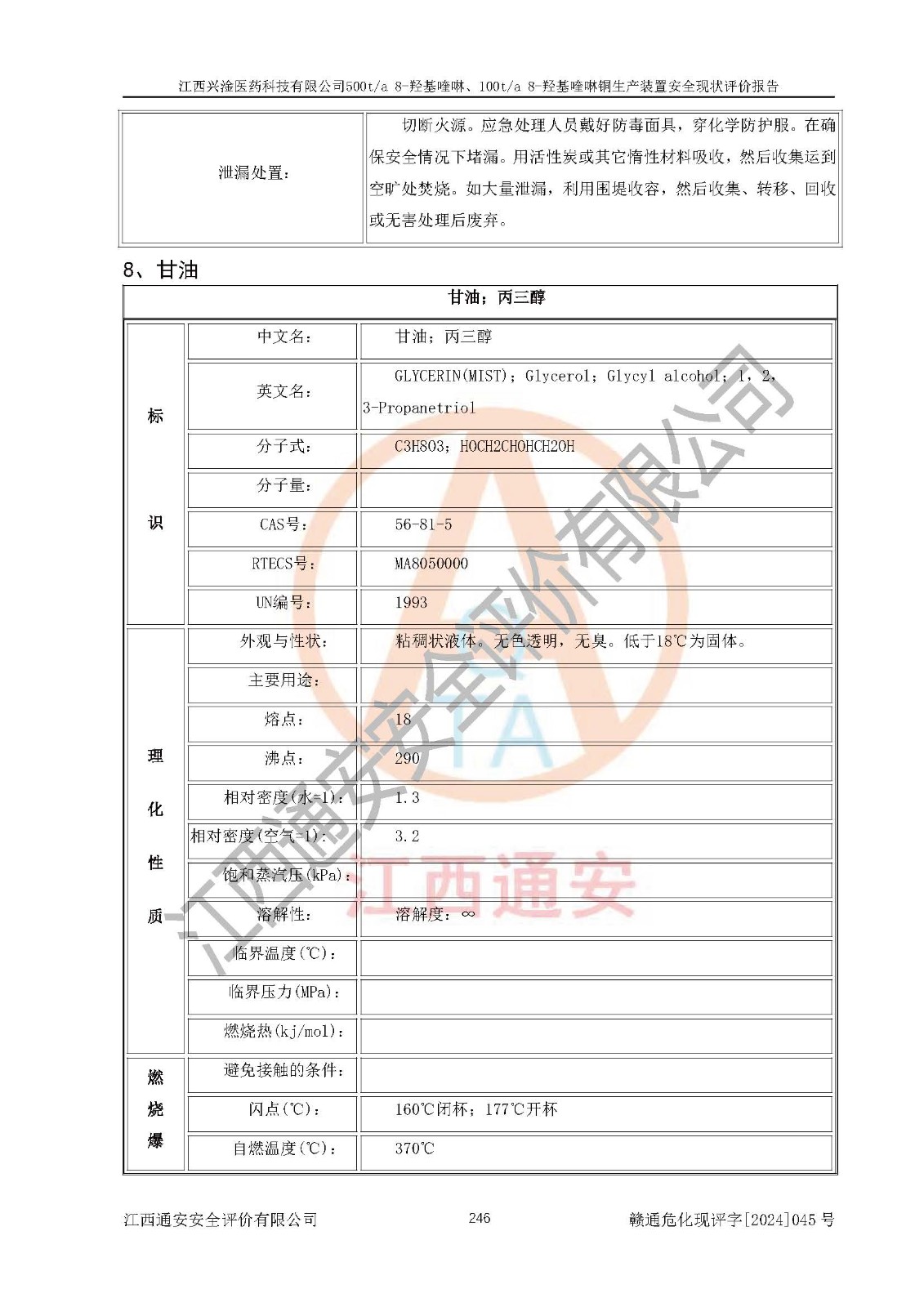 評價結(jié)論 | 評價結(jié)論:本報告認(rèn)為,江西興淦醫(yī)藥科技有限公司500t/a 8-羥基喹啉、100t/a 8-羥基喹啉銅生產(chǎn)裝置現(xiàn)場情況與設(shè)計圖紙一致,自動控制系統(tǒng)設(shè)計符合要求且運行正常,有關(guān)從業(yè)人員資質(zhì)符合《江西省危險化學(xué)品安全專項整治三年行動實施方案》要求,安全設(shè)施及安全管理符合**及有關(guān)部門關(guān)于安全生產(chǎn)法律、法規(guī)、標(biāo)準(zhǔn)的要求,安全設(shè)施正常投用且運行**,安全風(fēng)險是可以控制的,其風(fēng)險程度是可以接受的,安全現(xiàn)狀符合安全生產(chǎn)條件,能夠滿足安全生產(chǎn)的要求。 | |||