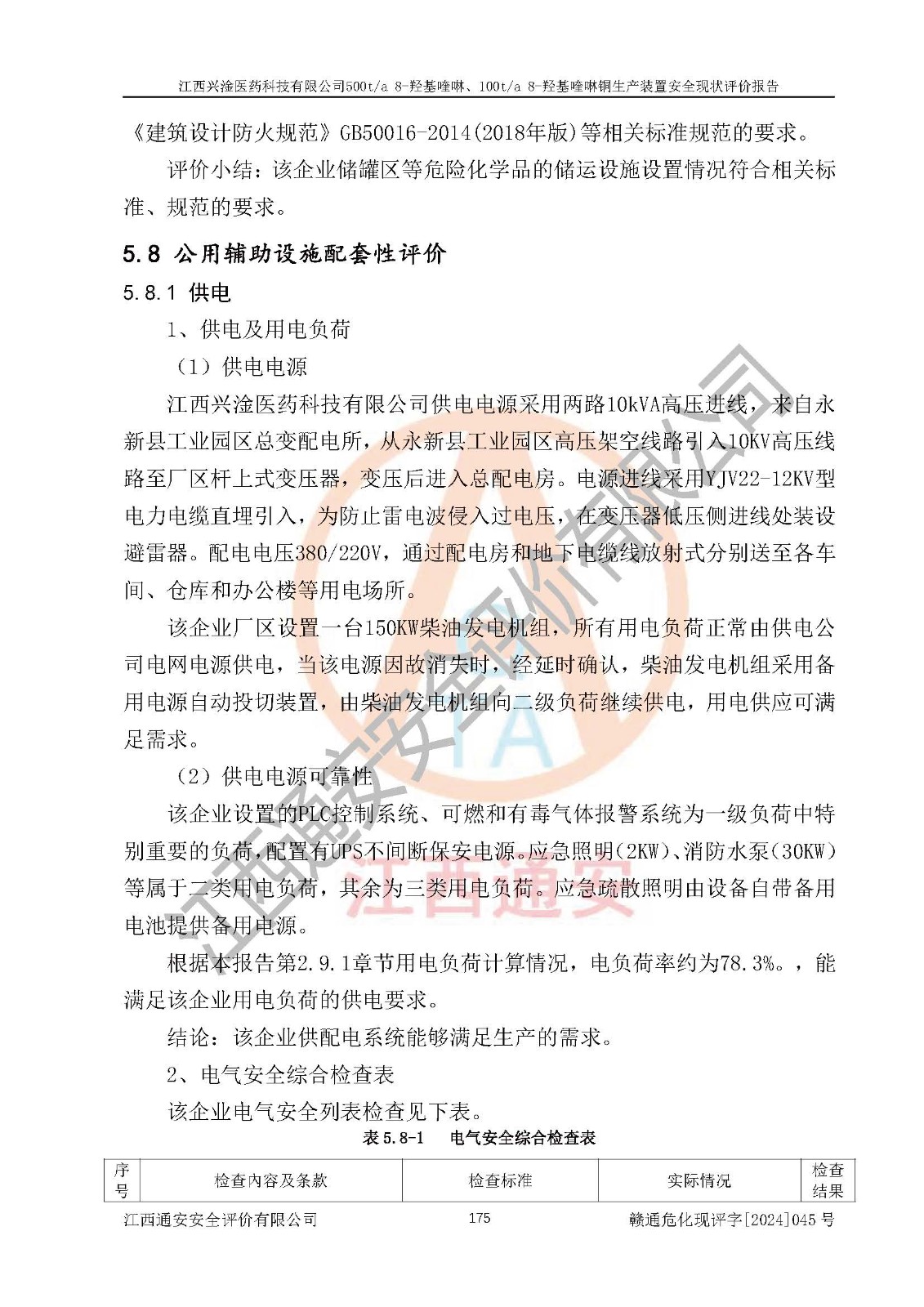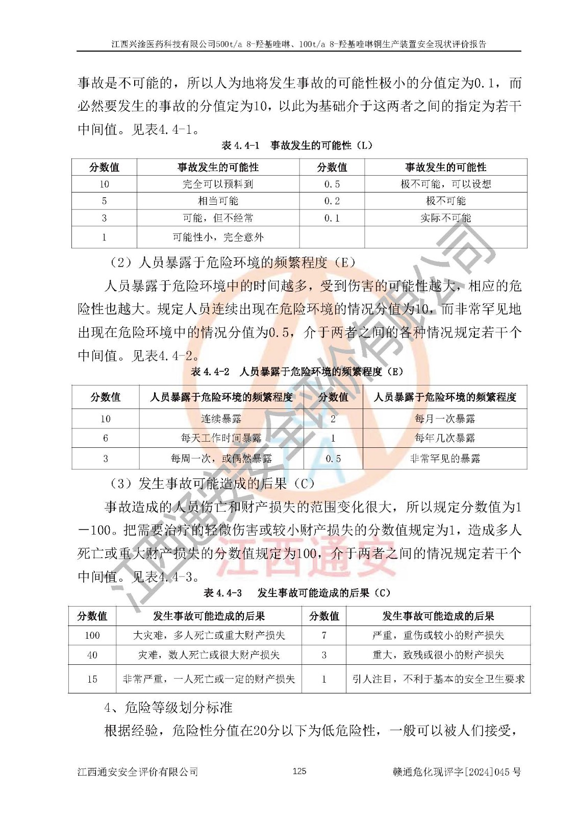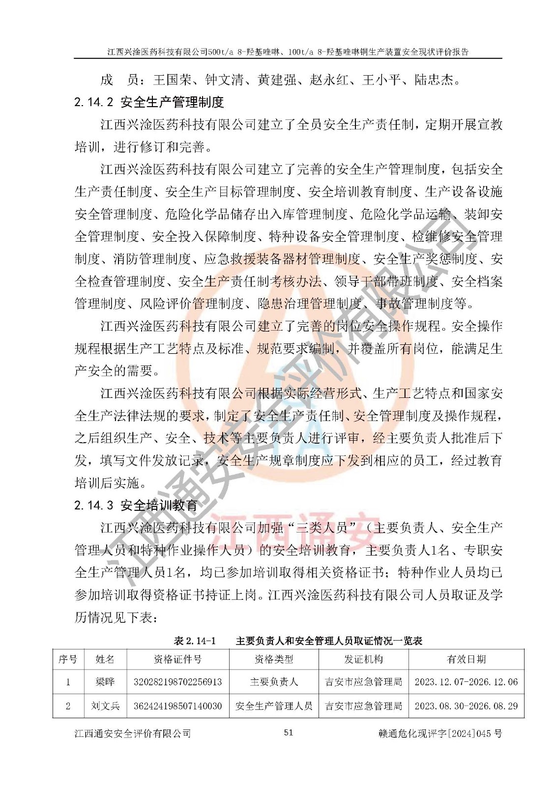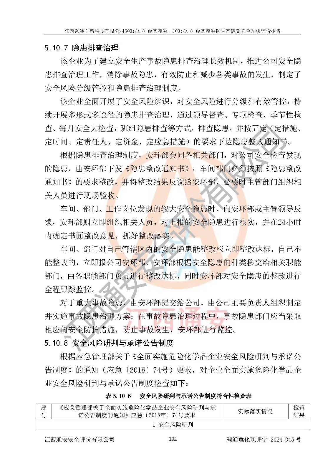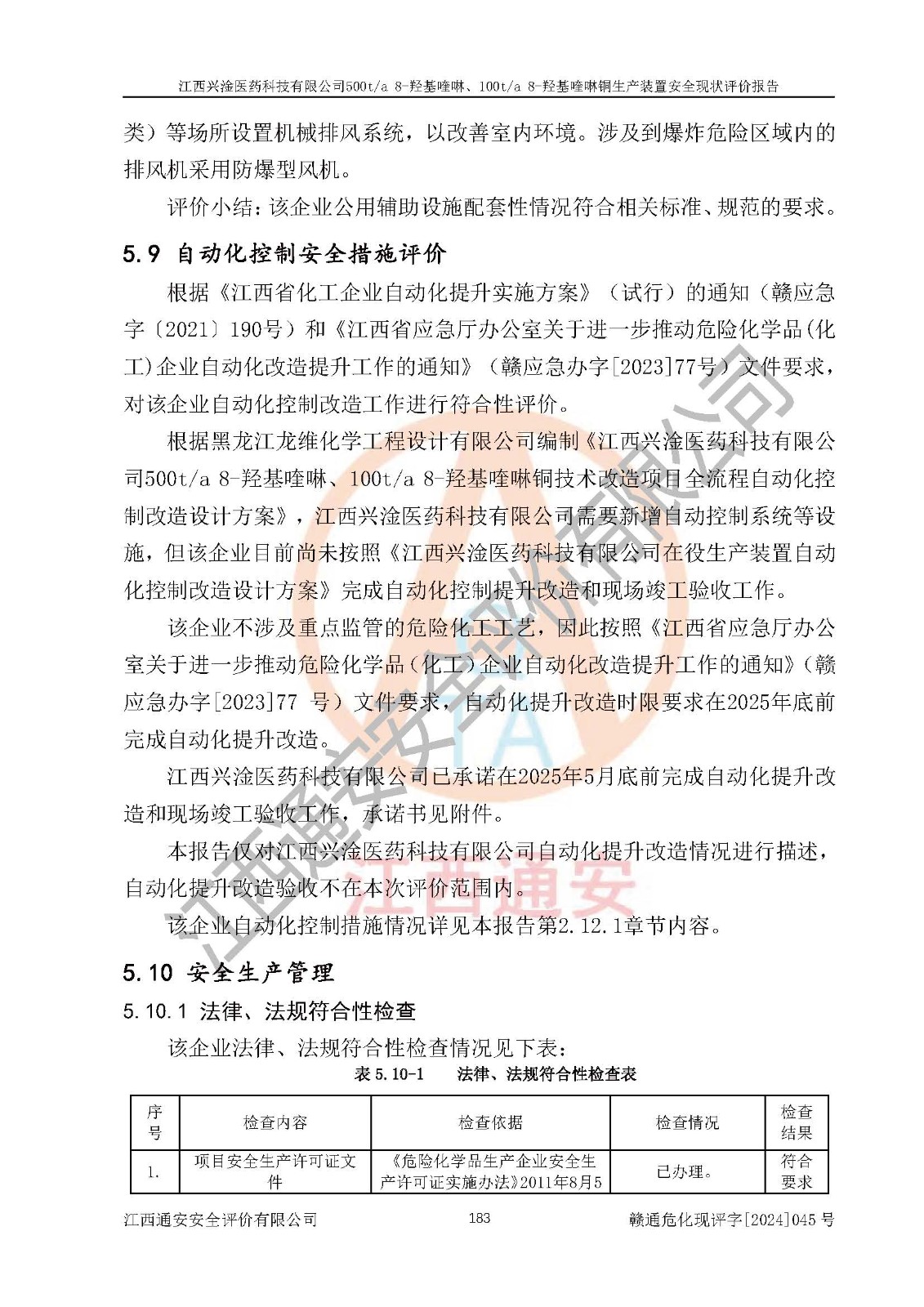 評價結(jié)論 | 評價結(jié)論:本報告認(rèn)為,江西興淦醫(yī)藥科技有限公司500t/a 8-羥基喹啉、100t/a 8-羥基喹啉銅生產(chǎn)裝置現(xiàn)場情況與設(shè)計圖紙一致,自動控制系統(tǒng)設(shè)計符合要求且運行正常,有關(guān)從業(yè)人員資質(zhì)符合《江西省危險化學(xué)品安全專項整治三年行動實施方案》要求,安全設(shè)施及安全管理符合**及有關(guān)部門關(guān)于安全生產(chǎn)法律、法規(guī)、標(biāo)準(zhǔn)的要求,安全設(shè)施正常投用且運行**,安全風(fēng)險是可以控制的,其風(fēng)險程度是可以接受的,安全現(xiàn)狀符合安全生產(chǎn)條件,能夠滿足安全生產(chǎn)的要求。 | |||