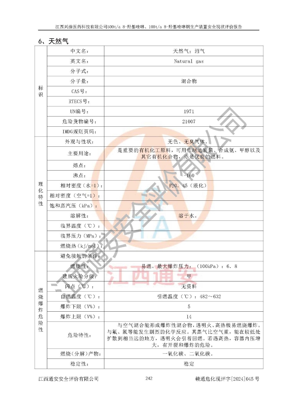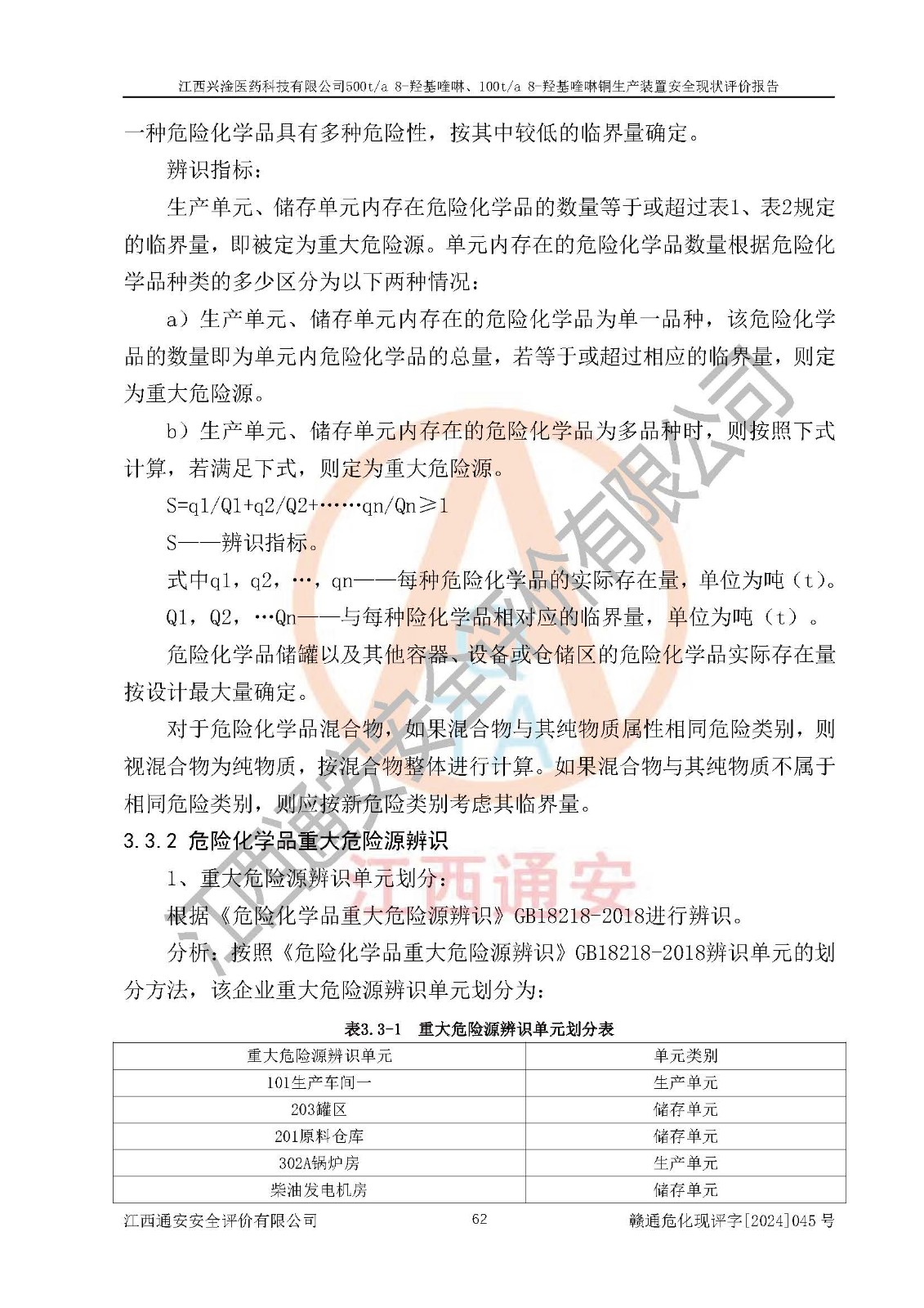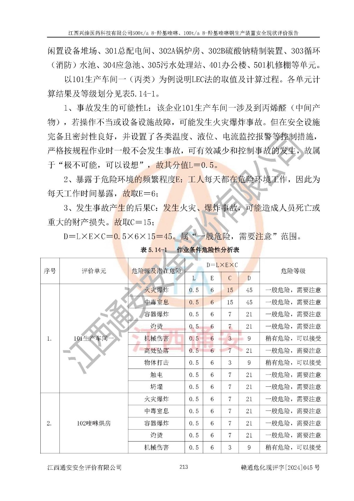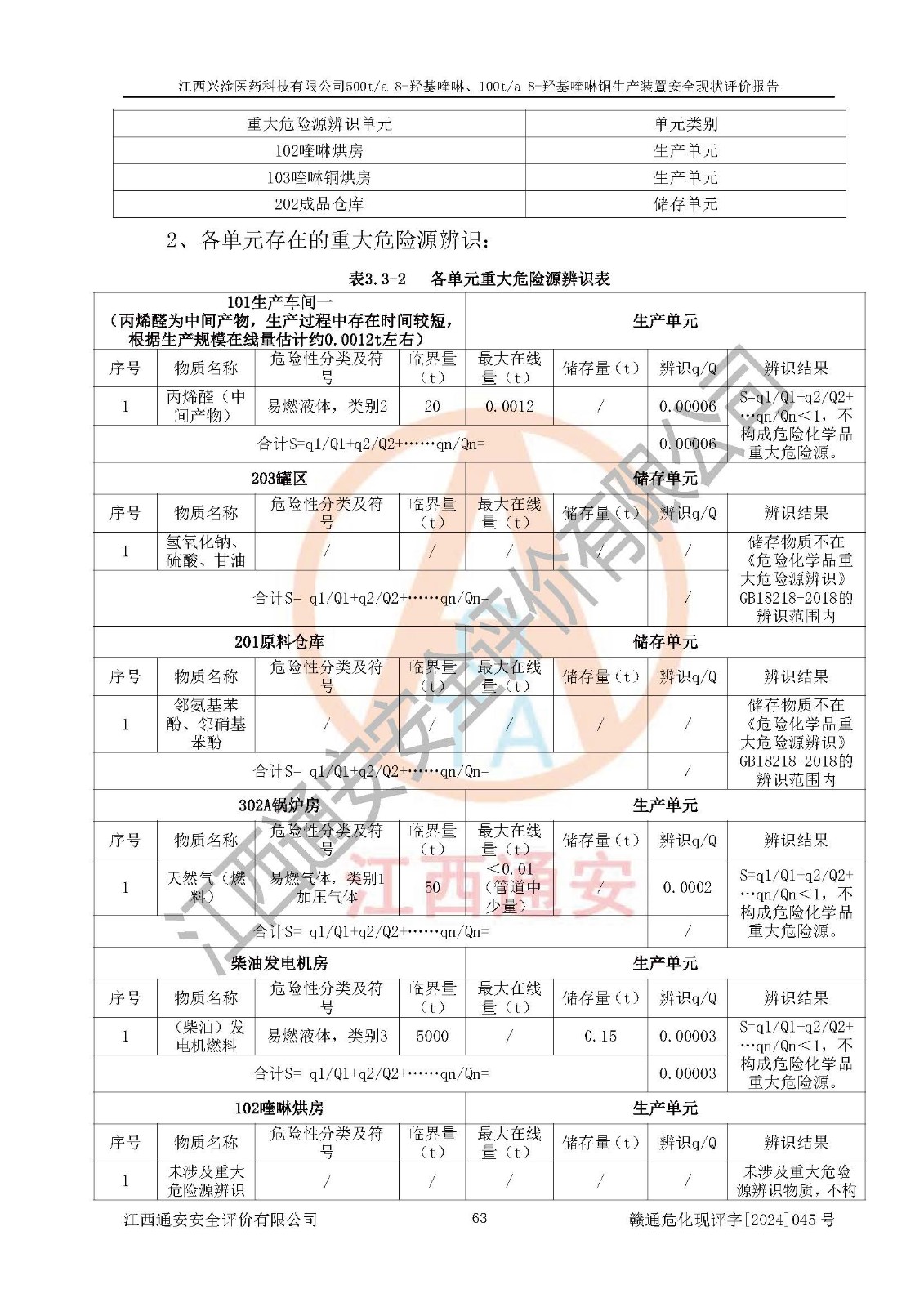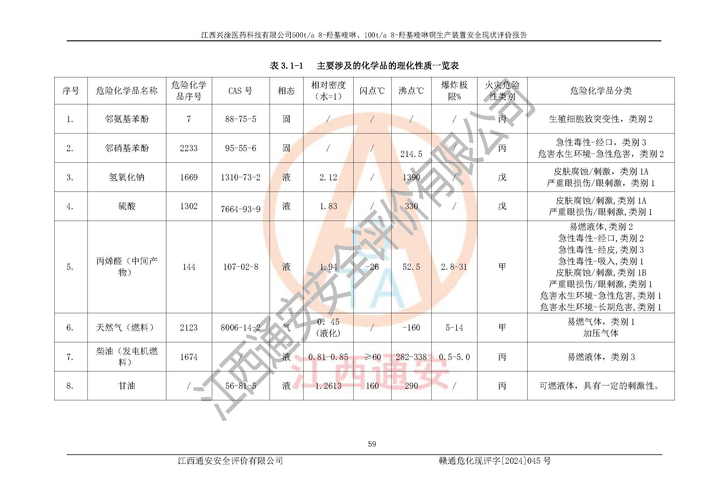 項目簡介 | 江西興淦醫(yī)藥科技有限公司成立于2014年8月26日,并取得永新縣市場監(jiān)督管理局頒發(fā)的《營業(yè)執(zhí)照》,公司注冊住所:江西省吉安市永新縣工業(yè)園區(qū),營業(yè)執(zhí)照統(tǒng)一社會信用代碼:91360830146920625,公司類型:有限責(zé)任公司(自然人投資或控股),法定**人:梁曄,注冊資本:468萬元,經(jīng)營范圍:醫(yī)藥中間體的生產(chǎn)與銷售:地產(chǎn)中藥材的種植與銷售。(依法須經(jīng)批準(zhǔn)的項目,經(jīng)相關(guān)部門批準(zhǔn)后方可開展經(jīng)營活動)。 江西興淦醫(yī)藥科技有限公司目前在役生產(chǎn)裝置為500t/a 8-羥基喹啉、100t/a 8-羥基喹啉銅生產(chǎn)裝置。 江西興淦醫(yī)藥科技有限公司于2021年9月17日延期取得江西省應(yīng)急管理廳頒發(fā)的《安全生產(chǎn)許可證》(贛)WH安許證字[2018]1004號。許可范圍:8-羥基喹啉(500t/a)、8-羥基喹啉銅(100t/a),**期:2021年9月21日至2024年9月20日。 江西興淦醫(yī)藥科技有限公司于2020年01月07日取得永新縣工業(yè)和信息化局《江西省工業(yè)企業(yè)技術(shù)改造項目備案通知書》,項目名稱:江西興淦醫(yī)藥科技有限公司年產(chǎn)500噸8-羥基喹啉、100噸8-羥基喹啉銅技術(shù)改造項目,項目統(tǒng)一代碼為:2020-360830-27-03-000425。 根據(jù)《危險化學(xué)品目錄(2015版)》(2022年修訂),對該企業(yè)生產(chǎn)過程中所涉及的化學(xué)品進行辨識:該企業(yè)涉及的危險化學(xué)品有鄰氨基苯酚、鄰硝基苯酚、濃硫酸、氫氧化鈉、丙烯醛(中間產(chǎn)物)、天然氣(燃料)、柴油(發(fā)電機燃料)等屬于危險化學(xué)品。 該企業(yè)在生產(chǎn)過程中存在的主要危險有:火災(zāi)爆炸、容器爆炸、灼燙、中毒窒息、機械傷害、高處墜落、物體打擊、**傷害、觸電、淹溺、坍塌等。其中火災(zāi)爆炸、中毒窒息是*主要的危險因素。 根據(jù)《**安全監(jiān)管總局關(guān)于公布首批重點監(jiān)管的危險化工工藝目錄的通知》原安監(jiān)總管三[2009]116號、《**安全監(jiān)管總局關(guān)于公布第二批重點監(jiān)管危險化工工藝目錄和調(diào)整首批重點監(jiān)管危險化工工藝中部分典型工藝的通知》原安監(jiān)總管三[2013]3號的規(guī)定對該企業(yè)在役生產(chǎn)裝置生產(chǎn)工藝進行辨識:該企業(yè)不涉及重點監(jiān)管的危險化工工藝。根據(jù)《**安全監(jiān)管總局關(guān)于公布首批重點監(jiān)管的危險化學(xué)品名錄的通知》原安監(jiān)總管三[2011]95號、《**安全監(jiān)管總局關(guān)于公布第二批重點監(jiān)管危險化學(xué)品名錄的通知》原安監(jiān)總管三[2013]12號進行辨識:該企業(yè)涉及的丙烯醛(中間產(chǎn)物)、天然氣(燃料)屬于重點監(jiān)管的危險化學(xué)品。 根據(jù)《危險化學(xué)品重大危險源辨識》(GB18218-2018)進行辨識,該企業(yè)各生產(chǎn)單元和儲存單元涉及的危險化學(xué)品均不構(gòu)成危險化學(xué)品重大危險源。 | |||