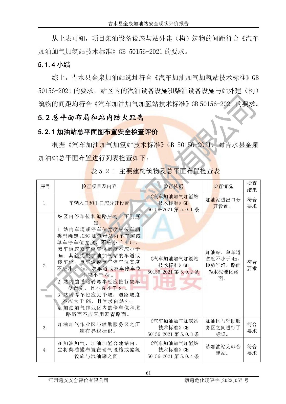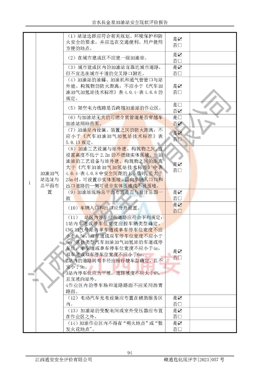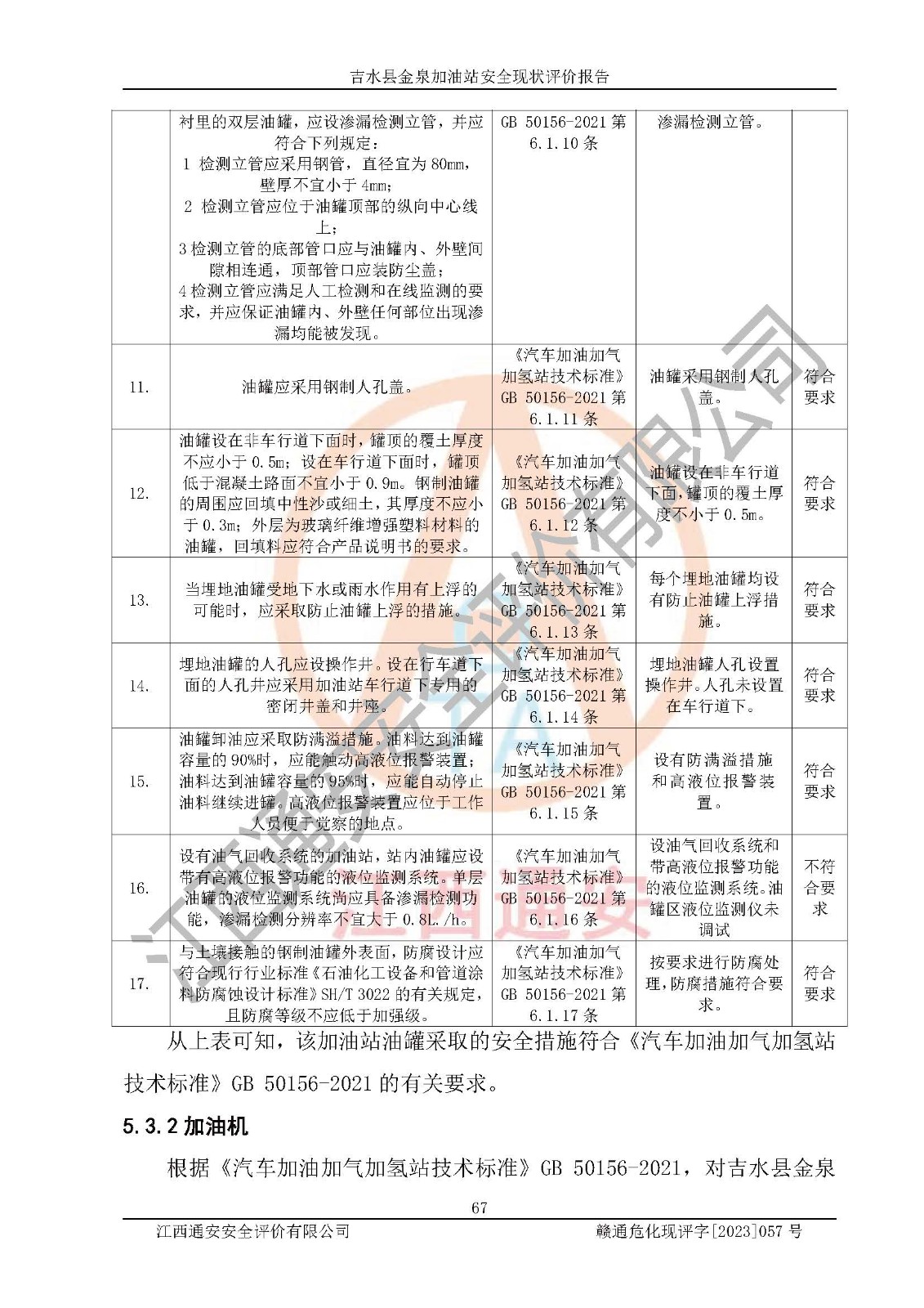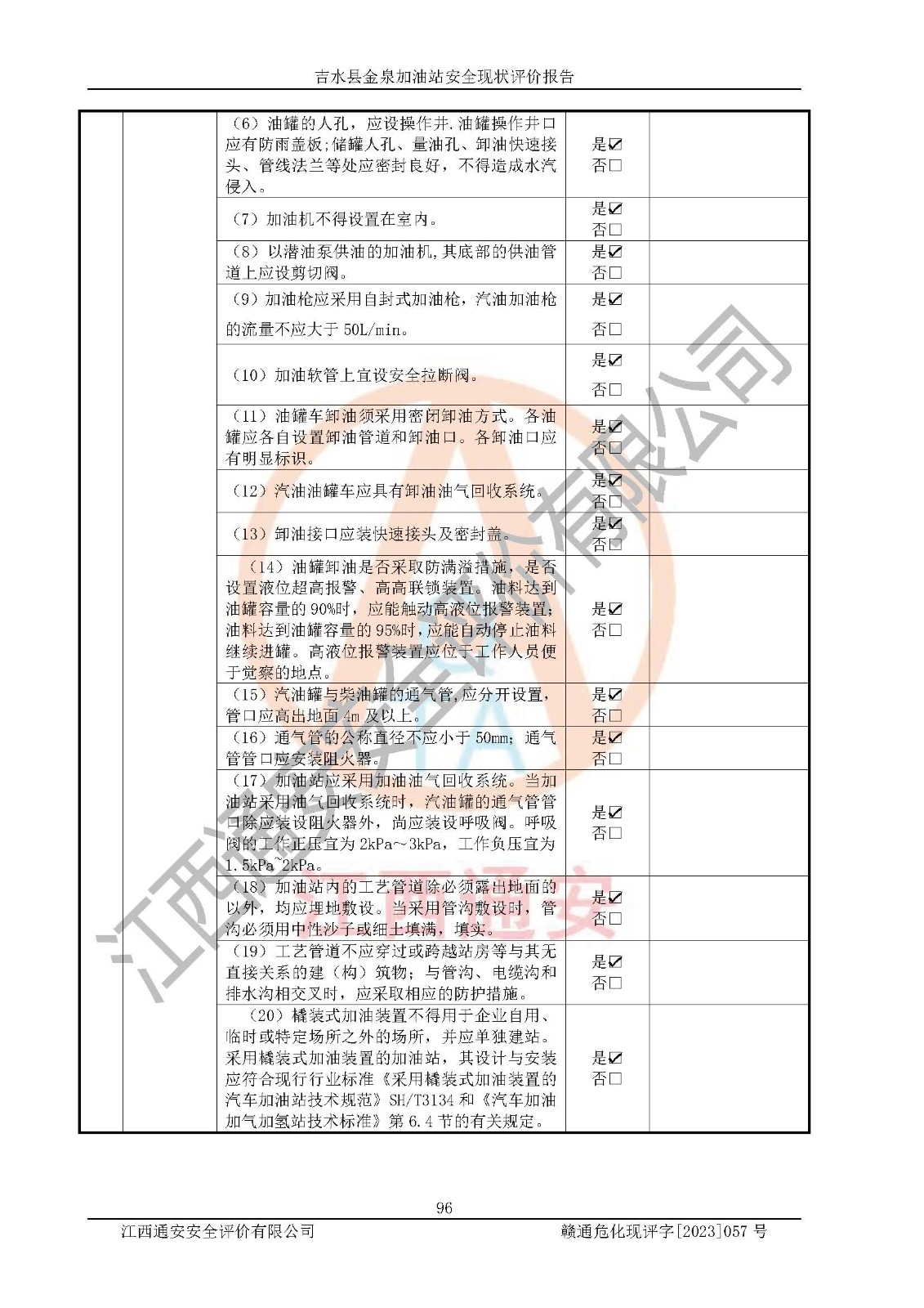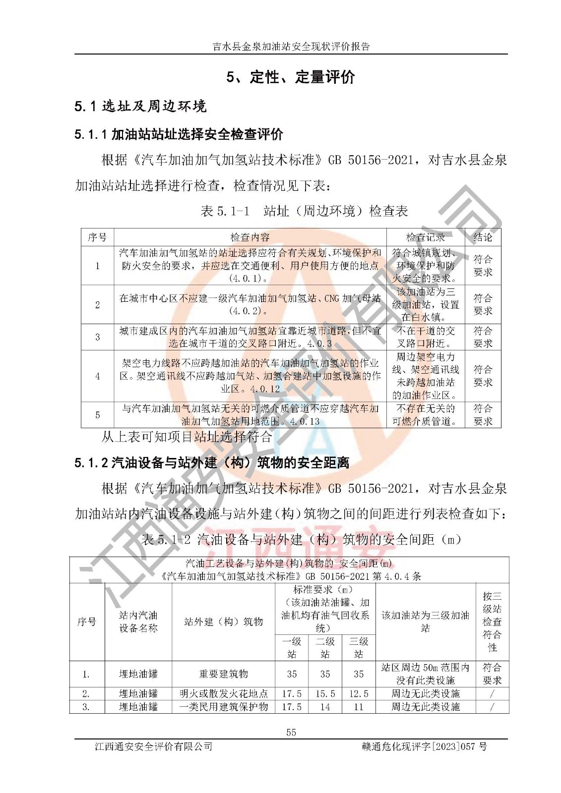 評(píng)價(jià)結(jié)論 | 吉水縣金泉加油站符合《汽車(chē)加油加氣加氫站技術(shù)標(biāo)準(zhǔn)》GB50156-2021等標(biāo)準(zhǔn)規(guī)范的要求,安全風(fēng)險(xiǎn)可控,滿足危險(xiǎn)化學(xué)品經(jīng)營(yíng)的安全條件。 | |||