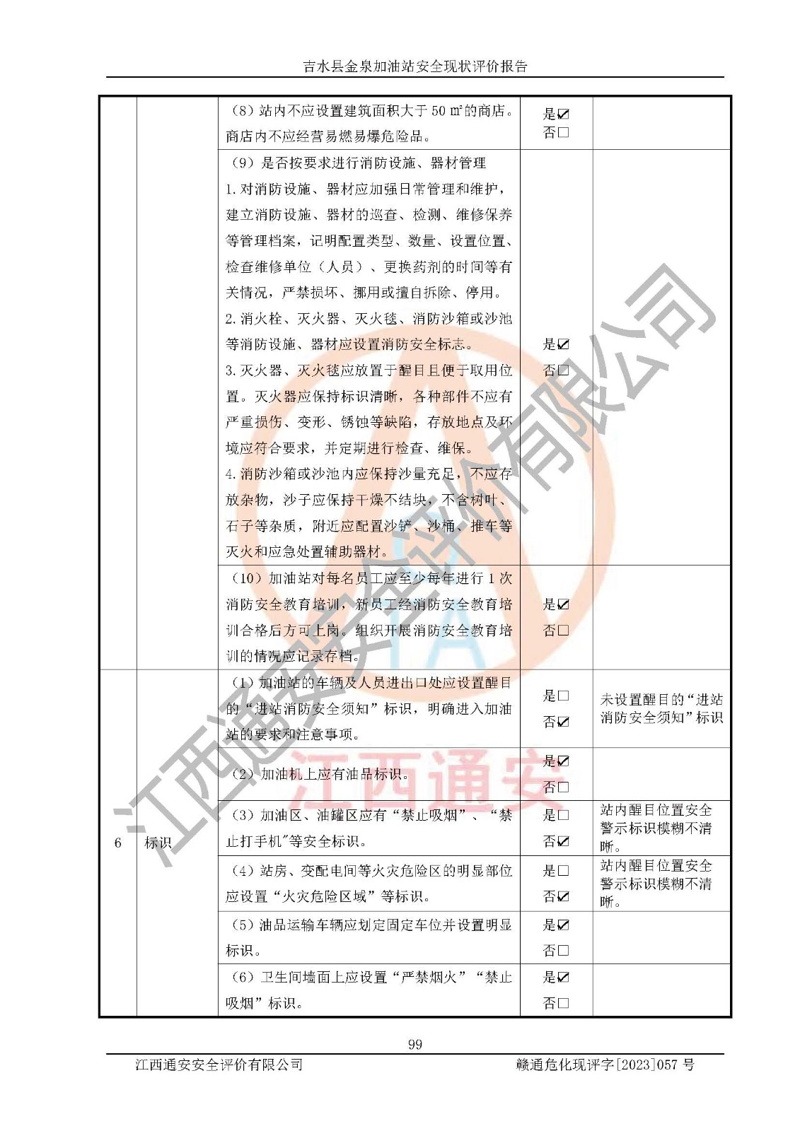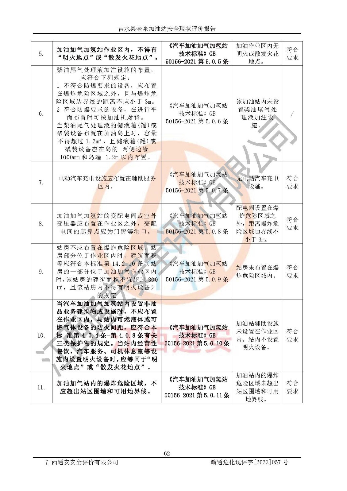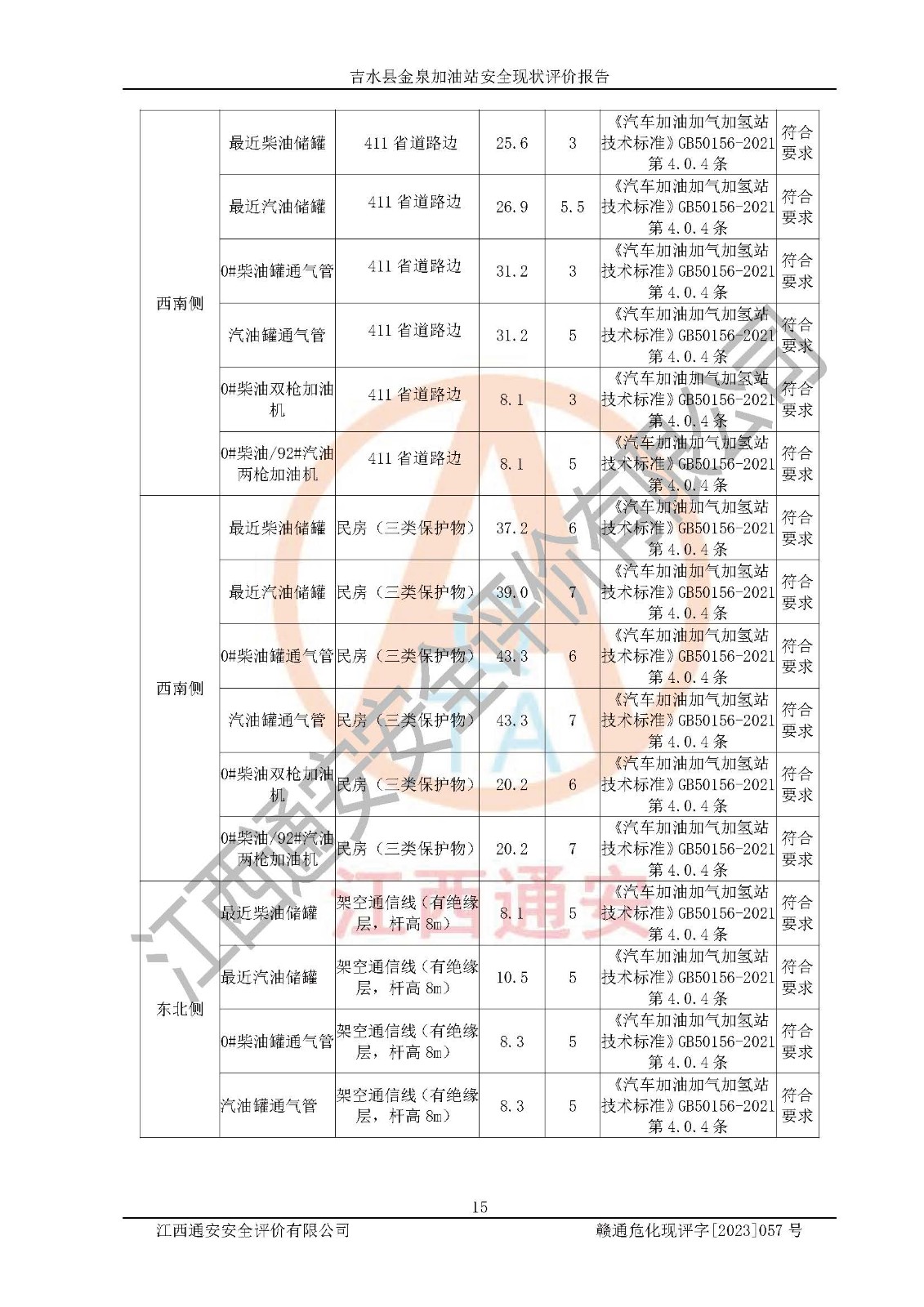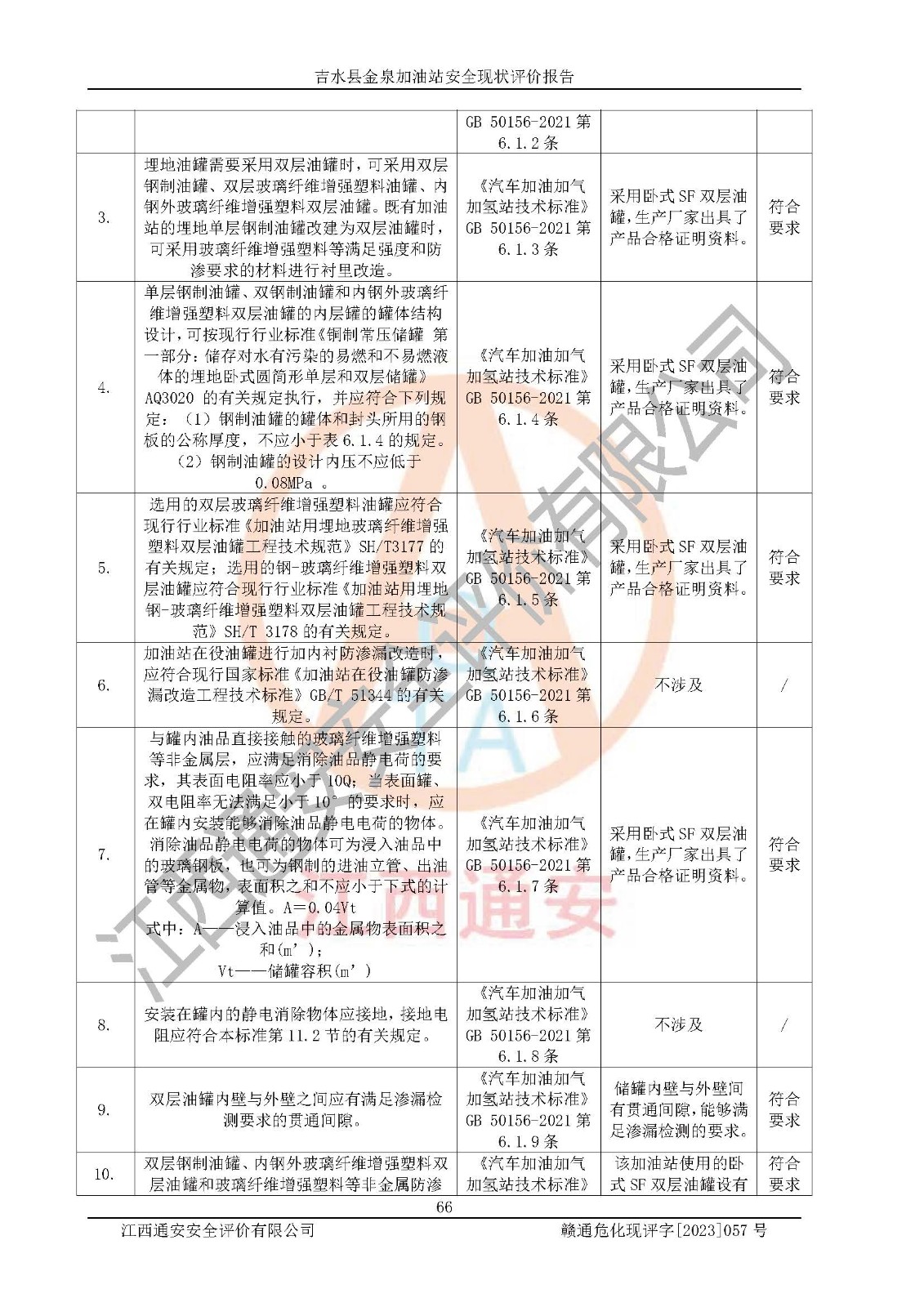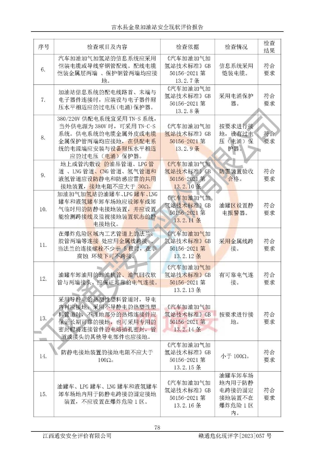 評(píng)價(jià)結(jié)論 | 吉水縣金泉加油站符合《汽車(chē)加油加氣加氫站技術(shù)標(biāo)準(zhǔn)》GB50156-2021等標(biāo)準(zhǔn)規(guī)范的要求,安全風(fēng)險(xiǎn)可控,滿足危險(xiǎn)化學(xué)品經(jīng)營(yíng)的安全條件。 | |||