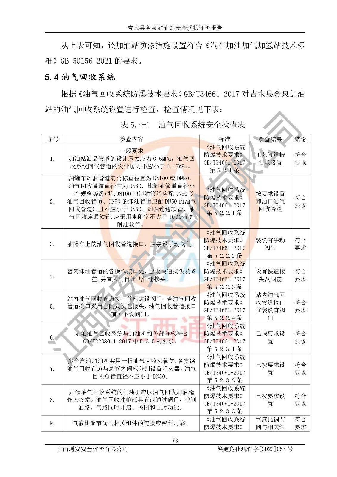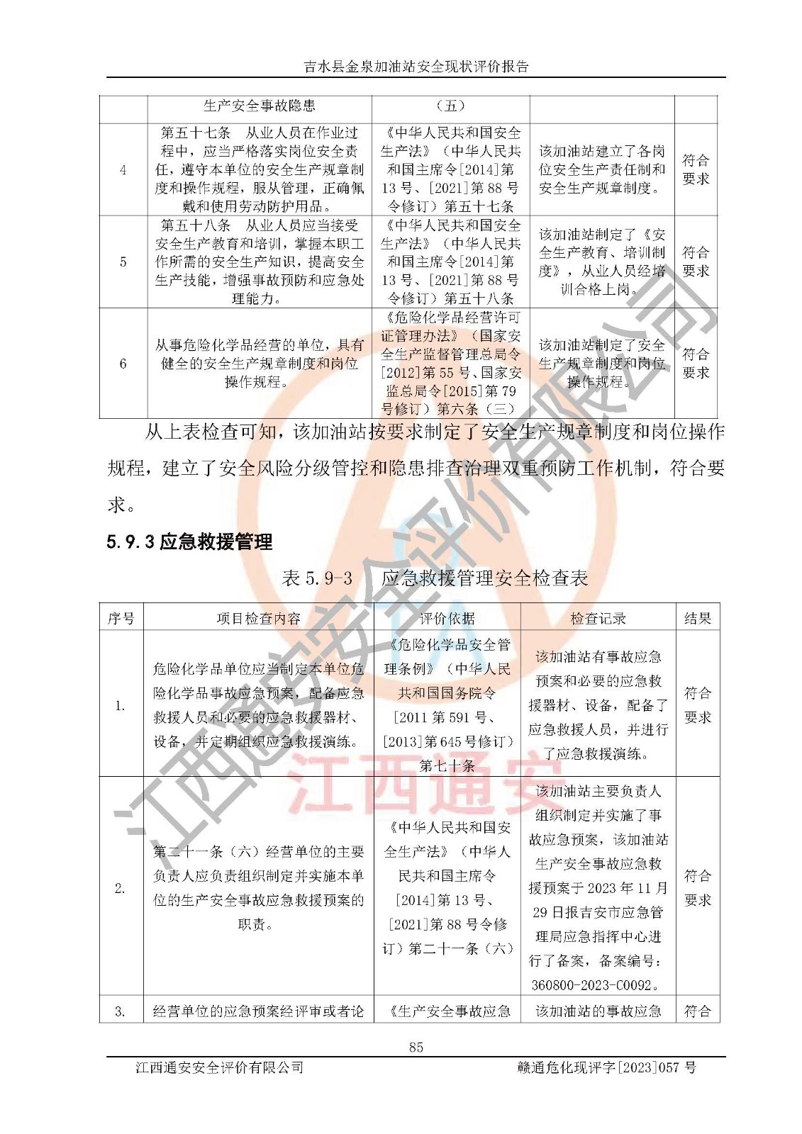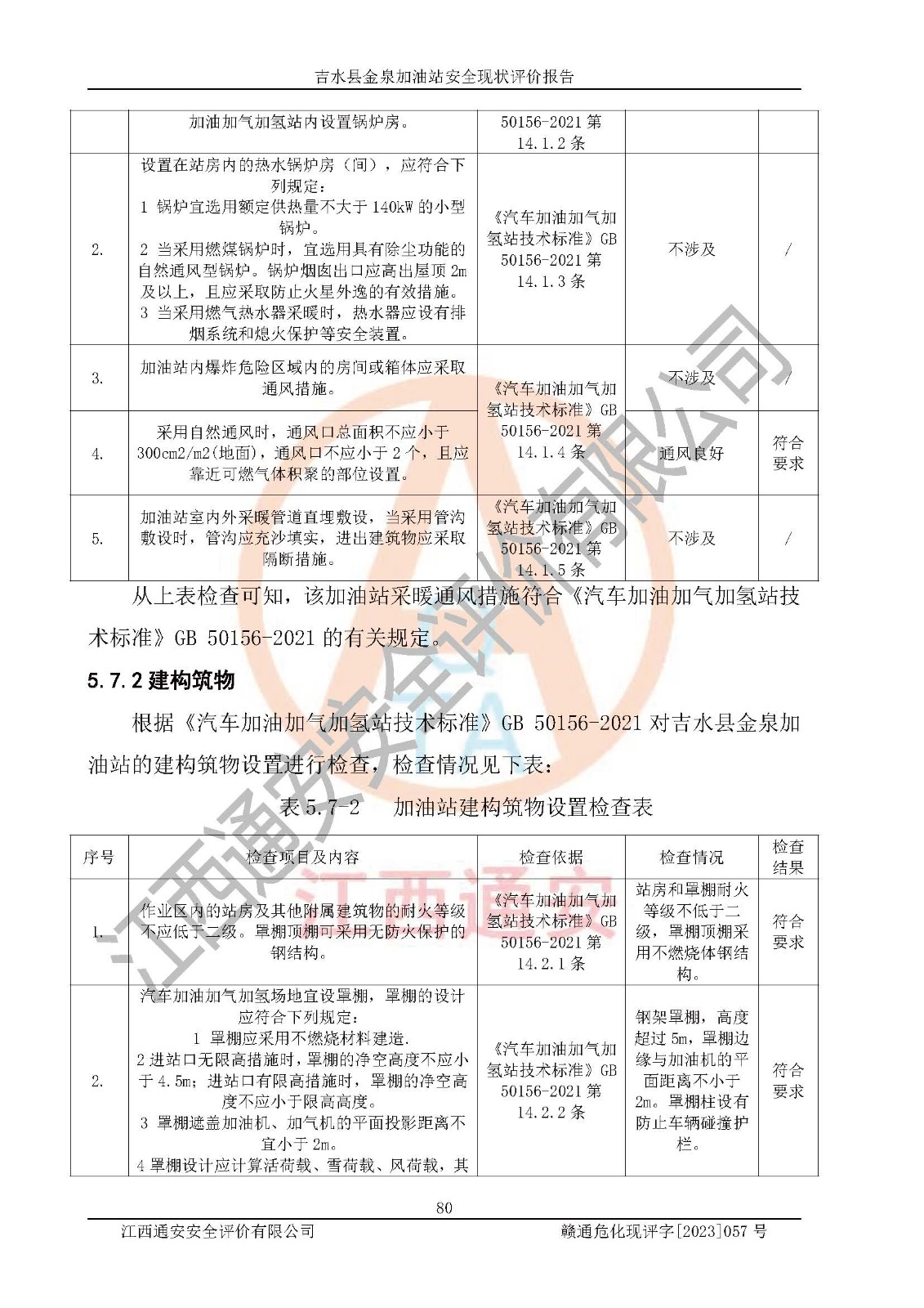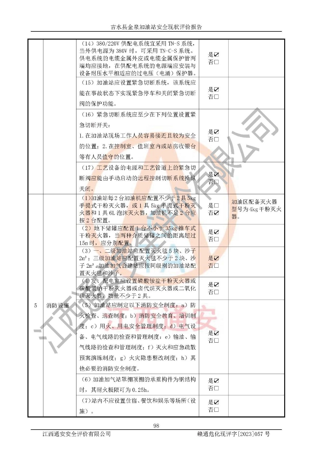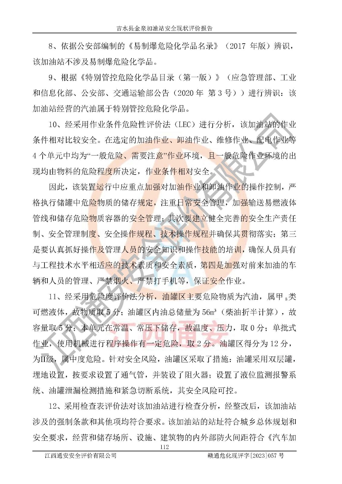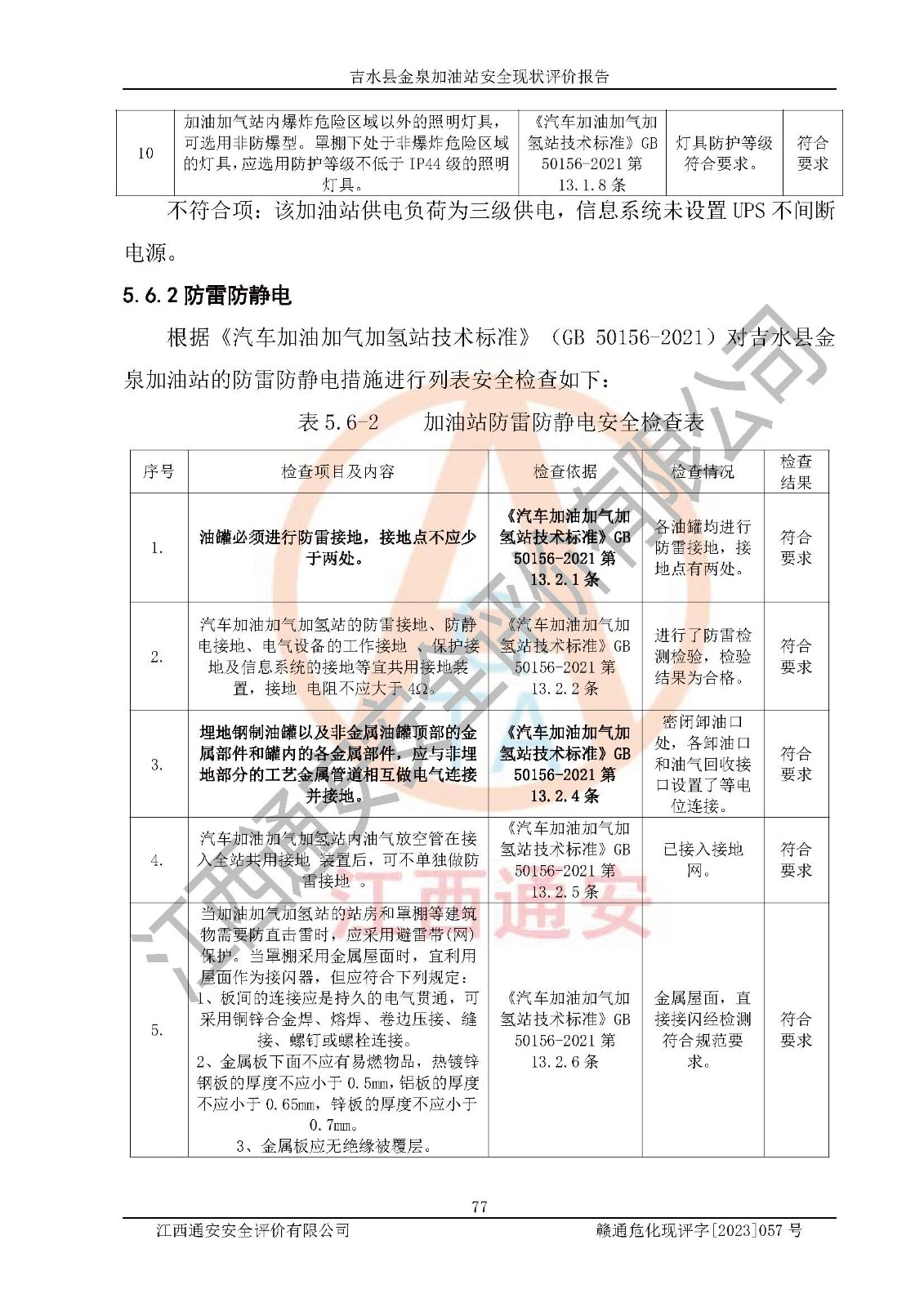 評(píng)價(jià)結(jié)論 | 吉水縣金泉加油站符合《汽車(chē)加油加氣加氫站技術(shù)標(biāo)準(zhǔn)》GB50156-2021等標(biāo)準(zhǔn)規(guī)范的要求,安全風(fēng)險(xiǎn)可控,滿足危險(xiǎn)化學(xué)品經(jīng)營(yíng)的安全條件。 | |||