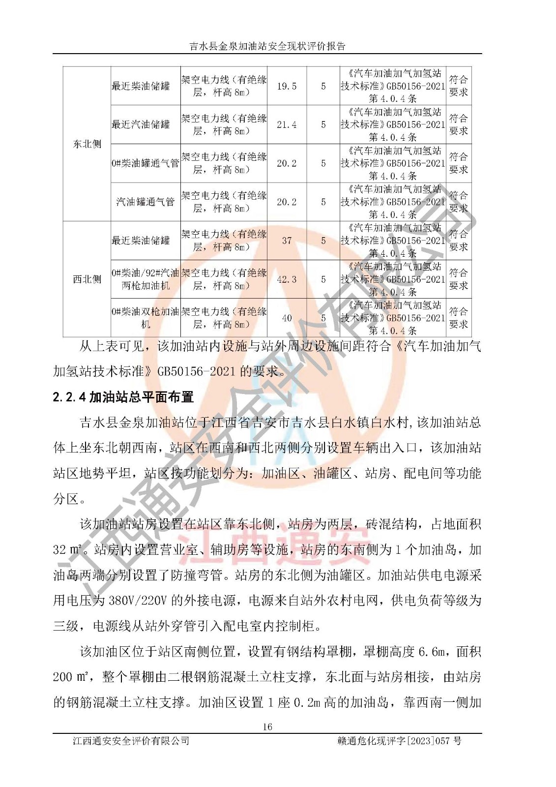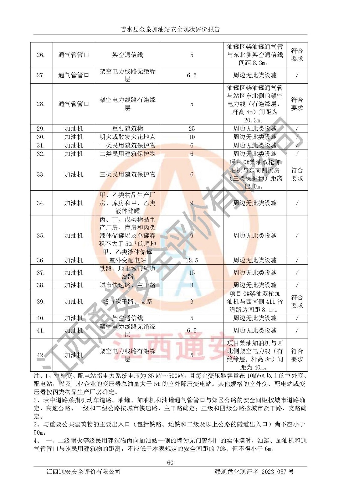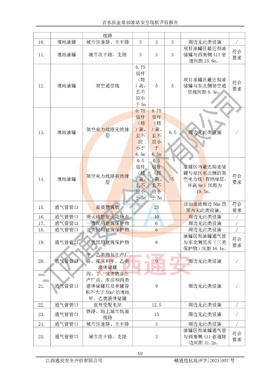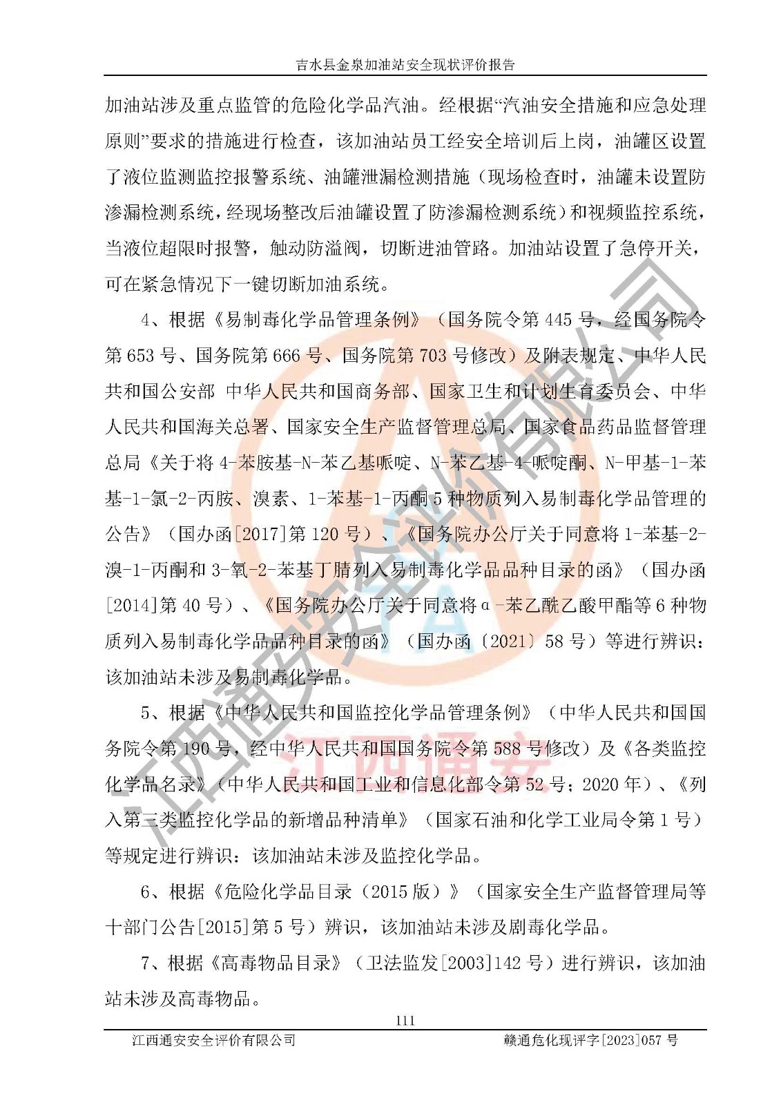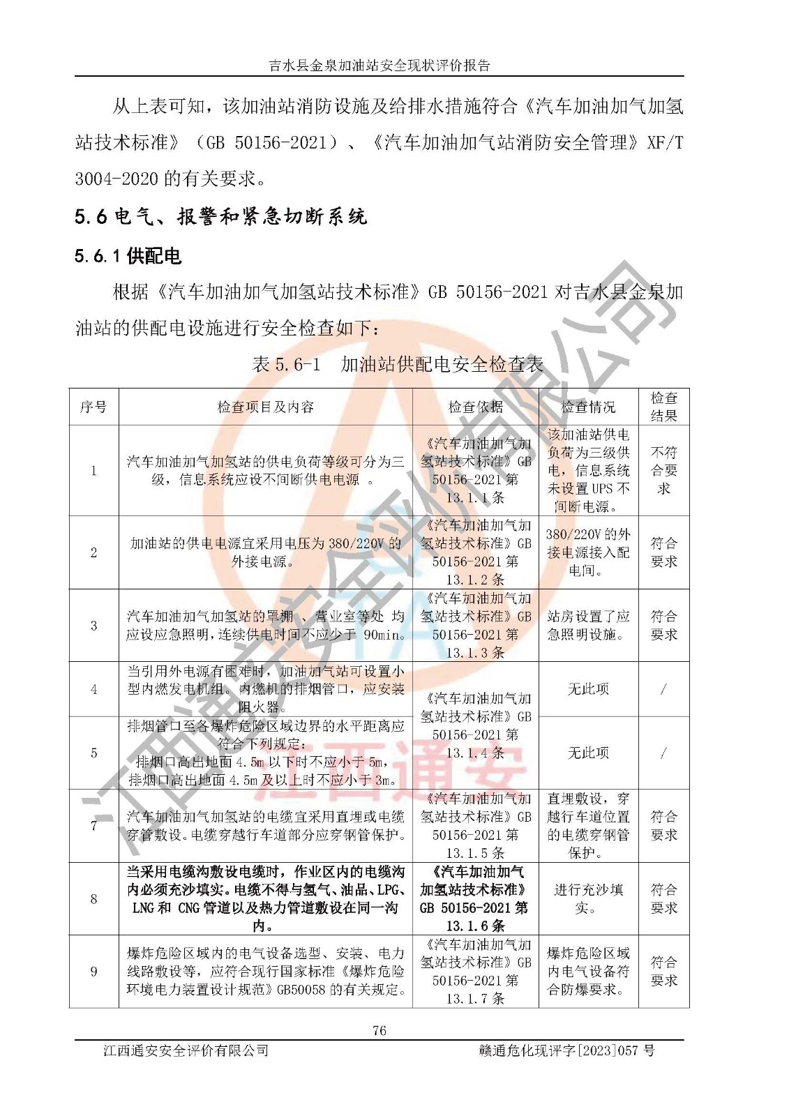 評(píng)價(jià)結(jié)論 | 吉水縣金泉加油站符合《汽車(chē)加油加氣加氫站技術(shù)標(biāo)準(zhǔn)》GB50156-2021等標(biāo)準(zhǔn)規(guī)范的要求,安全風(fēng)險(xiǎn)可控,滿足危險(xiǎn)化學(xué)品經(jīng)營(yíng)的安全條件。 | |||