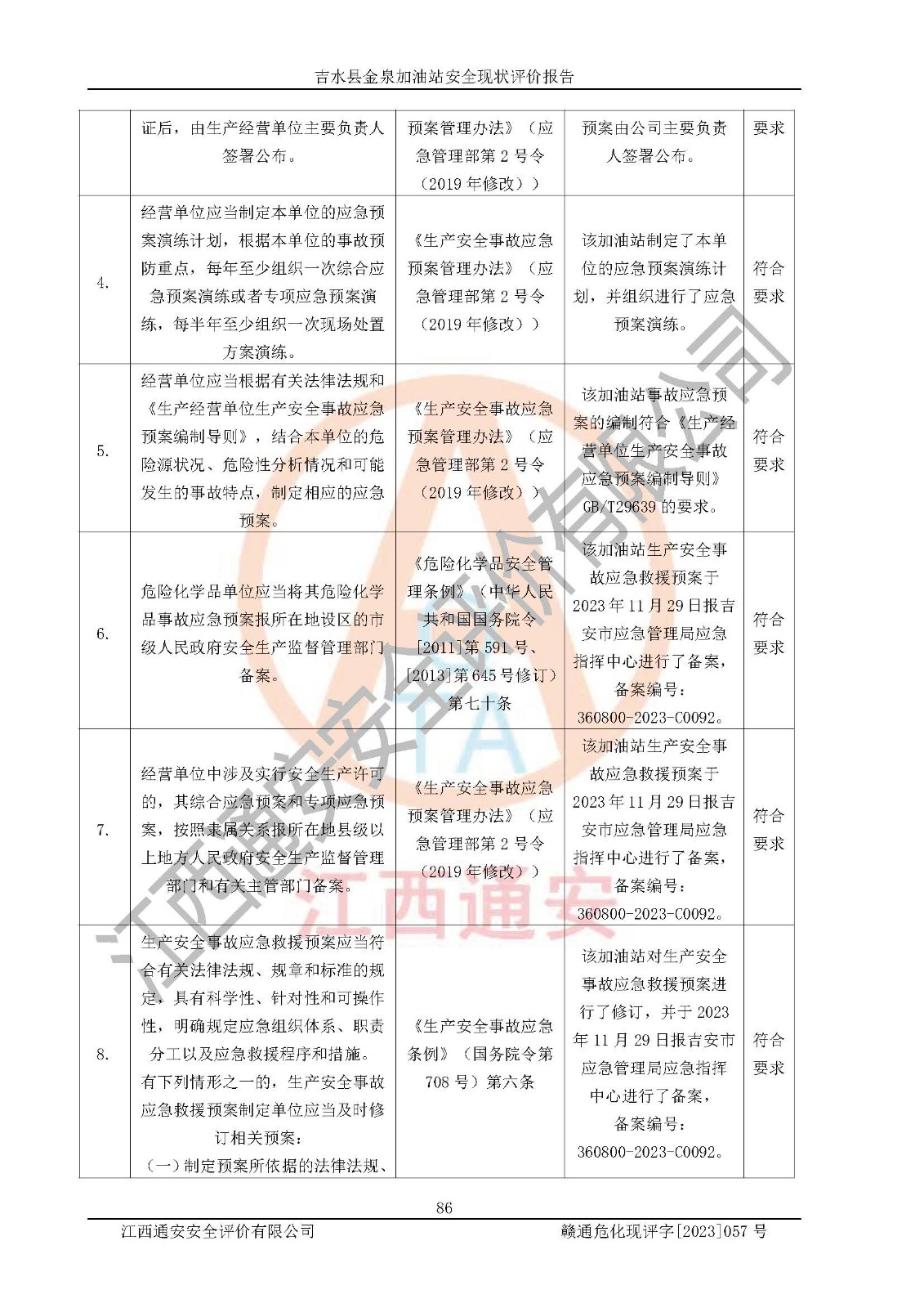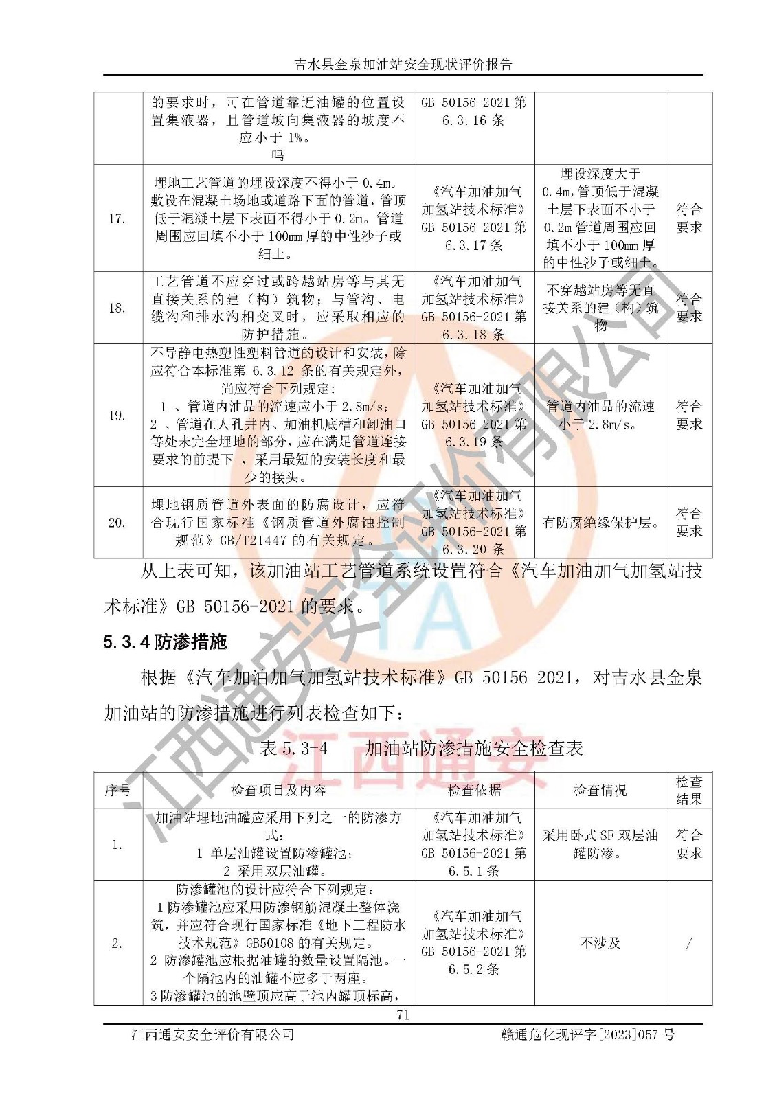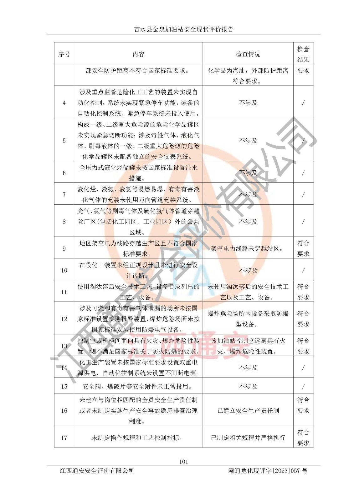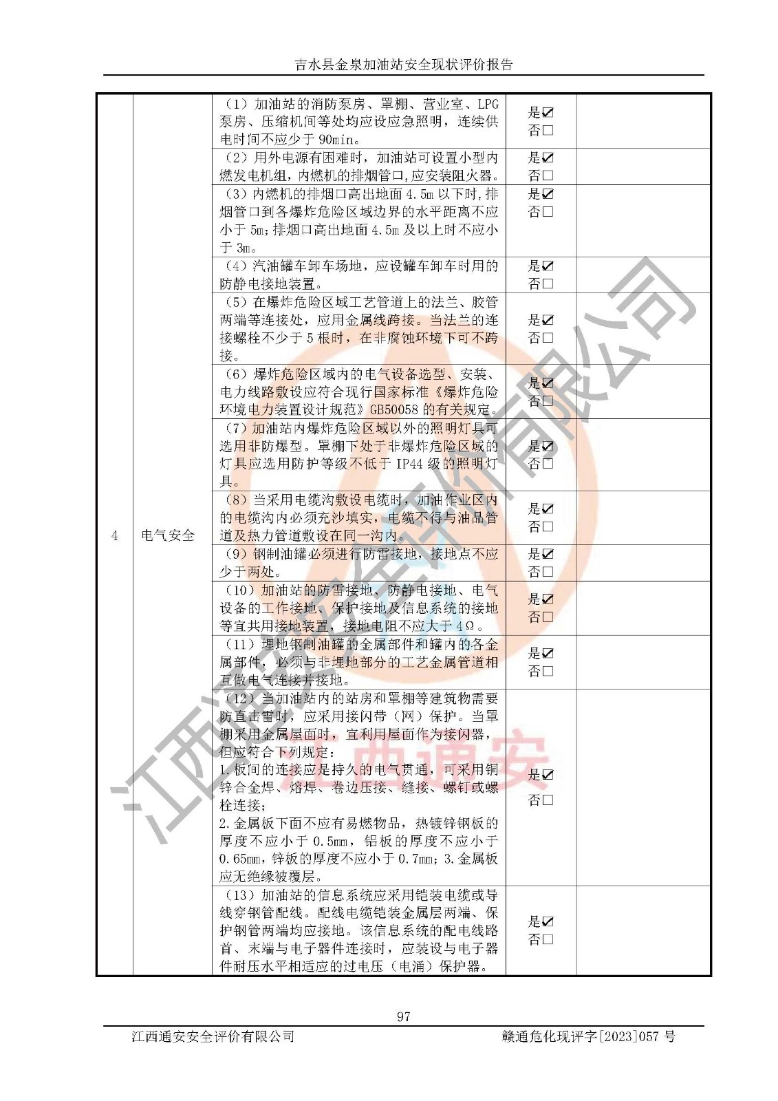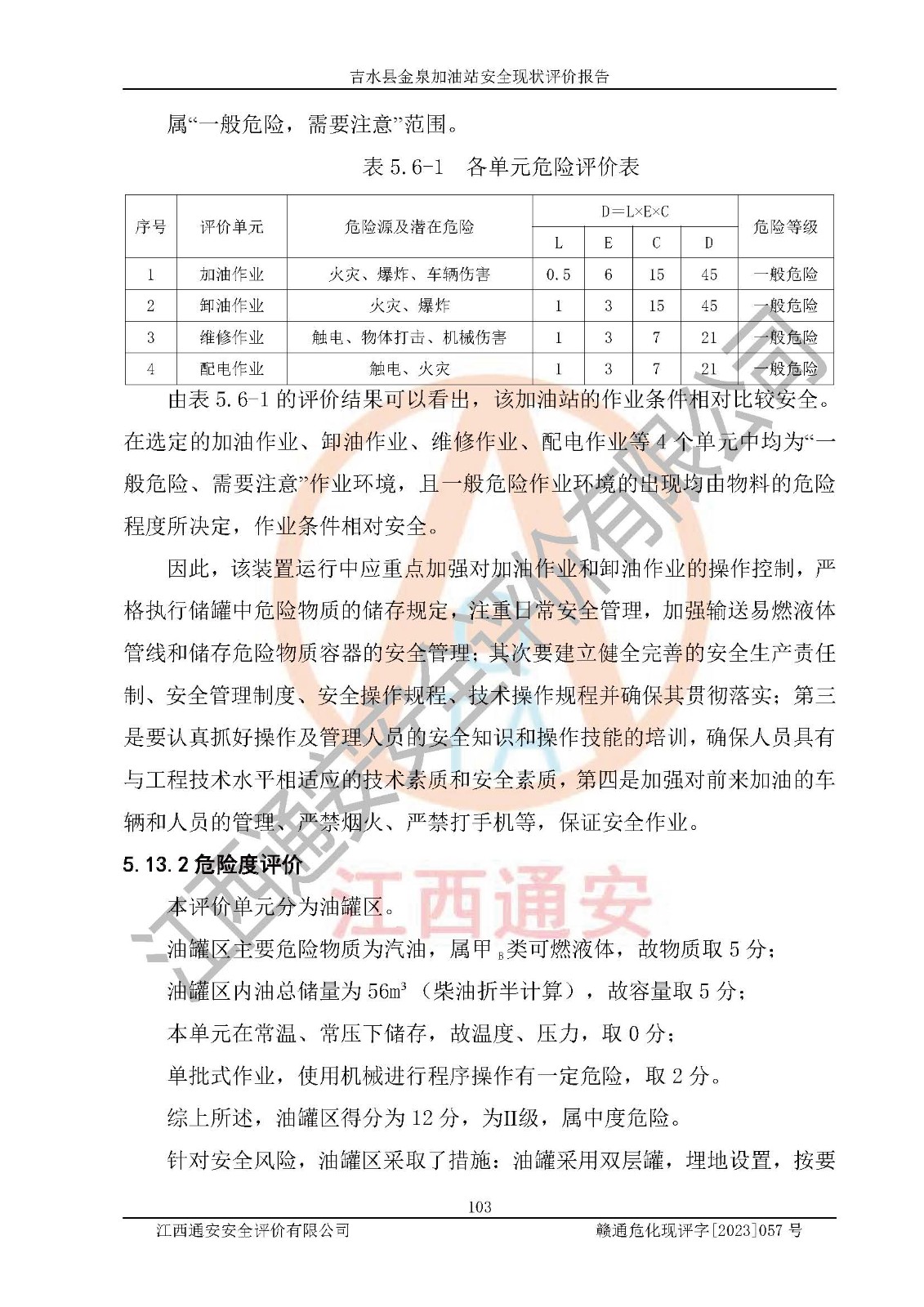 評(píng)價(jià)結(jié)論 | 吉水縣金泉加油站符合《汽車(chē)加油加氣加氫站技術(shù)標(biāo)準(zhǔn)》GB50156-2021等標(biāo)準(zhǔn)規(guī)范的要求,安全風(fēng)險(xiǎn)可控,滿足危險(xiǎn)化學(xué)品經(jīng)營(yíng)的安全條件。 | |||