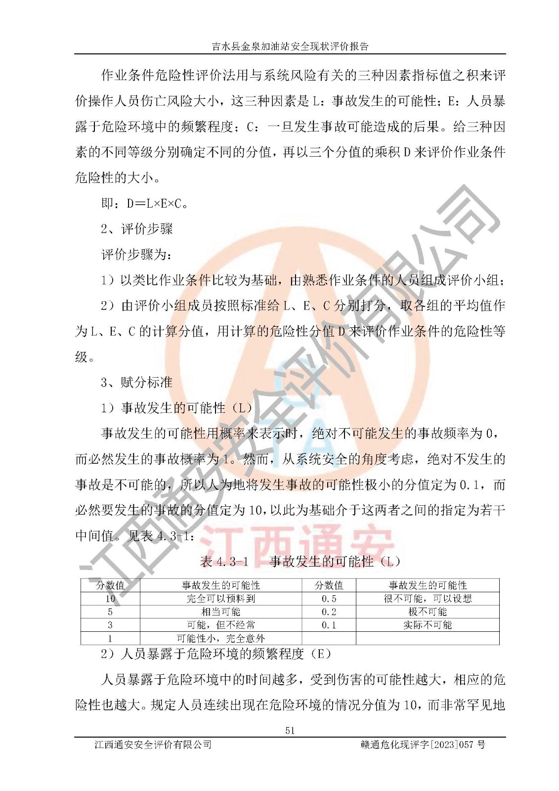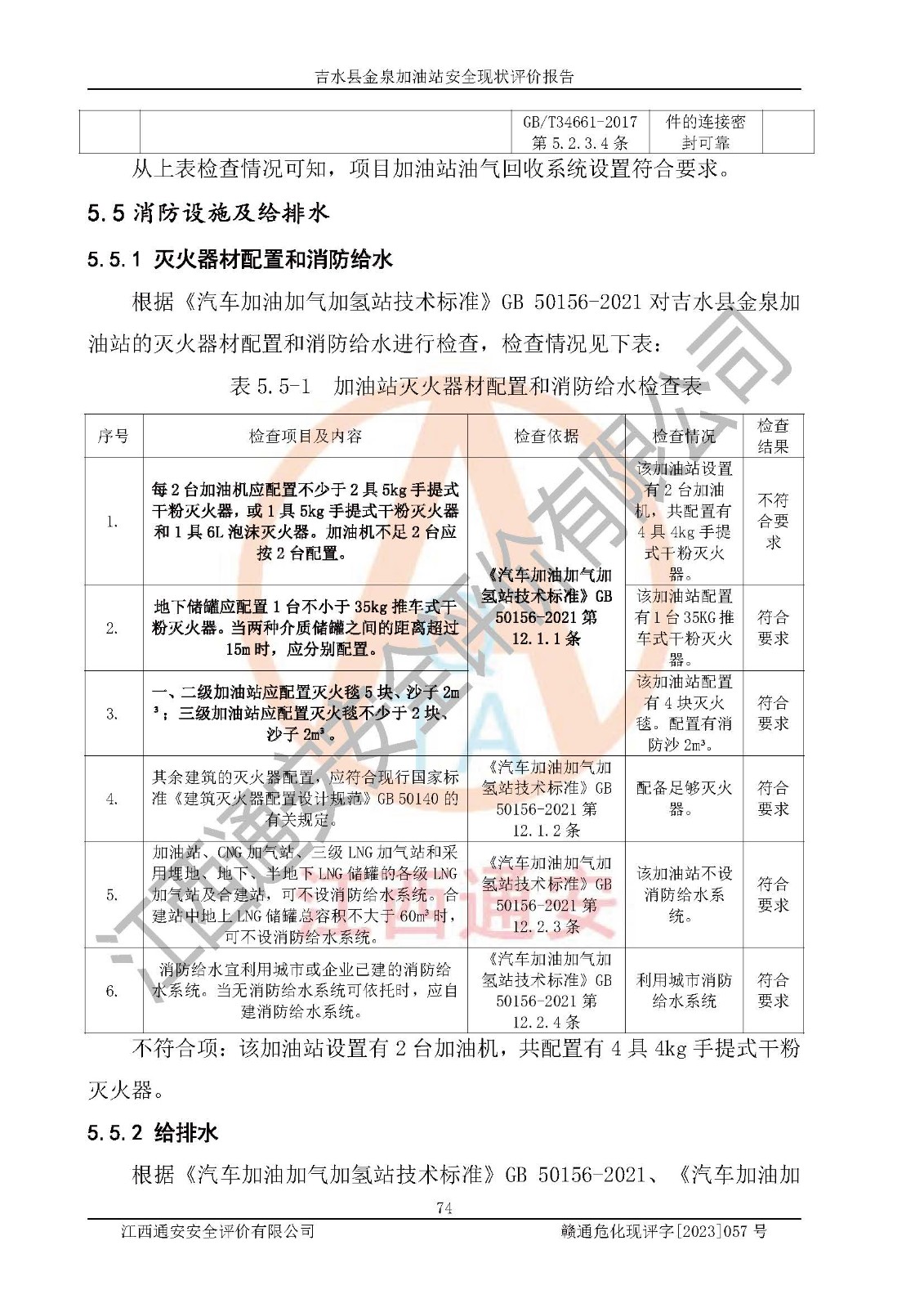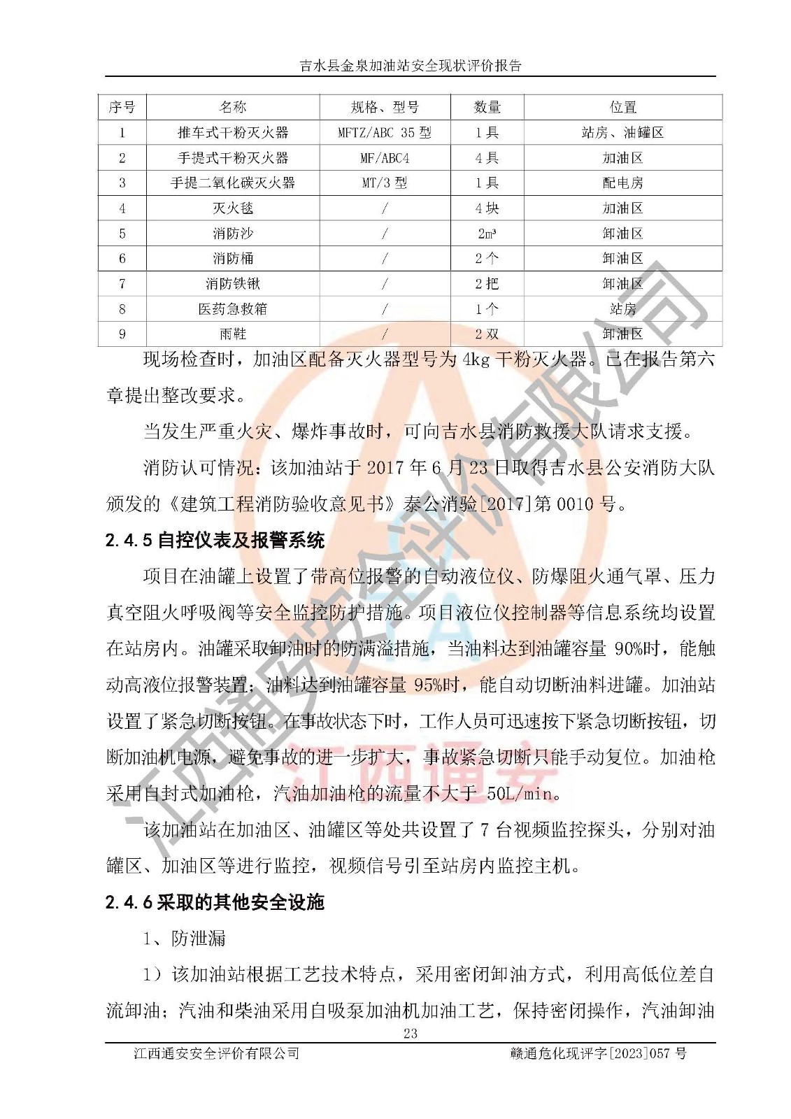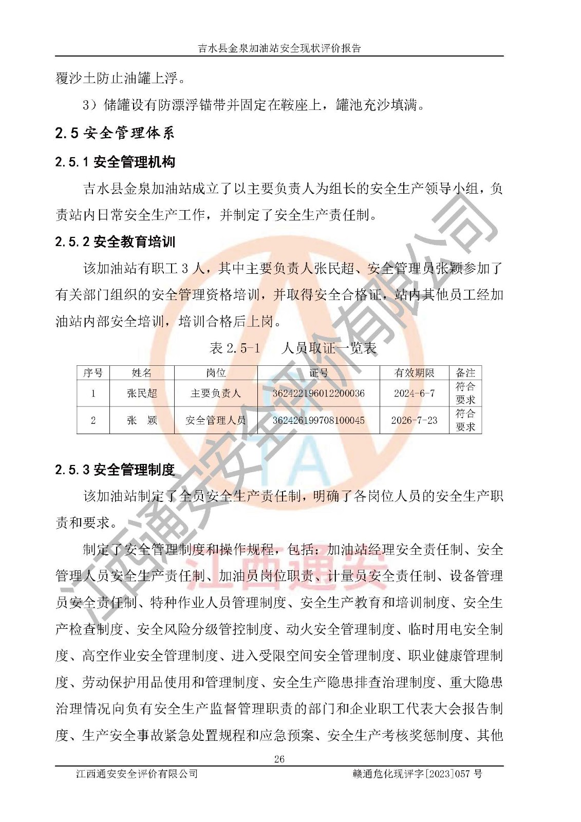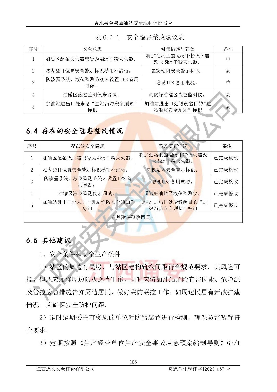 評(píng)價(jià)結(jié)論 | 吉水縣金泉加油站符合《汽車(chē)加油加氣加氫站技術(shù)標(biāo)準(zhǔn)》GB50156-2021等標(biāo)準(zhǔn)規(guī)范的要求,安全風(fēng)險(xiǎn)可控,滿足危險(xiǎn)化學(xué)品經(jīng)營(yíng)的安全條件。 | |||