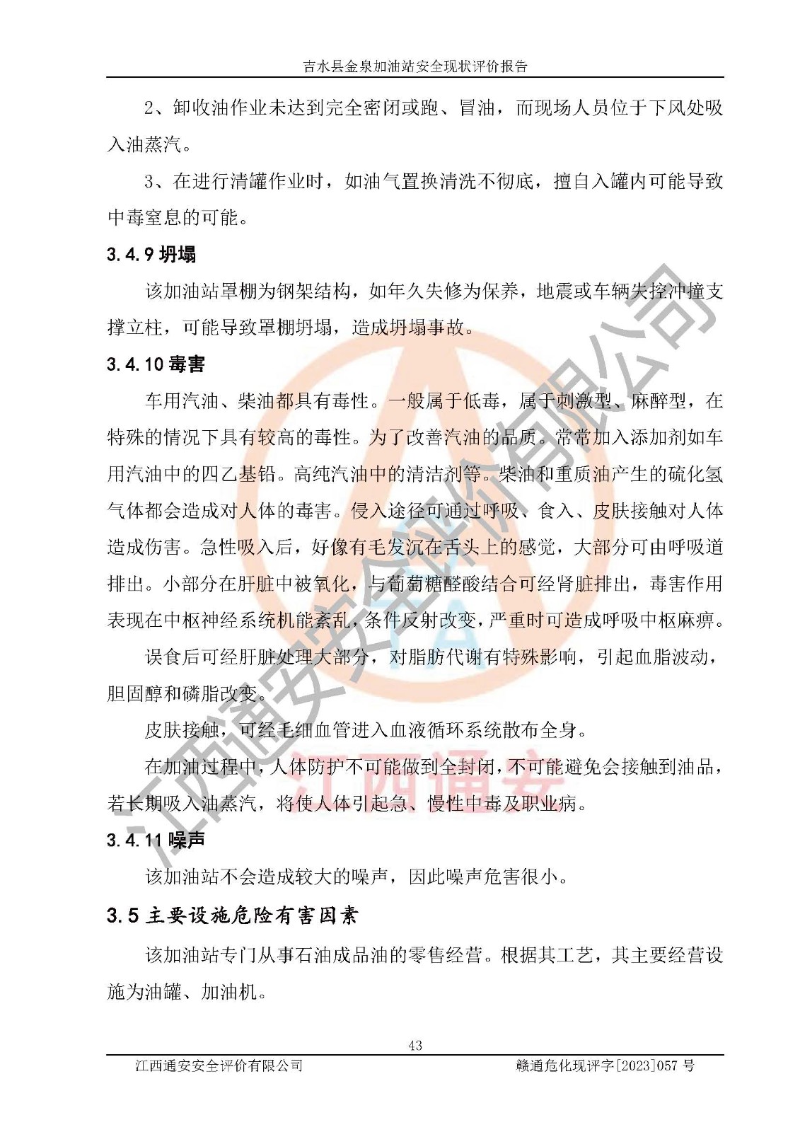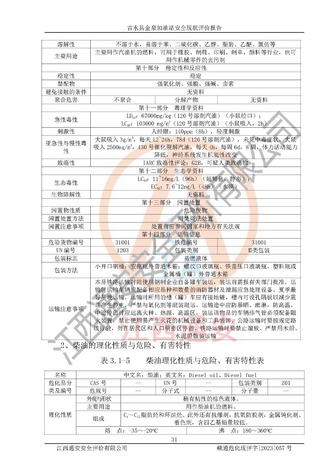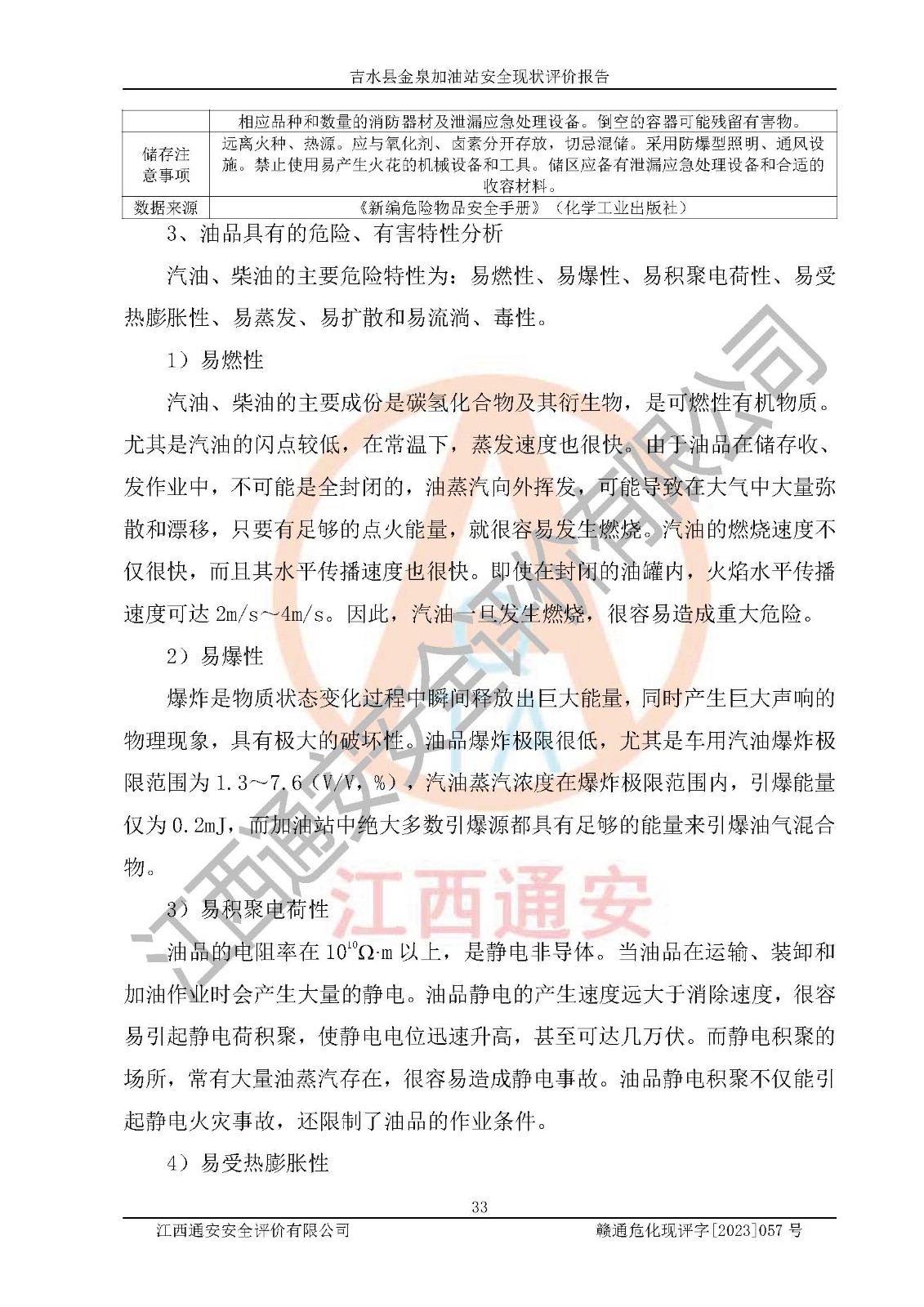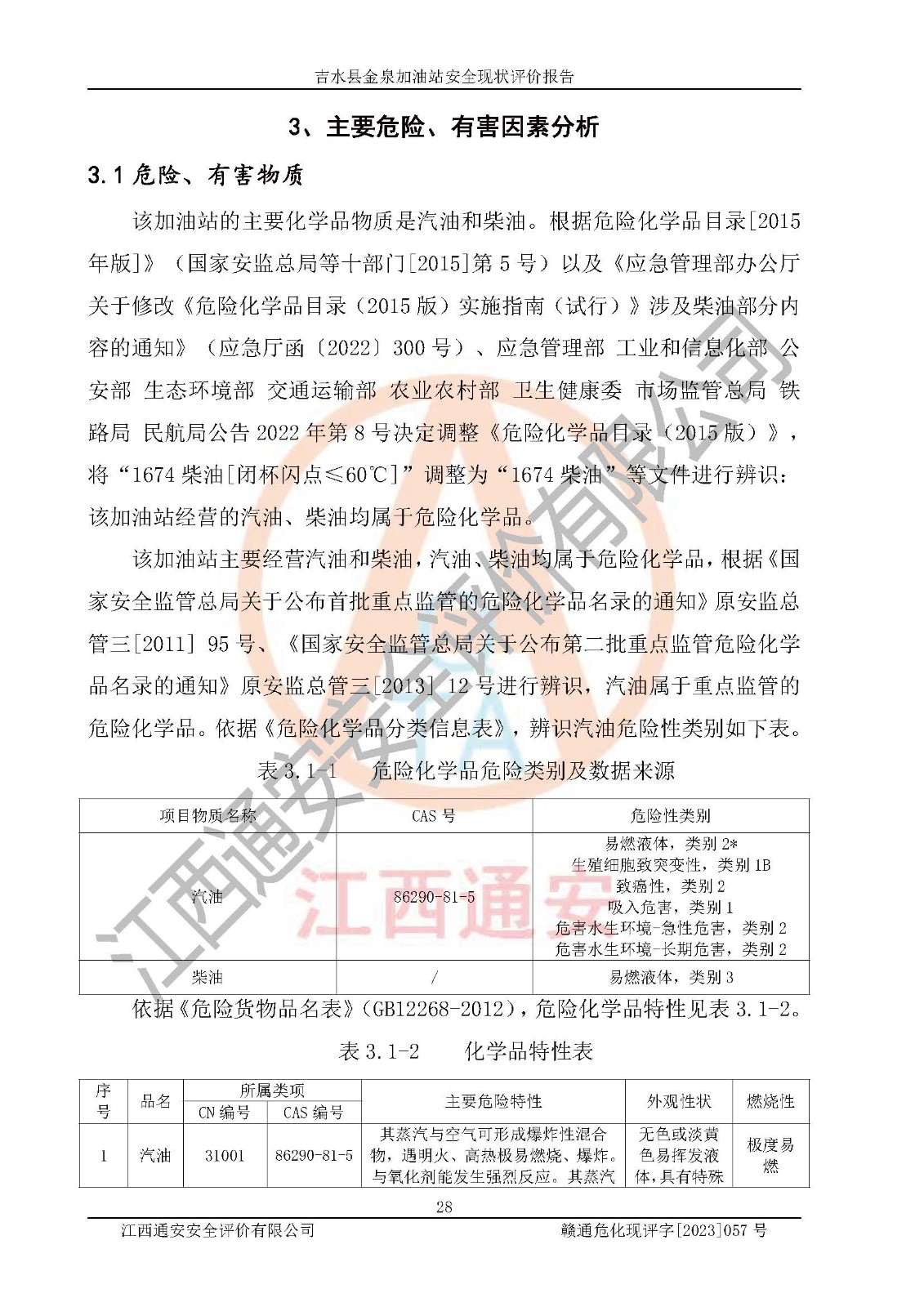 項(xiàng)目簡(jiǎn)介 | 吉水縣金泉加油站是一家從事成品油零售經(jīng)營(yíng)的企業(yè)。該加油站于2018年5月31日經(jīng)吉水縣市場(chǎng)監(jiān)督管理局核準(zhǔn)注冊(cè)成立,營(yíng)業(yè)場(chǎng)所位于江西省吉安市吉水縣白水鎮(zhèn)白水村。該加油站屬于個(gè)人獨(dú)資企業(yè),負(fù)責(zé)人為張民*,營(yíng)業(yè)執(zhí)照統(tǒng)一社會(huì)信用代碼為:91360822MA37XUAJX6。營(yíng)業(yè)執(zhí)照核準(zhǔn)經(jīng)營(yíng)范圍:成品油、潤(rùn)滑油、然油、農(nóng)機(jī)配件銷(xiāo)售(依法須經(jīng)批準(zhǔn)的項(xiàng)目,經(jīng)相關(guān)部門(mén)批準(zhǔn)后方可開(kāi)展經(jīng)營(yíng)活動(dòng))*。 吉水縣金泉加油站占地面積130㎡,加油站中設(shè)有1臺(tái)0#柴油雙槍加油機(jī)、1臺(tái)0#柴油/92#汽油兩槍加油機(jī),1臺(tái)SF雙層40m3埋地臥式0#柴油罐、1臺(tái)SF雙層30m3埋地臥式92#汽油儲(chǔ)罐、1臺(tái)SF雙層12m3埋地臥式0#柴油罐,油品*大儲(chǔ)存能力為56m3(柴油罐容積折半計(jì)入油罐總?cè)莘e),屬三級(jí)加油站,汽油卸油、加油設(shè)置了油氣回收系統(tǒng)。 吉水縣金泉加油站于2021年4月16日經(jīng)吉安市應(yīng)急管理局核準(zhǔn),換發(fā)了新的《危險(xiǎn)化學(xué)品經(jīng)營(yíng)許可證》,證書(shū)編號(hào):贛吉?;?jīng)字[2021]360800000048號(hào),許可經(jīng)營(yíng)范圍:成品油。**期2021年4月21日至2024年4月20日。 吉水縣金泉加油站2020年12月15日經(jīng)吉安市商務(wù)局核準(zhǔn),換取了新的《成品油零售經(jīng)營(yíng)批準(zhǔn)證書(shū)》,證書(shū)編號(hào):油零售證書(shū)第吉0067號(hào),批準(zhǔn)從事成品油(汽油、柴油)零售業(yè)務(wù)。證書(shū)**期2020年12月15日至2025年12月14日。 項(xiàng)目生產(chǎn)過(guò)程中涉及的危險(xiǎn)化學(xué)品有:汽油、柴油等。 項(xiàng)目各生產(chǎn)和儲(chǔ)存單元均未構(gòu)成危險(xiǎn)化學(xué)品重大危險(xiǎn)源。 | |||