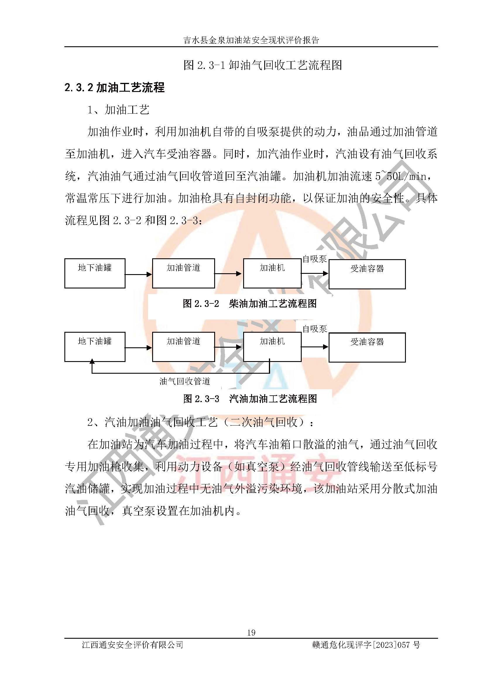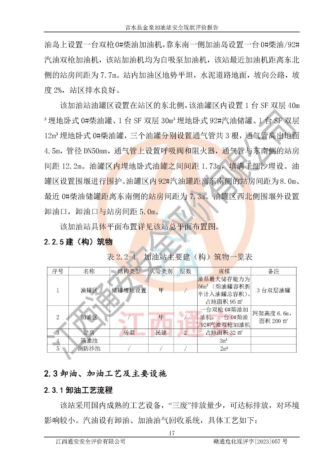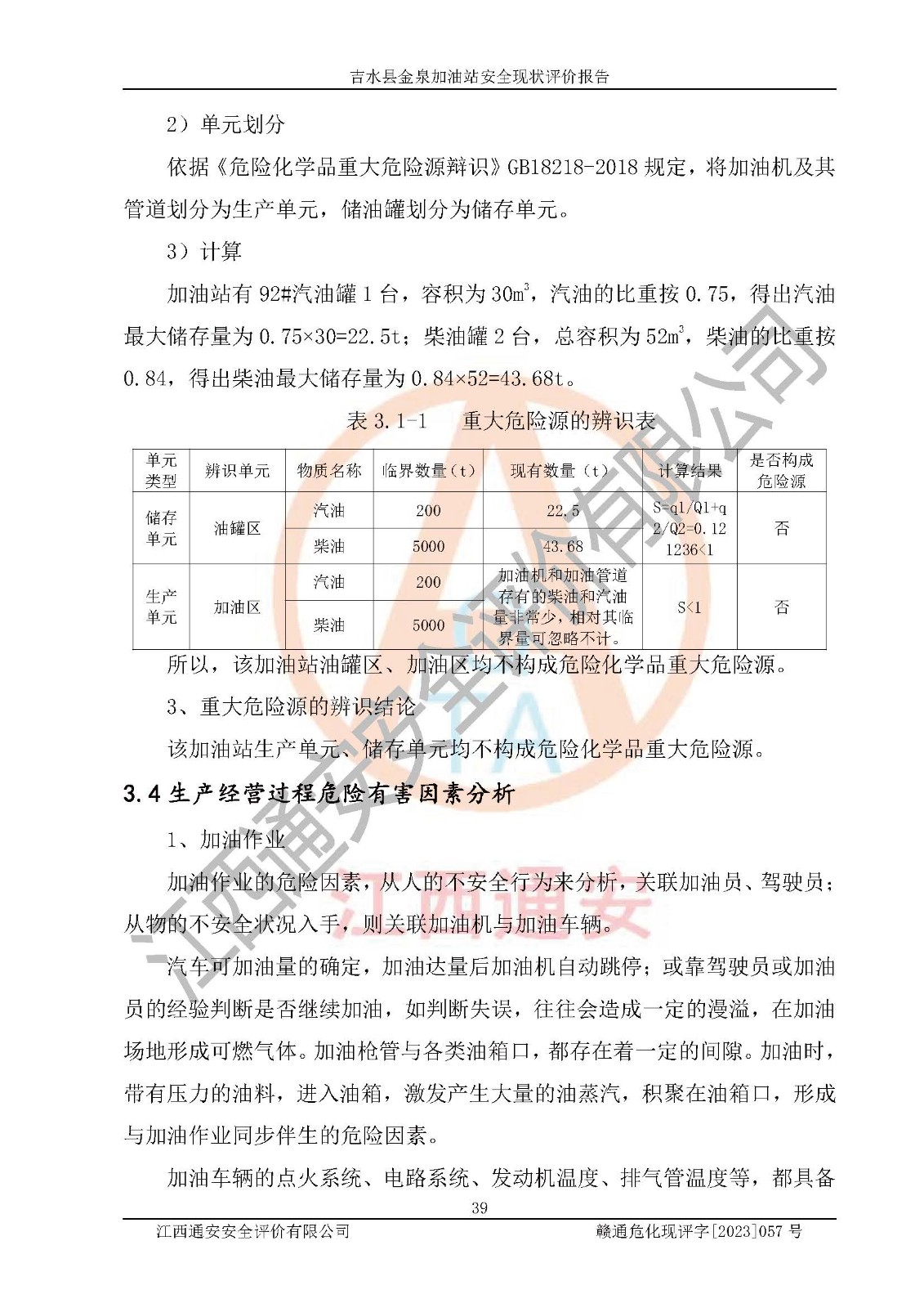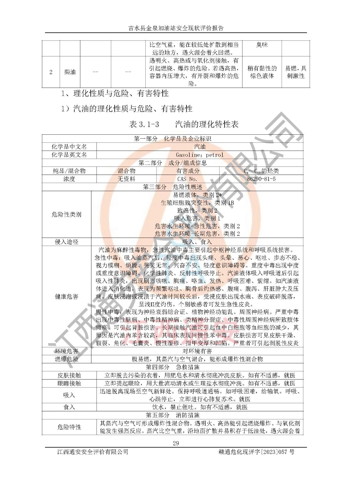 項(xiàng)目簡(jiǎn)介 | 吉水縣金泉加油站是一家從事成品油零售經(jīng)營(yíng)的企業(yè)。該加油站于2018年5月31日經(jīng)吉水縣市場(chǎng)監(jiān)督管理局核準(zhǔn)注冊(cè)成立,營(yíng)業(yè)場(chǎng)所位于江西省吉安市吉水縣白水鎮(zhèn)白水村。該加油站屬于個(gè)人獨(dú)資企業(yè),負(fù)責(zé)人為張民*,營(yíng)業(yè)執(zhí)照統(tǒng)一社會(huì)信用代碼為:91360822MA37XUAJX6。營(yíng)業(yè)執(zhí)照核準(zhǔn)經(jīng)營(yíng)范圍:成品油、潤(rùn)滑油、然油、農(nóng)機(jī)配件銷(xiāo)售(依法須經(jīng)批準(zhǔn)的項(xiàng)目,經(jīng)相關(guān)部門(mén)批準(zhǔn)后方可開(kāi)展經(jīng)營(yíng)活動(dòng))*。 吉水縣金泉加油站占地面積130㎡,加油站中設(shè)有1臺(tái)0#柴油雙槍加油機(jī)、1臺(tái)0#柴油/92#汽油兩槍加油機(jī),1臺(tái)SF雙層40m3埋地臥式0#柴油罐、1臺(tái)SF雙層30m3埋地臥式92#汽油儲(chǔ)罐、1臺(tái)SF雙層12m3埋地臥式0#柴油罐,油品*大儲(chǔ)存能力為56m3(柴油罐容積折半計(jì)入油罐總?cè)莘e),屬三級(jí)加油站,汽油卸油、加油設(shè)置了油氣回收系統(tǒng)。 吉水縣金泉加油站于2021年4月16日經(jīng)吉安市應(yīng)急管理局核準(zhǔn),換發(fā)了新的《危險(xiǎn)化學(xué)品經(jīng)營(yíng)許可證》,證書(shū)編號(hào):贛吉?;?jīng)字[2021]360800000048號(hào),許可經(jīng)營(yíng)范圍:成品油。**期2021年4月21日至2024年4月20日。 吉水縣金泉加油站2020年12月15日經(jīng)吉安市商務(wù)局核準(zhǔn),換取了新的《成品油零售經(jīng)營(yíng)批準(zhǔn)證書(shū)》,證書(shū)編號(hào):油零售證書(shū)第吉0067號(hào),批準(zhǔn)從事成品油(汽油、柴油)零售業(yè)務(wù)。證書(shū)**期2020年12月15日至2025年12月14日。 項(xiàng)目生產(chǎn)過(guò)程中涉及的危險(xiǎn)化學(xué)品有:汽油、柴油等。 項(xiàng)目各生產(chǎn)和儲(chǔ)存單元均未構(gòu)成危險(xiǎn)化學(xué)品重大危險(xiǎn)源。 | |||