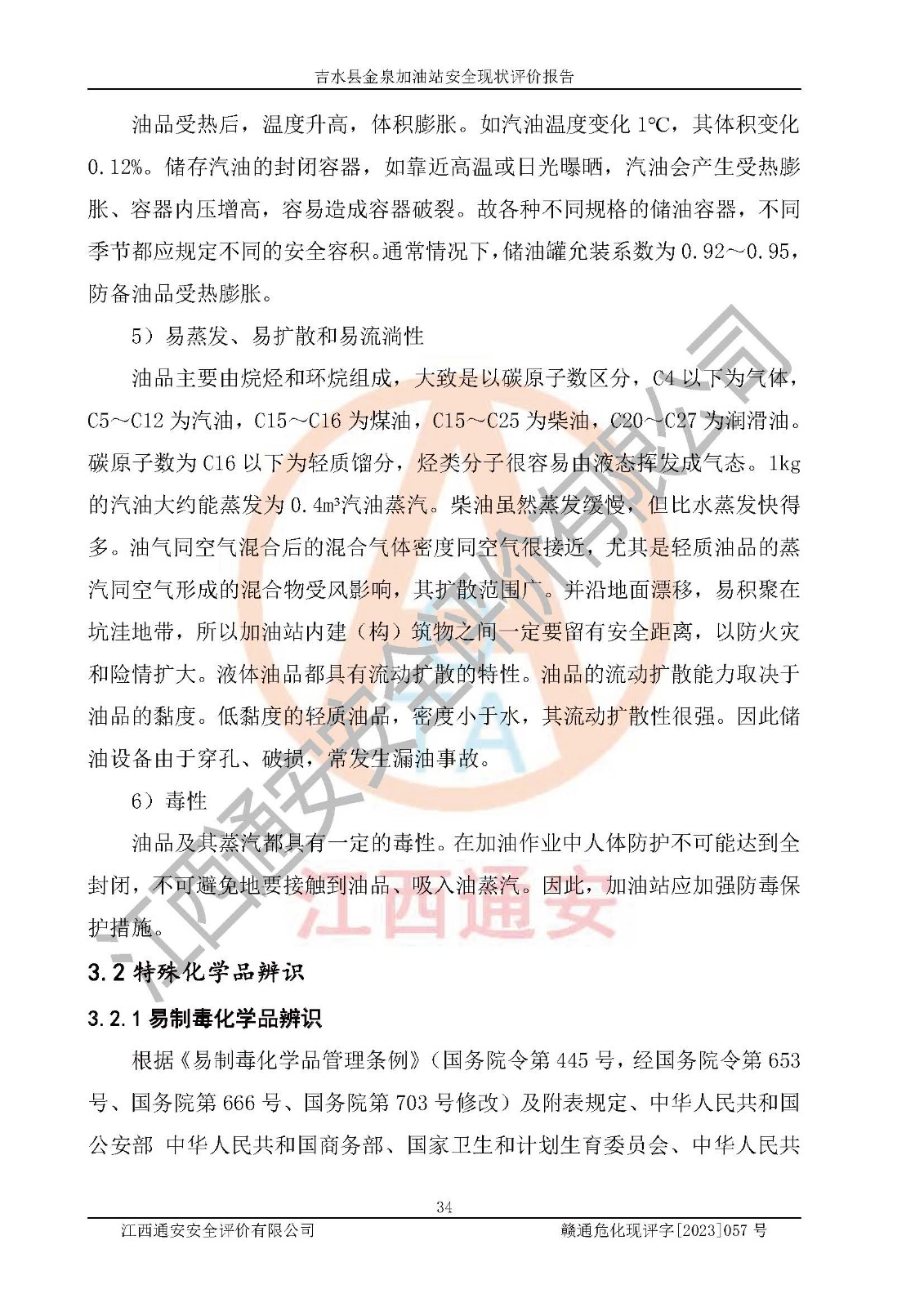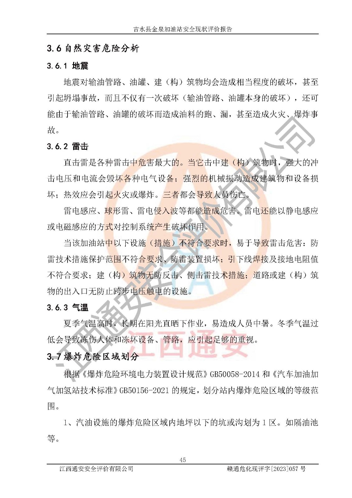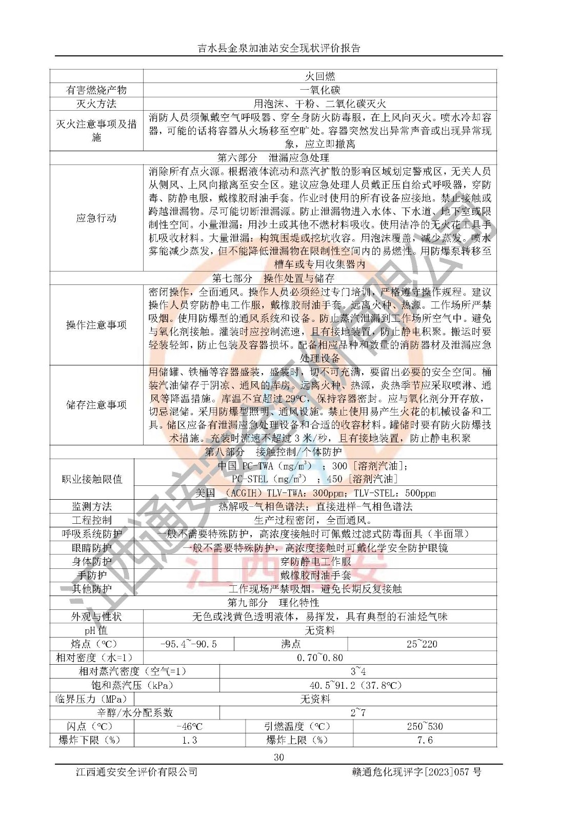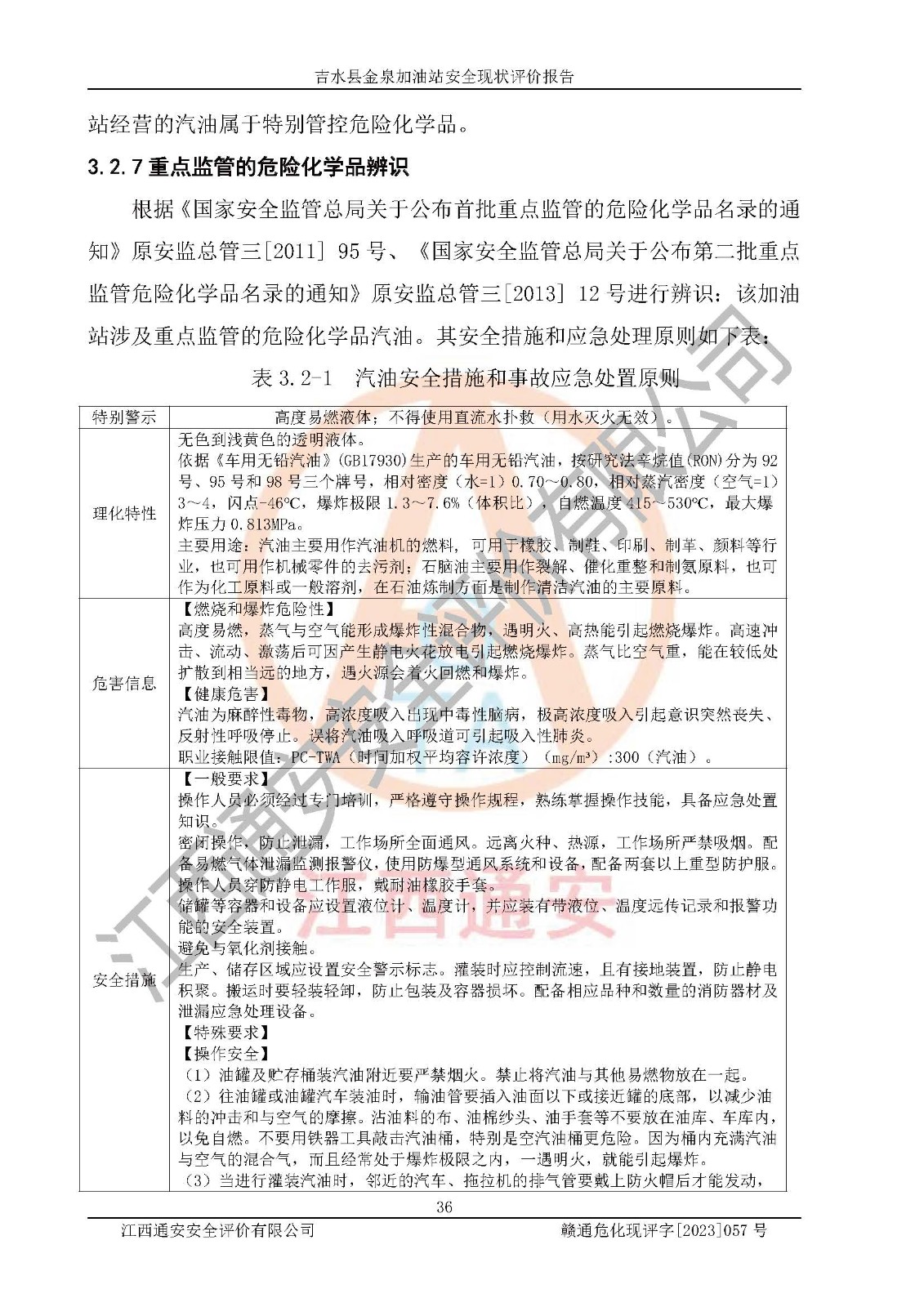 項(xiàng)目簡(jiǎn)介 | 吉水縣金泉加油站是一家從事成品油零售經(jīng)營(yíng)的企業(yè)。該加油站于2018年5月31日經(jīng)吉水縣市場(chǎng)監(jiān)督管理局核準(zhǔn)注冊(cè)成立,營(yíng)業(yè)場(chǎng)所位于江西省吉安市吉水縣白水鎮(zhèn)白水村。該加油站屬于個(gè)人獨(dú)資企業(yè),負(fù)責(zé)人為張民*,營(yíng)業(yè)執(zhí)照統(tǒng)一社會(huì)信用代碼為:91360822MA37XUAJX6。營(yíng)業(yè)執(zhí)照核準(zhǔn)經(jīng)營(yíng)范圍:成品油、潤(rùn)滑油、然油、農(nóng)機(jī)配件銷(xiāo)售(依法須經(jīng)批準(zhǔn)的項(xiàng)目,經(jīng)相關(guān)部門(mén)批準(zhǔn)后方可開(kāi)展經(jīng)營(yíng)活動(dòng))*。 吉水縣金泉加油站占地面積130㎡,加油站中設(shè)有1臺(tái)0#柴油雙槍加油機(jī)、1臺(tái)0#柴油/92#汽油兩槍加油機(jī),1臺(tái)SF雙層40m3埋地臥式0#柴油罐、1臺(tái)SF雙層30m3埋地臥式92#汽油儲(chǔ)罐、1臺(tái)SF雙層12m3埋地臥式0#柴油罐,油品*大儲(chǔ)存能力為56m3(柴油罐容積折半計(jì)入油罐總?cè)莘e),屬三級(jí)加油站,汽油卸油、加油設(shè)置了油氣回收系統(tǒng)。 吉水縣金泉加油站于2021年4月16日經(jīng)吉安市應(yīng)急管理局核準(zhǔn),換發(fā)了新的《危險(xiǎn)化學(xué)品經(jīng)營(yíng)許可證》,證書(shū)編號(hào):贛吉?;?jīng)字[2021]360800000048號(hào),許可經(jīng)營(yíng)范圍:成品油。**期2021年4月21日至2024年4月20日。 吉水縣金泉加油站2020年12月15日經(jīng)吉安市商務(wù)局核準(zhǔn),換取了新的《成品油零售經(jīng)營(yíng)批準(zhǔn)證書(shū)》,證書(shū)編號(hào):油零售證書(shū)第吉0067號(hào),批準(zhǔn)從事成品油(汽油、柴油)零售業(yè)務(wù)。證書(shū)**期2020年12月15日至2025年12月14日。 項(xiàng)目生產(chǎn)過(guò)程中涉及的危險(xiǎn)化學(xué)品有:汽油、柴油等。 項(xiàng)目各生產(chǎn)和儲(chǔ)存單元均未構(gòu)成危險(xiǎn)化學(xué)品重大危險(xiǎn)源。 | |||