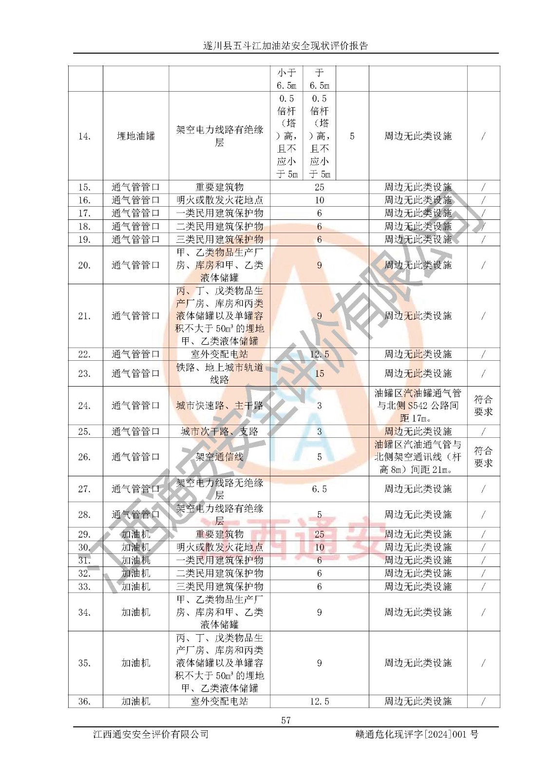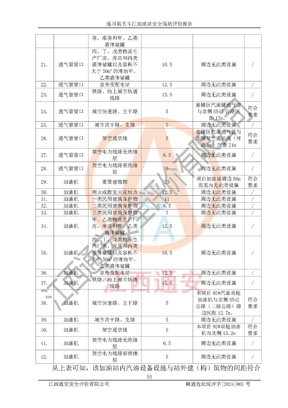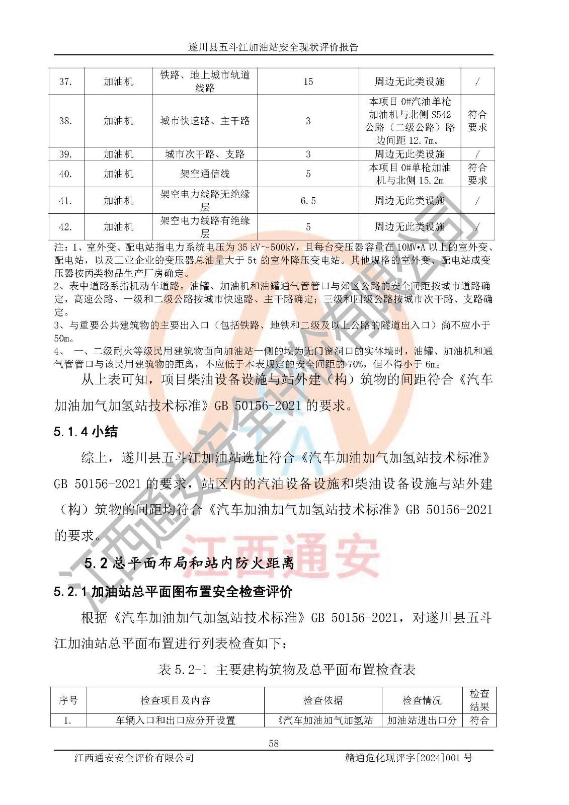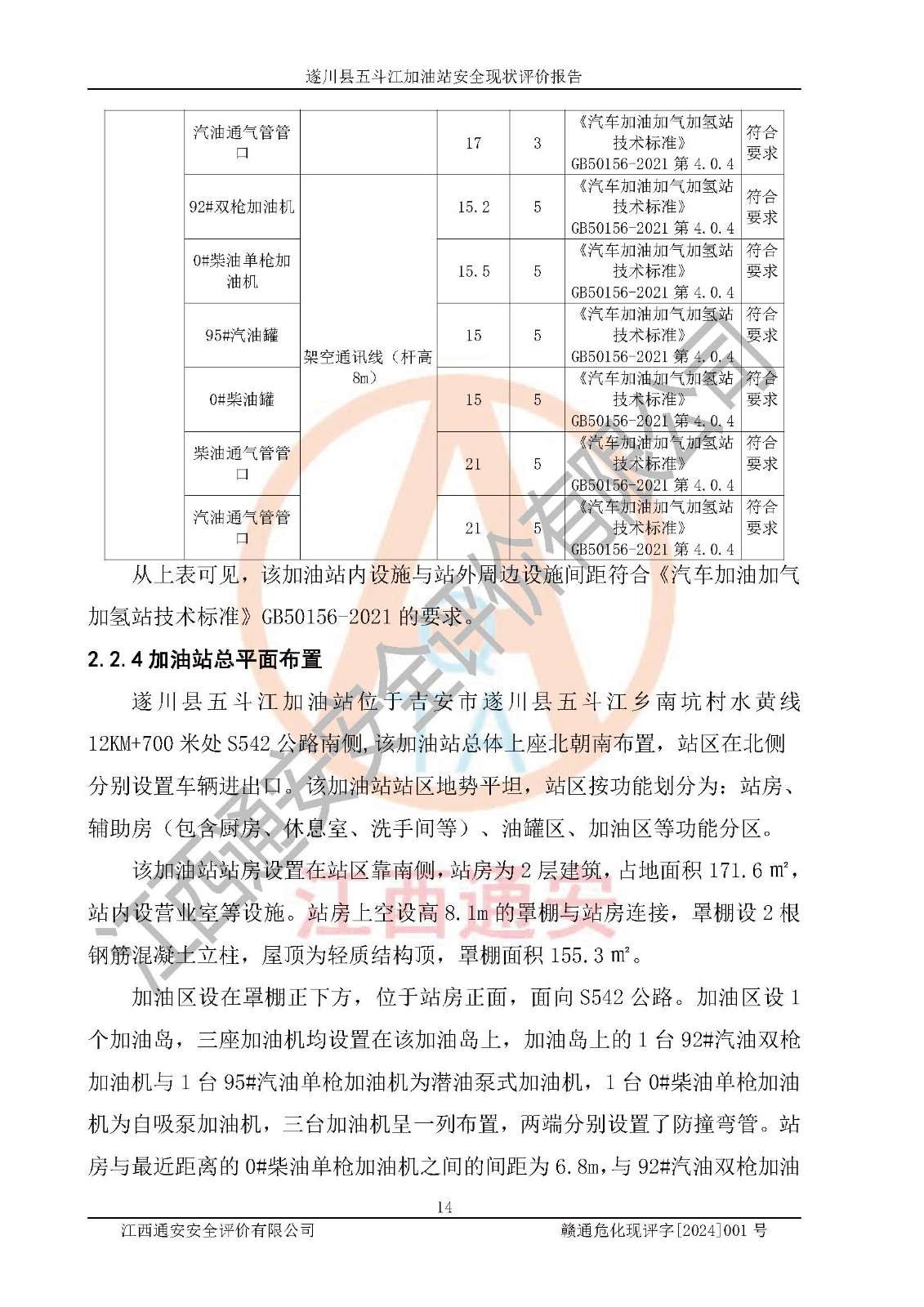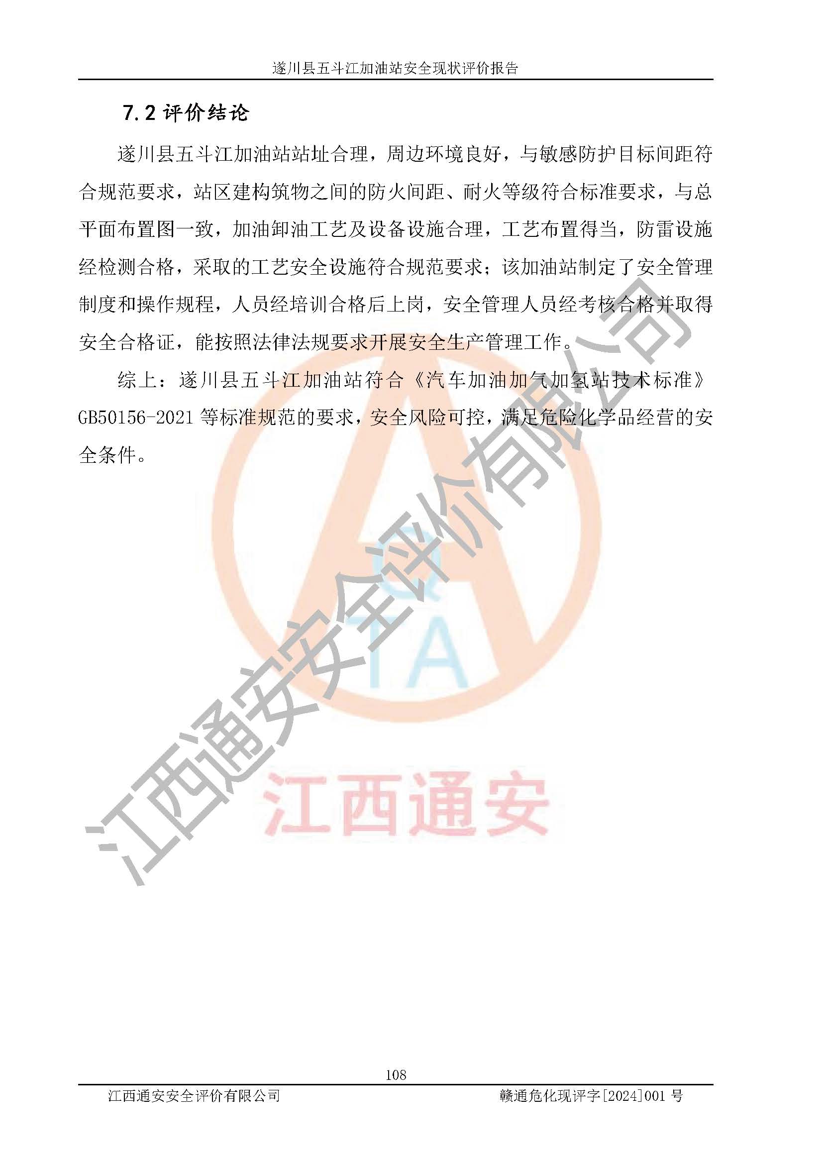 評價結論 | 遂川縣五斗江加油站站址合理,周邊環(huán)境良好,與敏感防護目標間距符合規(guī)范要求,站區(qū)建構筑物之間的防火間距、耐火等級符合標準要求,與總平面布置圖一致,加油卸油工藝及設備設施合理,工藝布置得當,防雷設施經(jīng)檢測合格,采取的工藝安全設施符合規(guī)范要求;該加油站制定了安全管理制度和操作規(guī)程,人員經(jīng)培訓合格后上崗,安全管理人員經(jīng)考核合格并取得安全合格證,能按照法律法規(guī)要求開展安全生產(chǎn)管理工作。 綜上:遂川縣五斗江加油站符合《汽車加油加氣加氫站技術標準》GB50156-2021等標準規(guī)范的要求,安全風險可控,滿足危險化學品經(jīng)營的安全條件。 | |||
