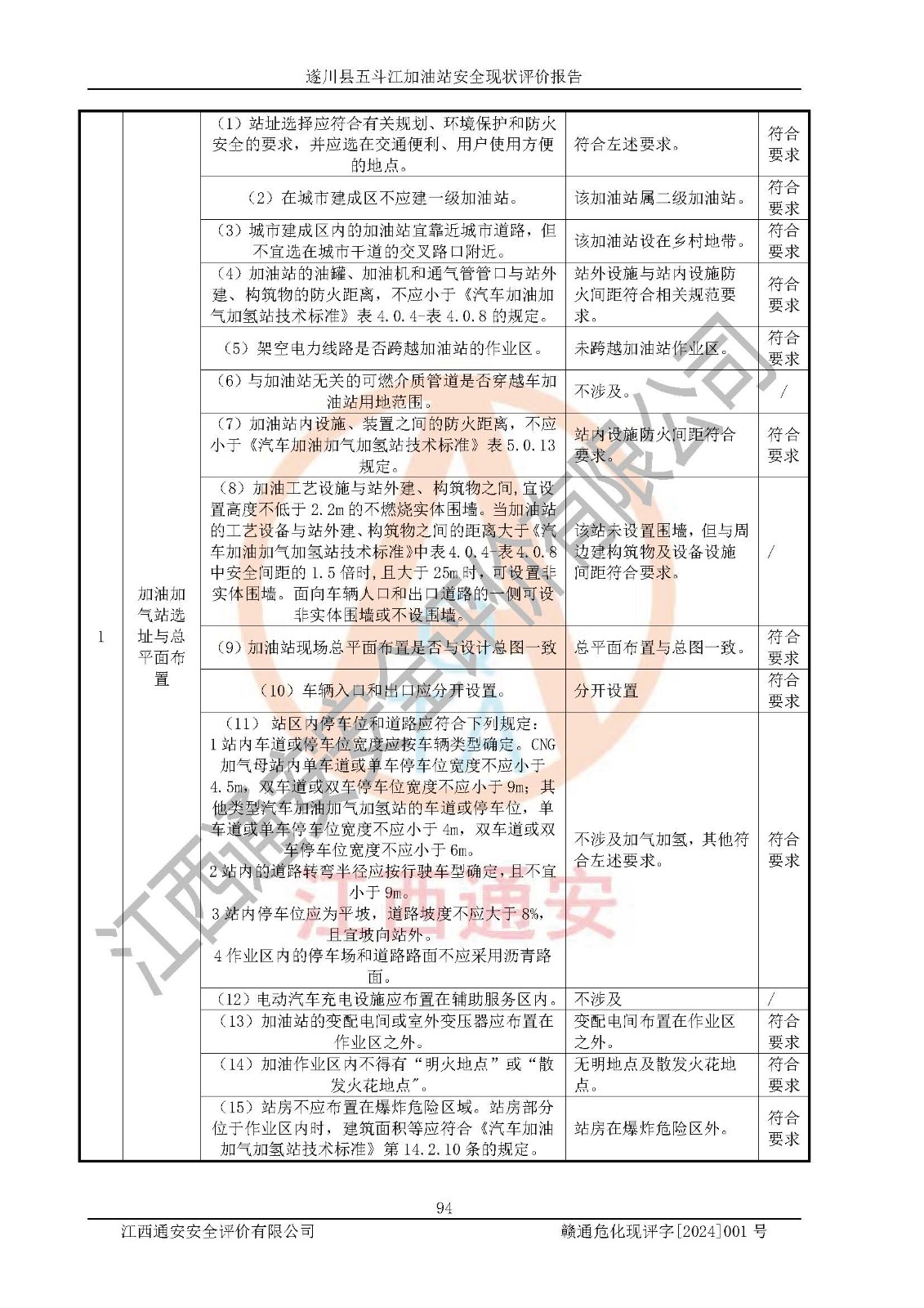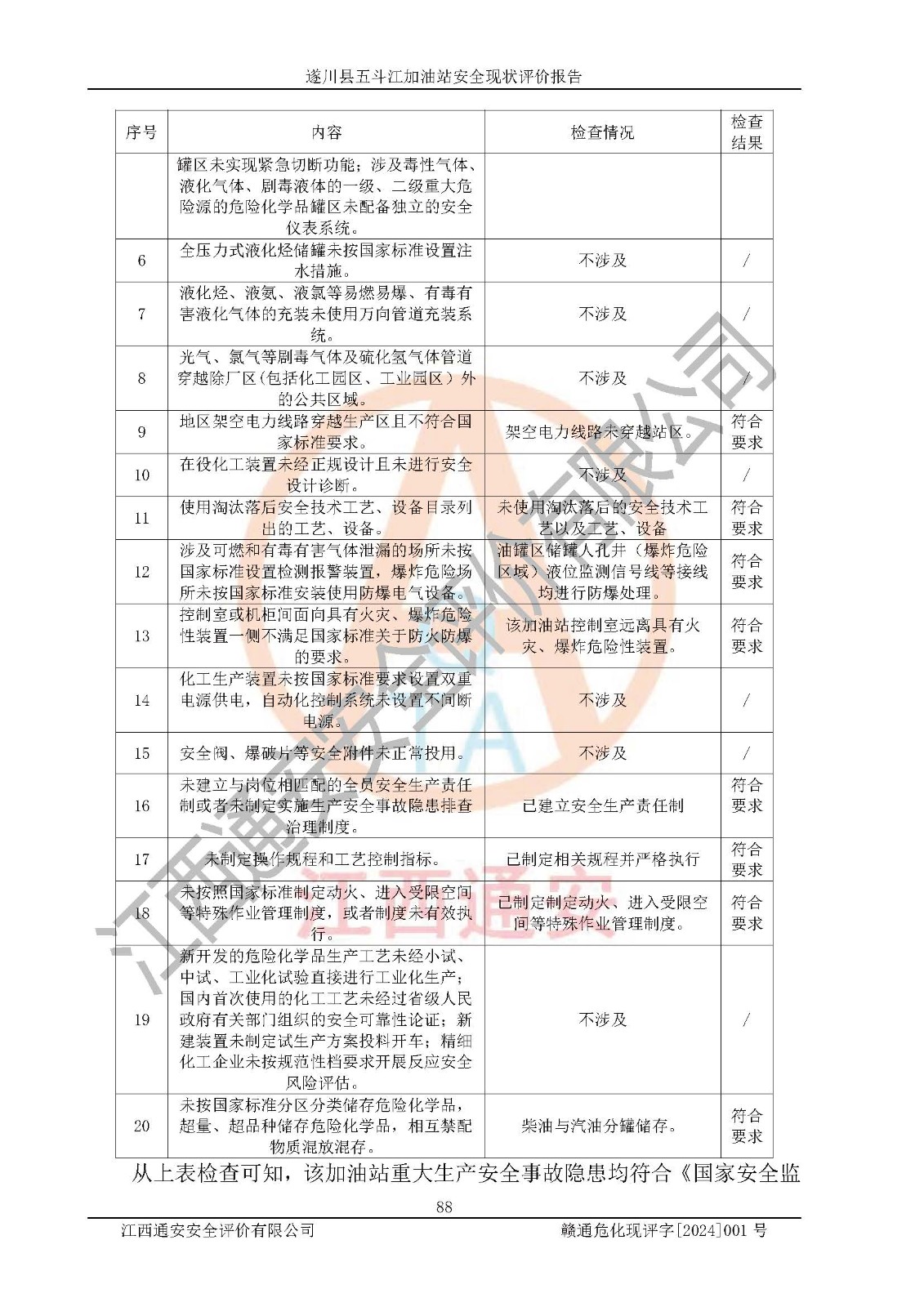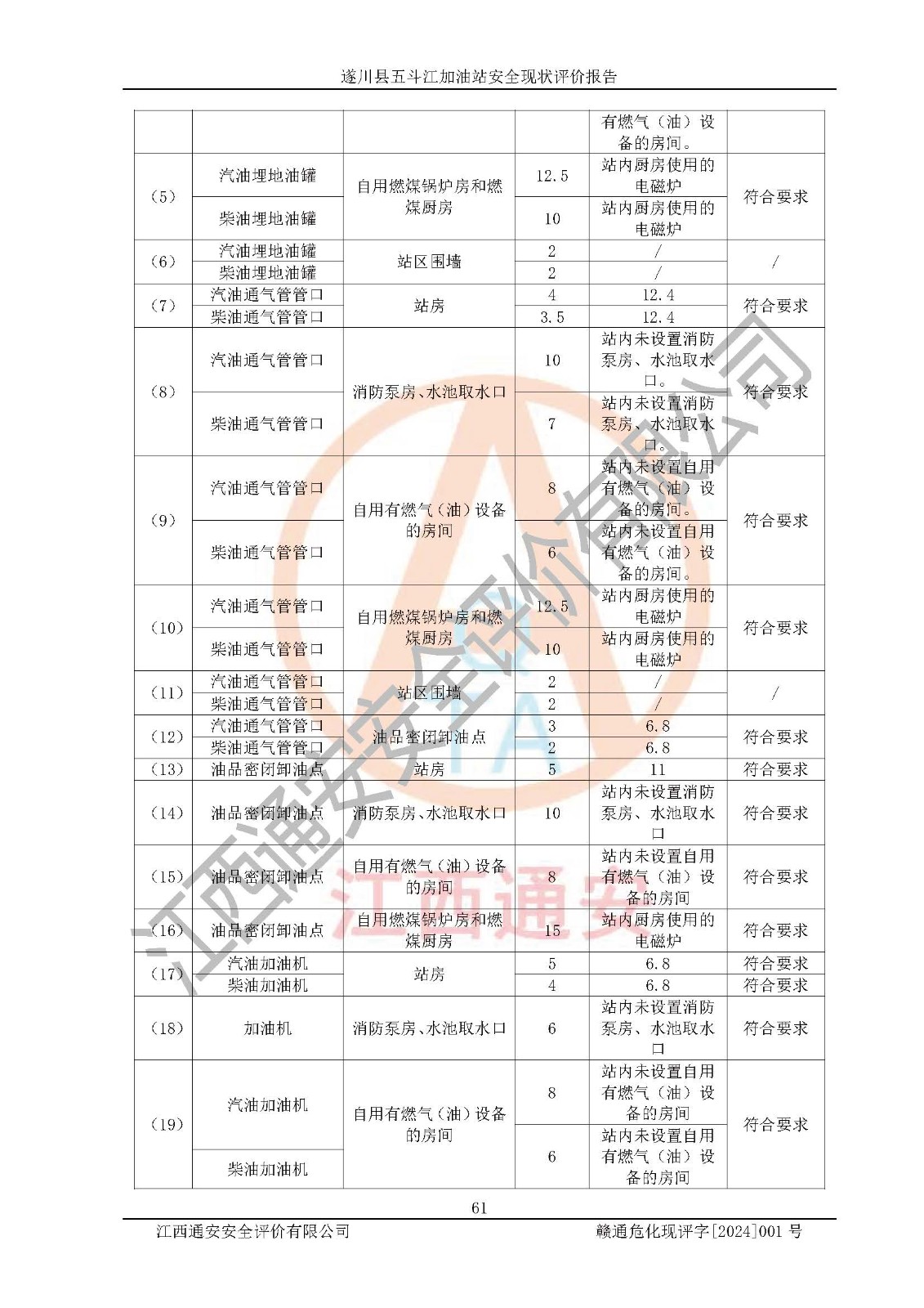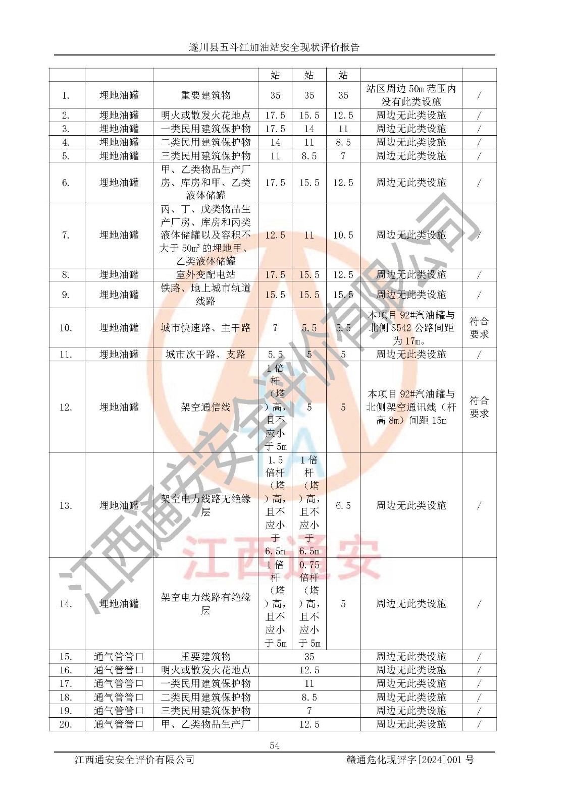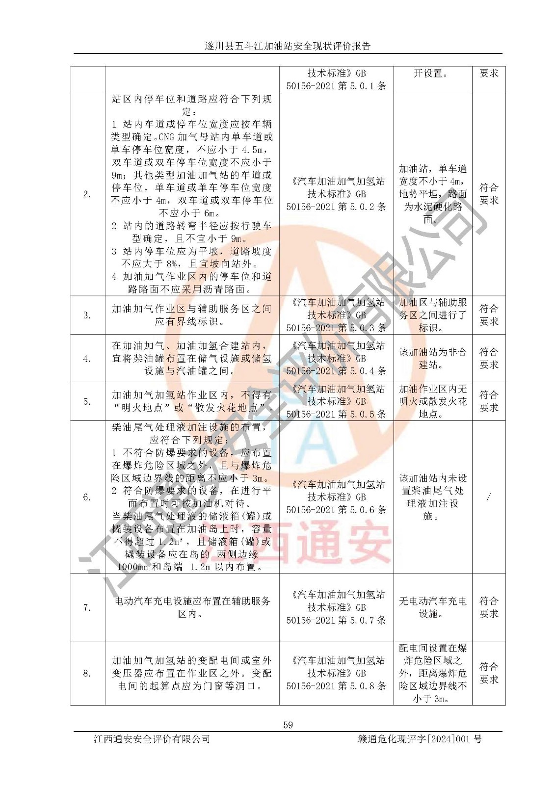 評價結論 | 遂川縣五斗江加油站站址合理,周邊環(huán)境良好,與敏感防護目標間距符合規(guī)范要求,站區(qū)建構筑物之間的防火間距、耐火等級符合標準要求,與總平面布置圖一致,加油卸油工藝及設備設施合理,工藝布置得當,防雷設施經(jīng)檢測合格,采取的工藝安全設施符合規(guī)范要求;該加油站制定了安全管理制度和操作規(guī)程,人員經(jīng)培訓合格后上崗,安全管理人員經(jīng)考核合格并取得安全合格證,能按照法律法規(guī)要求開展安全生產(chǎn)管理工作。 綜上:遂川縣五斗江加油站符合《汽車加油加氣加氫站技術標準》GB50156-2021等標準規(guī)范的要求,安全風險可控,滿足危險化學品經(jīng)營的安全條件。 | |||