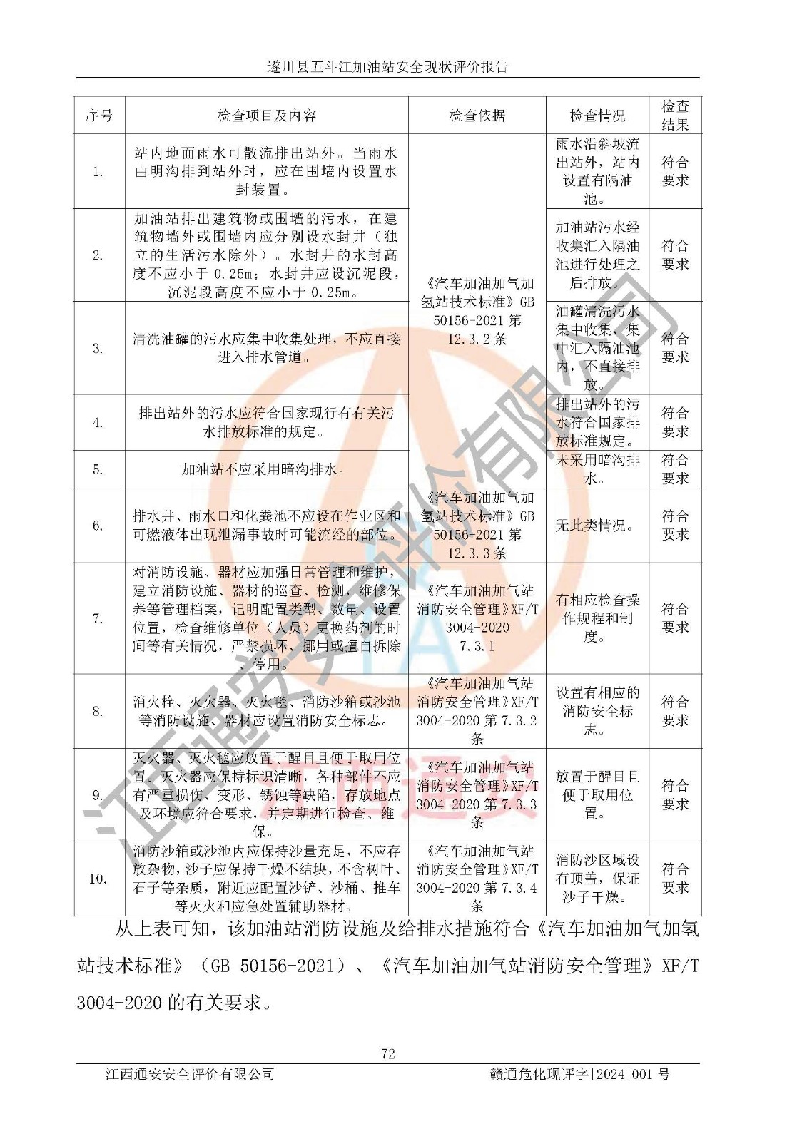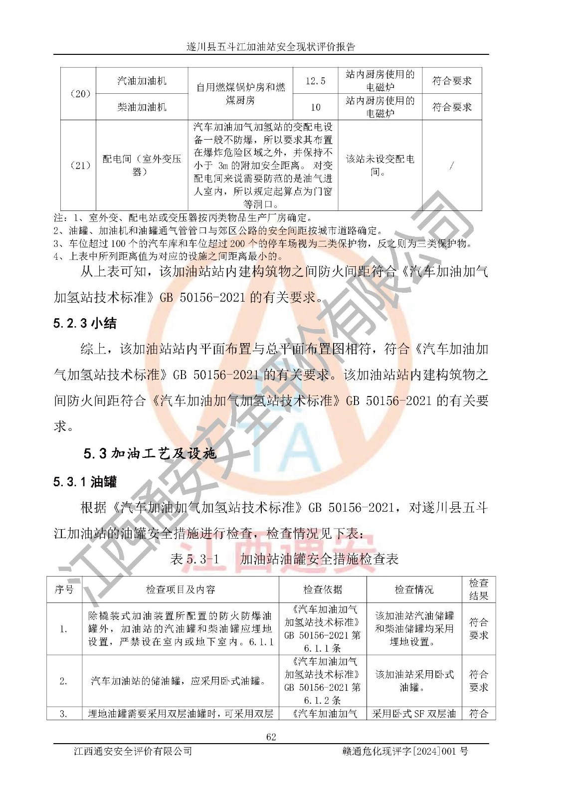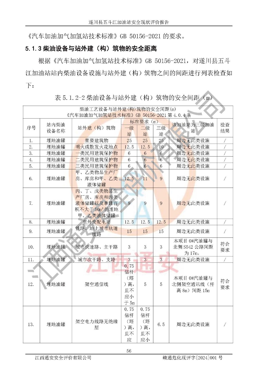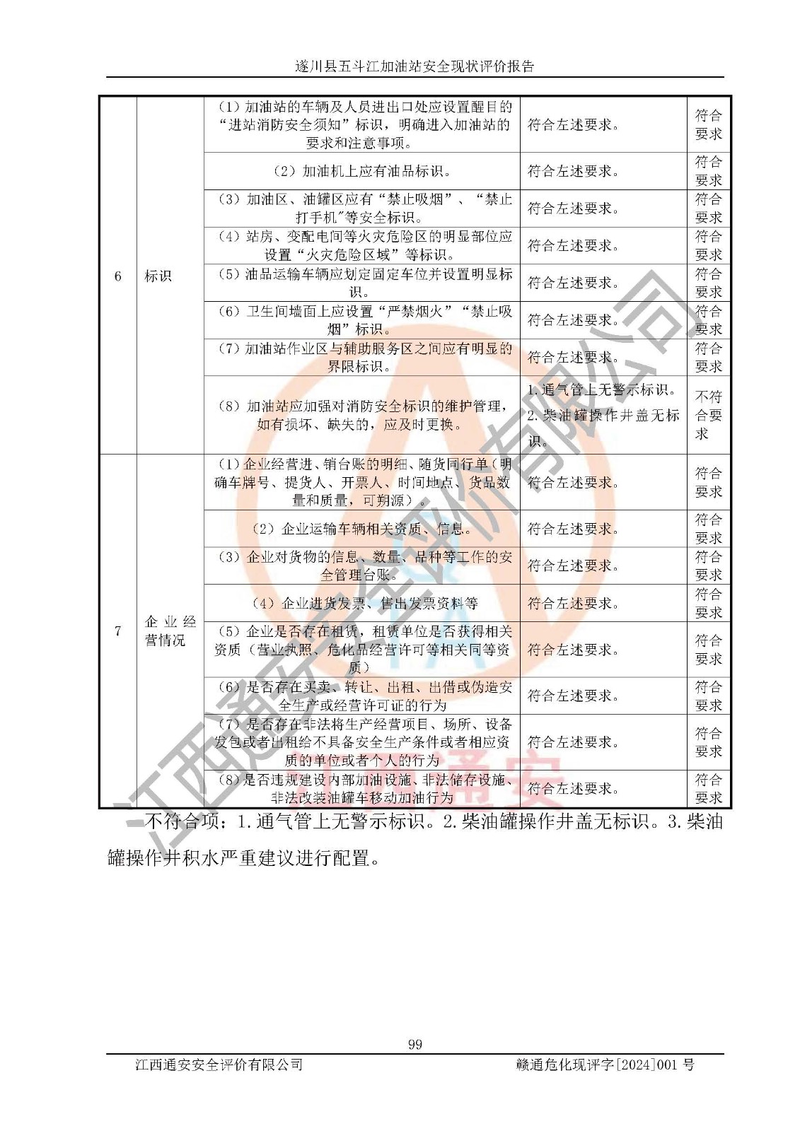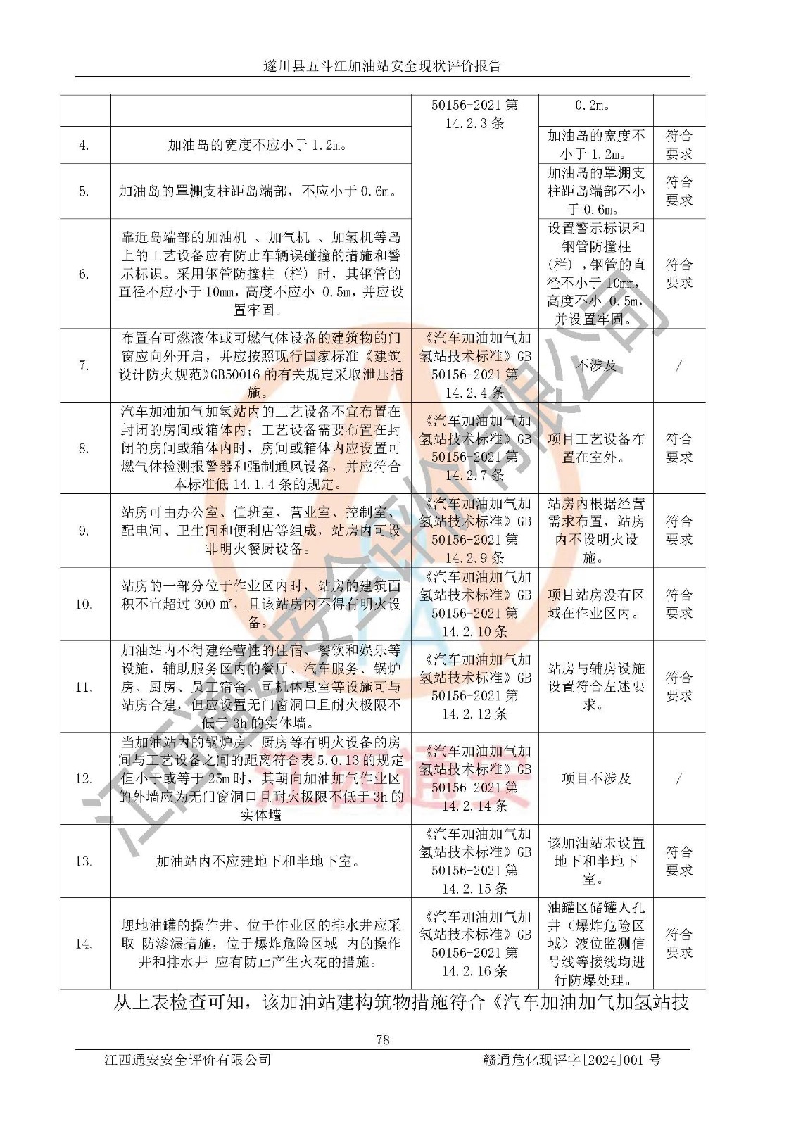 評價結論 | 遂川縣五斗江加油站站址合理,周邊環(huán)境良好,與敏感防護目標間距符合規(guī)范要求,站區(qū)建構筑物之間的防火間距、耐火等級符合標準要求,與總平面布置圖一致,加油卸油工藝及設備設施合理,工藝布置得當,防雷設施經(jīng)檢測合格,采取的工藝安全設施符合規(guī)范要求;該加油站制定了安全管理制度和操作規(guī)程,人員經(jīng)培訓合格后上崗,安全管理人員經(jīng)考核合格并取得安全合格證,能按照法律法規(guī)要求開展安全生產(chǎn)管理工作。 綜上:遂川縣五斗江加油站符合《汽車加油加氣加氫站技術標準》GB50156-2021等標準規(guī)范的要求,安全風險可控,滿足危險化學品經(jīng)營的安全條件。 | |||