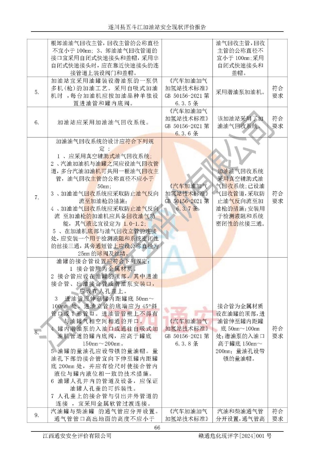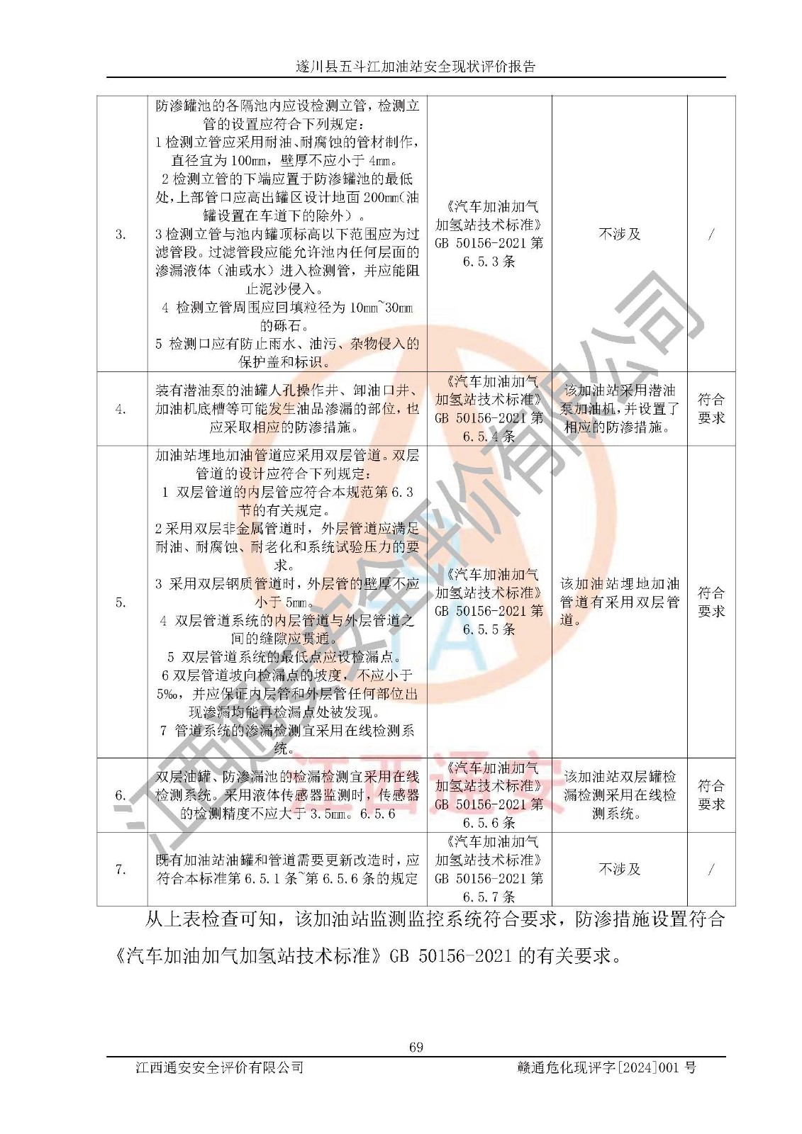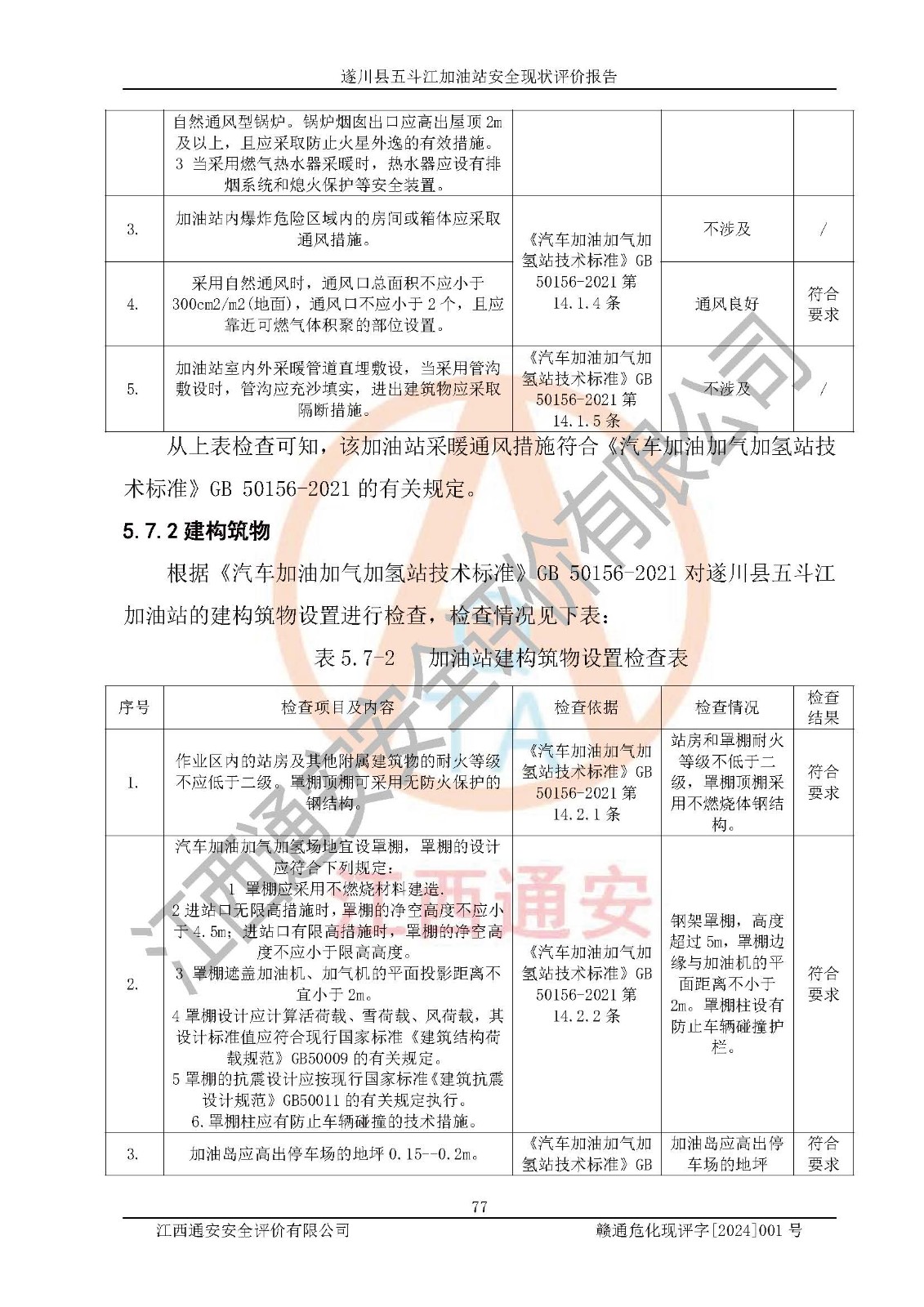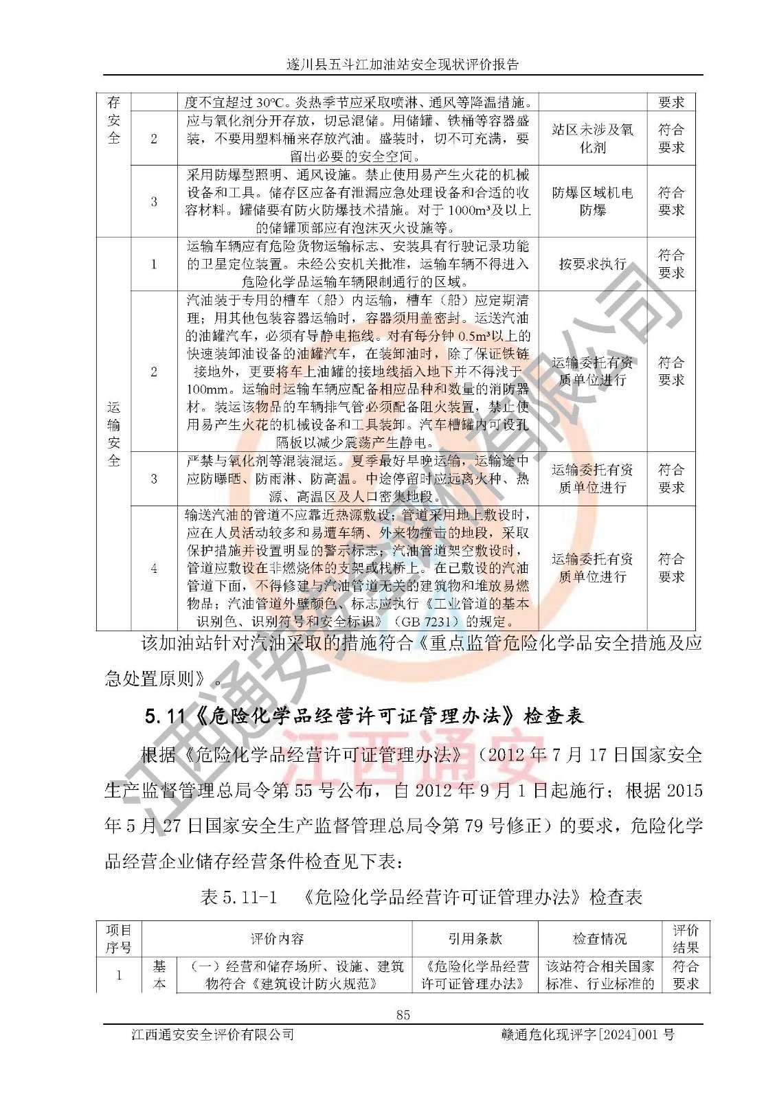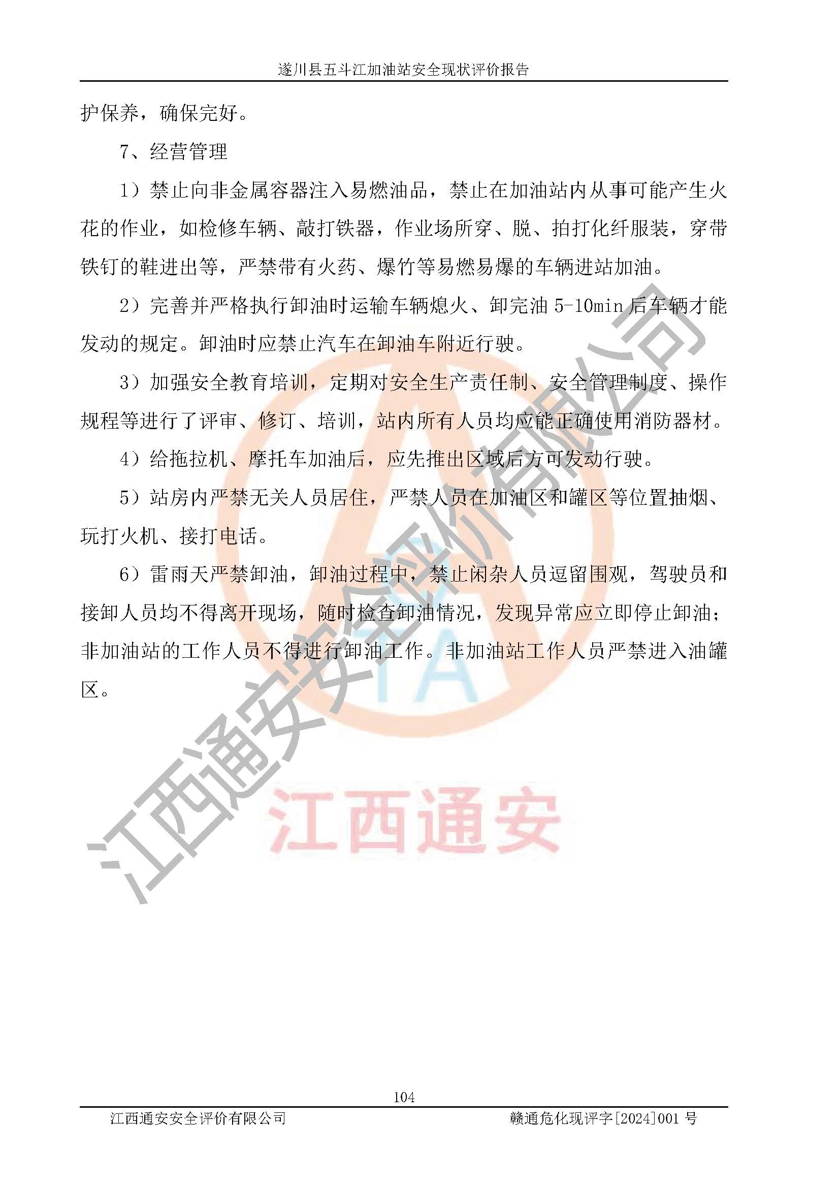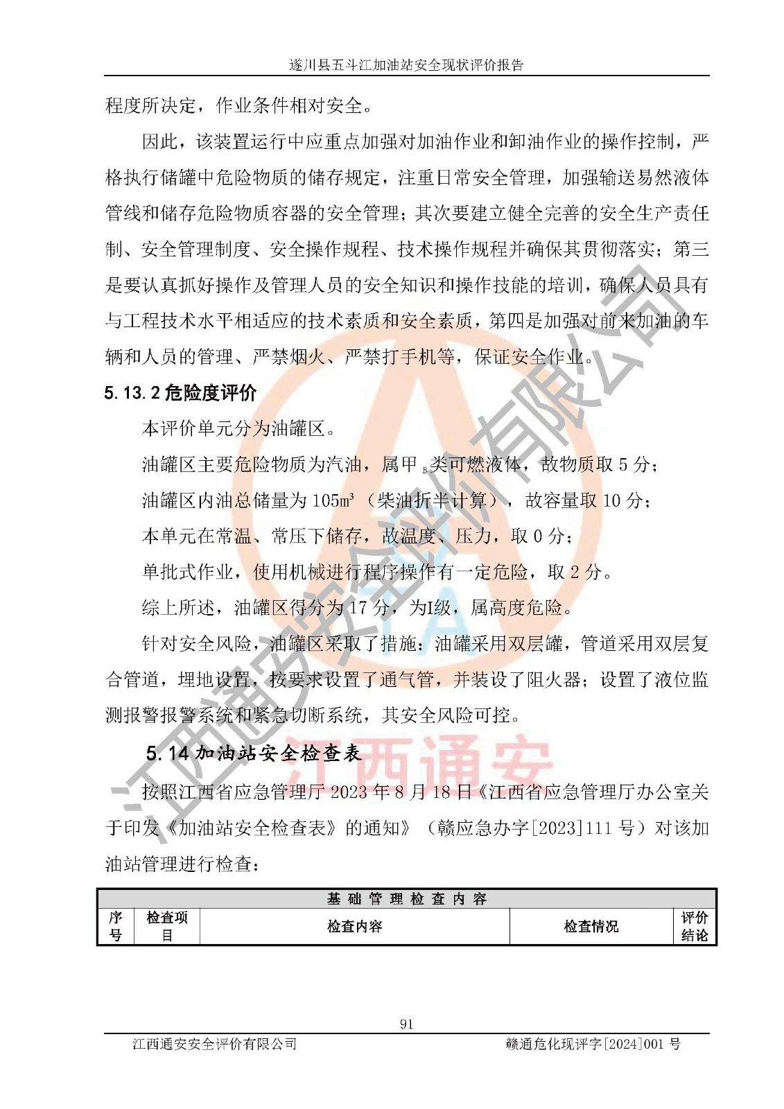 評價結論 | 遂川縣五斗江加油站站址合理,周邊環(huán)境良好,與敏感防護目標間距符合規(guī)范要求,站區(qū)建構筑物之間的防火間距、耐火等級符合標準要求,與總平面布置圖一致,加油卸油工藝及設備設施合理,工藝布置得當,防雷設施經(jīng)檢測合格,采取的工藝安全設施符合規(guī)范要求;該加油站制定了安全管理制度和操作規(guī)程,人員經(jīng)培訓合格后上崗,安全管理人員經(jīng)考核合格并取得安全合格證,能按照法律法規(guī)要求開展安全生產(chǎn)管理工作。 綜上:遂川縣五斗江加油站符合《汽車加油加氣加氫站技術標準》GB50156-2021等標準規(guī)范的要求,安全風險可控,滿足危險化學品經(jīng)營的安全條件。 | |||