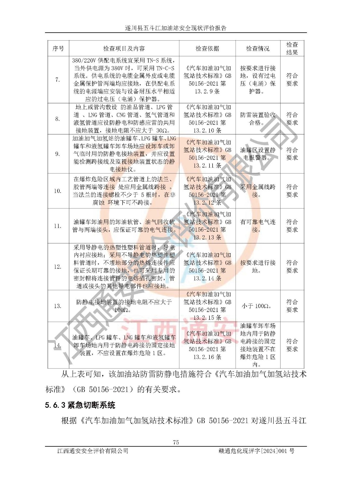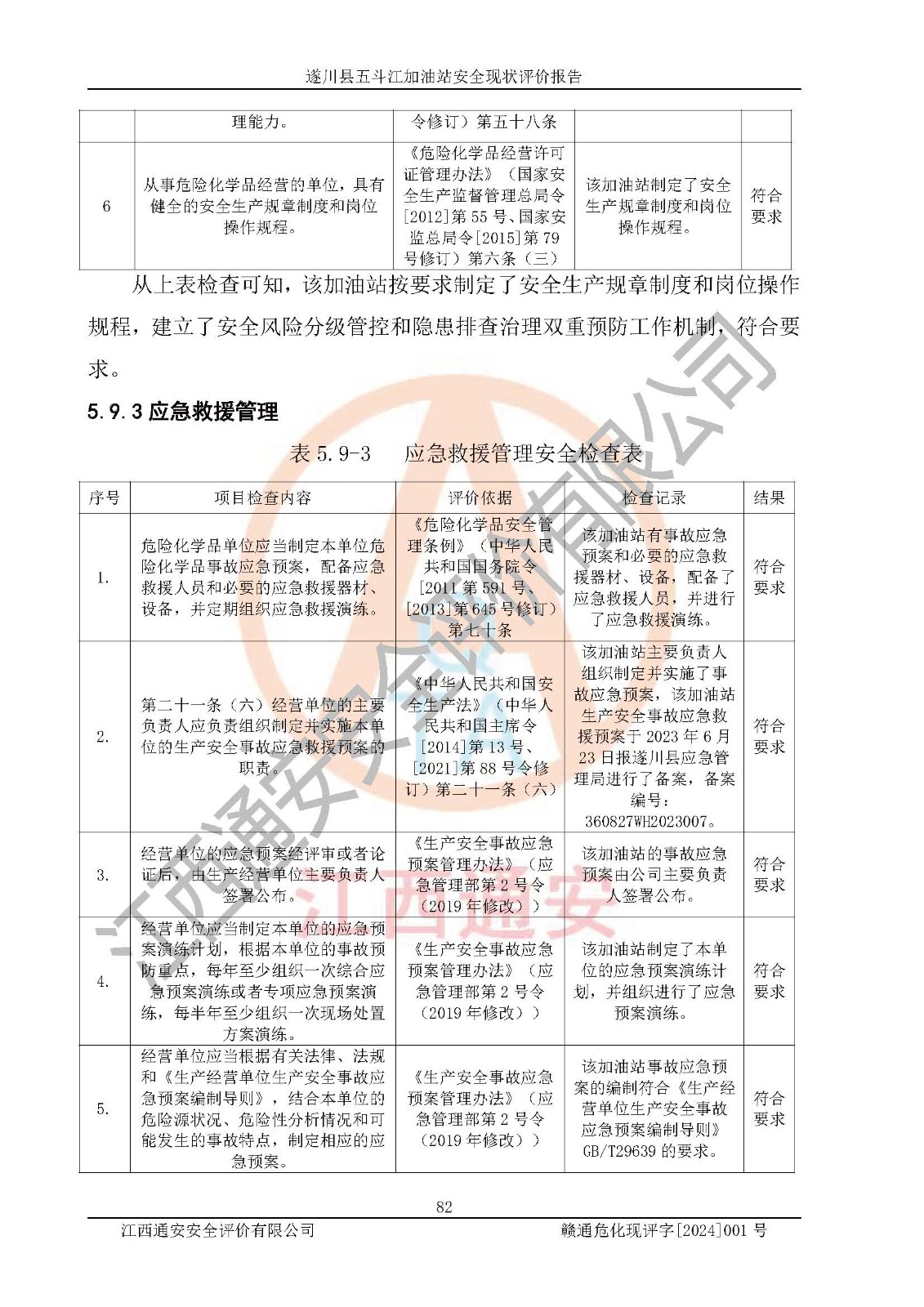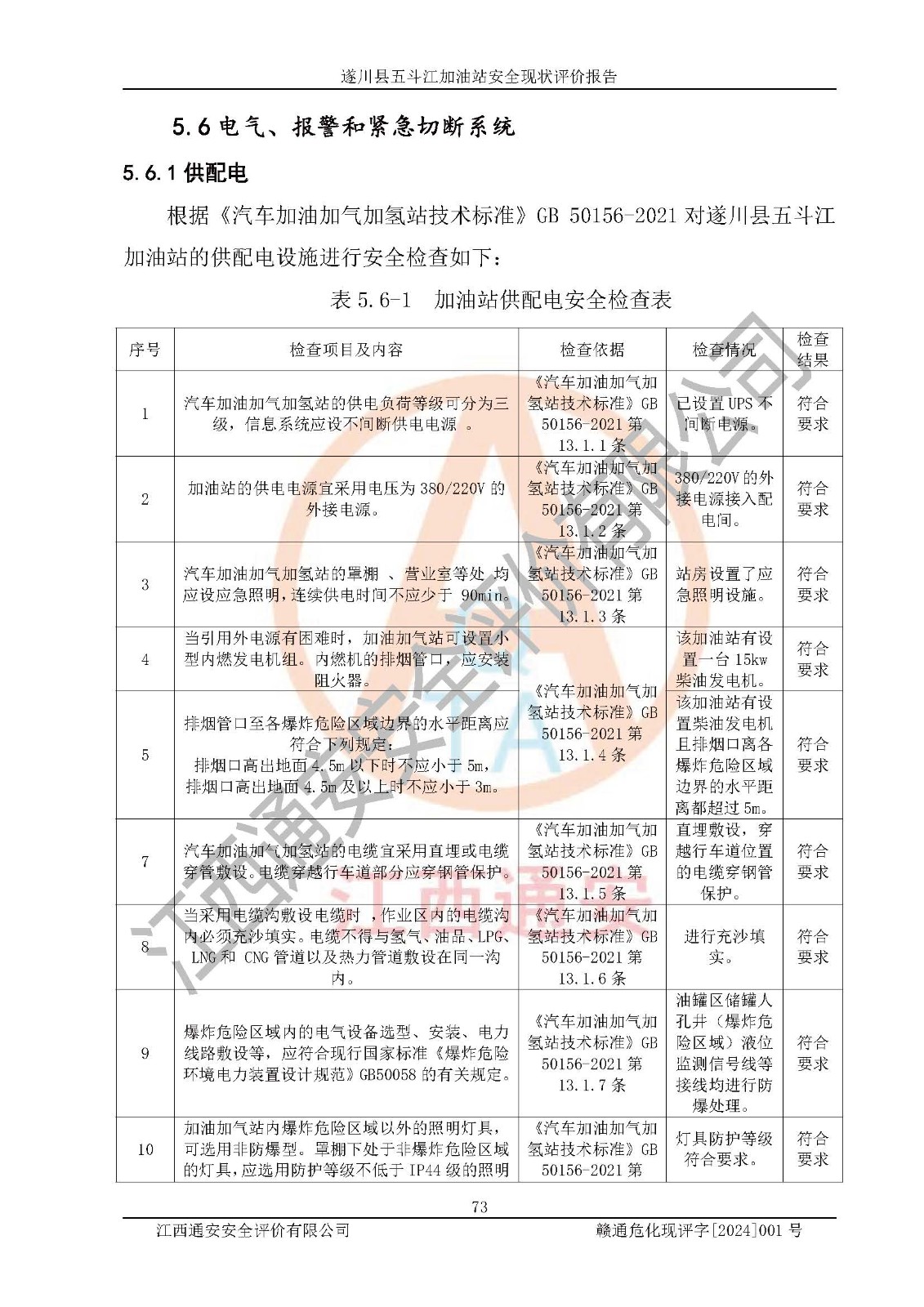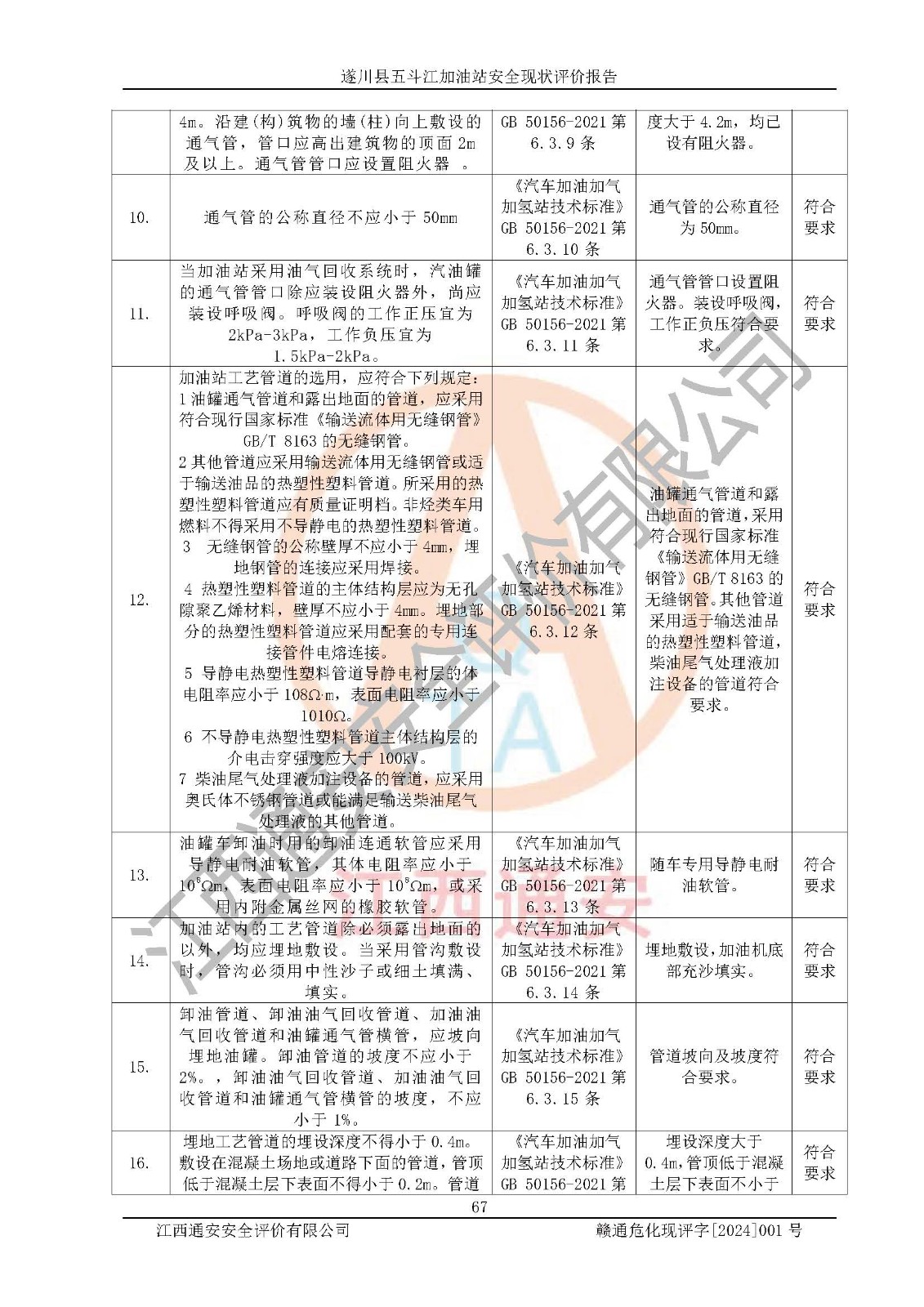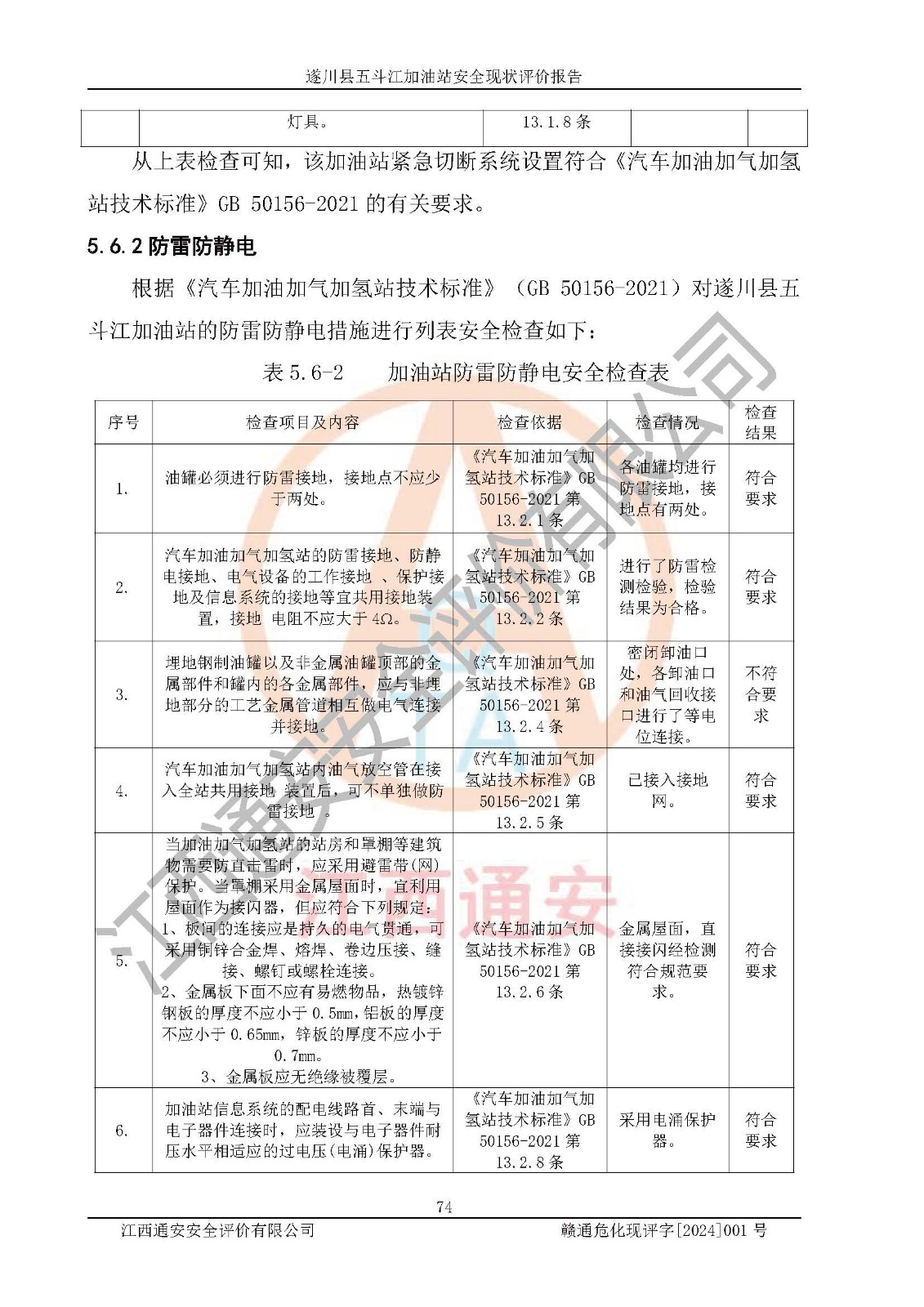 評價結論 | 遂川縣五斗江加油站站址合理,周邊環(huán)境良好,與敏感防護目標間距符合規(guī)范要求,站區(qū)建構筑物之間的防火間距、耐火等級符合標準要求,與總平面布置圖一致,加油卸油工藝及設備設施合理,工藝布置得當,防雷設施經(jīng)檢測合格,采取的工藝安全設施符合規(guī)范要求;該加油站制定了安全管理制度和操作規(guī)程,人員經(jīng)培訓合格后上崗,安全管理人員經(jīng)考核合格并取得安全合格證,能按照法律法規(guī)要求開展安全生產(chǎn)管理工作。 綜上:遂川縣五斗江加油站符合《汽車加油加氣加氫站技術標準》GB50156-2021等標準規(guī)范的要求,安全風險可控,滿足危險化學品經(jīng)營的安全條件。 | |||