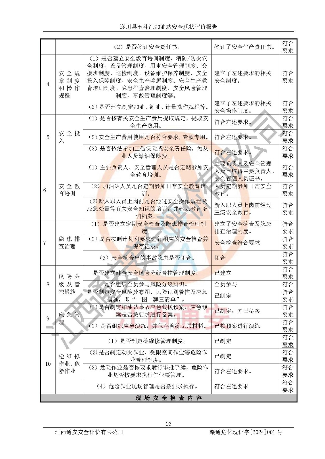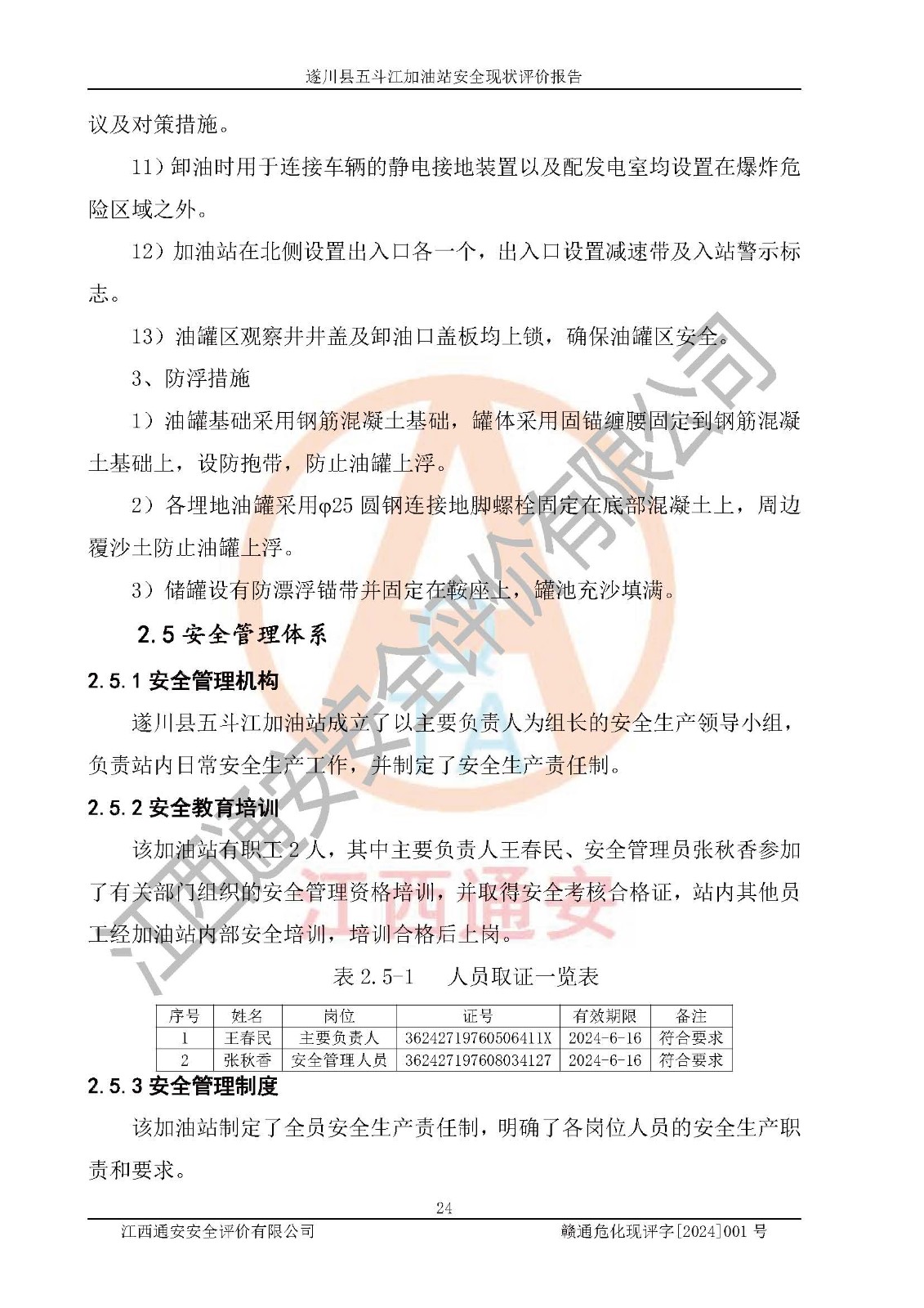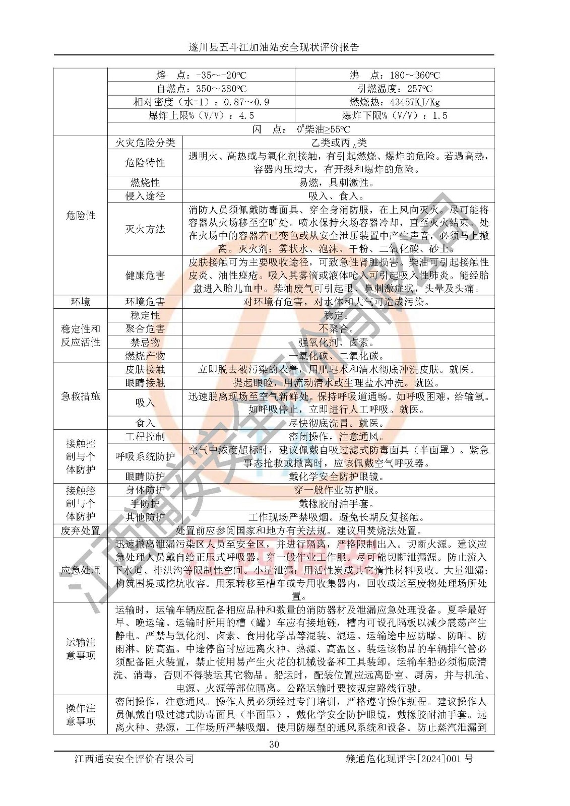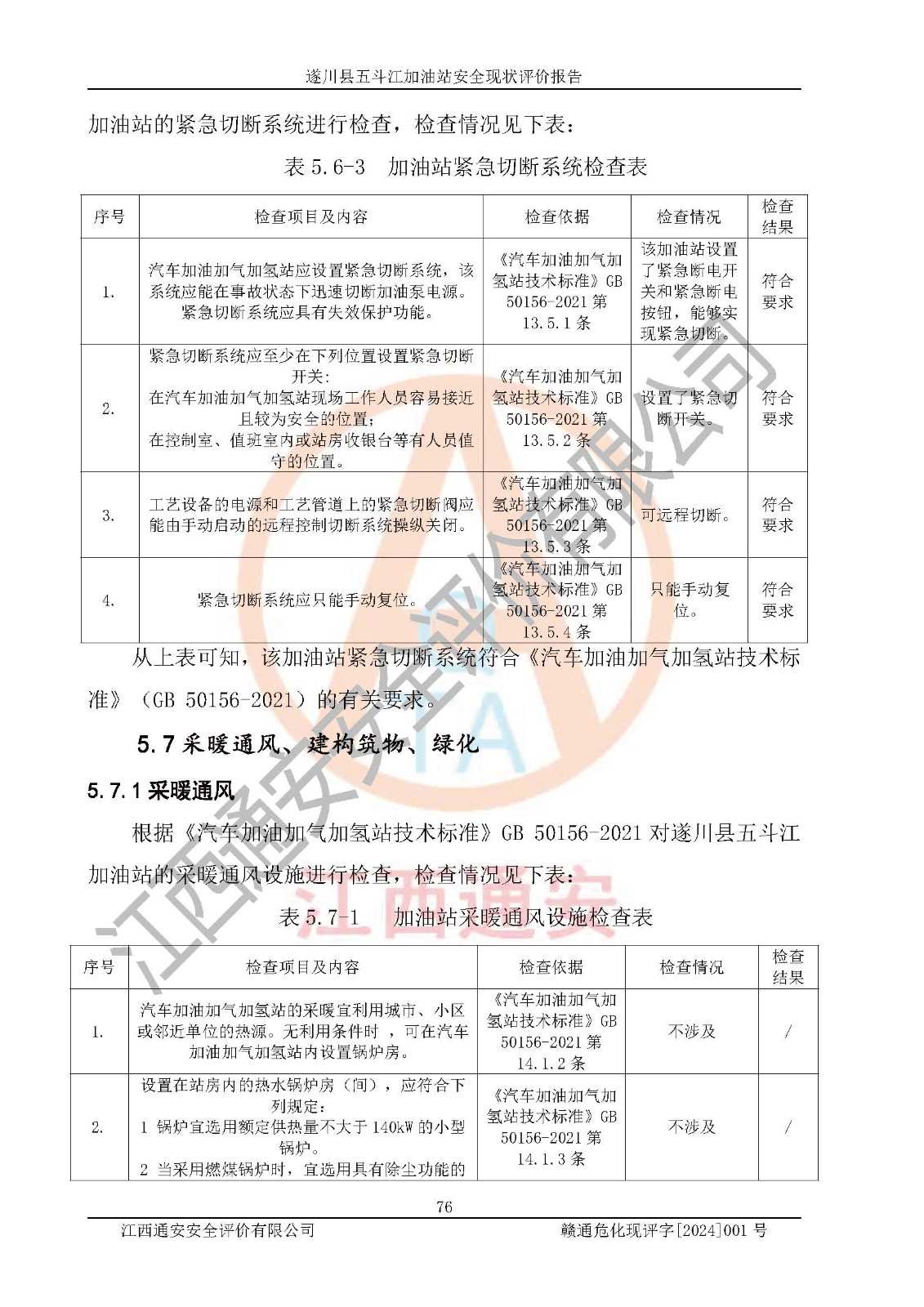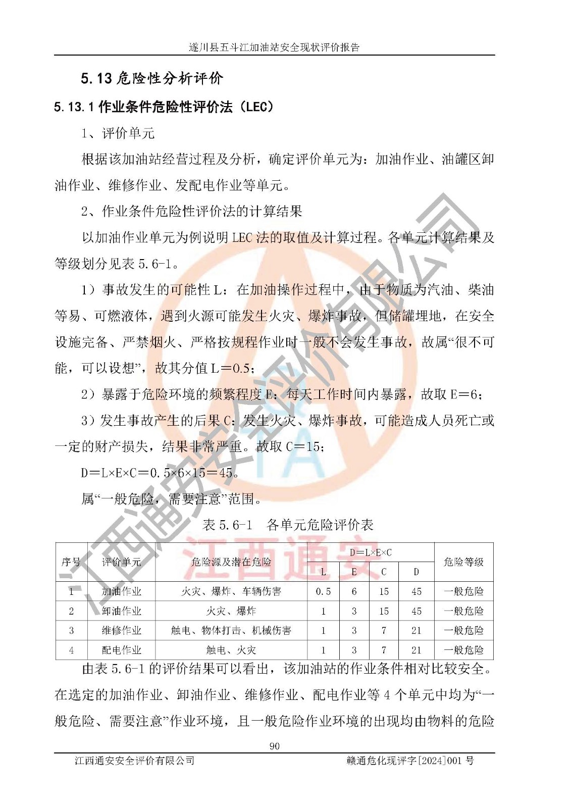 評價結論 | 遂川縣五斗江加油站站址合理,周邊環(huán)境良好,與敏感防護目標間距符合規(guī)范要求,站區(qū)建構筑物之間的防火間距、耐火等級符合標準要求,與總平面布置圖一致,加油卸油工藝及設備設施合理,工藝布置得當,防雷設施經(jīng)檢測合格,采取的工藝安全設施符合規(guī)范要求;該加油站制定了安全管理制度和操作規(guī)程,人員經(jīng)培訓合格后上崗,安全管理人員經(jīng)考核合格并取得安全合格證,能按照法律法規(guī)要求開展安全生產(chǎn)管理工作。 綜上:遂川縣五斗江加油站符合《汽車加油加氣加氫站技術標準》GB50156-2021等標準規(guī)范的要求,安全風險可控,滿足危險化學品經(jīng)營的安全條件。 | |||
