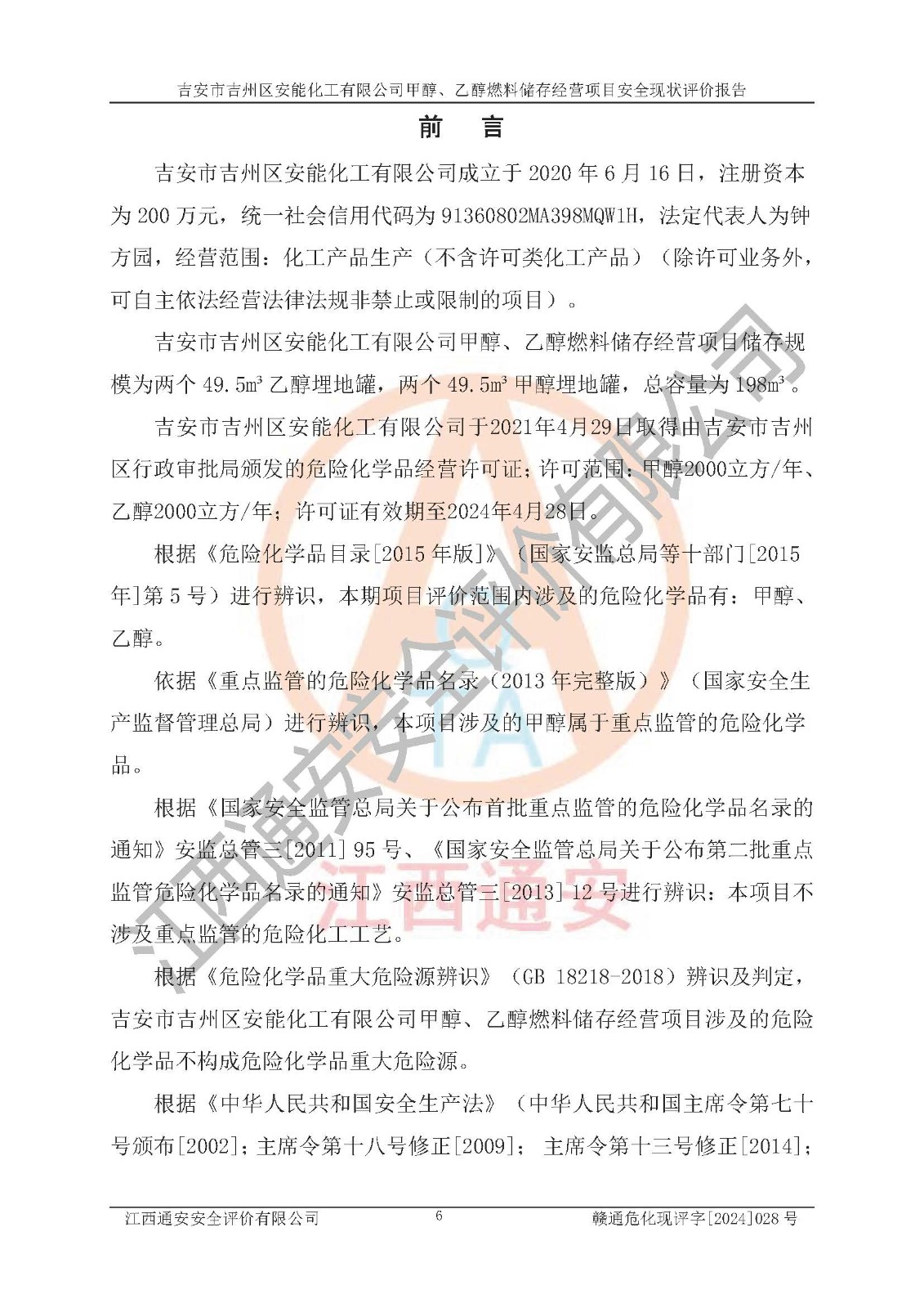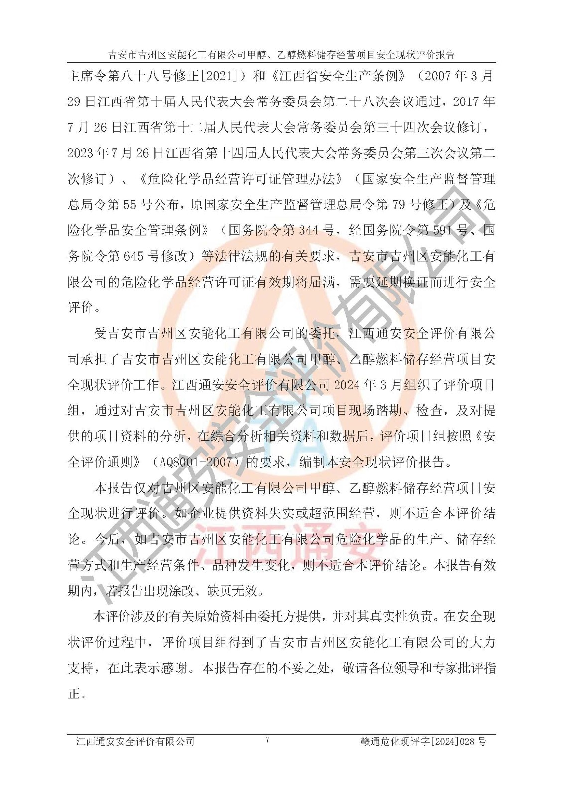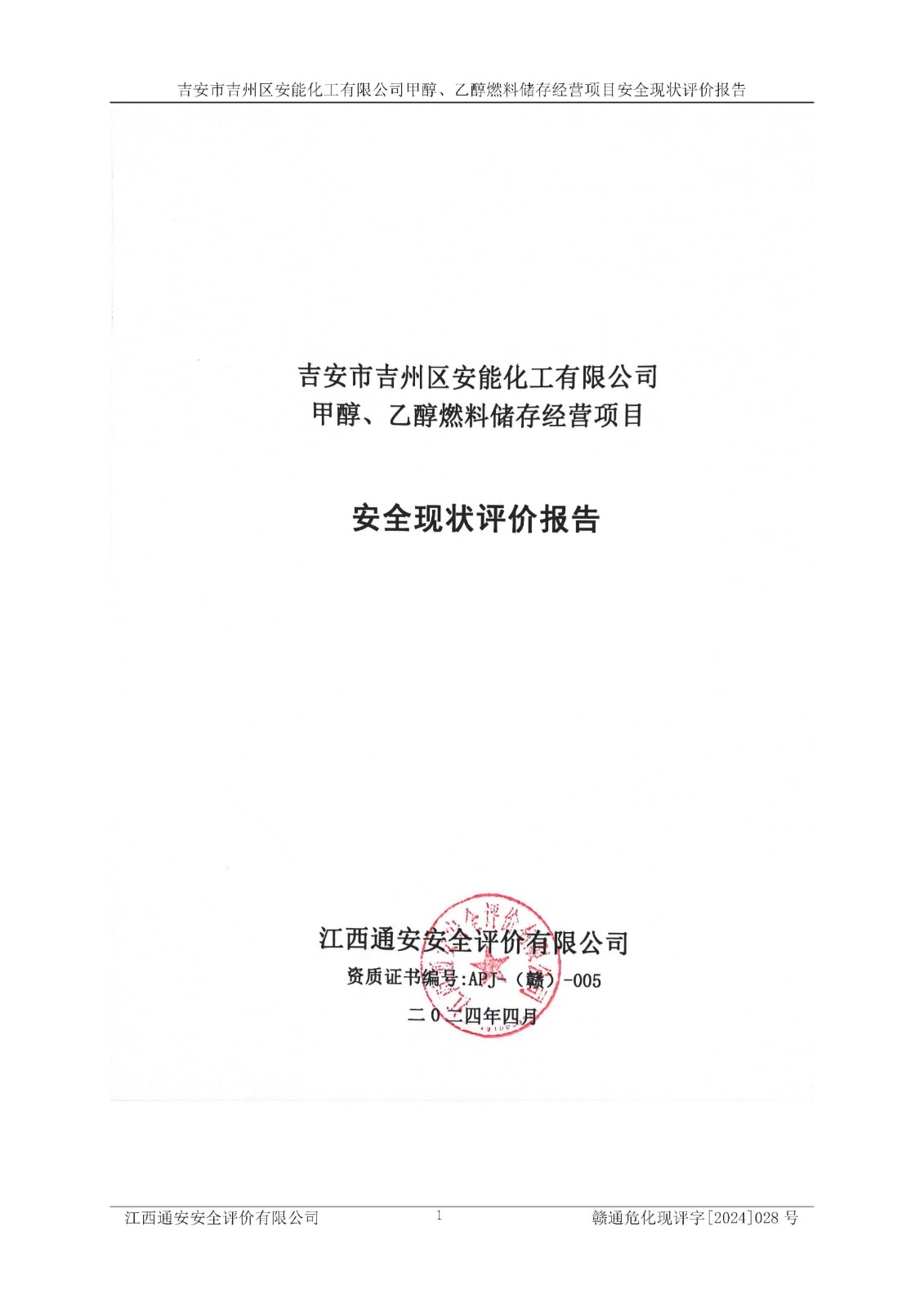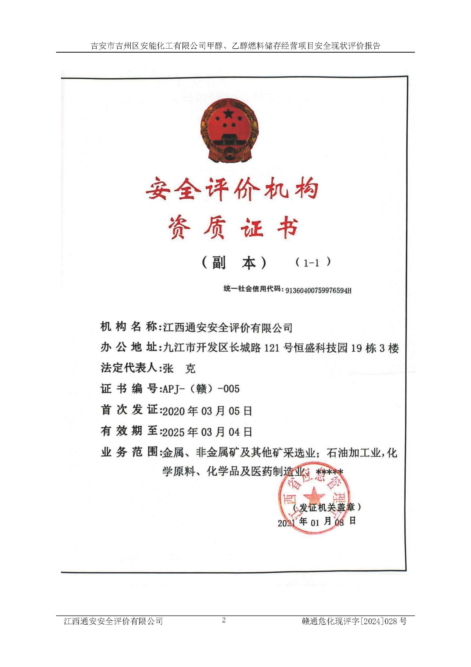 評價報告名稱 | 吉安市吉州區(qū)安能化工有限公司甲醇、乙醇燃料儲存經營項目安全現狀評價報告 | |||