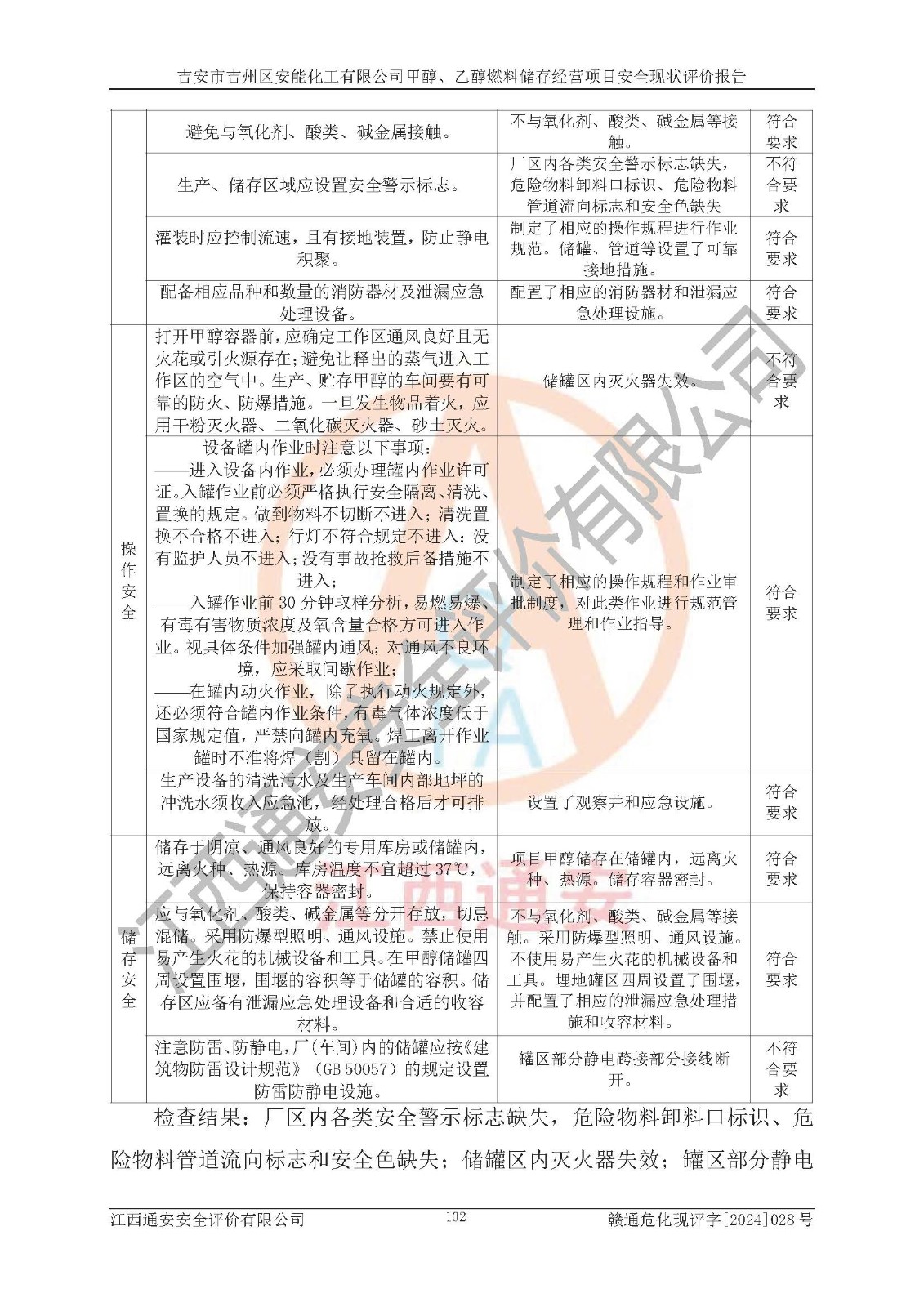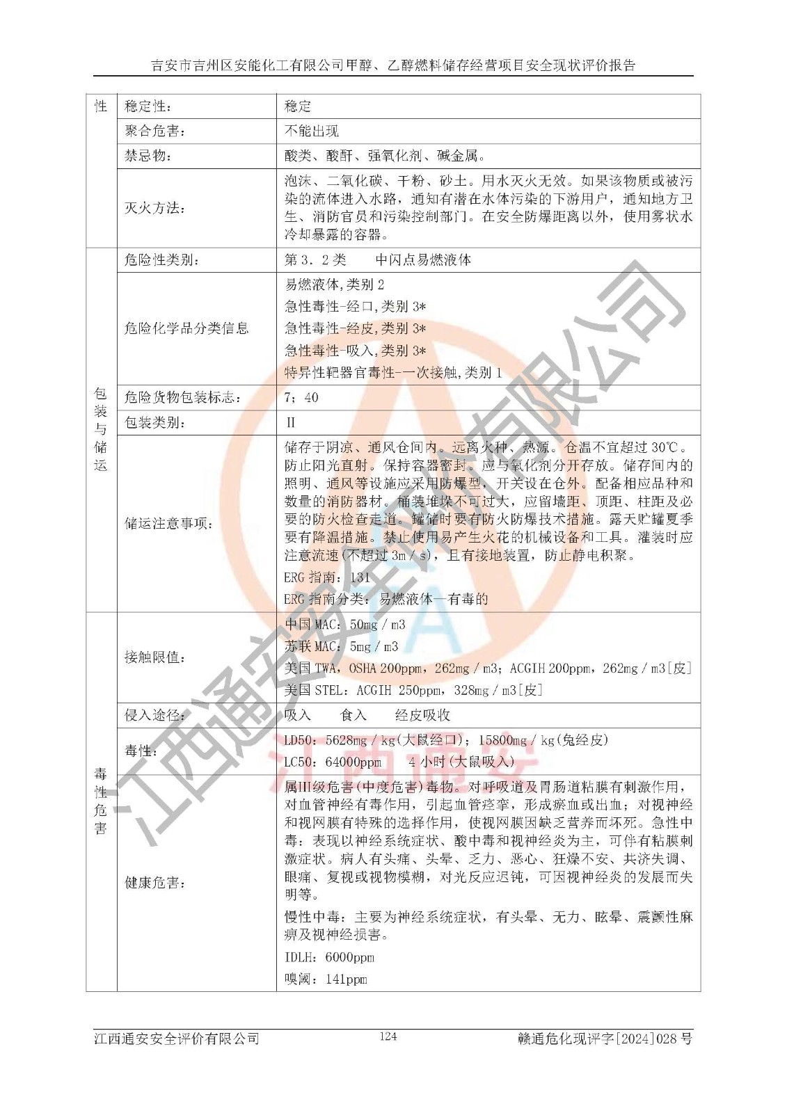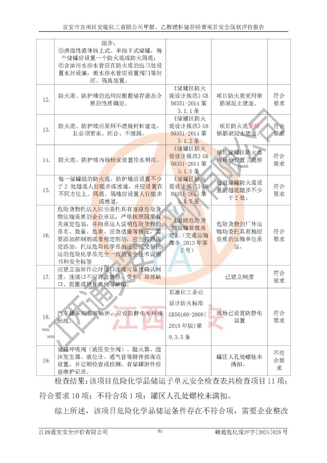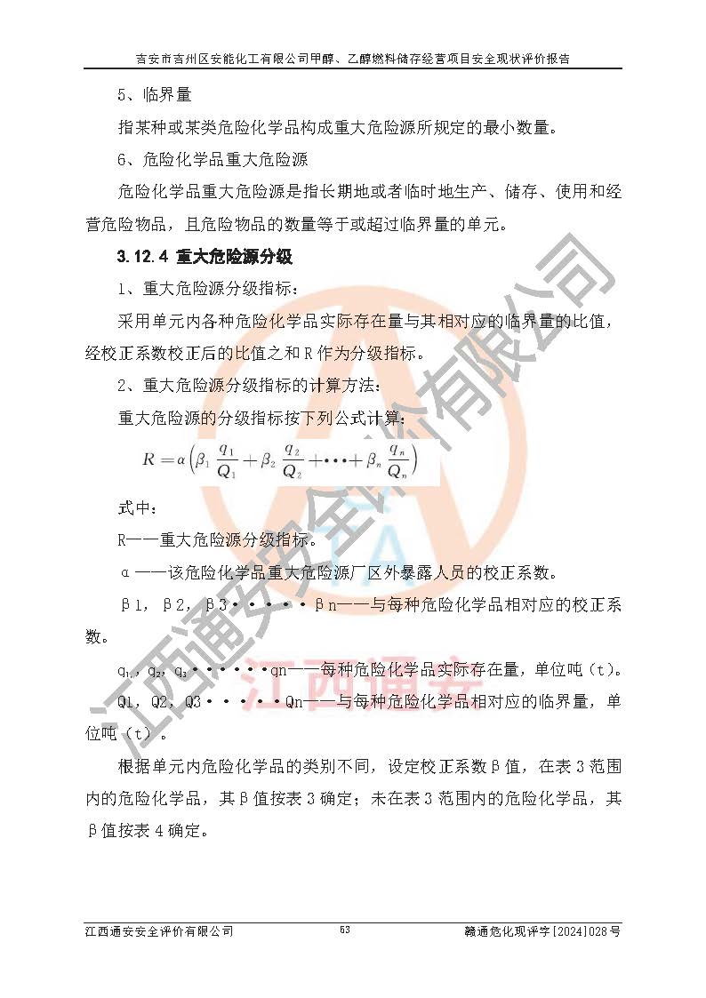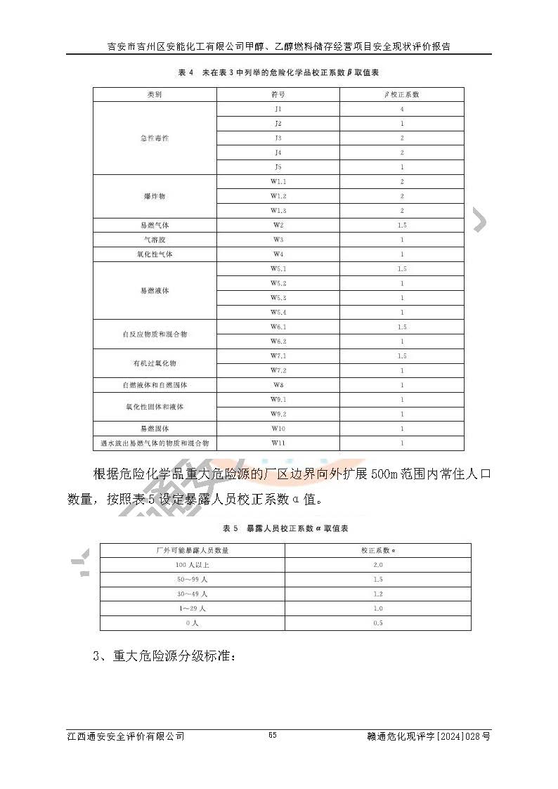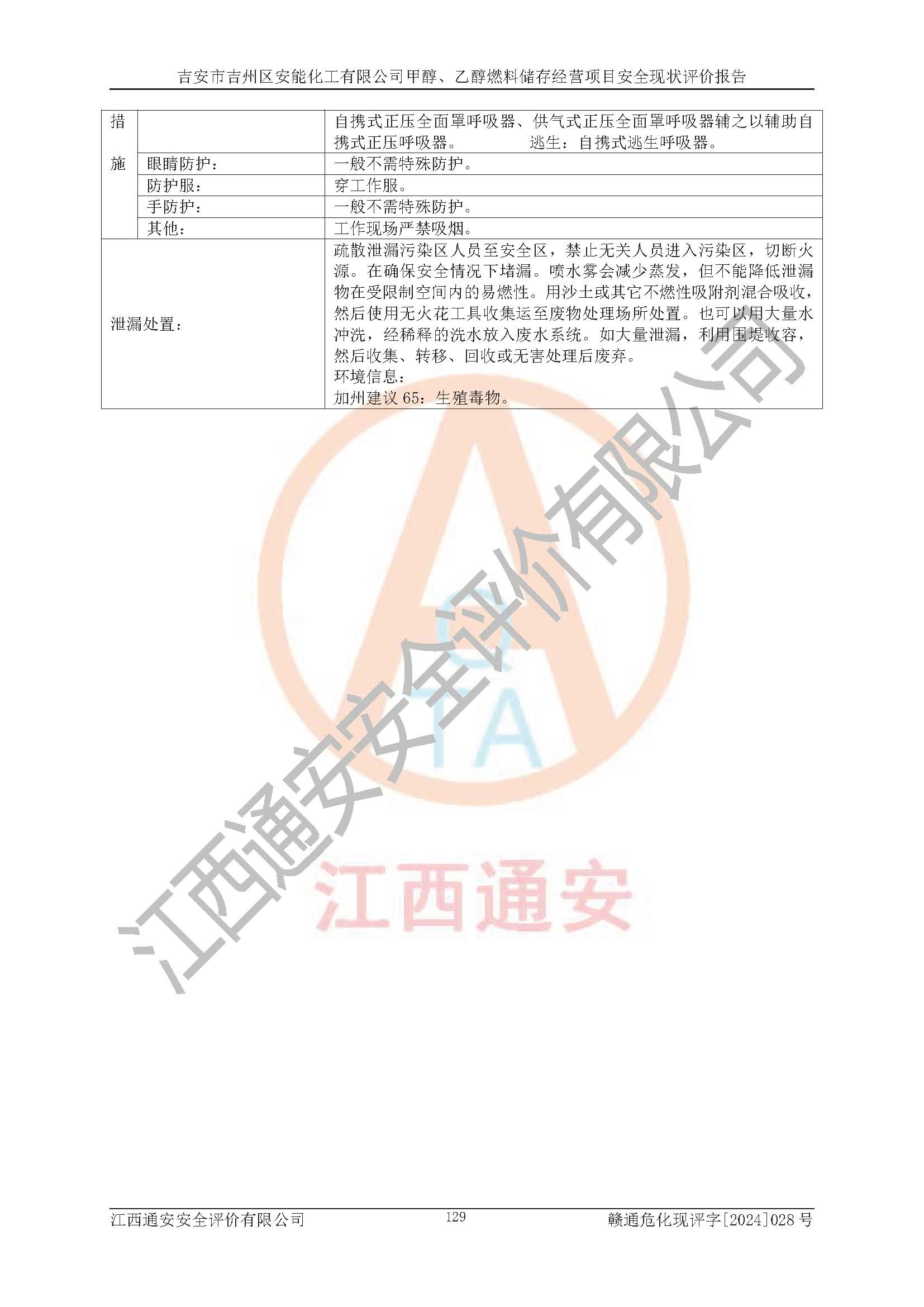 評價結論 | 吉安市吉州區(qū)安能化工有限公司甲醇、乙醇燃料儲存經營項目經營現狀滿足項目危險化學品儲存和經營的要求,安全管理**,安全風險可控,滿足危險化學品經營的安全條件。 | |||