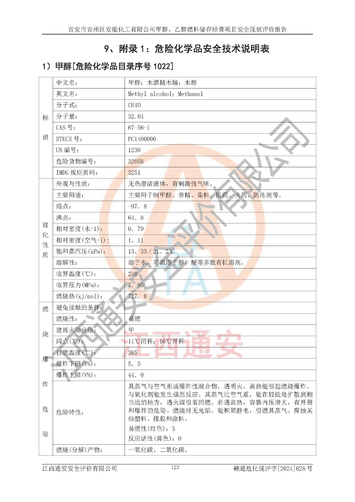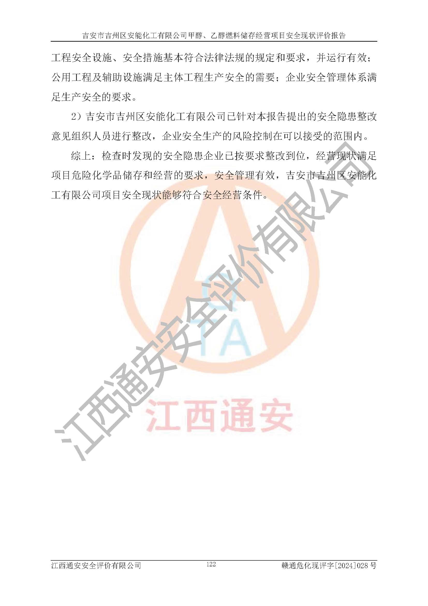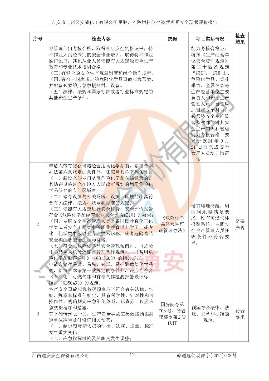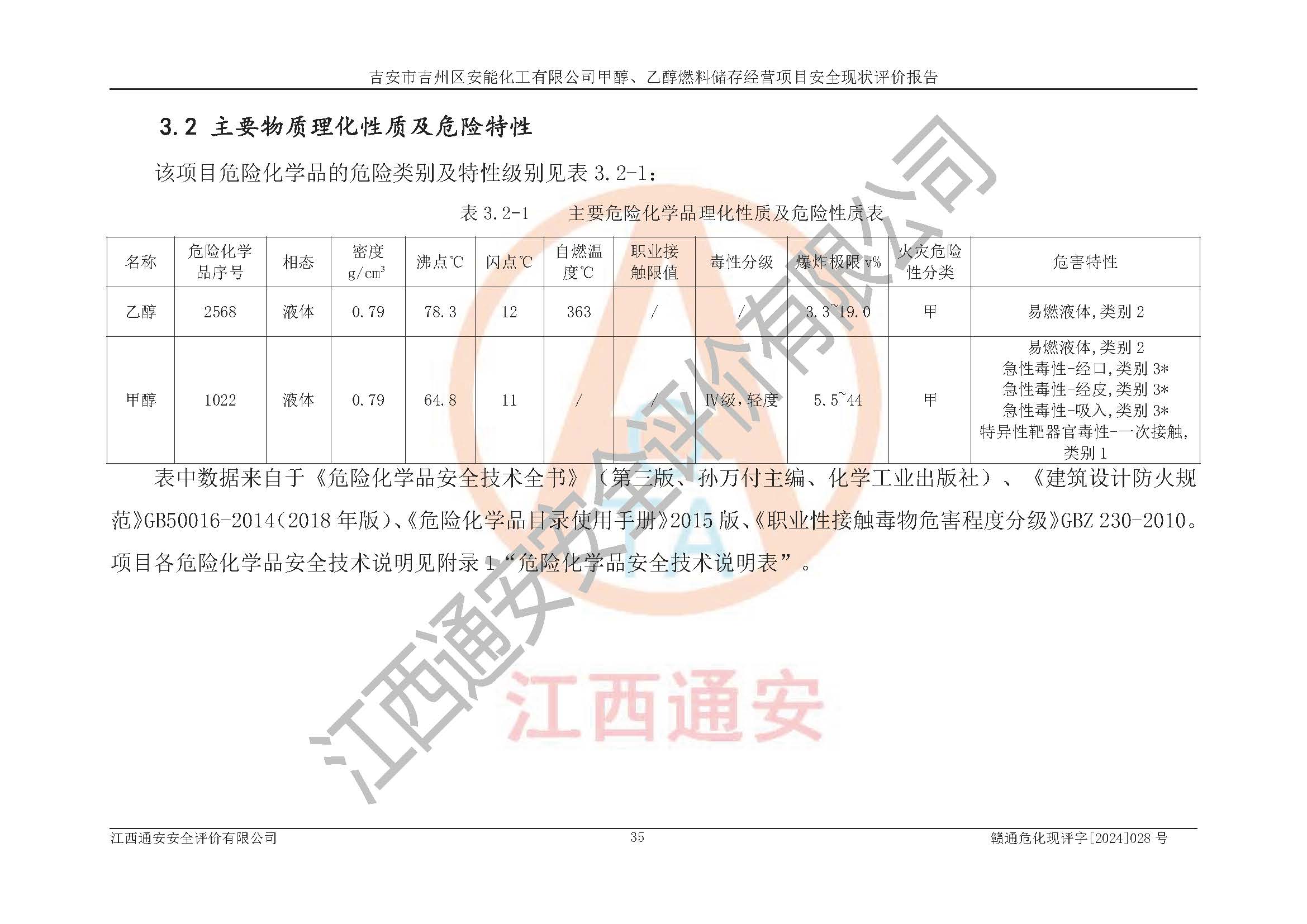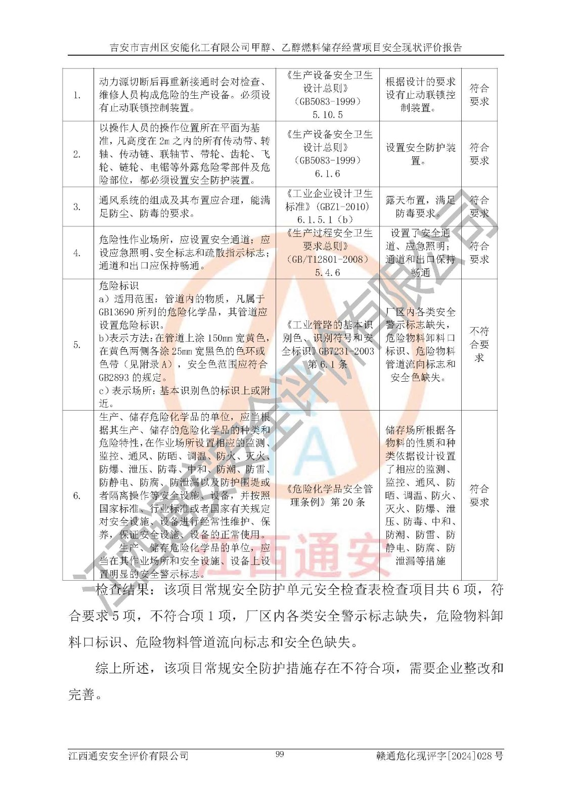評價結論 | 吉安市吉州區(qū)安能化工有限公司甲醇、乙醇燃料儲存經營項目經營現狀滿足項目危險化學品儲存和經營的要求,安全管理**,安全風險可控,滿足危險化學品經營的安全條件。 | |||