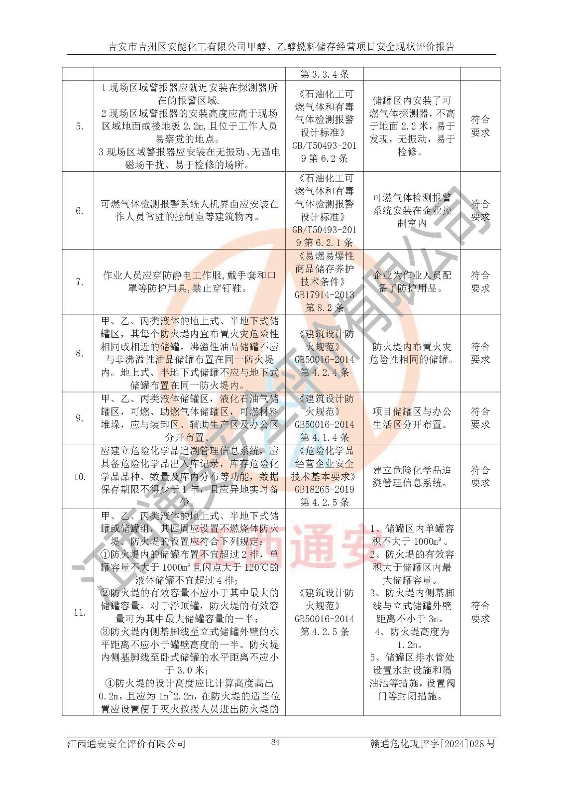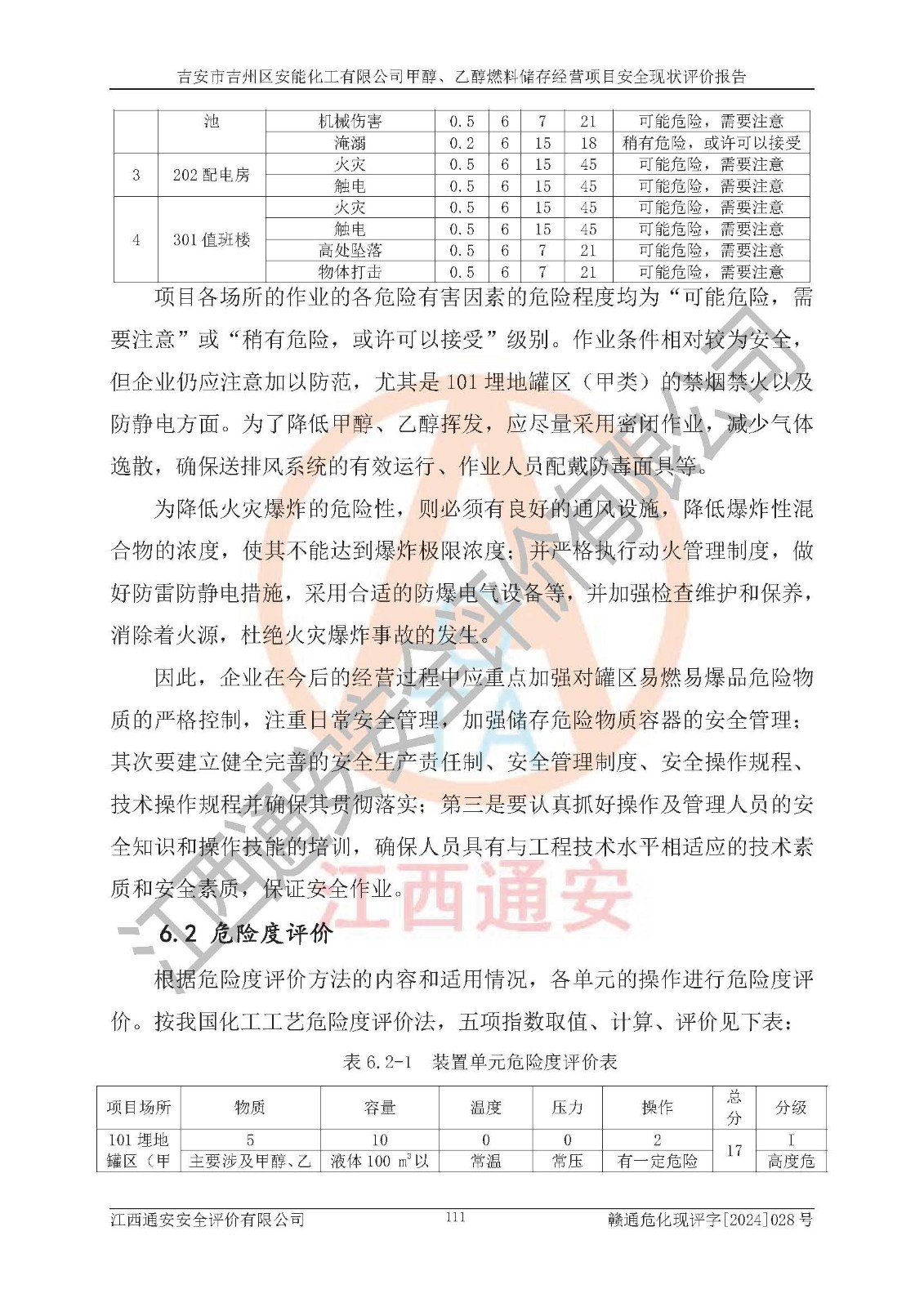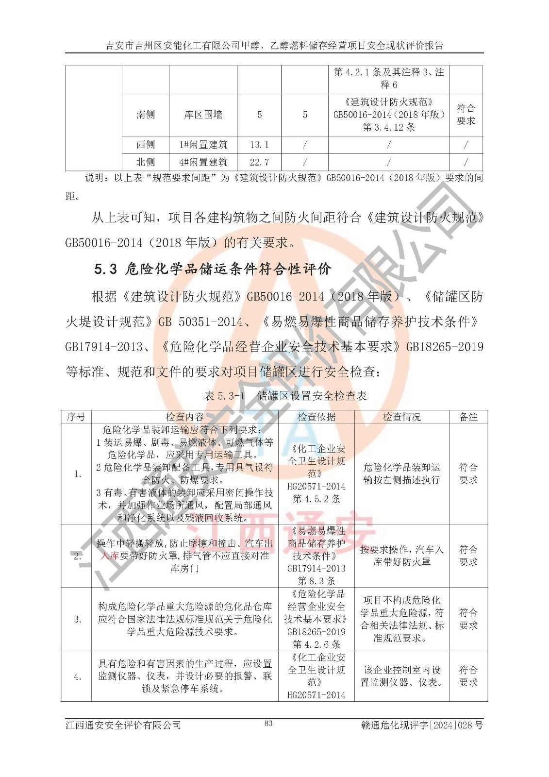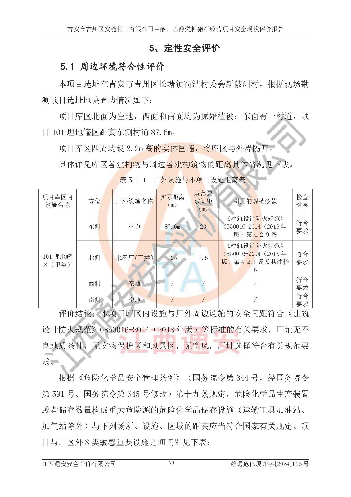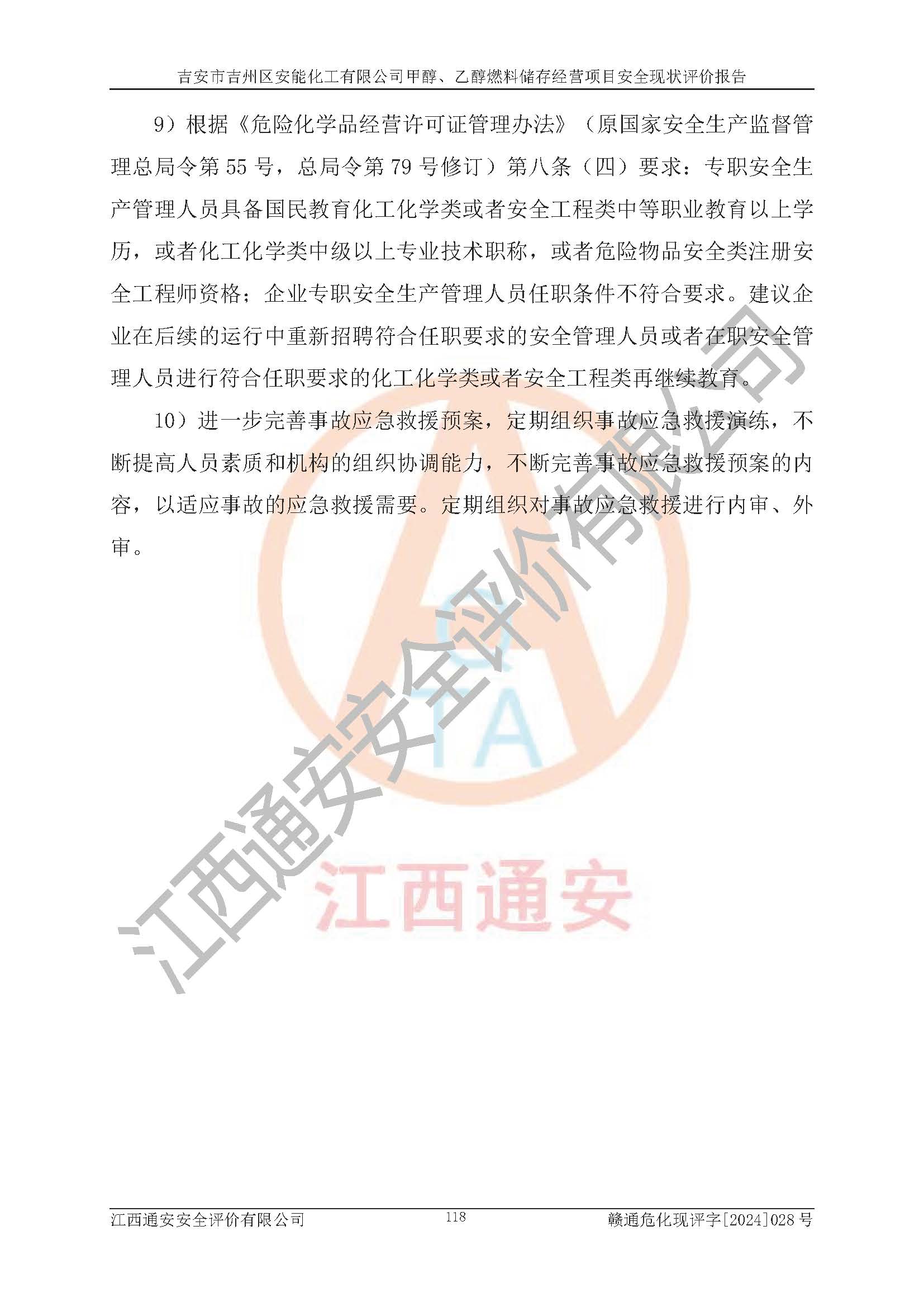 評價結論 | 吉安市吉州區(qū)安能化工有限公司甲醇、乙醇燃料儲存經營項目經營現狀滿足項目危險化學品儲存和經營的要求,安全管理**,安全風險可控,滿足危險化學品經營的安全條件。 | |||