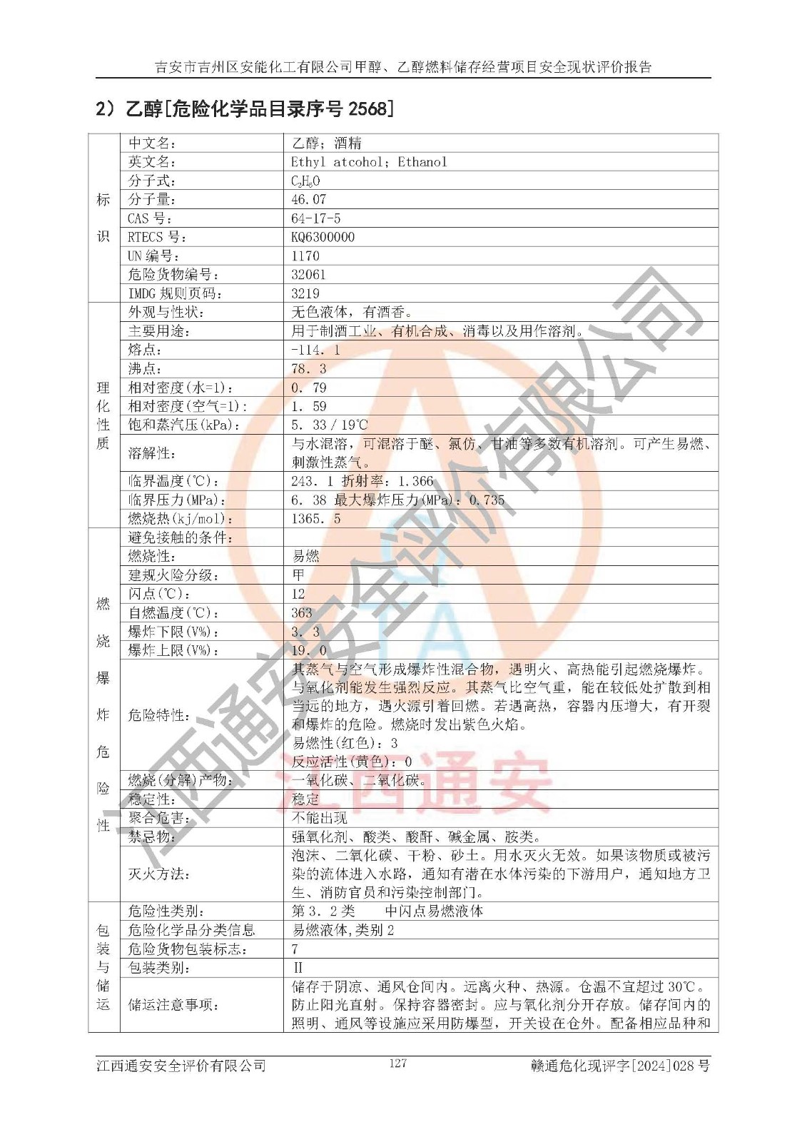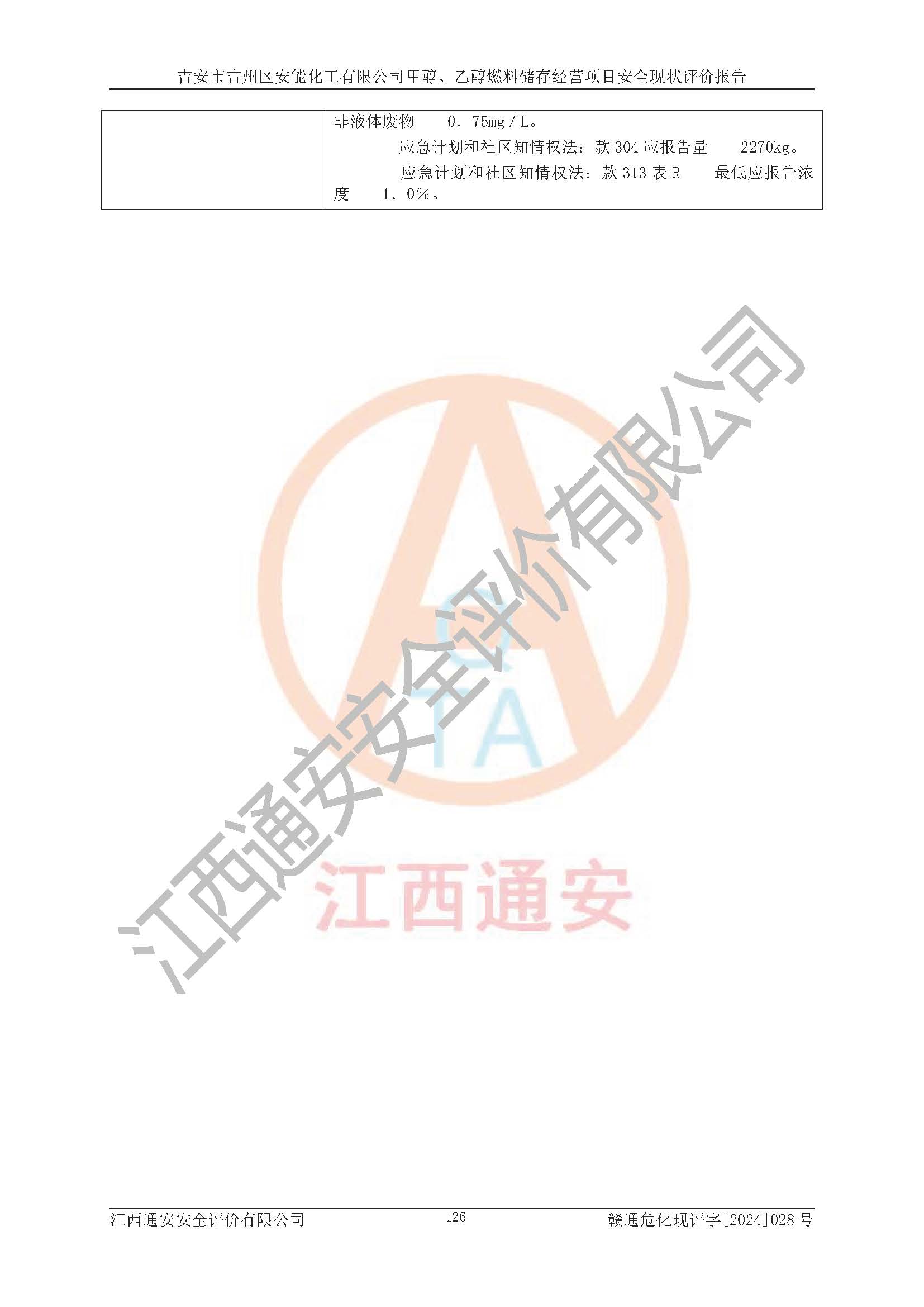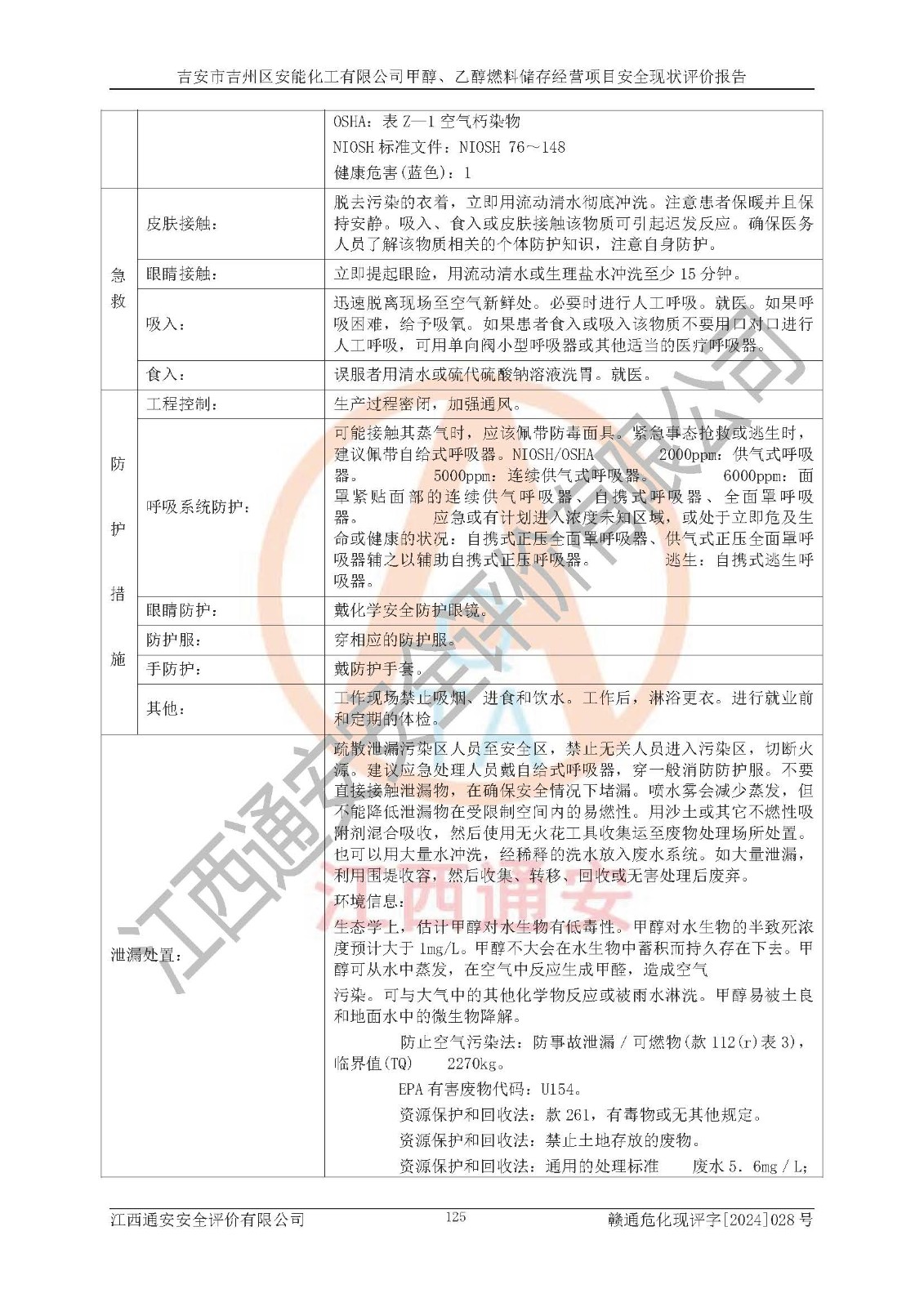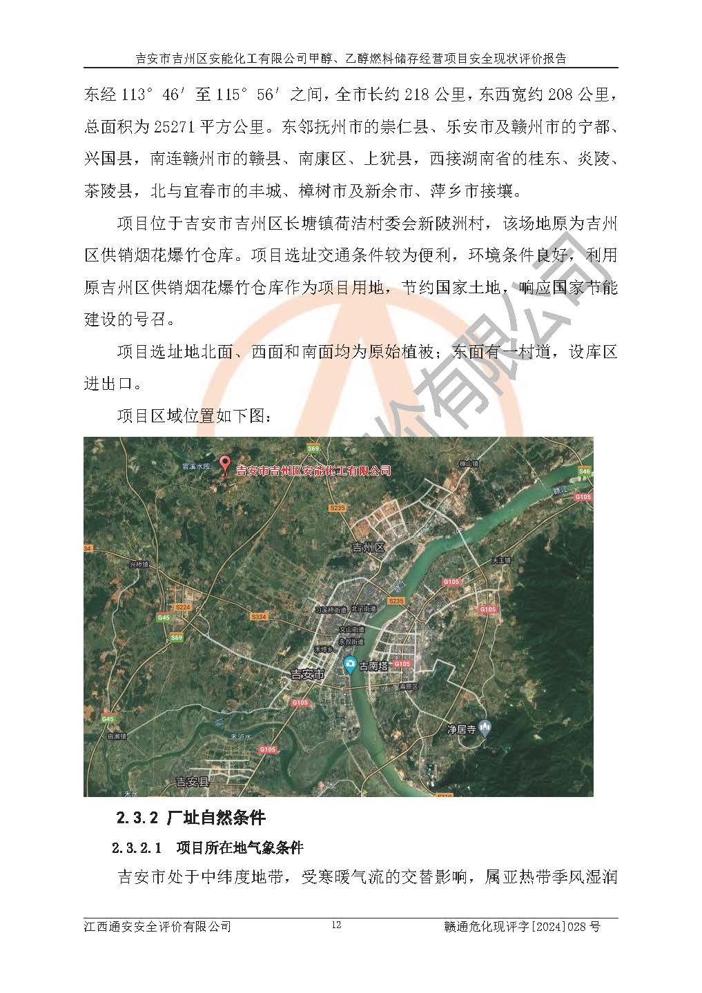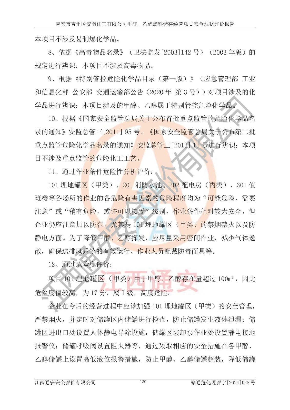 評價結論 | 吉安市吉州區(qū)安能化工有限公司甲醇、乙醇燃料儲存經營項目經營現狀滿足項目危險化學品儲存和經營的要求,安全管理**,安全風險可控,滿足危險化學品經營的安全條件。 | |||
