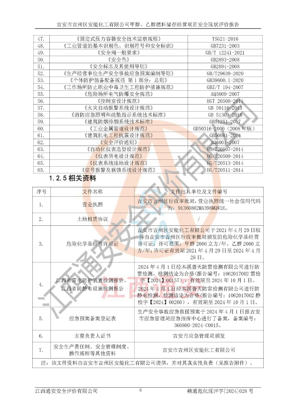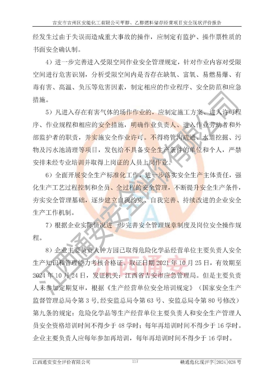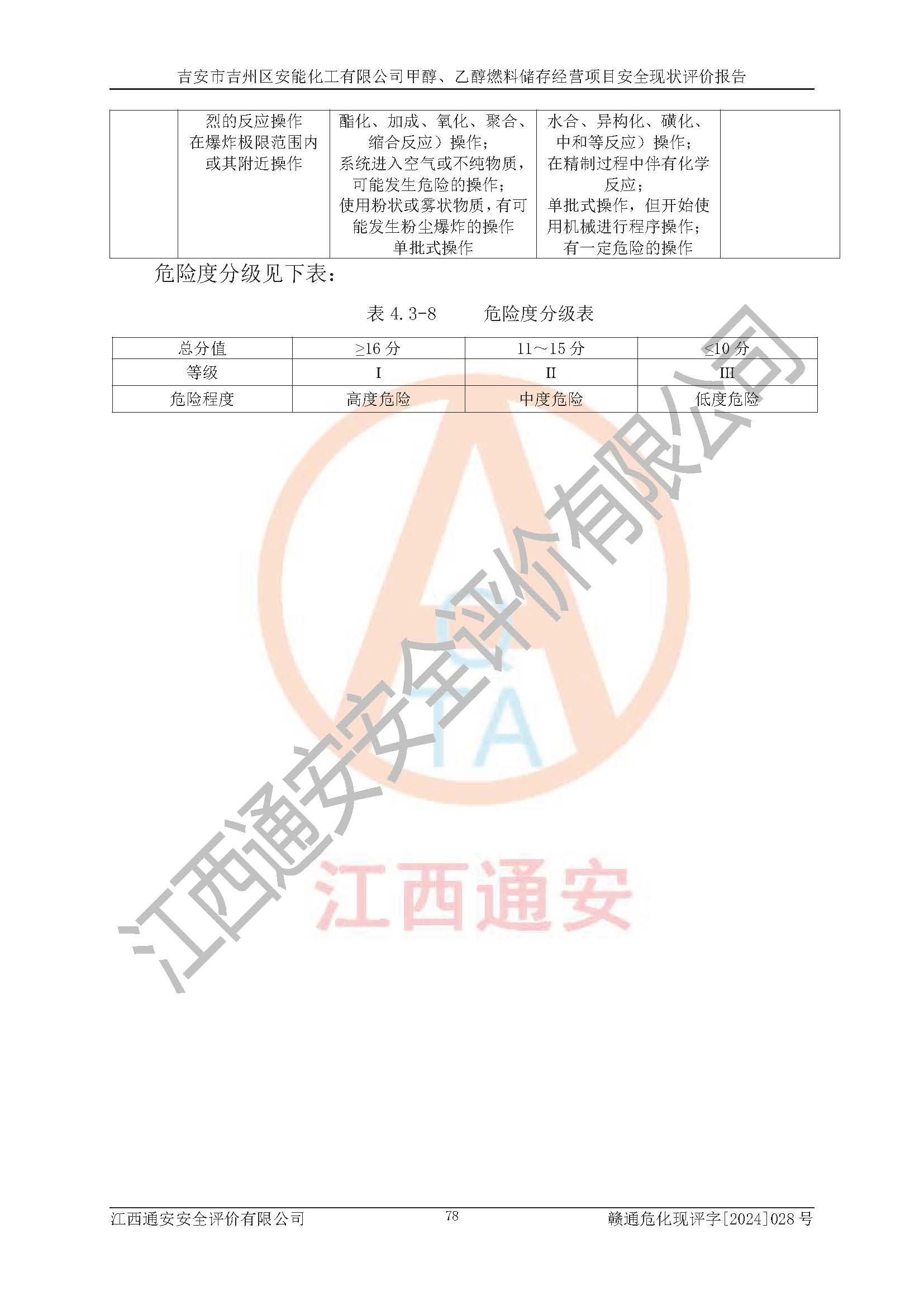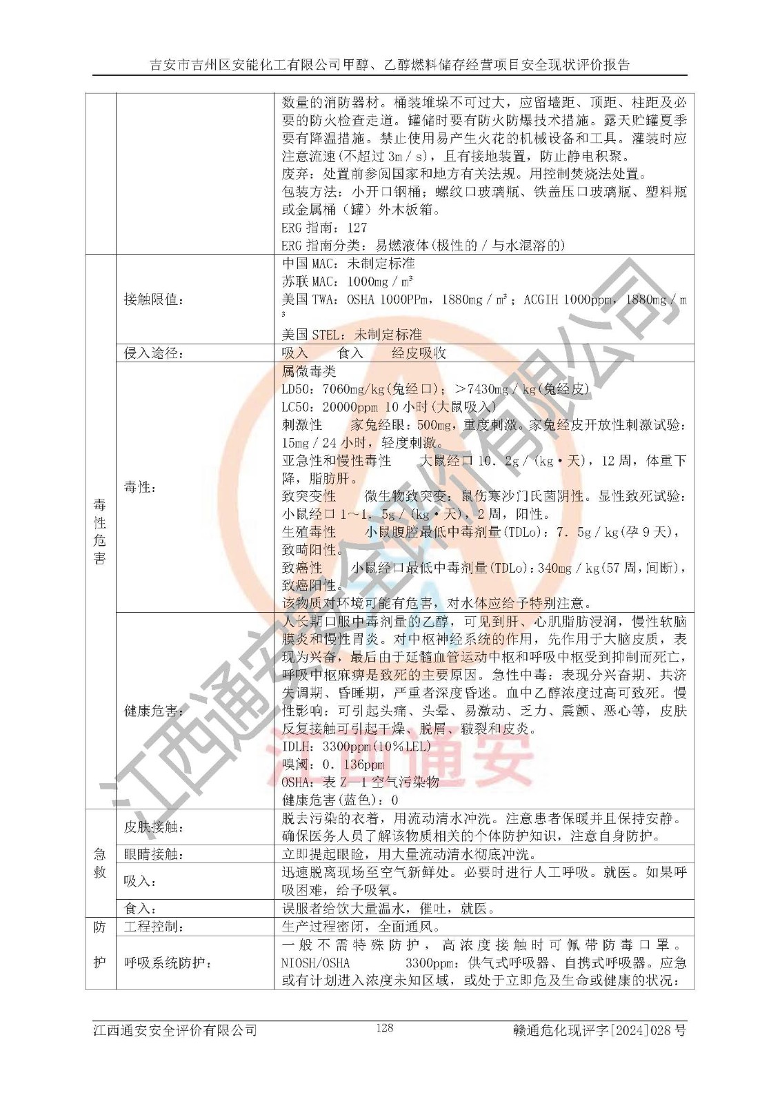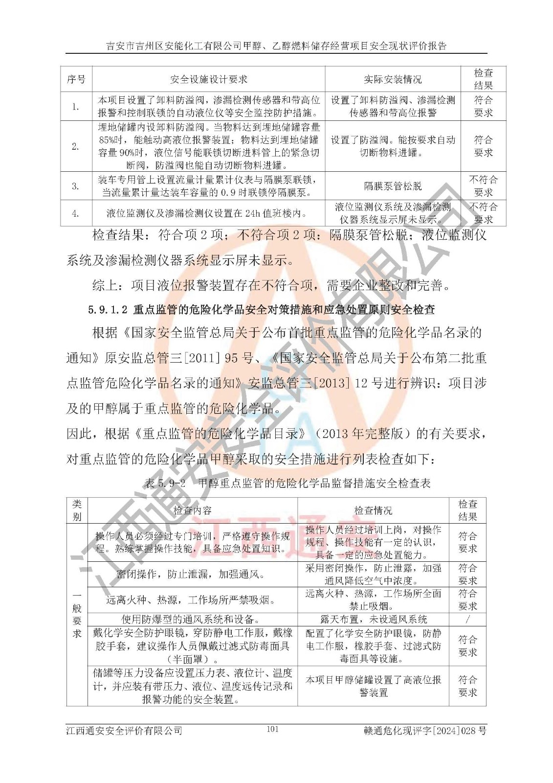 評價結論 | 吉安市吉州區(qū)安能化工有限公司甲醇、乙醇燃料儲存經營項目經營現狀滿足項目危險化學品儲存和經營的要求,安全管理**,安全風險可控,滿足危險化學品經營的安全條件。 | |||