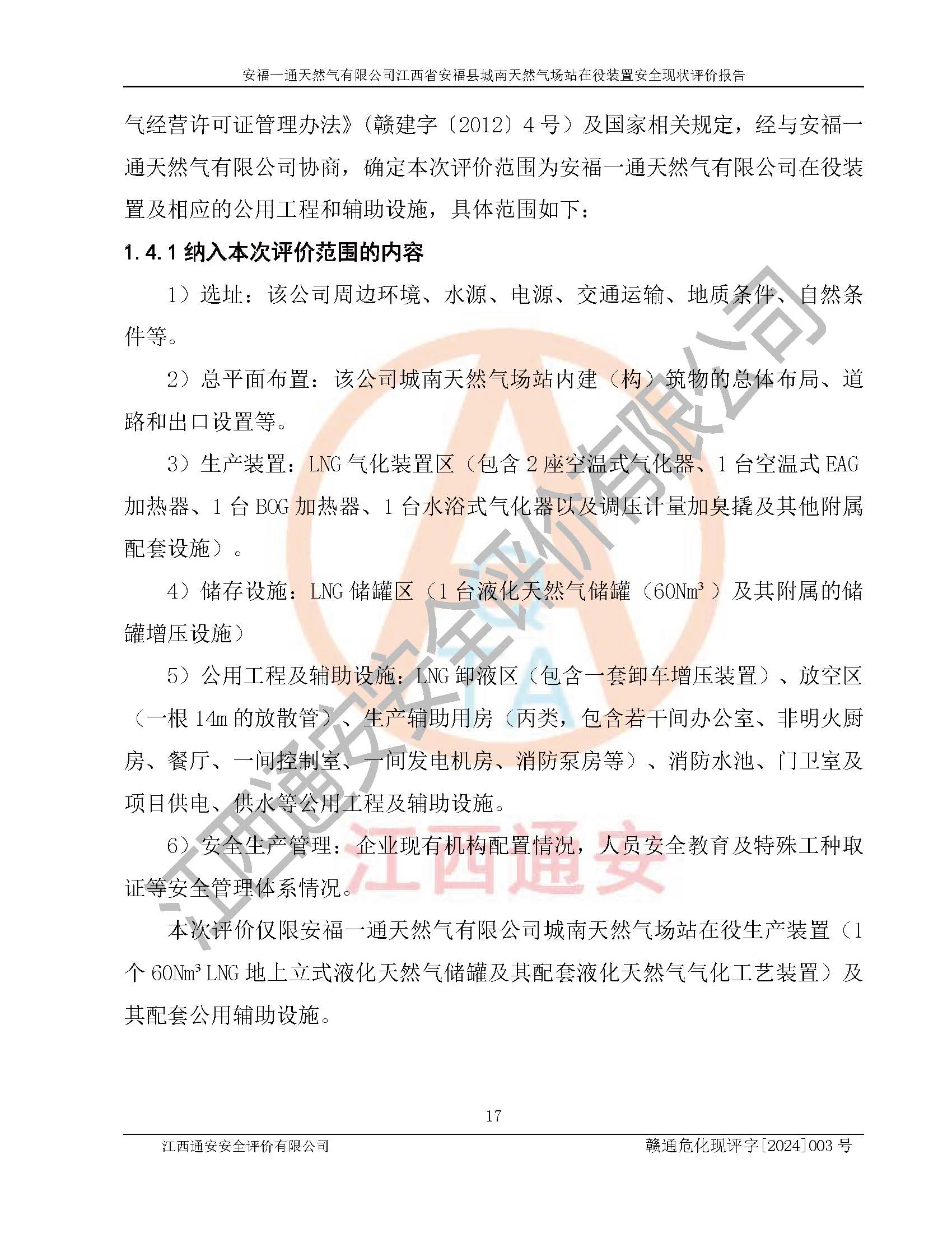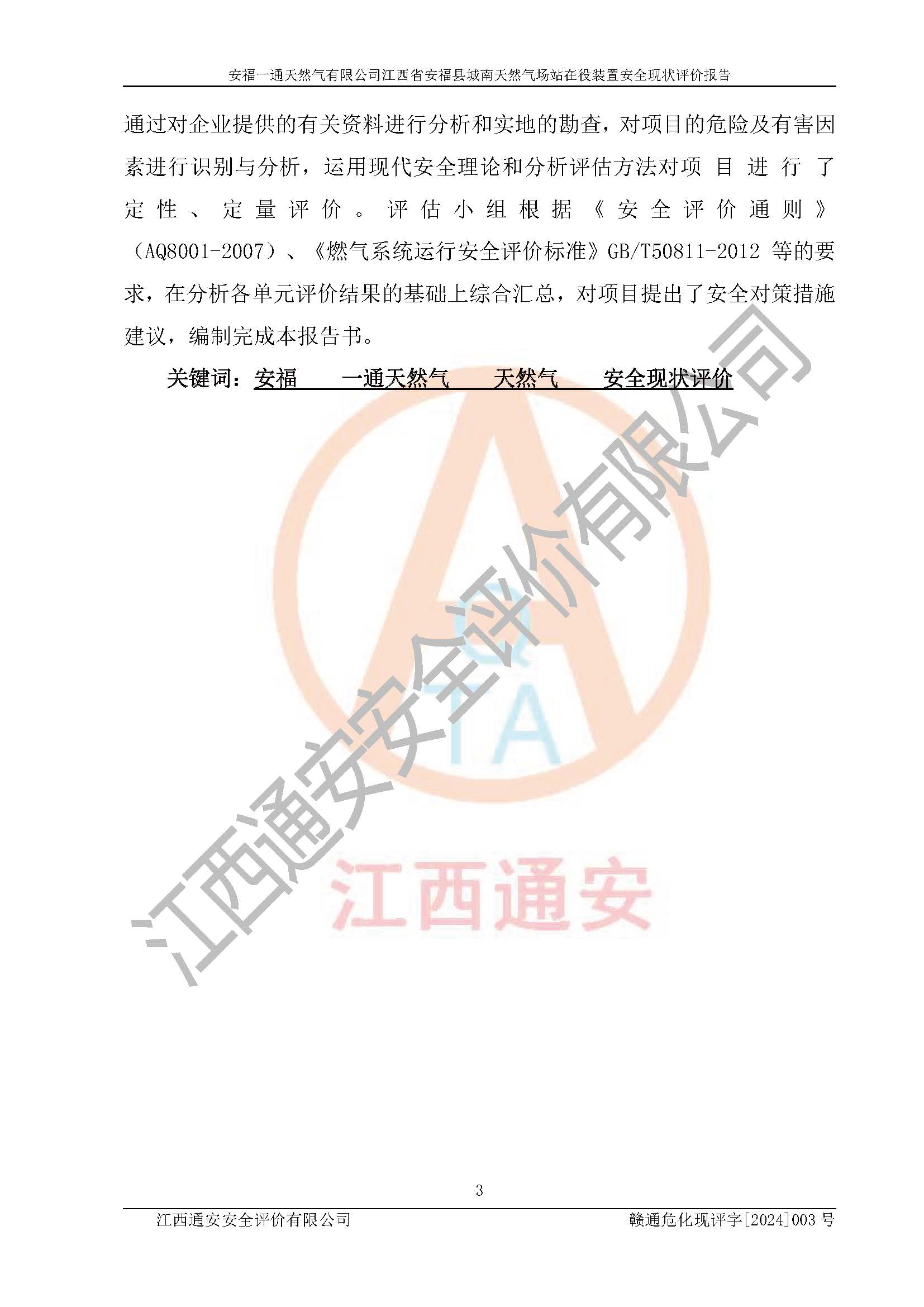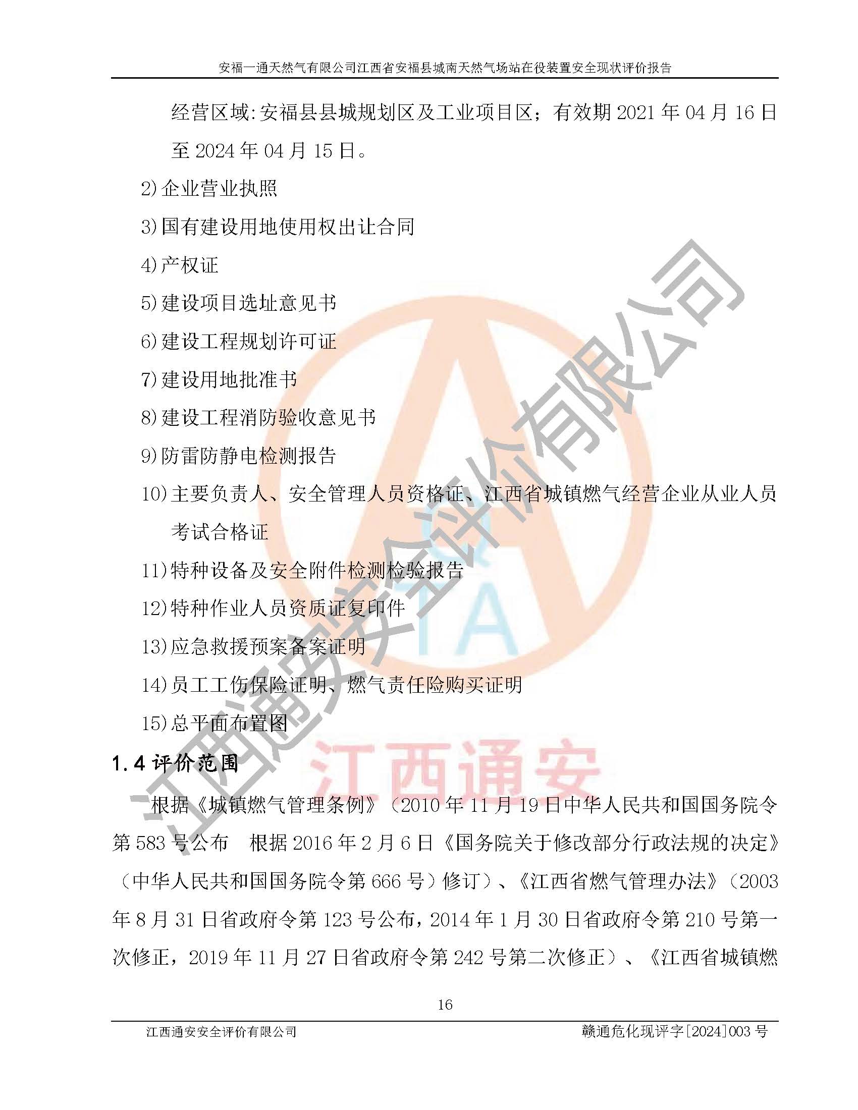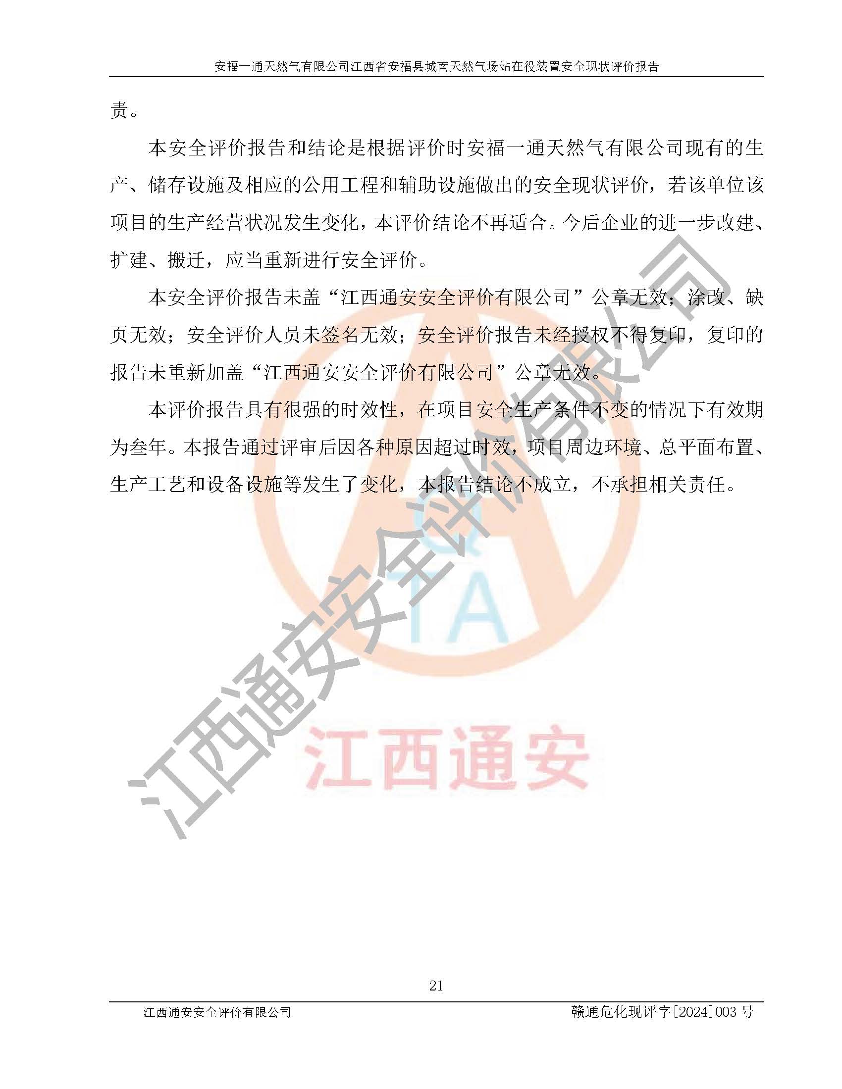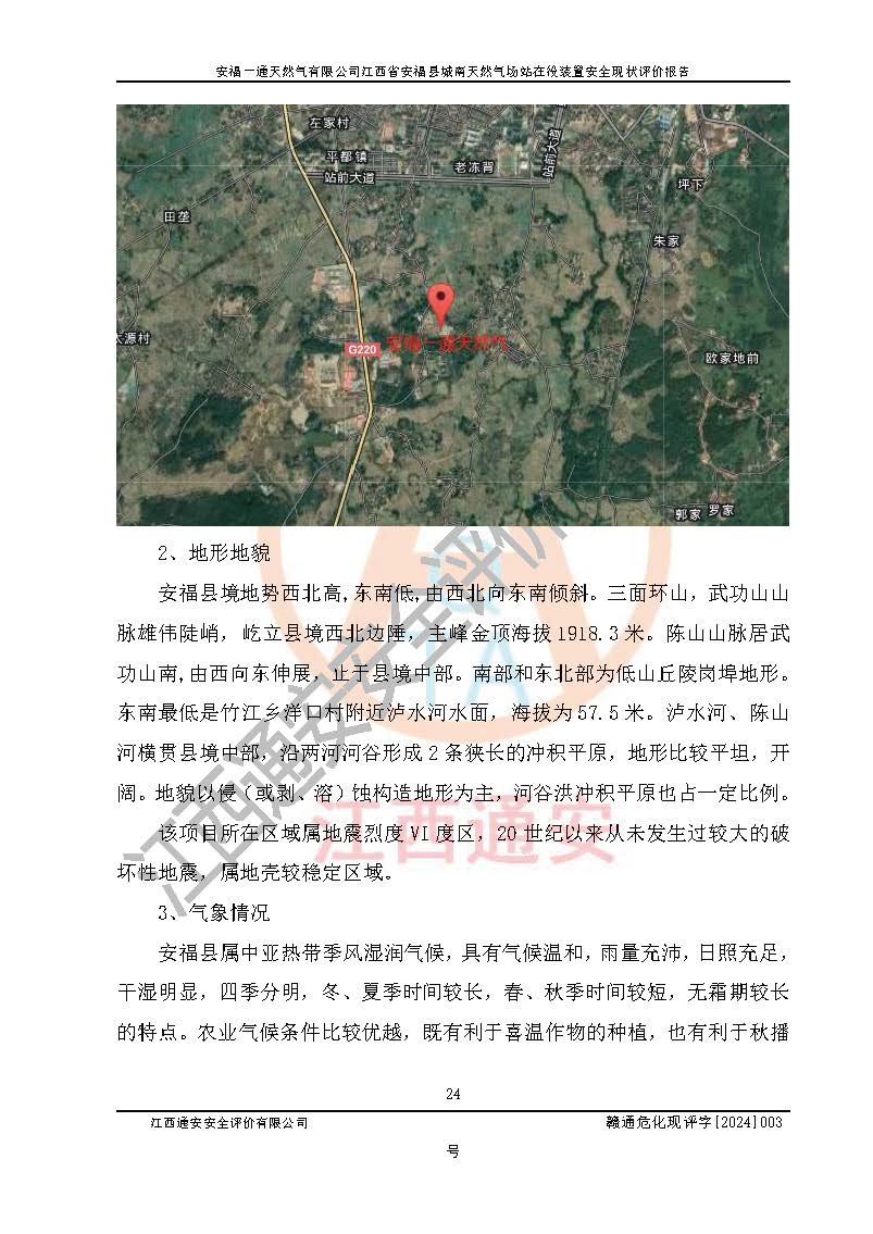 評價報告名稱 | 安福一通天然氣有限公司江西省安??h城南天然氣場站在役裝置安全現(xiàn)狀評價報告 | |||