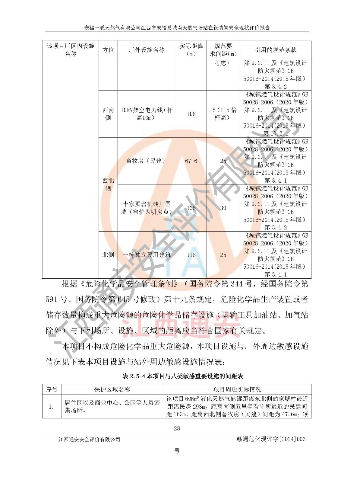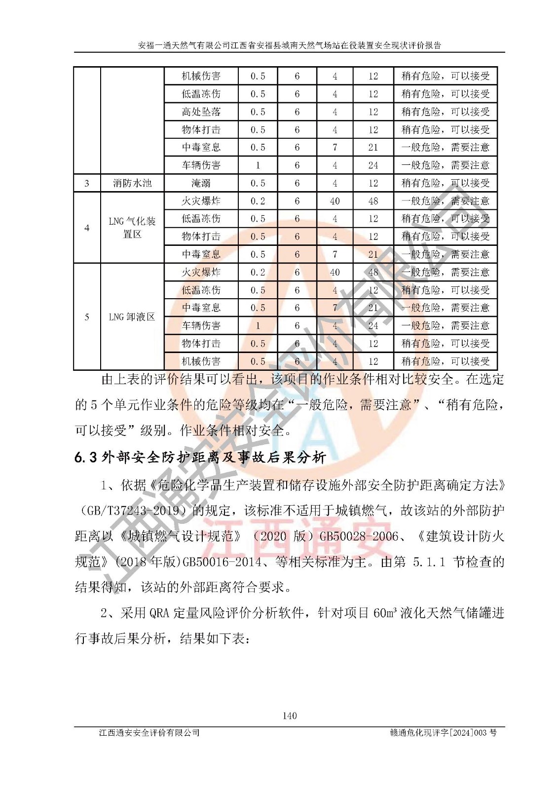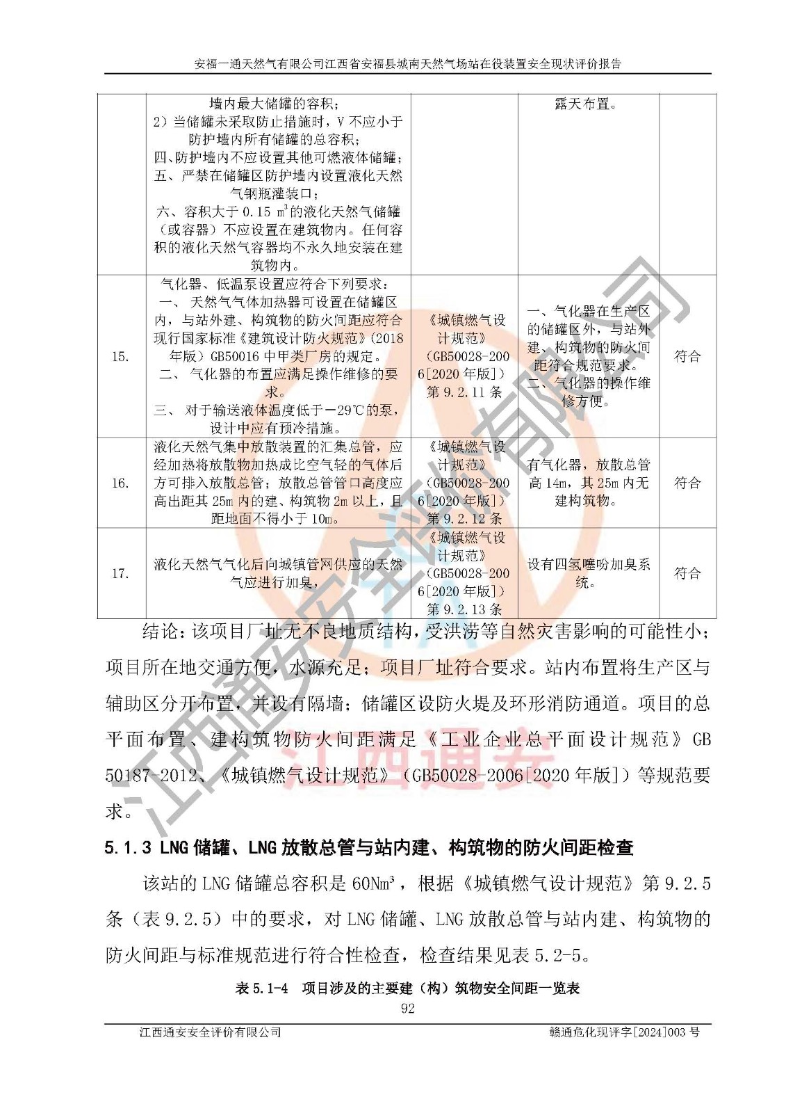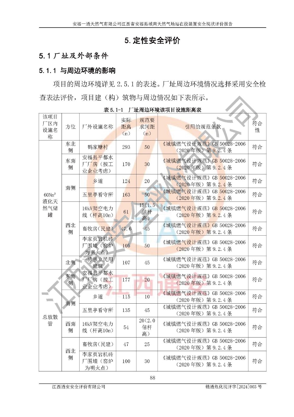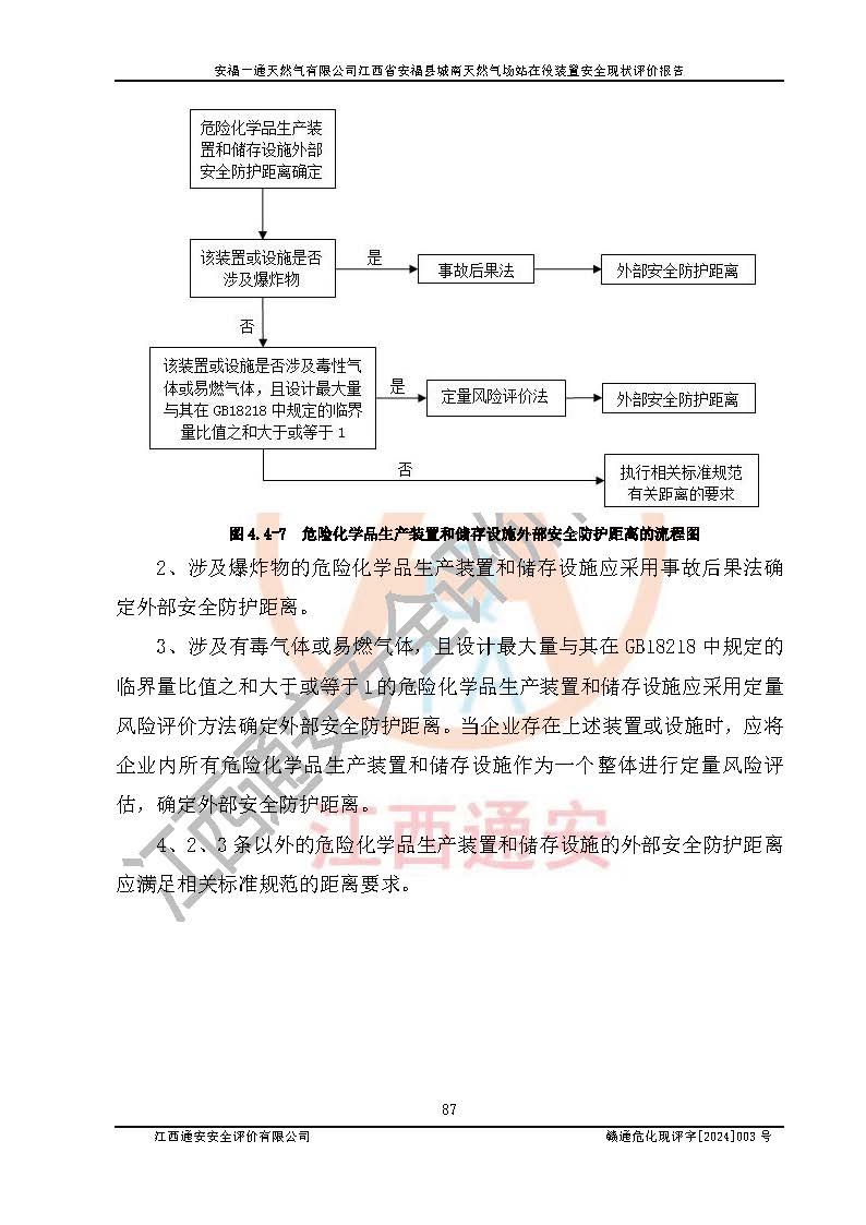 評價結(jié)論 | 安福一通天然氣有限公司在役裝置符安福縣規(guī)劃;總平面布置符合《城鎮(zhèn)燃?xì)庠O(shè)計規(guī)范》GB 50028-2006(2020年版)等標(biāo)準(zhǔn)、規(guī)范的要求;項(xiàng)目采用成熟的生產(chǎn)工藝和設(shè)備,本質(zhì)安全程度較高;同時對生產(chǎn)過程中存在事故危險的設(shè)施和場所采取了一系列的合理可行的防護(hù)措施和科學(xué)的管理,近期通過對存在的安全問題進(jìn)行了整改,使生產(chǎn)過程中的危險有害因素能得到**控制。建設(shè)項(xiàng)目安全設(shè)施符合**現(xiàn)行有關(guān)法律、法規(guī)、標(biāo)準(zhǔn)的要求。 評價結(jié)論:本報告認(rèn)為,安福一通天然氣有限公司在役裝置現(xiàn)場情況與企業(yè)提供的現(xiàn)狀圖紙一致,自動化控制系統(tǒng)運(yùn)行正常,有關(guān)從業(yè)人員資質(zhì)符合《城鎮(zhèn)燃?xì)夤芾項(xiàng)l例》(2010年11月19日中華人民共和國***令第583號公布 根據(jù)2016年2月6日《***關(guān)于修改部分行政法規(guī)的決定》修訂)及《江西省燃?xì)夤芾磙k法》(2003年8月31日江西省人民**令**23號公布 2014年1月30日江西省人民**令第210號**次修正 2019年11月27日江西省人民**令第242號第二次修正)要求,安全設(shè)施及安全管理符合**及有關(guān)部門關(guān)于安全生產(chǎn)法律、法規(guī)、標(biāo)準(zhǔn)的要求,安全風(fēng)險是可以控制的,其風(fēng)險程度是可以接受的,安全現(xiàn)狀符合安全生產(chǎn)條件,能夠滿足安全生產(chǎn)的要求。 | |||