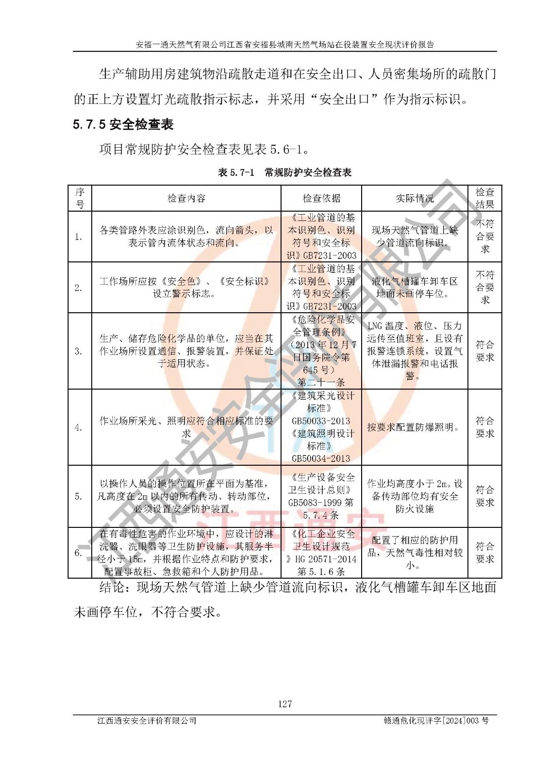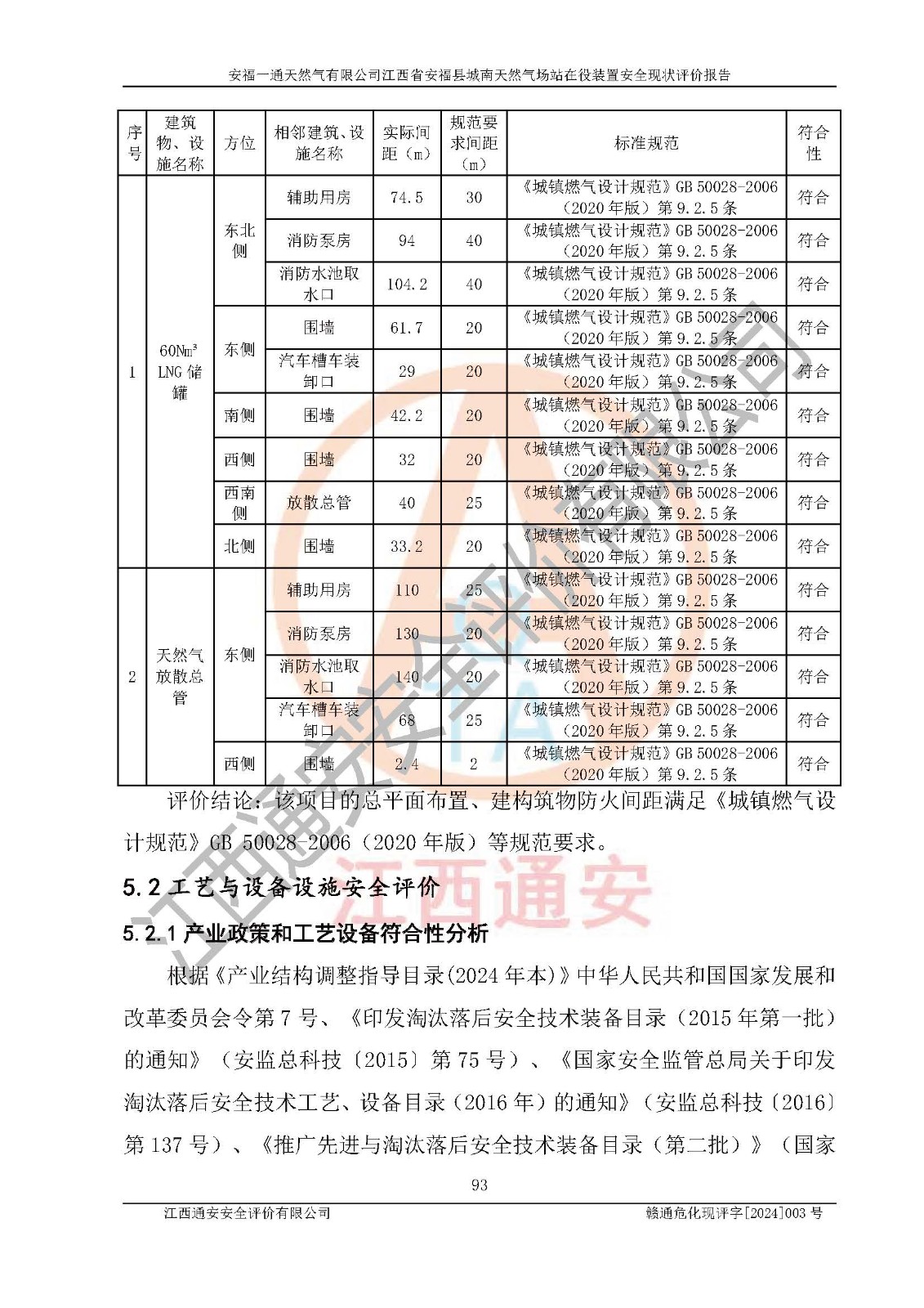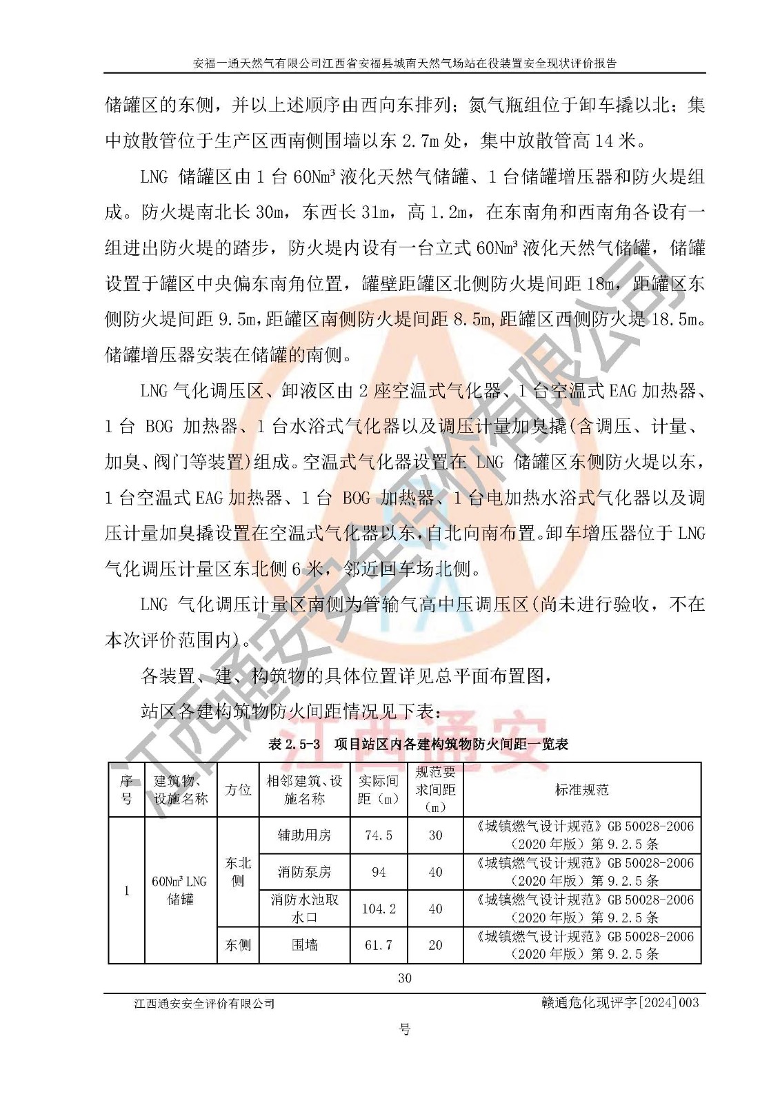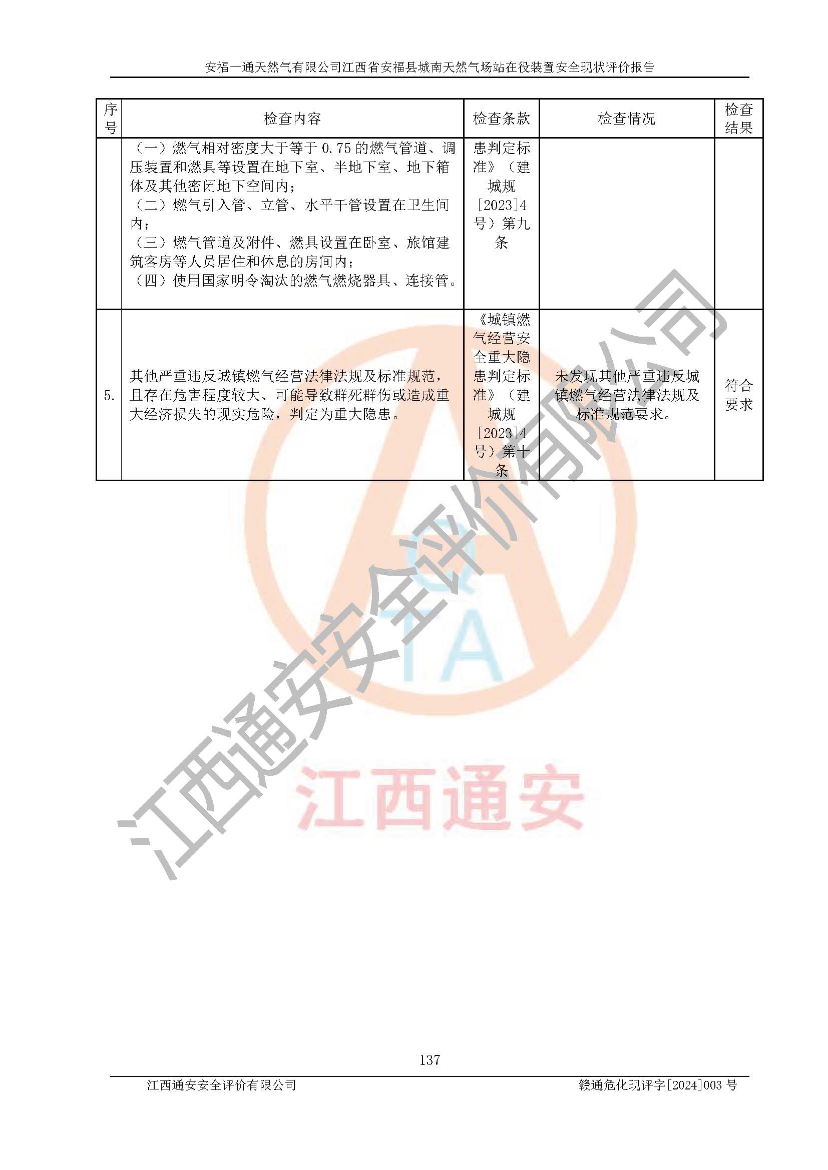 評價結(jié)論 | 安福一通天然氣有限公司在役裝置符安福縣規(guī)劃;總平面布置符合《城鎮(zhèn)燃?xì)庠O(shè)計規(guī)范》GB 50028-2006(2020年版)等標(biāo)準(zhǔn)、規(guī)范的要求;項(xiàng)目采用成熟的生產(chǎn)工藝和設(shè)備,本質(zhì)安全程度較高;同時對生產(chǎn)過程中存在事故危險的設(shè)施和場所采取了一系列的合理可行的防護(hù)措施和科學(xué)的管理,近期通過對存在的安全問題進(jìn)行了整改,使生產(chǎn)過程中的危險有害因素能得到**控制。建設(shè)項(xiàng)目安全設(shè)施符合**現(xiàn)行有關(guān)法律、法規(guī)、標(biāo)準(zhǔn)的要求。 評價結(jié)論:本報告認(rèn)為,安福一通天然氣有限公司在役裝置現(xiàn)場情況與企業(yè)提供的現(xiàn)狀圖紙一致,自動化控制系統(tǒng)運(yùn)行正常,有關(guān)從業(yè)人員資質(zhì)符合《城鎮(zhèn)燃?xì)夤芾項(xiàng)l例》(2010年11月19日中華人民共和國***令第583號公布 根據(jù)2016年2月6日《***關(guān)于修改部分行政法規(guī)的決定》修訂)及《江西省燃?xì)夤芾磙k法》(2003年8月31日江西省人民**令**23號公布 2014年1月30日江西省人民**令第210號**次修正 2019年11月27日江西省人民**令第242號第二次修正)要求,安全設(shè)施及安全管理符合**及有關(guān)部門關(guān)于安全生產(chǎn)法律、法規(guī)、標(biāo)準(zhǔn)的要求,安全風(fēng)險是可以控制的,其風(fēng)險程度是可以接受的,安全現(xiàn)狀符合安全生產(chǎn)條件,能夠滿足安全生產(chǎn)的要求。 | |||