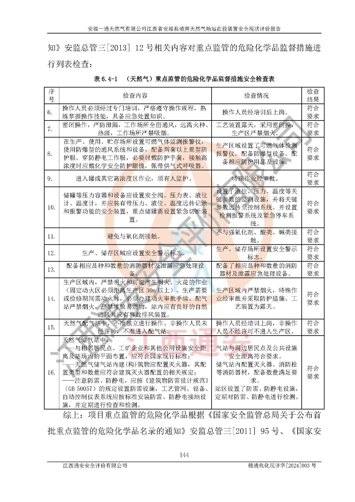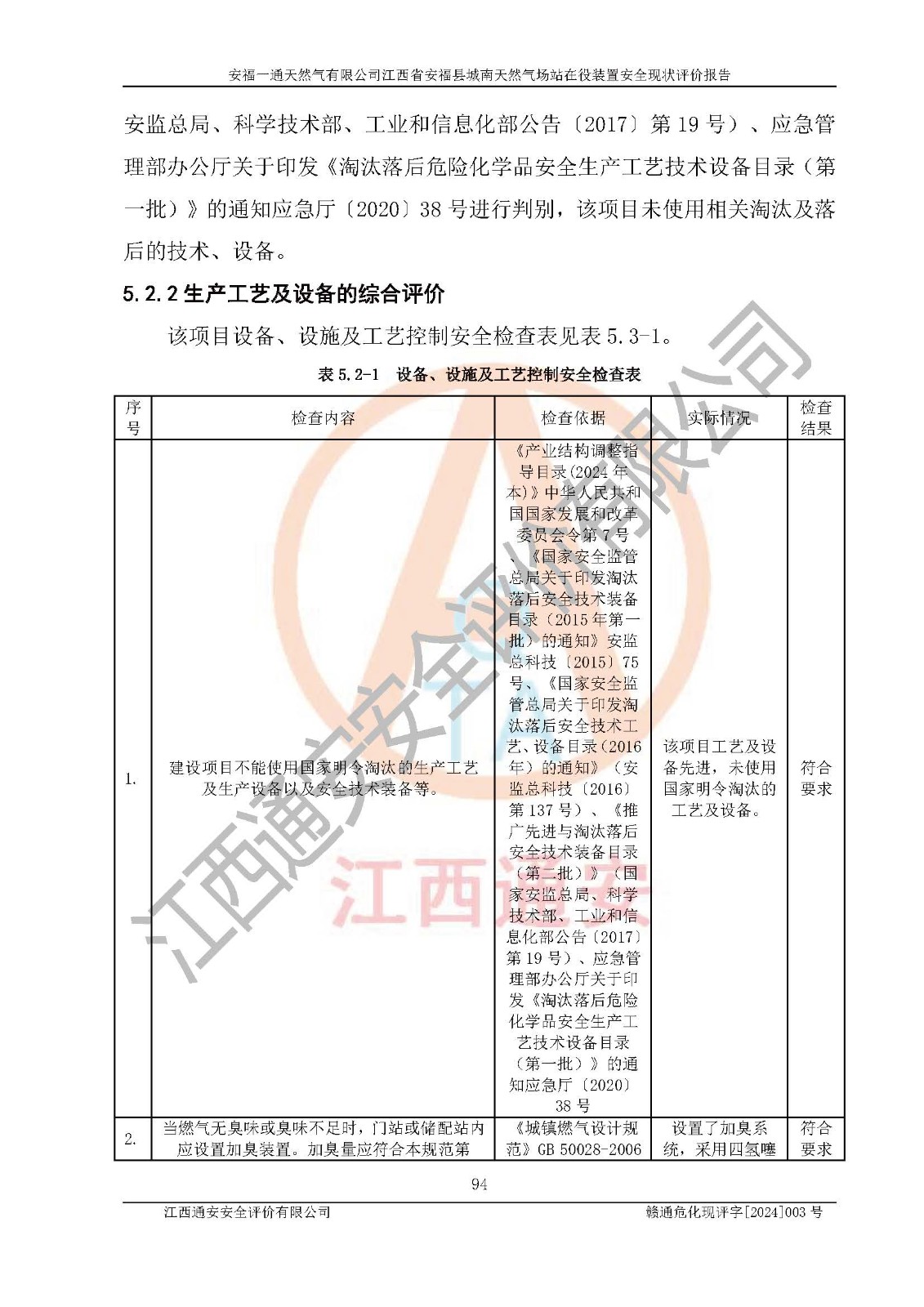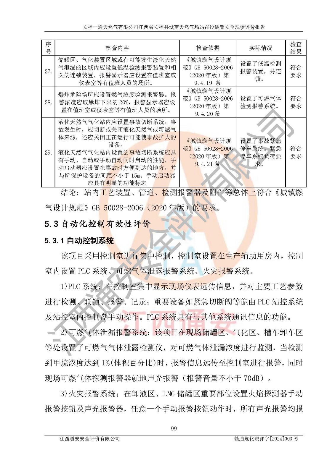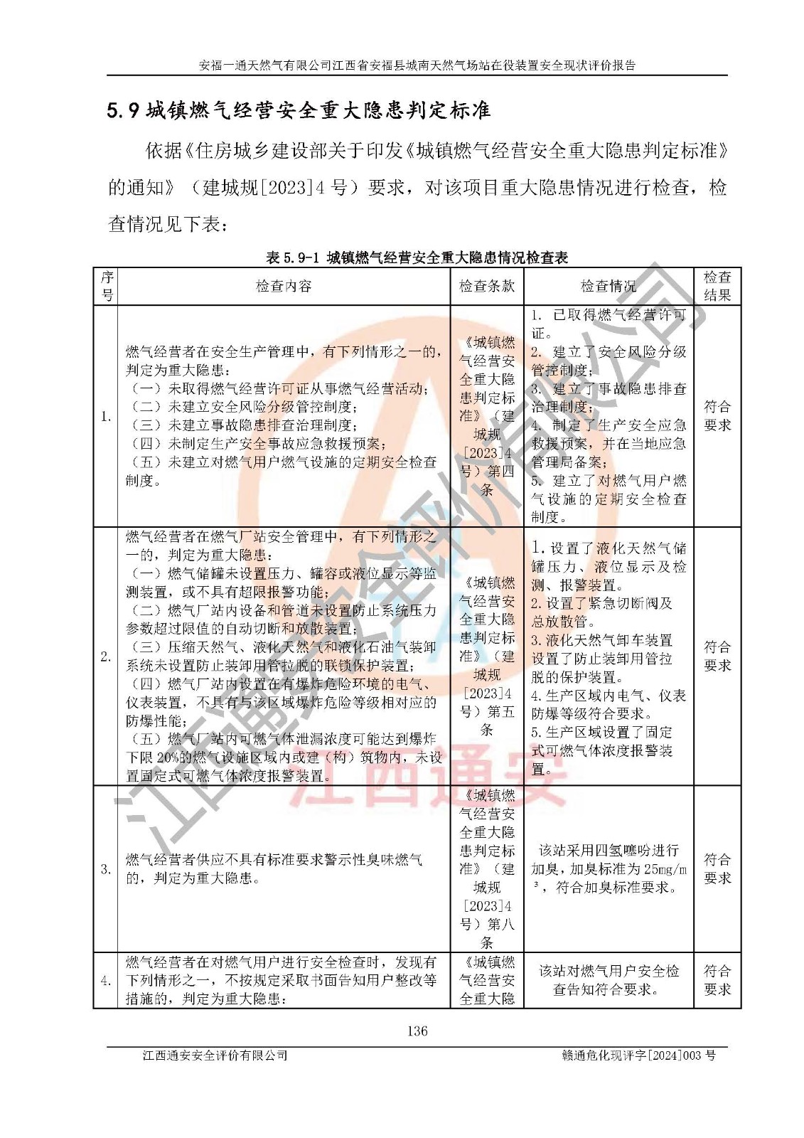 評價結(jié)論 | 安福一通天然氣有限公司在役裝置符安福縣規(guī)劃;總平面布置符合《城鎮(zhèn)燃?xì)庠O(shè)計規(guī)范》GB 50028-2006(2020年版)等標(biāo)準(zhǔn)、規(guī)范的要求;項(xiàng)目采用成熟的生產(chǎn)工藝和設(shè)備,本質(zhì)安全程度較高;同時對生產(chǎn)過程中存在事故危險的設(shè)施和場所采取了一系列的合理可行的防護(hù)措施和科學(xué)的管理,近期通過對存在的安全問題進(jìn)行了整改,使生產(chǎn)過程中的危險有害因素能得到**控制。建設(shè)項(xiàng)目安全設(shè)施符合**現(xiàn)行有關(guān)法律、法規(guī)、標(biāo)準(zhǔn)的要求。 評價結(jié)論:本報告認(rèn)為,安福一通天然氣有限公司在役裝置現(xiàn)場情況與企業(yè)提供的現(xiàn)狀圖紙一致,自動化控制系統(tǒng)運(yùn)行正常,有關(guān)從業(yè)人員資質(zhì)符合《城鎮(zhèn)燃?xì)夤芾項(xiàng)l例》(2010年11月19日中華人民共和國***令第583號公布 根據(jù)2016年2月6日《***關(guān)于修改部分行政法規(guī)的決定》修訂)及《江西省燃?xì)夤芾磙k法》(2003年8月31日江西省人民**令**23號公布 2014年1月30日江西省人民**令第210號**次修正 2019年11月27日江西省人民**令第242號第二次修正)要求,安全設(shè)施及安全管理符合**及有關(guān)部門關(guān)于安全生產(chǎn)法律、法規(guī)、標(biāo)準(zhǔn)的要求,安全風(fēng)險是可以控制的,其風(fēng)險程度是可以接受的,安全現(xiàn)狀符合安全生產(chǎn)條件,能夠滿足安全生產(chǎn)的要求。 | |||