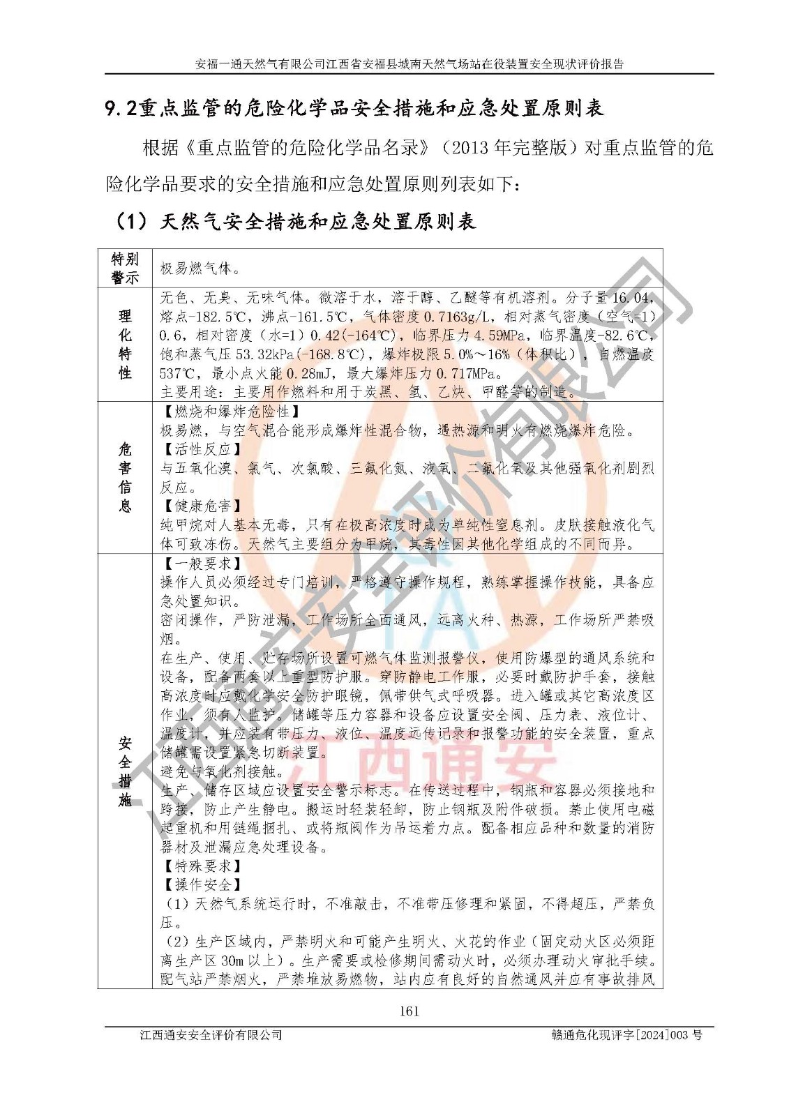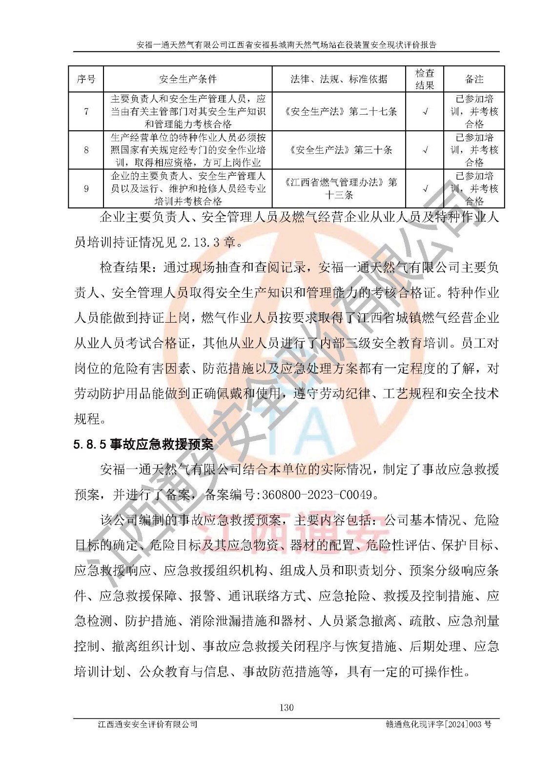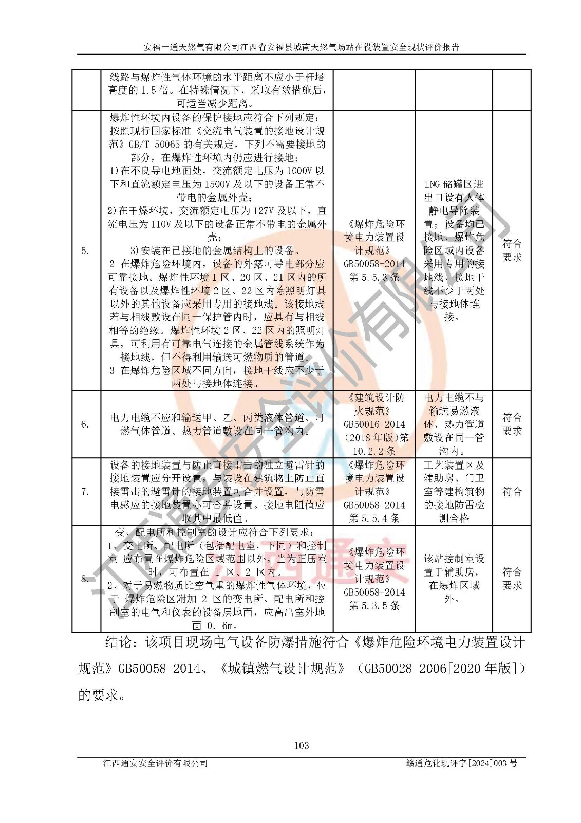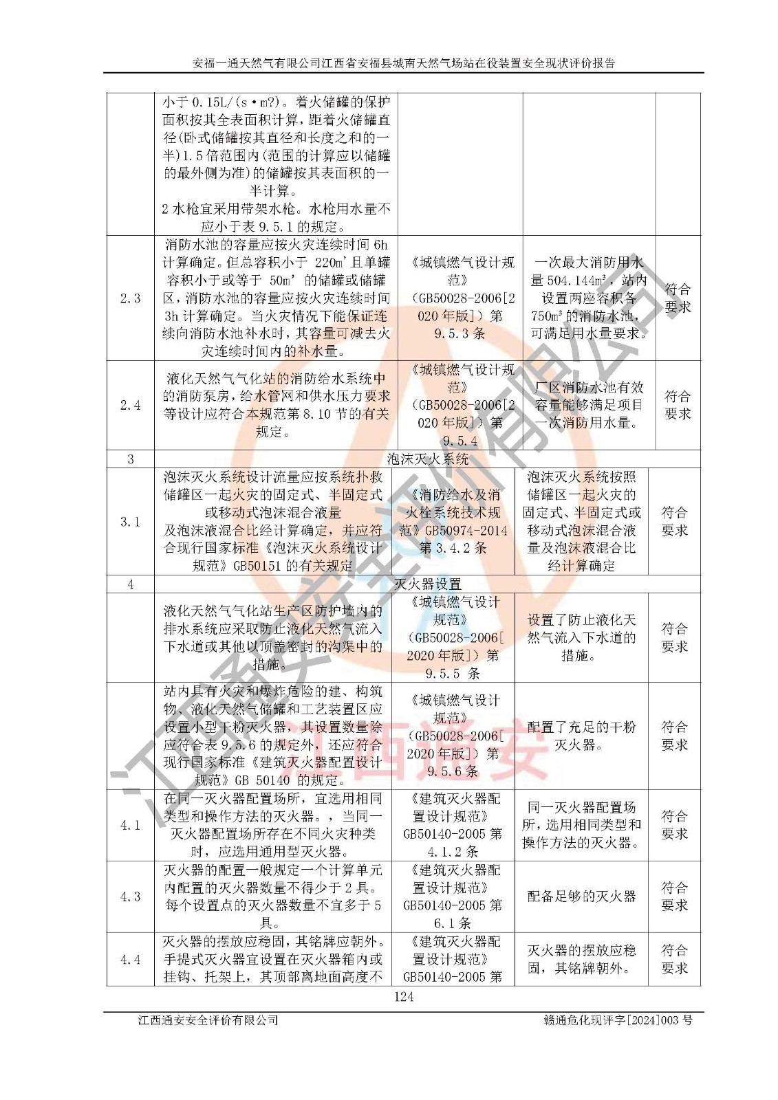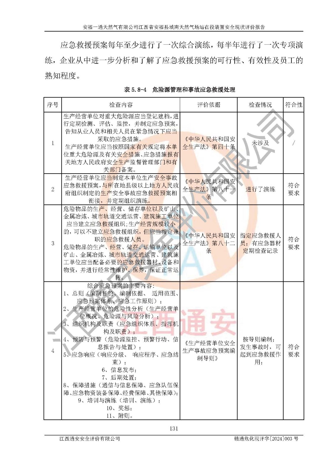 評價結(jié)論 | 安福一通天然氣有限公司在役裝置符安福縣規(guī)劃;總平面布置符合《城鎮(zhèn)燃?xì)庠O(shè)計規(guī)范》GB 50028-2006(2020年版)等標(biāo)準(zhǔn)、規(guī)范的要求;項(xiàng)目采用成熟的生產(chǎn)工藝和設(shè)備,本質(zhì)安全程度較高;同時對生產(chǎn)過程中存在事故危險的設(shè)施和場所采取了一系列的合理可行的防護(hù)措施和科學(xué)的管理,近期通過對存在的安全問題進(jìn)行了整改,使生產(chǎn)過程中的危險有害因素能得到**控制。建設(shè)項(xiàng)目安全設(shè)施符合**現(xiàn)行有關(guān)法律、法規(guī)、標(biāo)準(zhǔn)的要求。 評價結(jié)論:本報告認(rèn)為,安福一通天然氣有限公司在役裝置現(xiàn)場情況與企業(yè)提供的現(xiàn)狀圖紙一致,自動化控制系統(tǒng)運(yùn)行正常,有關(guān)從業(yè)人員資質(zhì)符合《城鎮(zhèn)燃?xì)夤芾項(xiàng)l例》(2010年11月19日中華人民共和國***令第583號公布 根據(jù)2016年2月6日《***關(guān)于修改部分行政法規(guī)的決定》修訂)及《江西省燃?xì)夤芾磙k法》(2003年8月31日江西省人民**令**23號公布 2014年1月30日江西省人民**令第210號**次修正 2019年11月27日江西省人民**令第242號第二次修正)要求,安全設(shè)施及安全管理符合**及有關(guān)部門關(guān)于安全生產(chǎn)法律、法規(guī)、標(biāo)準(zhǔn)的要求,安全風(fēng)險是可以控制的,其風(fēng)險程度是可以接受的,安全現(xiàn)狀符合安全生產(chǎn)條件,能夠滿足安全生產(chǎn)的要求。 | |||