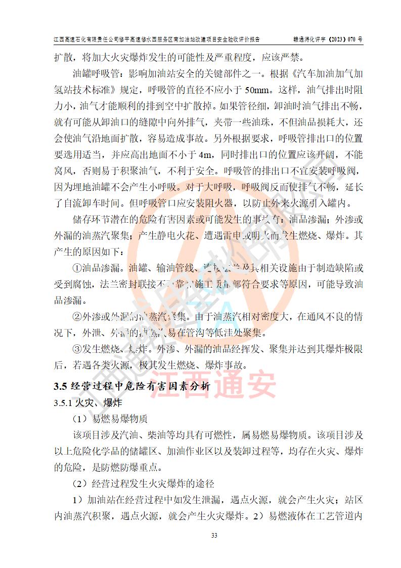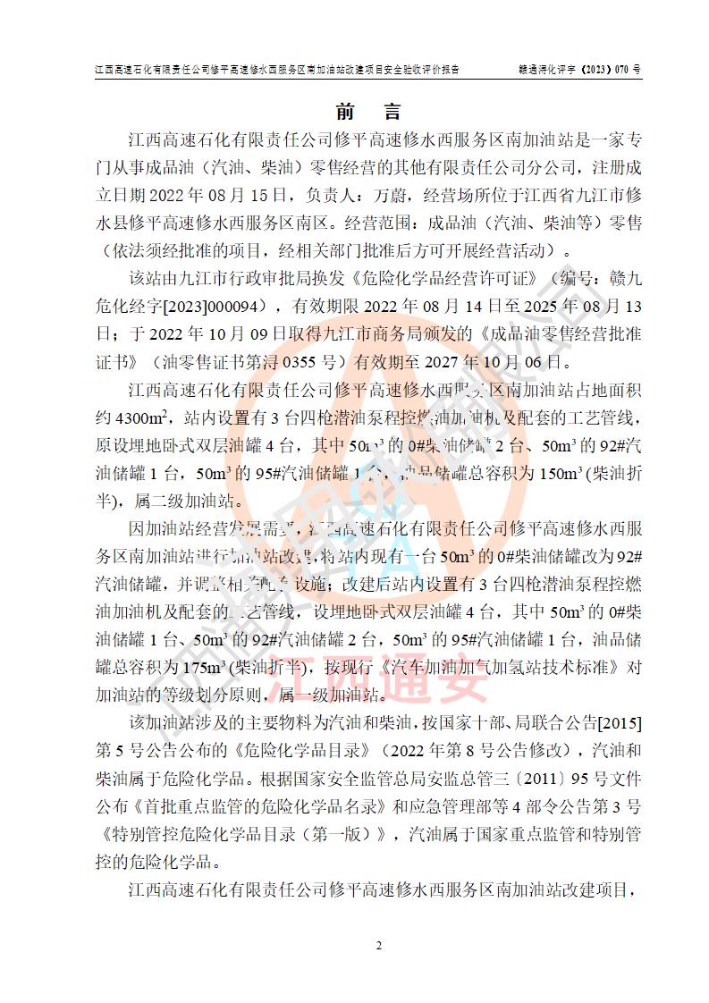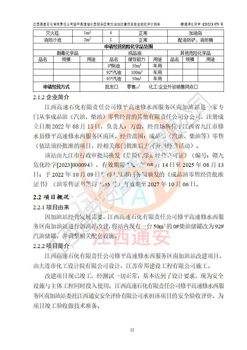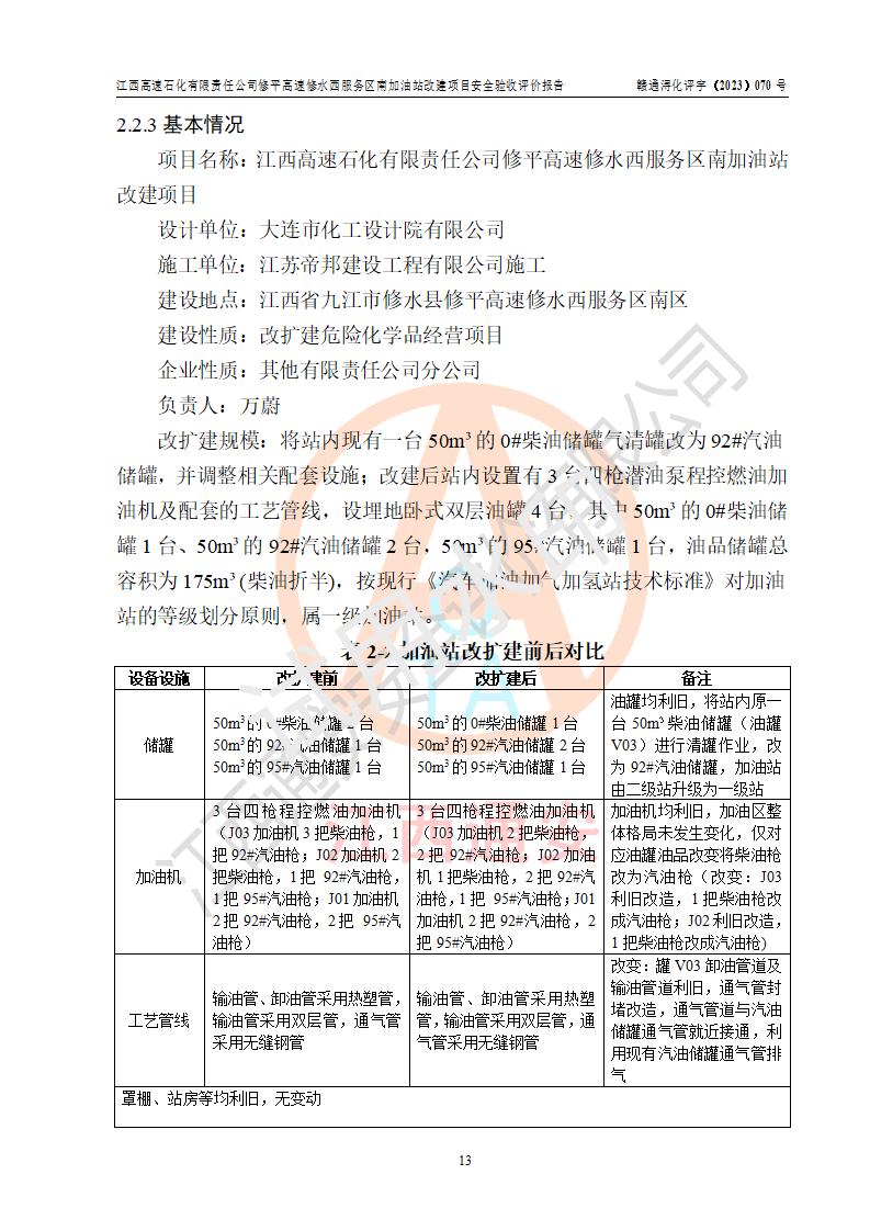 項目簡介 | 江西高速石化有限責任公司修平高速修水西服務(wù)區(qū)南加油站是一家專門從事成品油(汽油、柴油)零售經(jīng)營的其他有限責任公司分公司,注冊成立日期2022年08月15日,負責人:萬蔚,經(jīng)營場所位于江西省九江市修水縣修平高速修水西服務(wù)區(qū)南區(qū)。經(jīng)營范圍:成品油(汽油、柴油等)零售(依法須經(jīng)批準的項目,經(jīng)相關(guān)部門批準后方可開展經(jīng)營活動)。 該站由九江市行政審批局換發(fā)《危險化學(xué)品經(jīng)營許可證》(編號:贛九?;?jīng)字[2023]000094),**期限2022年08月14日至2025年08月13日;于2022年10月09日取得九江市商務(wù)局頒發(fā)的《成品油零售經(jīng)營批準證書》(油零售證書第潯0355號)**期至2027年10月06日。 江西高速石化有限責任公司修平高速修水西服務(wù)區(qū)南加油站占地面積約4300m2,站內(nèi)設(shè)置有3臺四槍潛油泵程控燃油加油機及配套的工藝管線,原設(shè)埋地臥式雙層油罐4臺,其中50m3的0#柴油儲罐2臺、50m3的92#汽油儲罐1臺,50m3的95#汽油儲罐1臺,油品儲罐總?cè)莘e為150m3(柴油折半),屬二級加油站。 因加油站經(jīng)營發(fā)展需要,江西高速石化有限責任公司修平高速修水西服務(wù)區(qū)南加油站進行加油站改建,將站內(nèi)現(xiàn)有一臺50m3的0#柴油儲罐改為92#汽油儲罐,并調(diào)整相關(guān)配套設(shè)施;改建后站內(nèi)設(shè)置有3臺四槍潛油泵程控燃油加油機及配套的工藝管線,設(shè)埋地臥式雙層油罐4臺,其中50m3的0#柴油儲罐1臺、50m3的92#汽油儲罐2臺,50m3的95#汽油儲罐1臺,油品儲罐總?cè)莘e為175m3(柴油折半),按現(xiàn)行《汽車加油加氣加氫站技術(shù)標準》對加油站的等級劃分原則,屬**加油站。 | |||