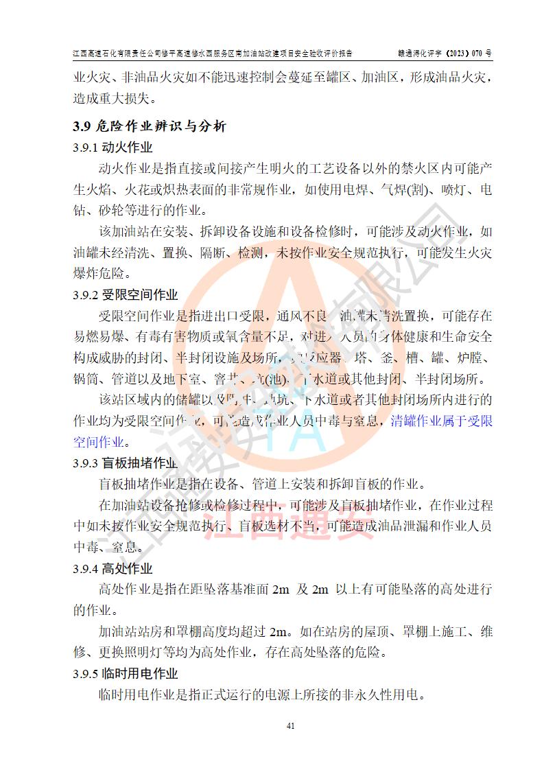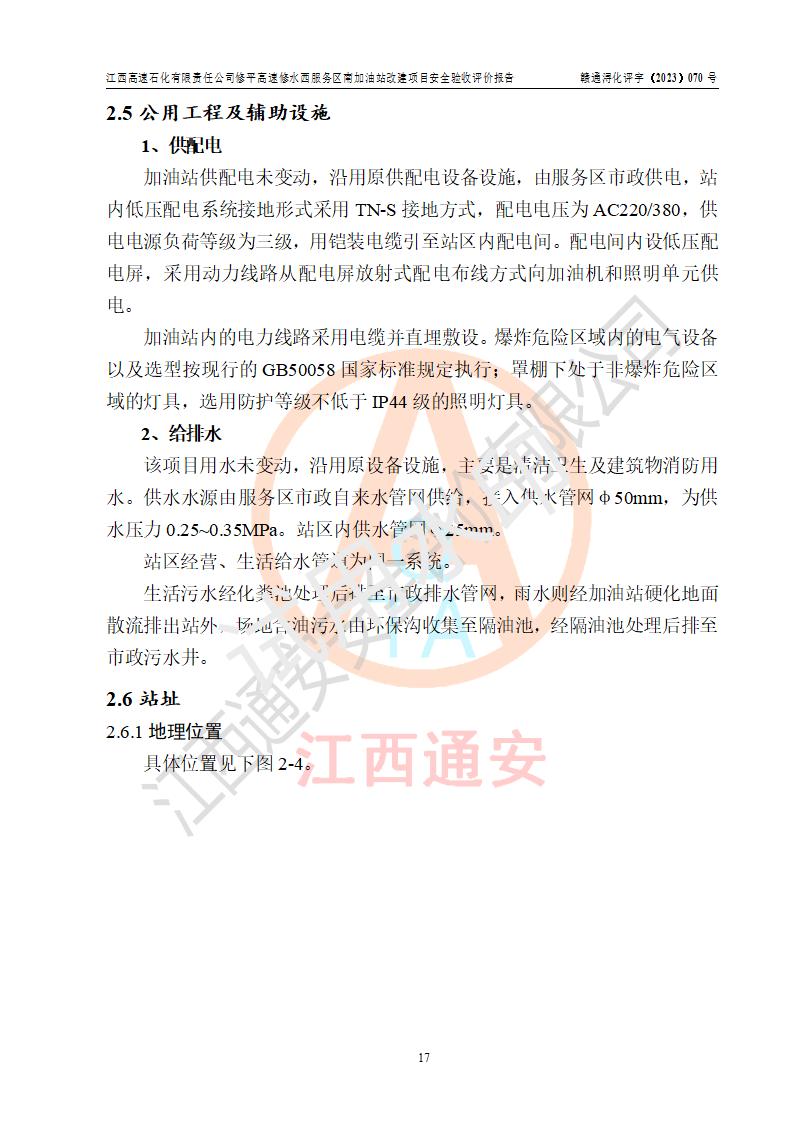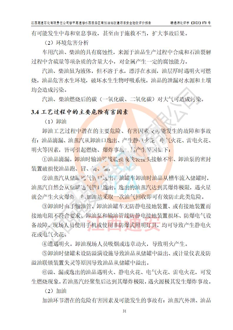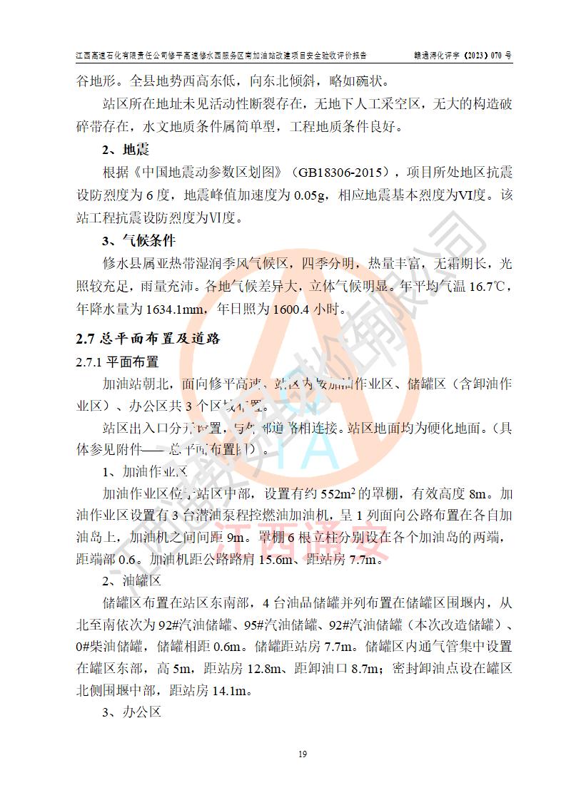 項目簡介 | 江西高速石化有限責任公司修平高速修水西服務(wù)區(qū)南加油站是一家專門從事成品油(汽油、柴油)零售經(jīng)營的其他有限責任公司分公司,注冊成立日期2022年08月15日,負責人:萬蔚,經(jīng)營場所位于江西省九江市修水縣修平高速修水西服務(wù)區(qū)南區(qū)。經(jīng)營范圍:成品油(汽油、柴油等)零售(依法須經(jīng)批準的項目,經(jīng)相關(guān)部門批準后方可開展經(jīng)營活動)。 該站由九江市行政審批局換發(fā)《危險化學(xué)品經(jīng)營許可證》(編號:贛九?;?jīng)字[2023]000094),**期限2022年08月14日至2025年08月13日;于2022年10月09日取得九江市商務(wù)局頒發(fā)的《成品油零售經(jīng)營批準證書》(油零售證書第潯0355號)**期至2027年10月06日。 江西高速石化有限責任公司修平高速修水西服務(wù)區(qū)南加油站占地面積約4300m2,站內(nèi)設(shè)置有3臺四槍潛油泵程控燃油加油機及配套的工藝管線,原設(shè)埋地臥式雙層油罐4臺,其中50m3的0#柴油儲罐2臺、50m3的92#汽油儲罐1臺,50m3的95#汽油儲罐1臺,油品儲罐總?cè)莘e為150m3(柴油折半),屬二級加油站。 因加油站經(jīng)營發(fā)展需要,江西高速石化有限責任公司修平高速修水西服務(wù)區(qū)南加油站進行加油站改建,將站內(nèi)現(xiàn)有一臺50m3的0#柴油儲罐改為92#汽油儲罐,并調(diào)整相關(guān)配套設(shè)施;改建后站內(nèi)設(shè)置有3臺四槍潛油泵程控燃油加油機及配套的工藝管線,設(shè)埋地臥式雙層油罐4臺,其中50m3的0#柴油儲罐1臺、50m3的92#汽油儲罐2臺,50m3的95#汽油儲罐1臺,油品儲罐總?cè)莘e為175m3(柴油折半),按現(xiàn)行《汽車加油加氣加氫站技術(shù)標準》對加油站的等級劃分原則,屬**加油站。 | |||