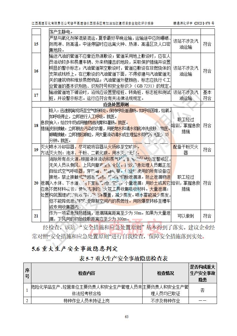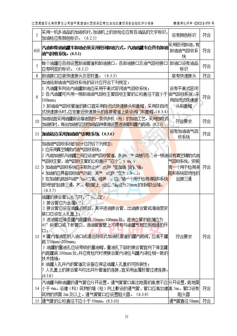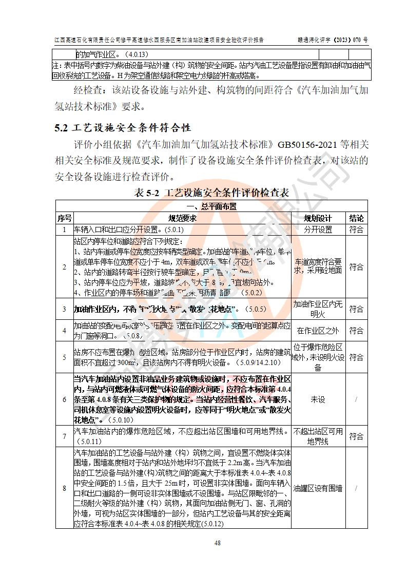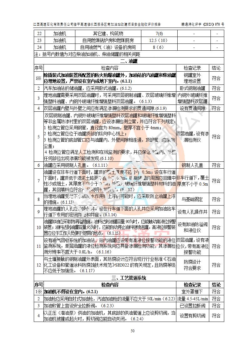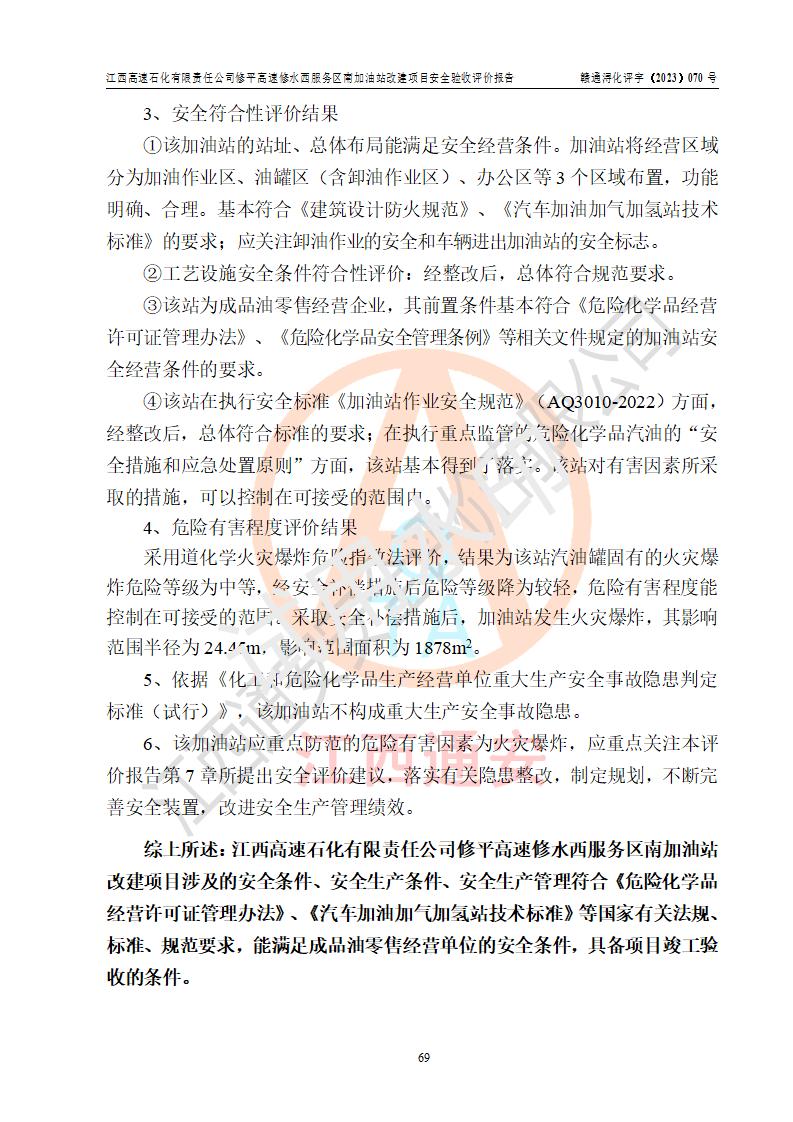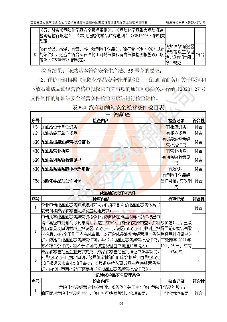 評價結(jié)論 | 江西高速石化有限責任公司修平高速修水西服務(wù)區(qū)南加油站涉及的安全條件、安全經(jīng)營條件、安全生產(chǎn)管理符合《危險化學(xué)品經(jīng)營許可證管理辦法》、《汽車加油加氣加氫站技術(shù)標準》等**有關(guān)法規(guī)、標準、規(guī)范要求,能滿足危險化學(xué)品經(jīng)營安全條件。 | |||