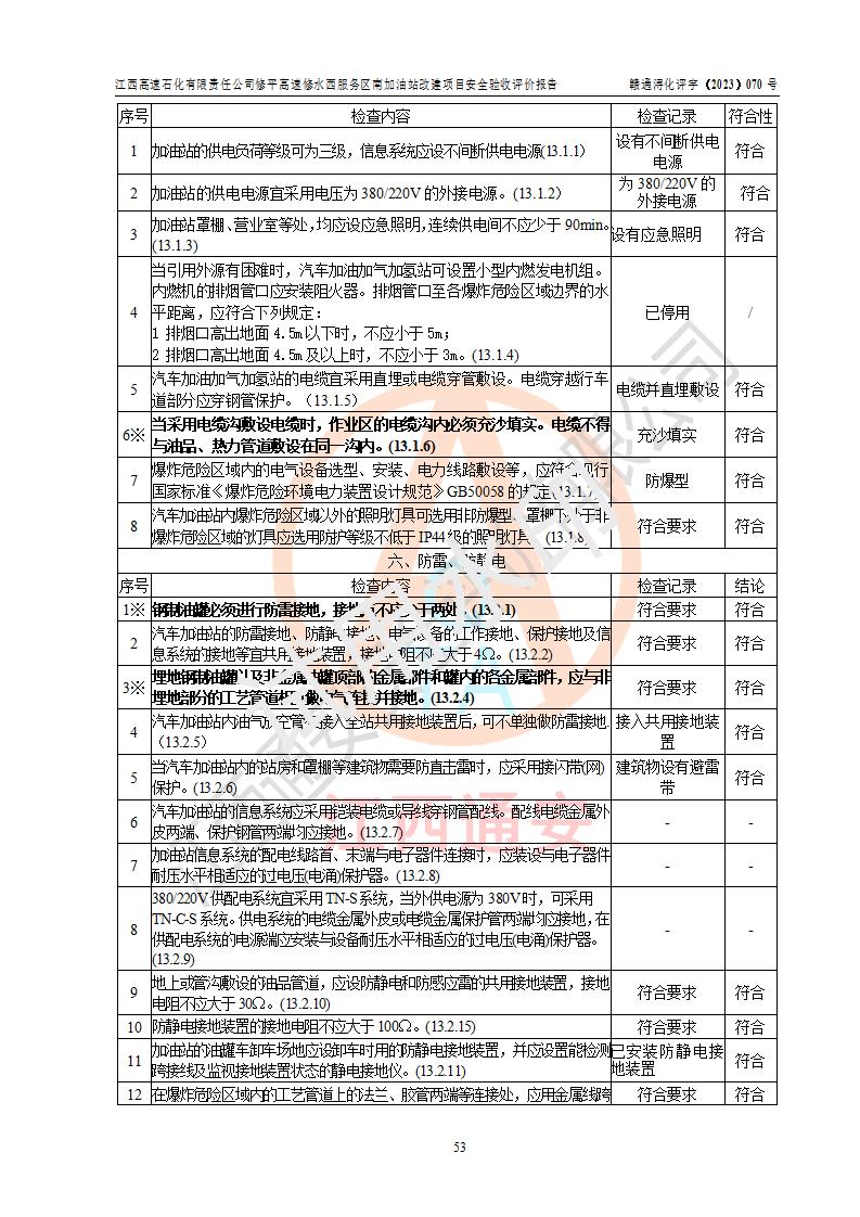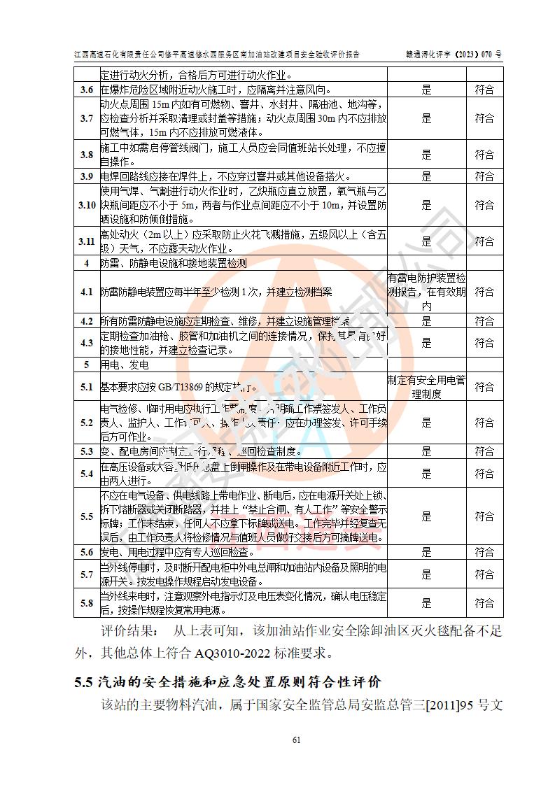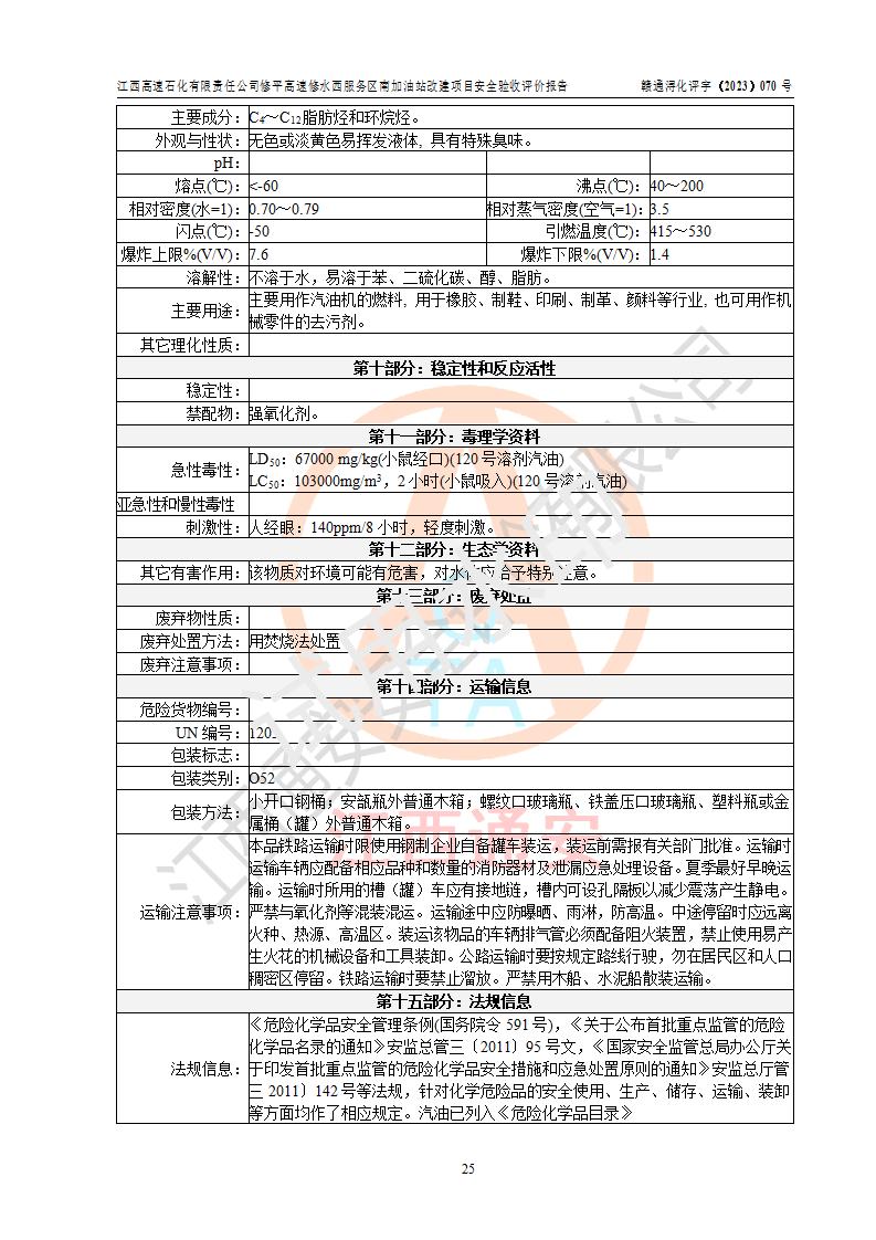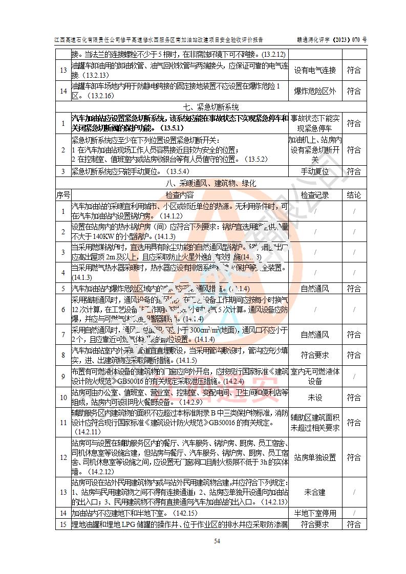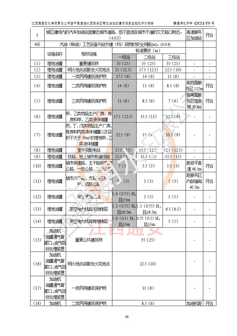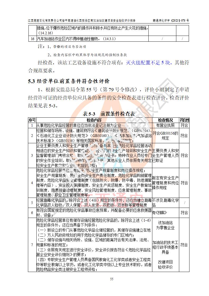 評價結(jié)論 | 江西高速石化有限責任公司修平高速修水西服務(wù)區(qū)南加油站涉及的安全條件、安全經(jīng)營條件、安全生產(chǎn)管理符合《危險化學(xué)品經(jīng)營許可證管理辦法》、《汽車加油加氣加氫站技術(shù)標準》等**有關(guān)法規(guī)、標準、規(guī)范要求,能滿足危險化學(xué)品經(jīng)營安全條件。 | |||