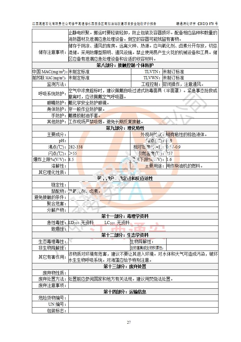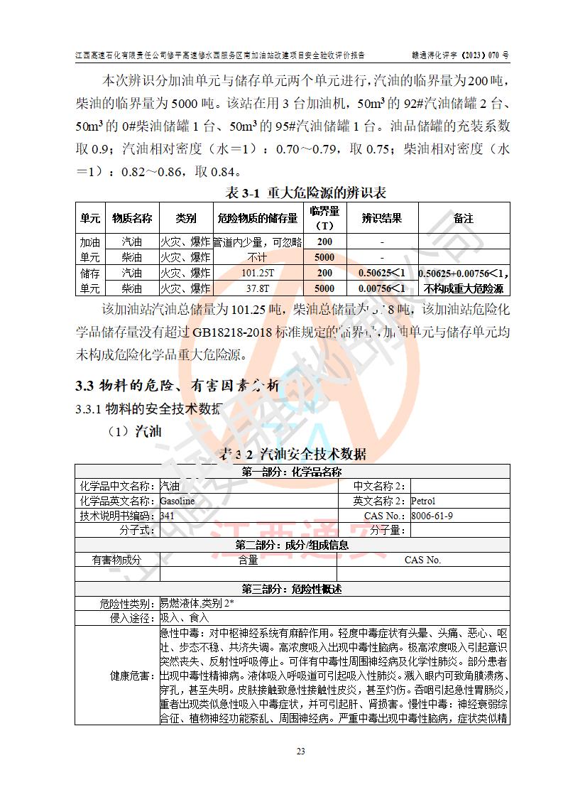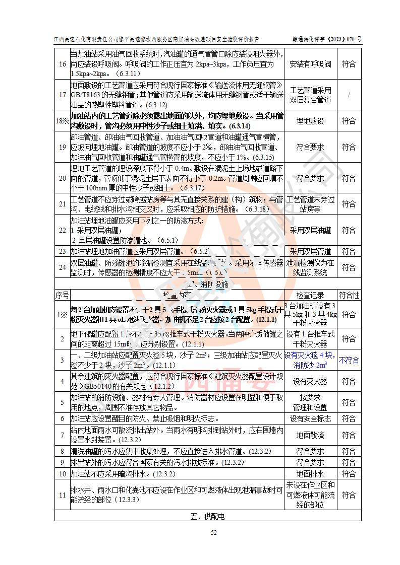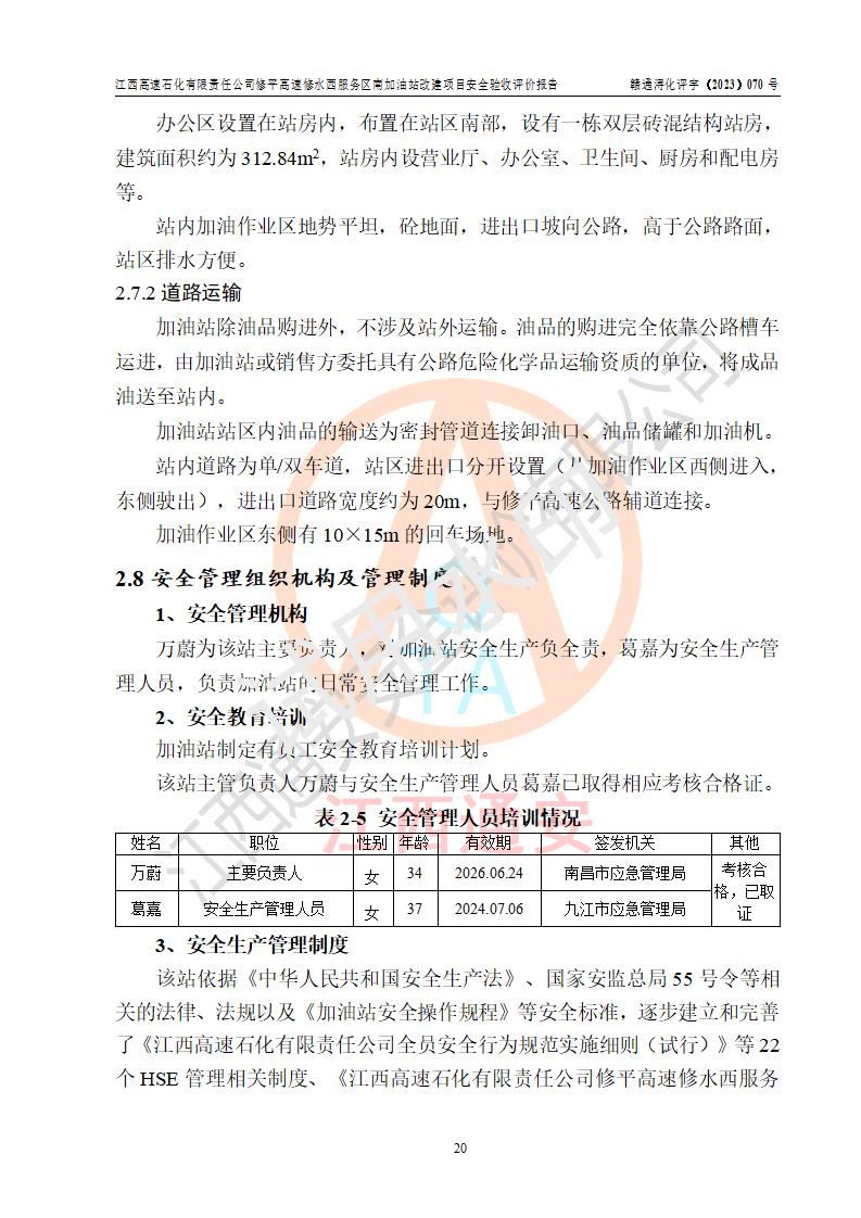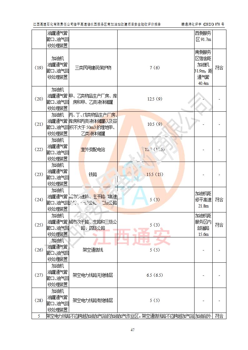 評價結(jié)論 | 江西高速石化有限責任公司修平高速修水西服務(wù)區(qū)南加油站涉及的安全條件、安全經(jīng)營條件、安全生產(chǎn)管理符合《危險化學(xué)品經(jīng)營許可證管理辦法》、《汽車加油加氣加氫站技術(shù)標準》等**有關(guān)法規(guī)、標準、規(guī)范要求,能滿足危險化學(xué)品經(jīng)營安全條件。 | |||
