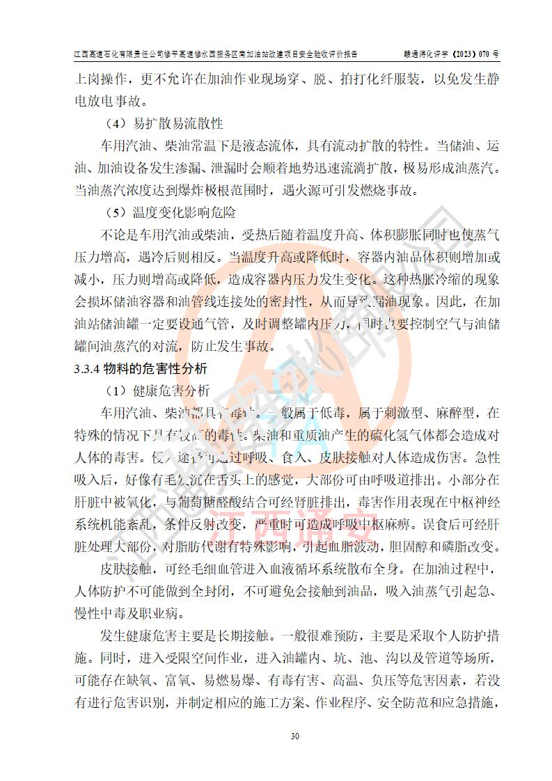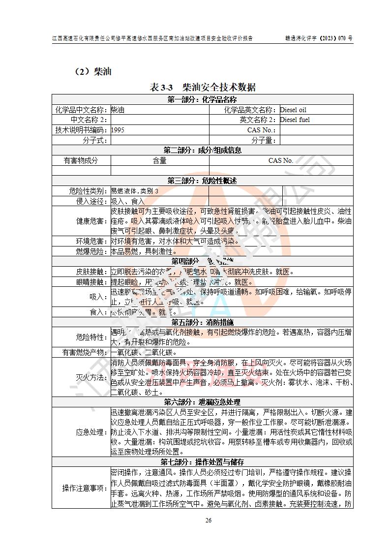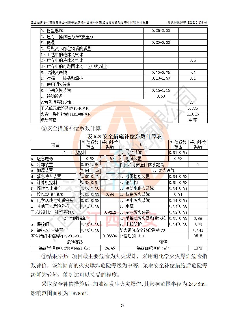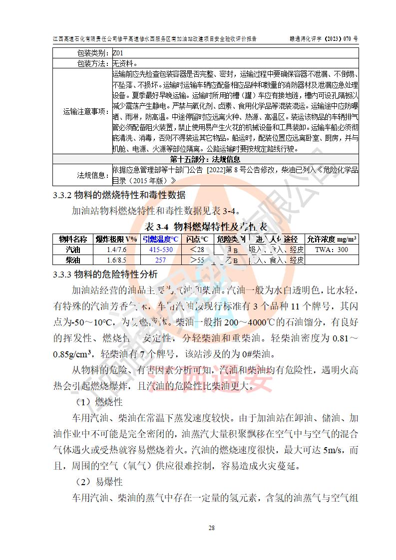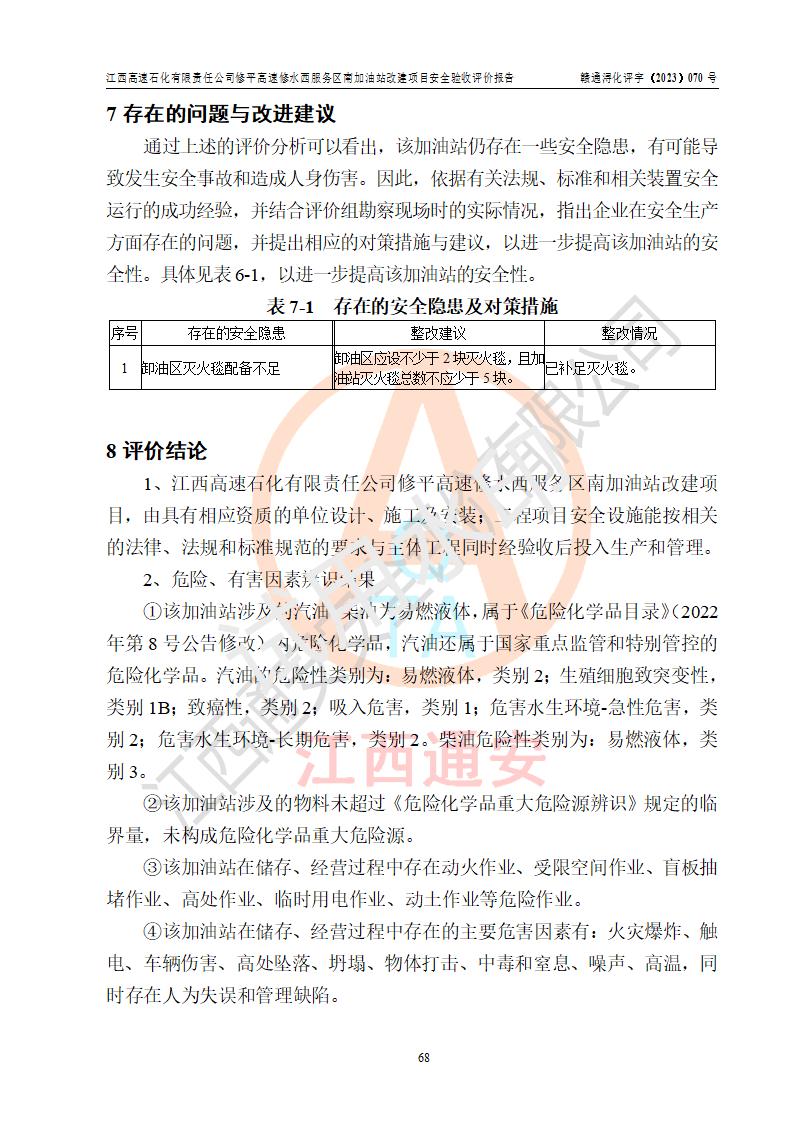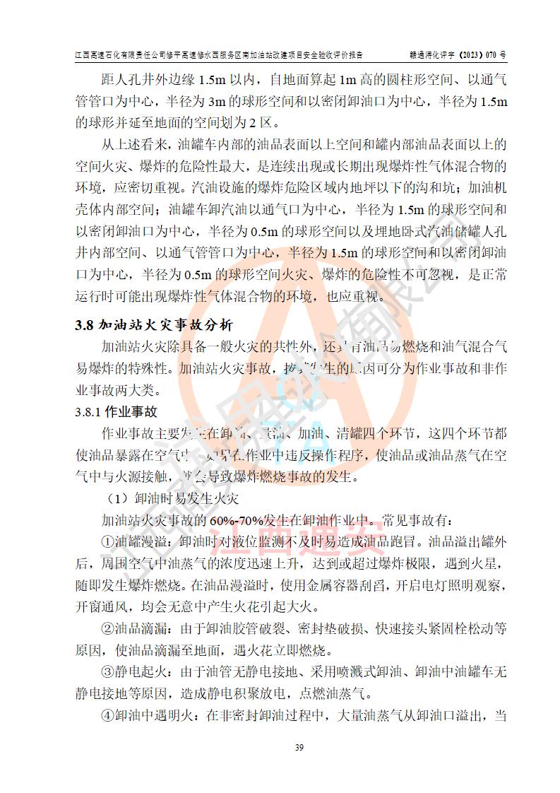 評價結(jié)論 | 江西高速石化有限責任公司修平高速修水西服務(wù)區(qū)南加油站涉及的安全條件、安全經(jīng)營條件、安全生產(chǎn)管理符合《危險化學(xué)品經(jīng)營許可證管理辦法》、《汽車加油加氣加氫站技術(shù)標準》等**有關(guān)法規(guī)、標準、規(guī)范要求,能滿足危險化學(xué)品經(jīng)營安全條件。 | |||