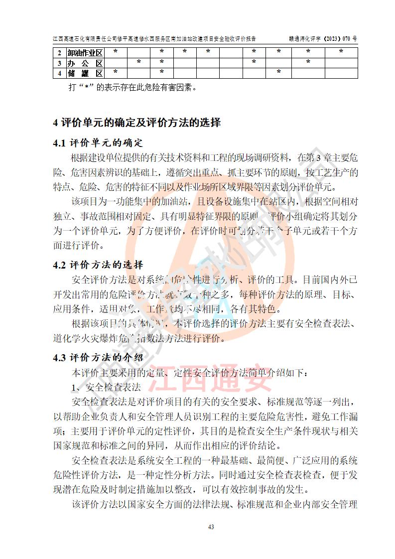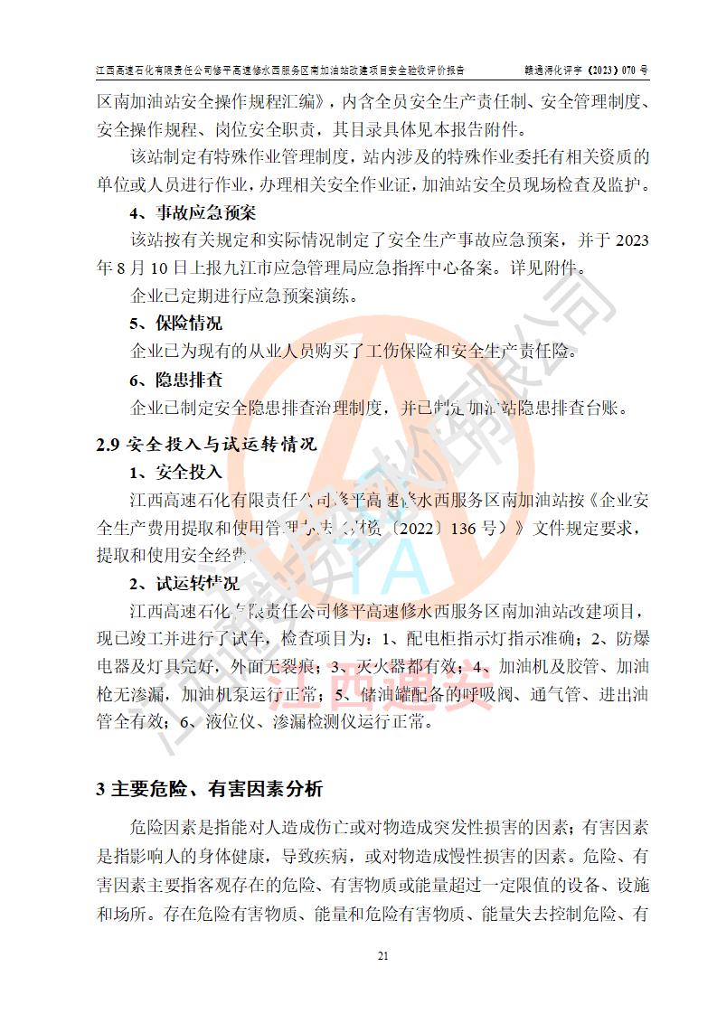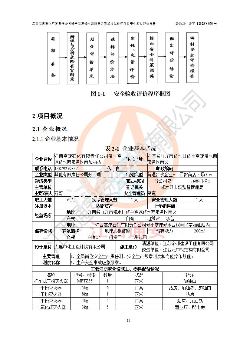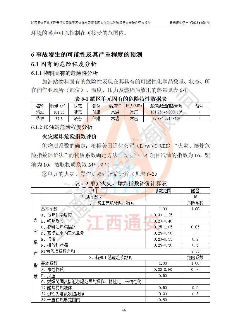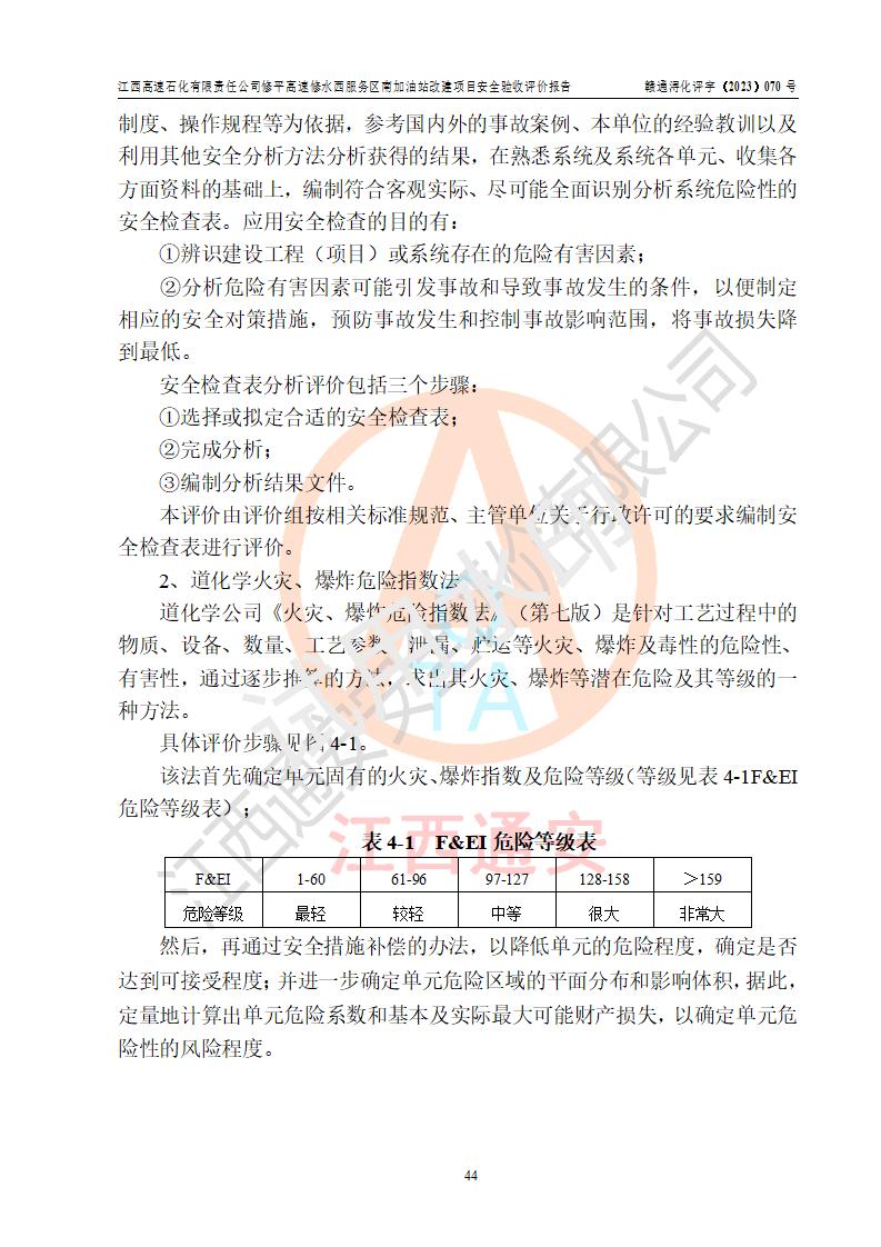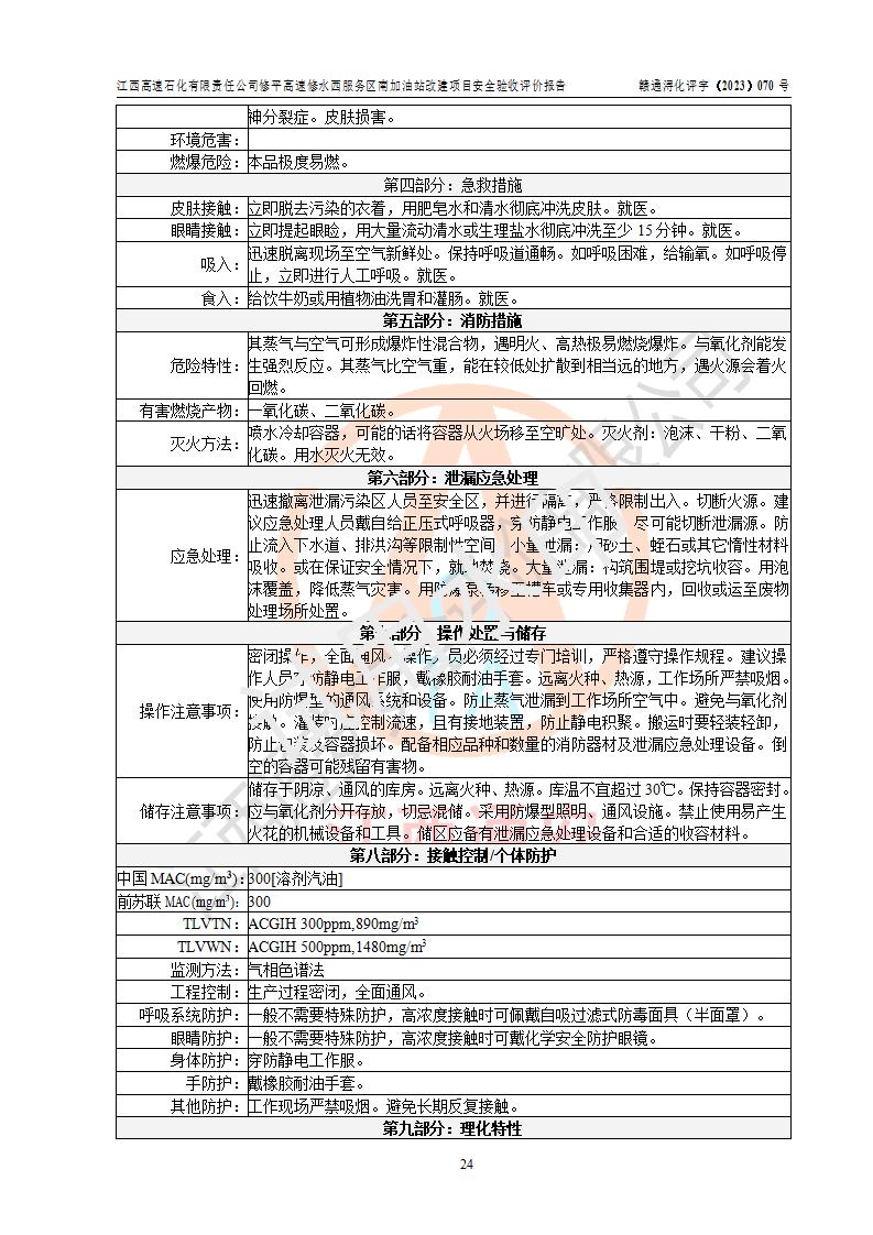 評價結(jié)論 | 江西高速石化有限責任公司修平高速修水西服務(wù)區(qū)南加油站涉及的安全條件、安全經(jīng)營條件、安全生產(chǎn)管理符合《危險化學(xué)品經(jīng)營許可證管理辦法》、《汽車加油加氣加氫站技術(shù)標準》等**有關(guān)法規(guī)、標準、規(guī)范要求,能滿足危險化學(xué)品經(jīng)營安全條件。 | |||