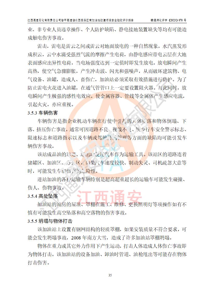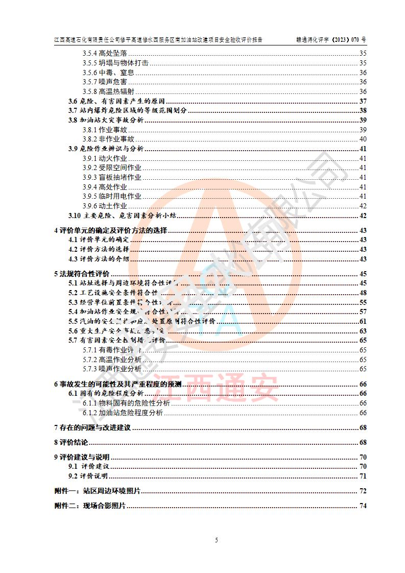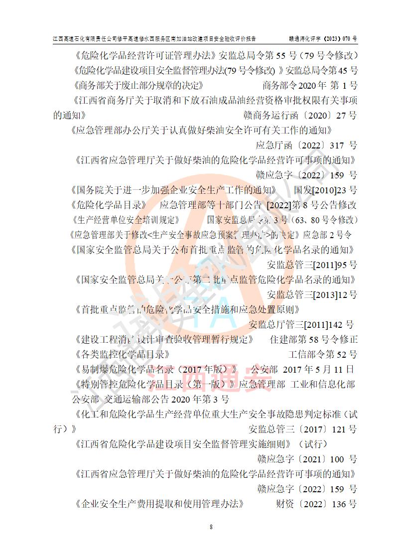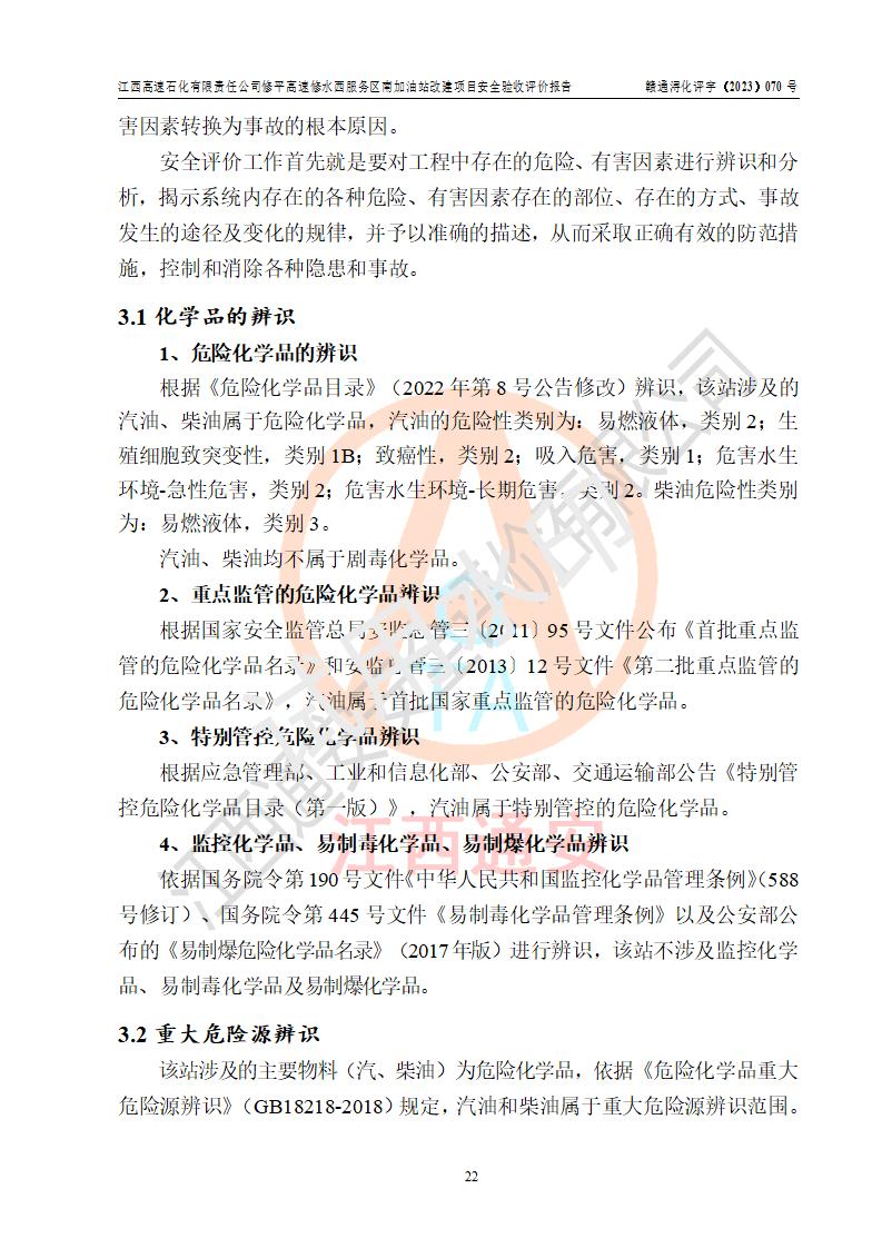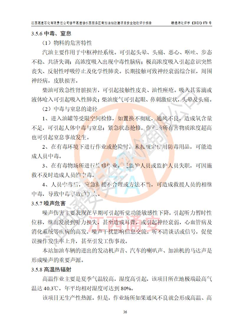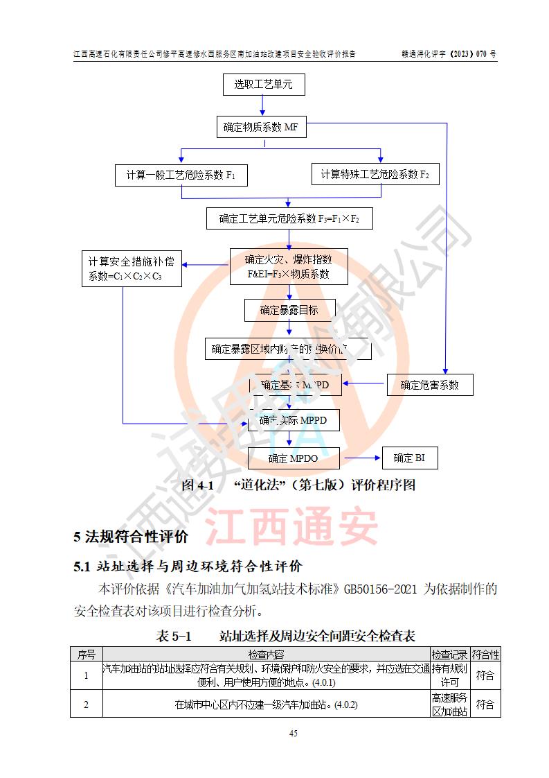 評價結(jié)論 | 江西高速石化有限責任公司修平高速修水西服務(wù)區(qū)南加油站涉及的安全條件、安全經(jīng)營條件、安全生產(chǎn)管理符合《危險化學(xué)品經(jīng)營許可證管理辦法》、《汽車加油加氣加氫站技術(shù)標準》等**有關(guān)法規(guī)、標準、規(guī)范要求,能滿足危險化學(xué)品經(jīng)營安全條件。 | |||