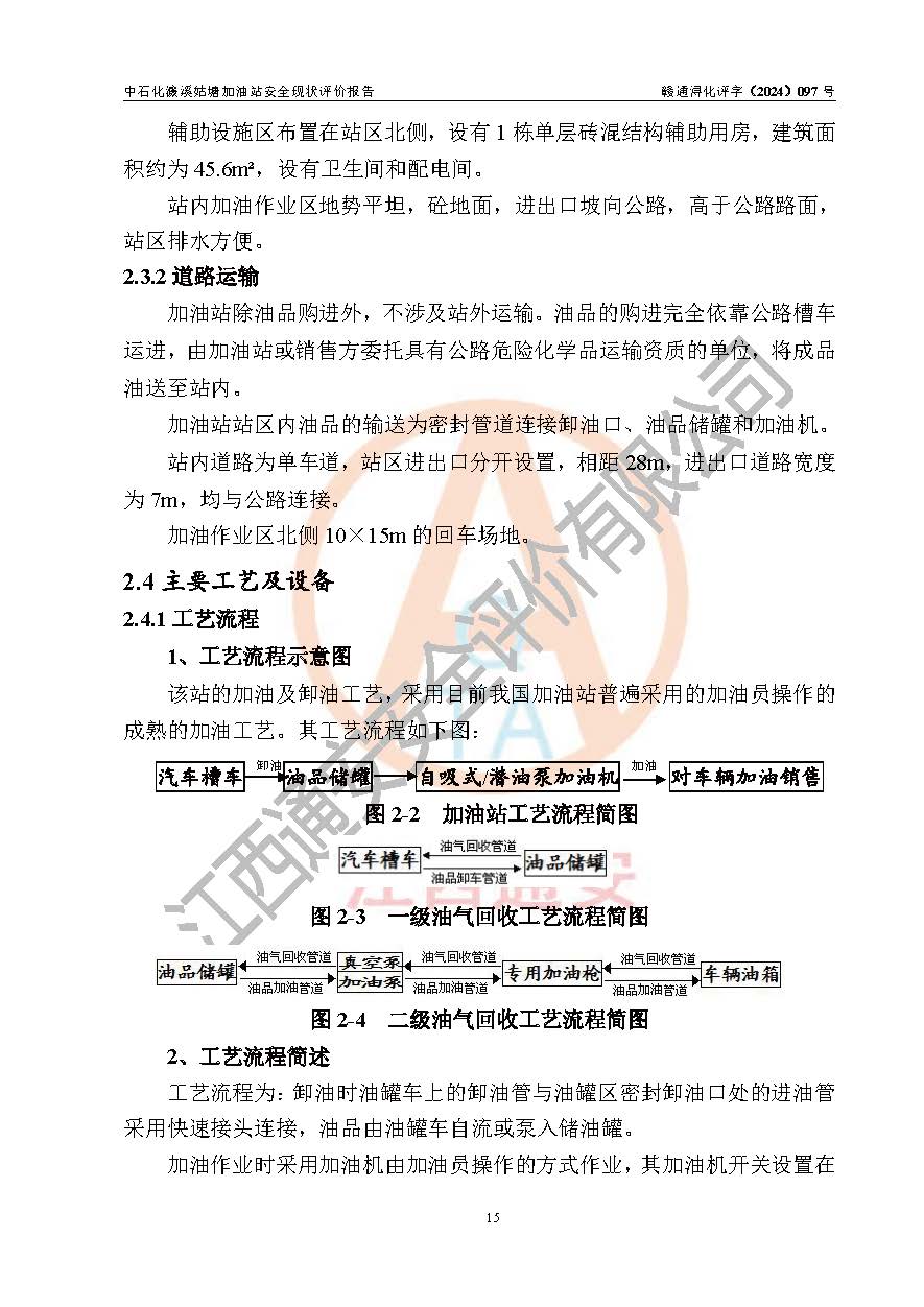 項目簡介 | 中國石化銷售股份有限公司江西九江濂溪石油分公司姑塘加油站是一家專門從事成品油零售經(jīng)營的有限公司分公司(外商投資企業(yè)分公司),經(jīng)營場所位于江西省九江市濂溪區(qū)蔡嶺村九星路口。現(xiàn)有從業(yè)人員3名,其中安全管理人員1人,加油站負責人熊瑋。 該加油站占地面積1260m2,站區(qū)內(nèi)設置有2臺雙槍稅控燃油加油機及配套的工藝管線,設有SF雙層儲罐2臺,其中30m3的92#汽油儲罐1臺、30m3的0#柴油儲罐1臺,油品儲罐總?cè)莘e為60m3(折算成汽油為45m3),按現(xiàn)行《汽車加油加氣加氫站技術(shù)標準》對加油站的等級劃分原則,屬三級加油站。 該站由九江市行政審批局換發(fā)《危險化學品經(jīng)營許可證》(證號:贛九行審經(jīng)(甲)字[2021]000060號),**期限2021年09月30日至2024年09月29日。 | |||