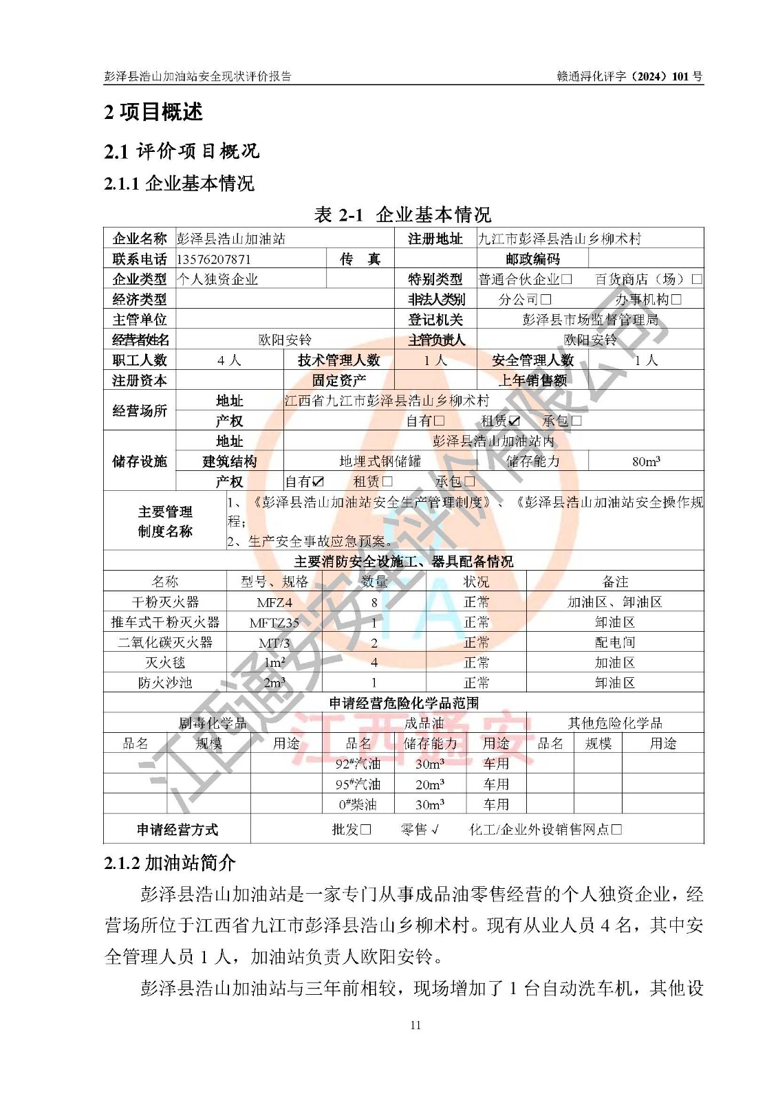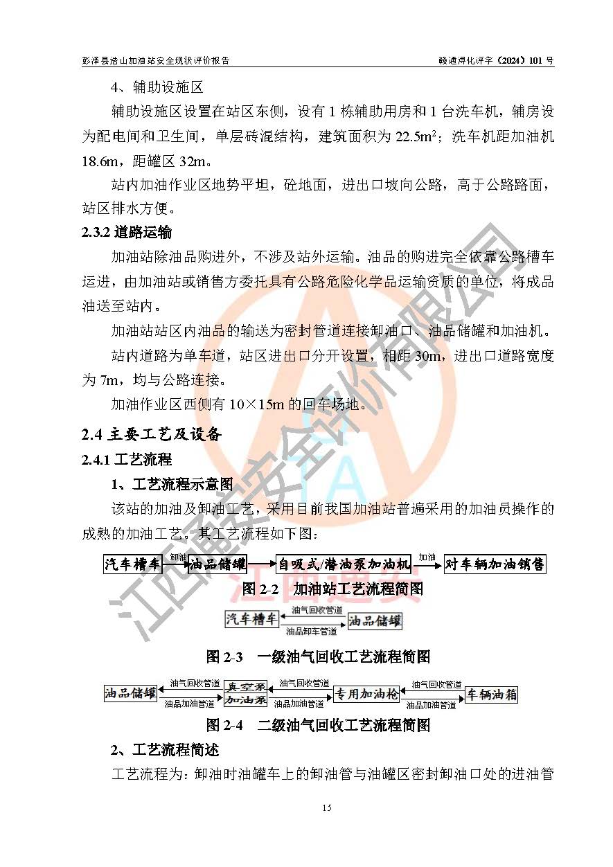 項目簡介 | 彭澤縣浩山加油站是一家專門從事成品油零售經營的個人獨資企業(yè),經營場所位于江西省九江市彭澤縣浩山鄉(xiāng)柳術村?,F(xiàn)有從業(yè)人員4名,其中安全管理人員1人,加油站負責人歐陽安鈴。 該加油站占地面積約840m2,站區(qū)內設置有2臺雙槍加油機及配套的工藝管線,設有SF雙層儲罐3臺,其中30m3的92#汽油儲罐1臺、20m3的95#汽油儲罐1臺、30m3的0#柴油儲罐1臺,油品儲罐總容積為80m3(折算成汽油為65m3),按現(xiàn)行《汽車加油加氣加氫站技術標準》對加油站的等級劃分原則,屬三級加油站。 該站由九江市行政審批局換發(fā)《危險化學品經營許可證》(證號:贛九行審經(甲)字[2021]000071號),**期限2021年12月02日至2024年12月01日。 | |||