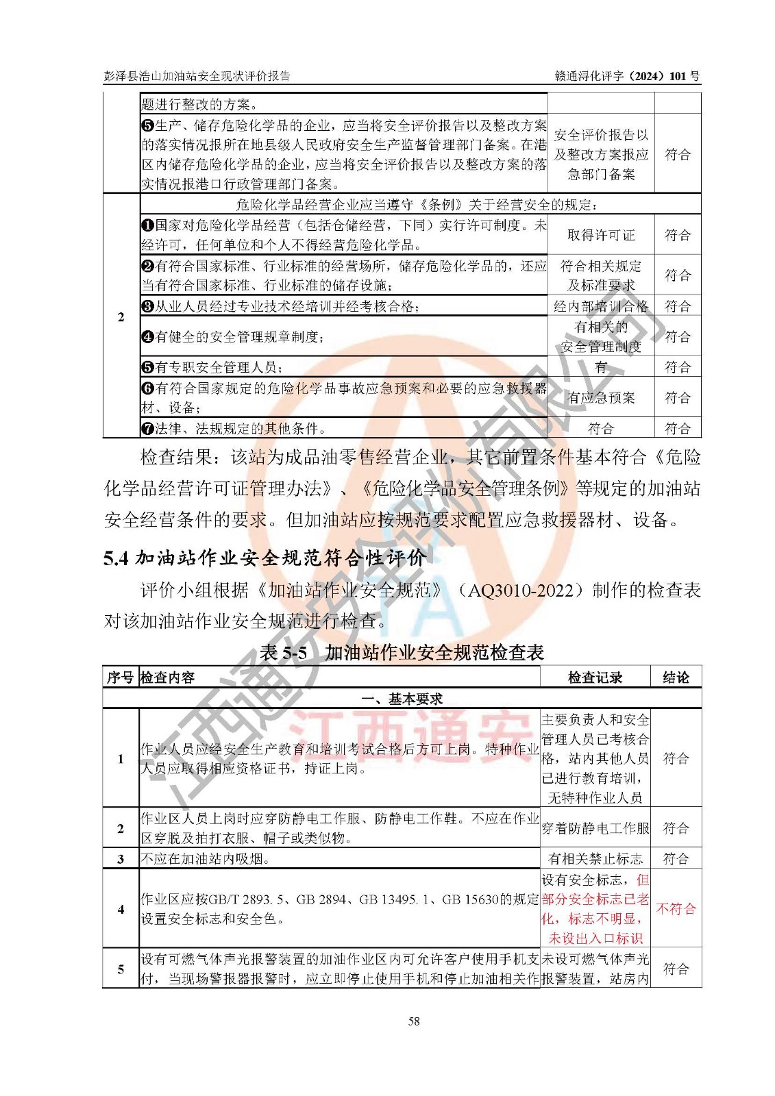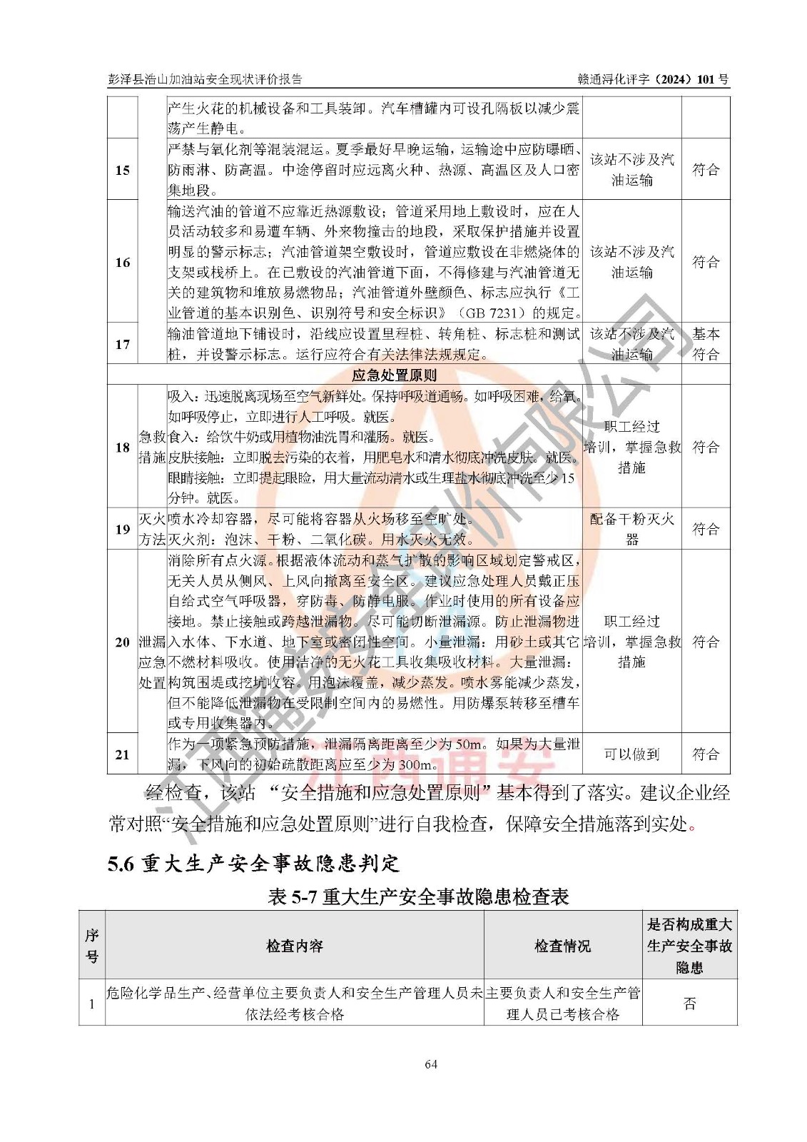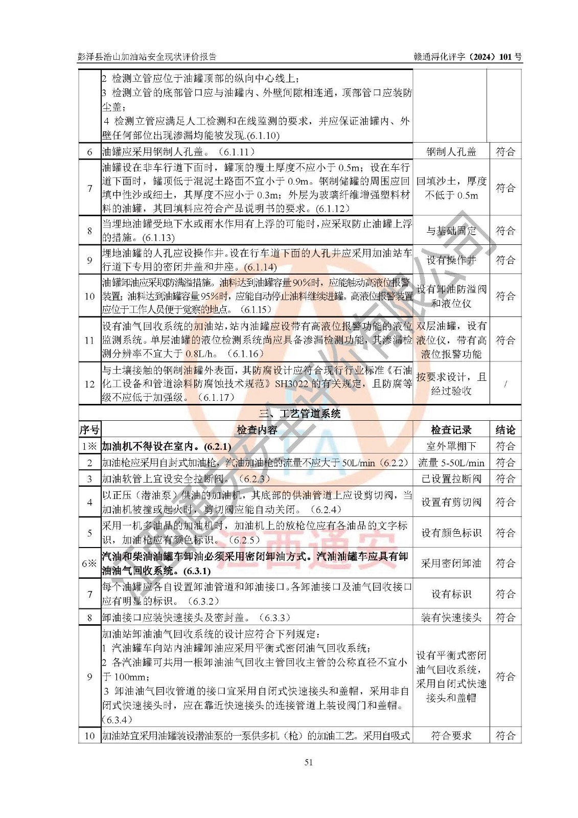 評價結論 | 彭澤縣浩山加油站涉及的安全條件、安全經營條件、安全生產管理符合《危險化學品經營許可證管理辦法》、《汽車加油加氣加氫站技術標準》等**有關法規(guī)、標準、規(guī)范要求,能滿足危險化學品經營安全條件。 | |||