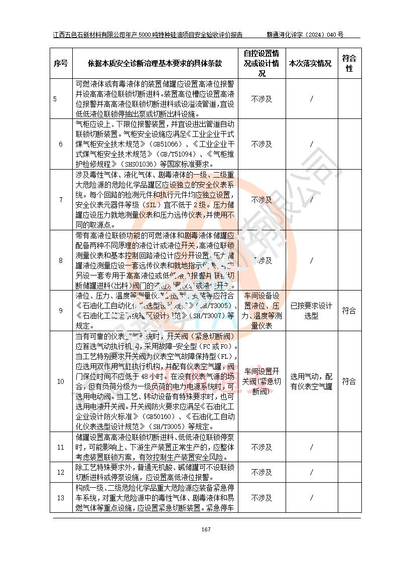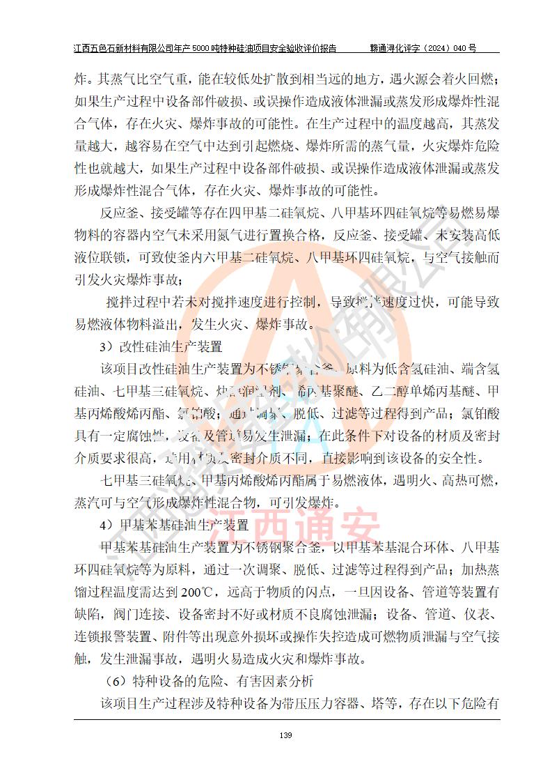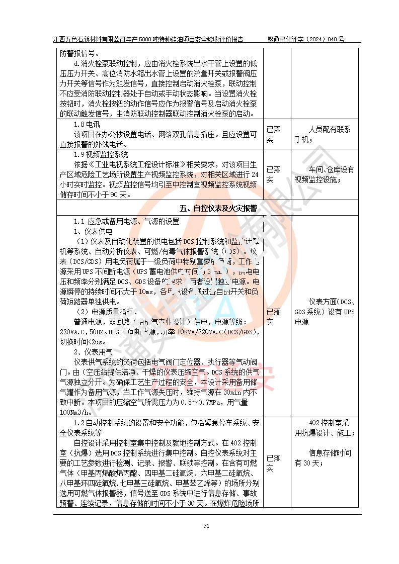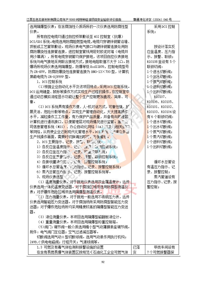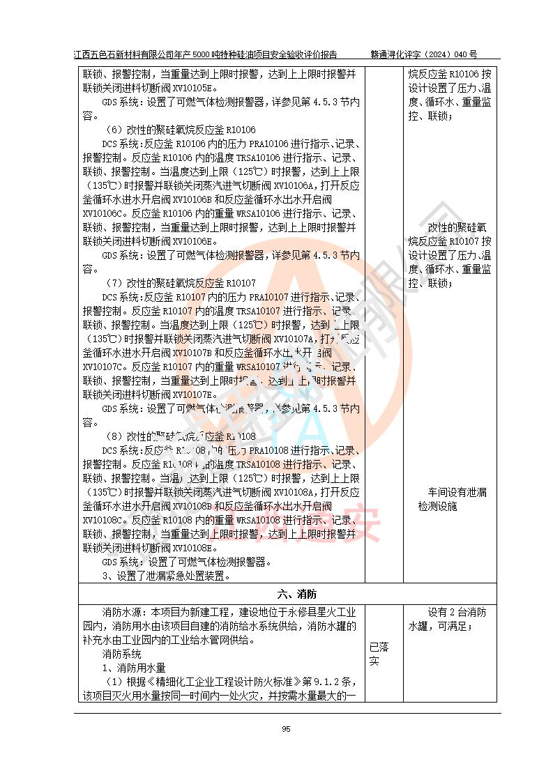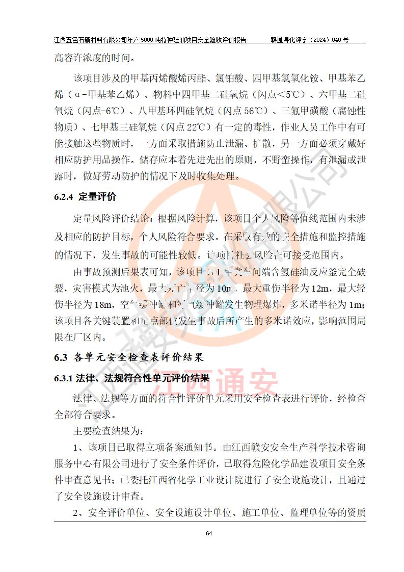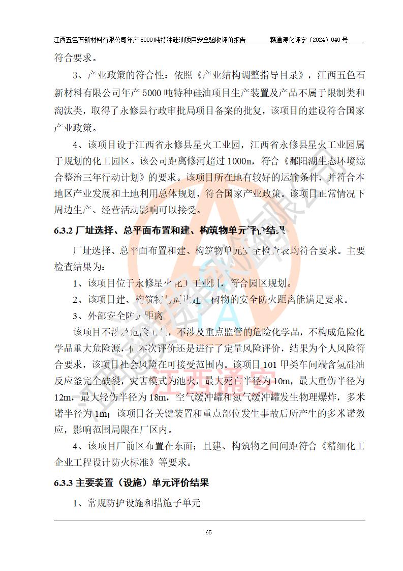 評(píng)價(jià)結(jié)論 | 江西五色石新材料有限公司年產(chǎn)5000噸特種硅油項(xiàng)目總平面布置、現(xiàn)場(chǎng)設(shè)備布置情況與設(shè)計(jì)圖紙一致,本次項(xiàng)目不涉及重點(diǎn)監(jiān)管的危險(xiǎn)化學(xué)品、危險(xiǎn)工藝、重大危險(xiǎn)源,按設(shè)計(jì)要求,設(shè)置有DCS系統(tǒng)、GDS系統(tǒng),符合《江西省應(yīng)急管理廳關(guān)于印發(fā)(試行)的通知 》、關(guān)于印發(fā)《九江市化工企業(yè)自動(dòng)化提升實(shí)施方案》的安全要求,符合《危險(xiǎn)化學(xué)品生產(chǎn)建設(shè)項(xiàng)目安全風(fēng)險(xiǎn)防控指南(試行)》規(guī)定竣工驗(yàn)收的安全條件;企業(yè)主要負(fù)責(zé)人、安全管理部門負(fù)責(zé)人均為化學(xué)、化工相關(guān)專業(yè),且有3年以上化工行業(yè)從業(yè)經(jīng)歷,企業(yè)主要負(fù)責(zé)人及安全管理人員已取得危險(xiǎn)化學(xué)品企業(yè)主要負(fù)責(zé)人及安全管理人員考核合格證。項(xiàng)目選擇的工藝過程及設(shè)備設(shè)施的安全可靠性能達(dá)到 **法規(guī)、標(biāo)準(zhǔn)規(guī)定要求。 項(xiàng)目運(yùn)行后存在的主要危險(xiǎn)、有害因素有:火災(zāi)、其他爆炸、容器爆炸、中毒與窒息等;存在的主要有害因素有高溫、化學(xué)物質(zhì)危害等;針對(duì)存在的危險(xiǎn)、有害因素,企業(yè)采取了**的安全技術(shù)措施及安全管理措施,符合**有關(guān)法規(guī)、標(biāo)準(zhǔn)、規(guī)范要求;項(xiàng)目風(fēng)險(xiǎn)可控,其安全生產(chǎn)條件和安全管理 方面具備竣工安全驗(yàn)收的條件。 | ||||